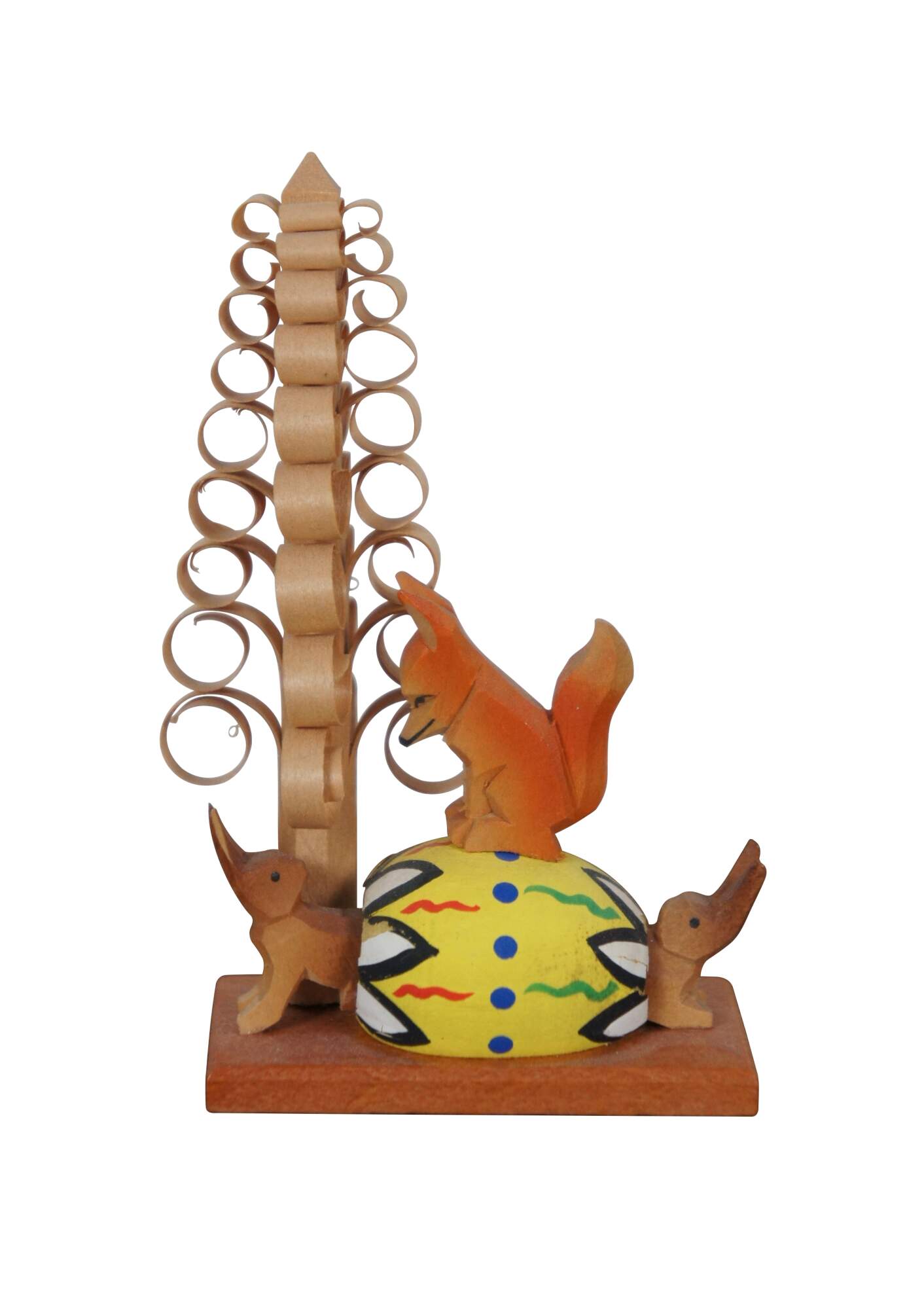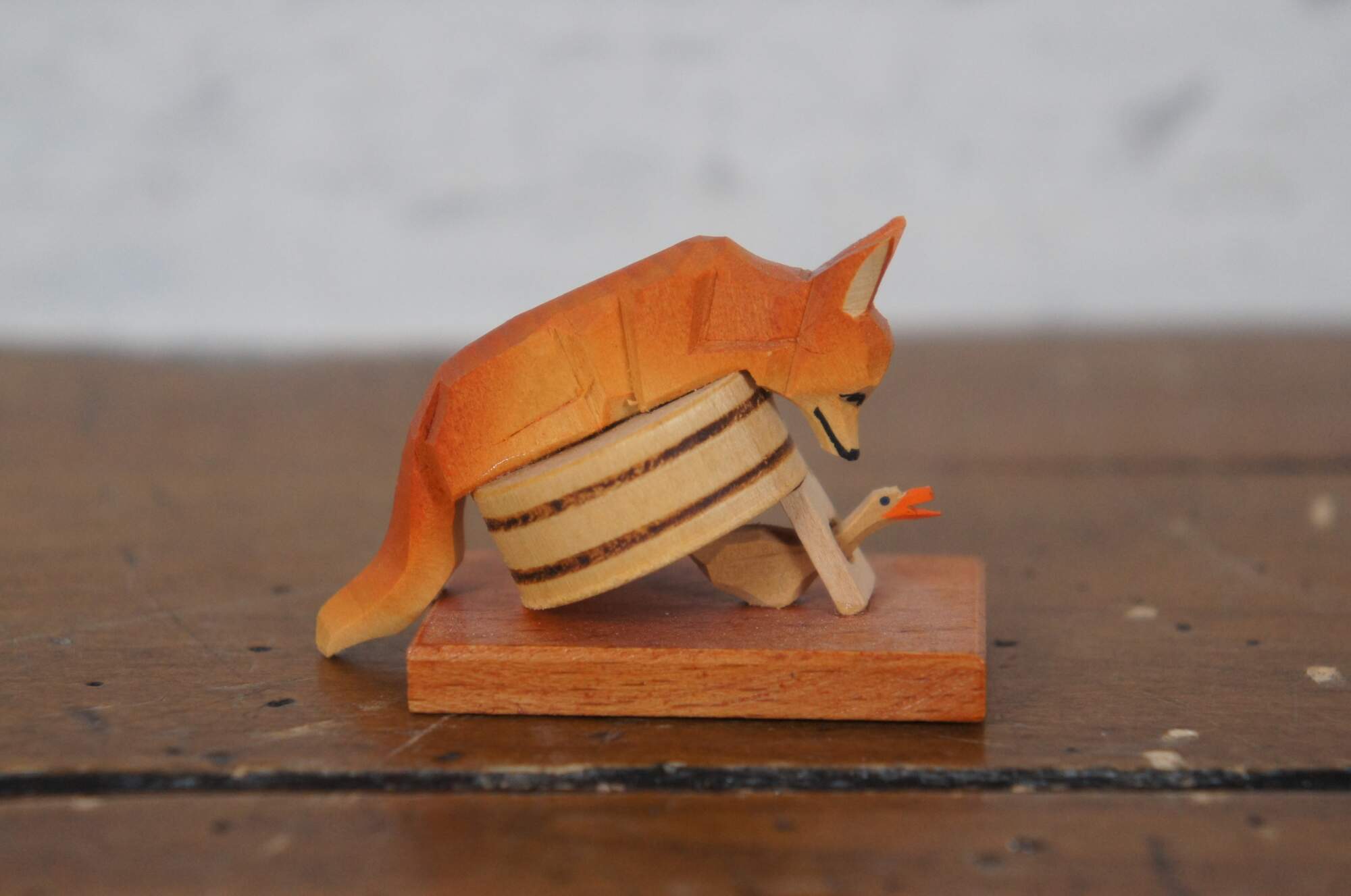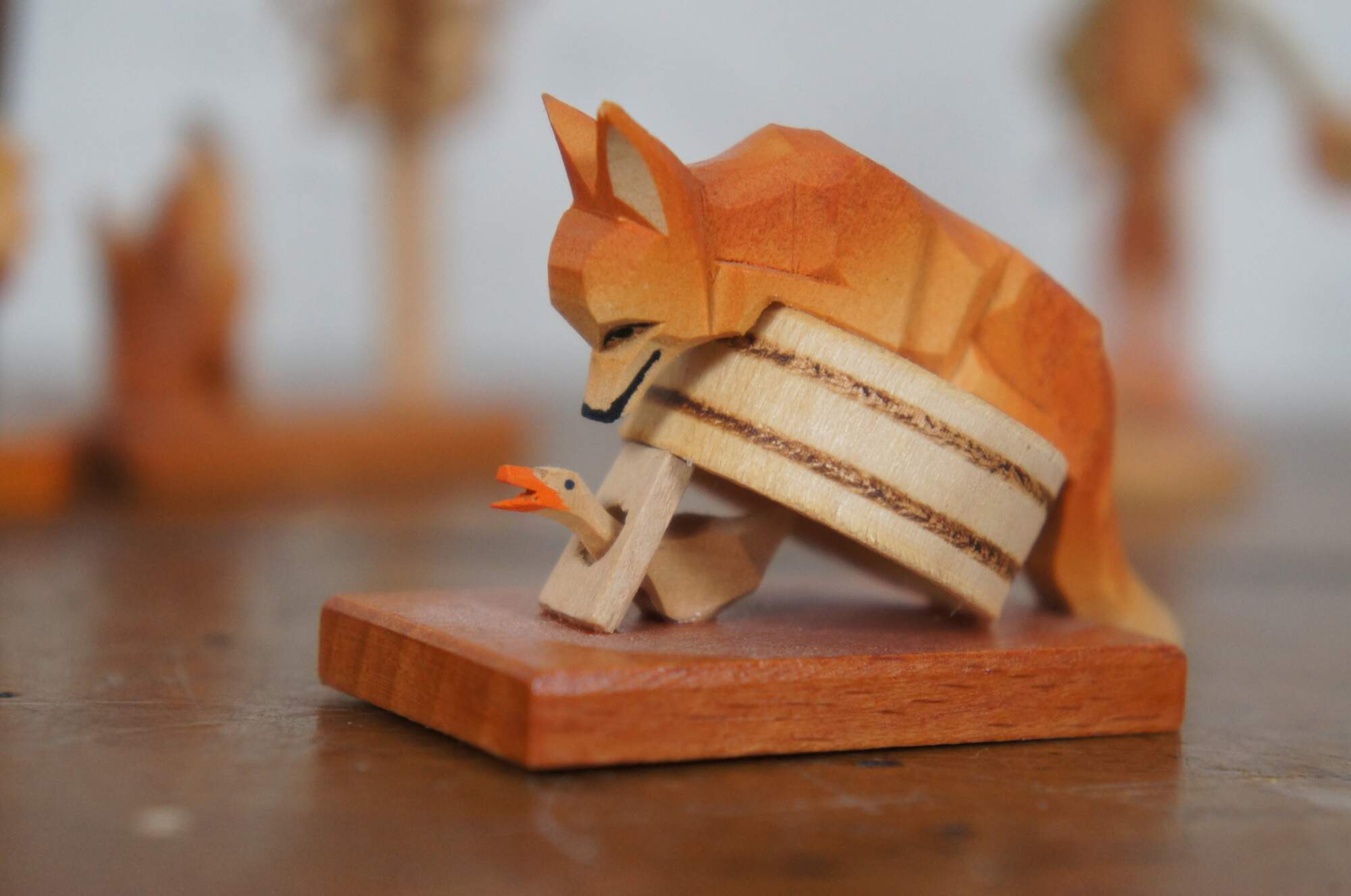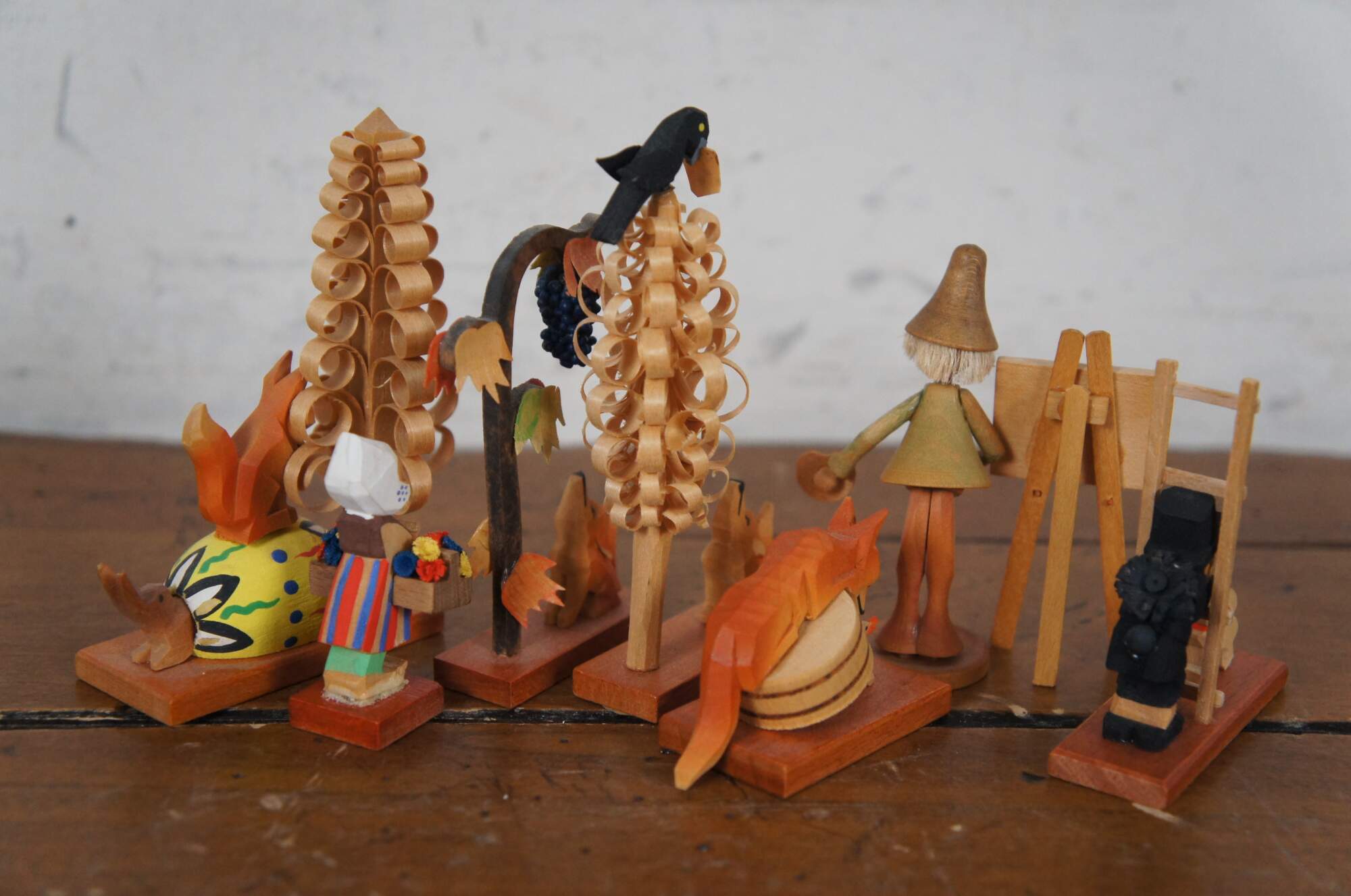 Lot of eight mid to late 20th century hand crafted German Erzgebirge / Expertic wooden figurines. Lot includes: Pair of rabbits and a fox with an oversized Easter Egg under a tree; by Emil Helbig. A fox looking up at a crow in a tree, inspired by Aesop's fable The Fox and the Crow; by Emil Helbig. A fox looking up at a bunch of purple grapes, inspired by Aesop's fable The Fox and the Grapes; by Emil Helbig. A chimney sweep leaning on a ladder, peering at a small dog; by Emil Helbig. An artist with paint palette and brush and a partial painting on an easel; by Wilhelm Busch. A fox perched on top of a wooden bucket, under which a duck or goose is hiding; by Emil Helbig. And a little Dutch girl in a striped skirt, carrying baskets of flowers; by Emil Helbig.