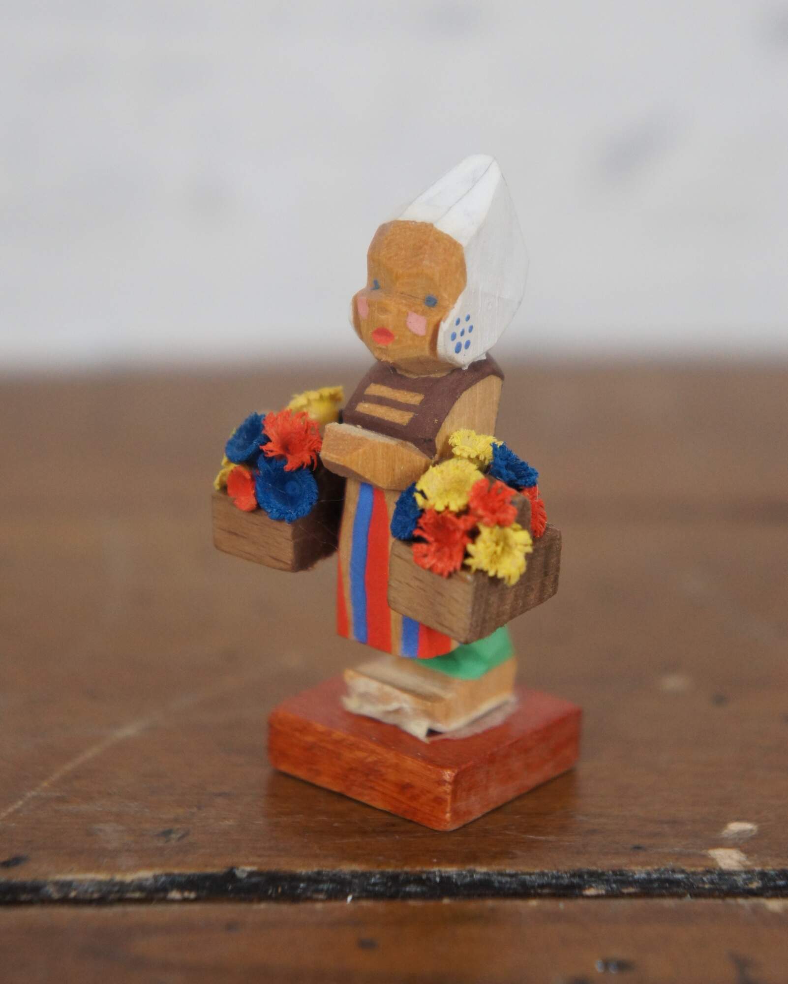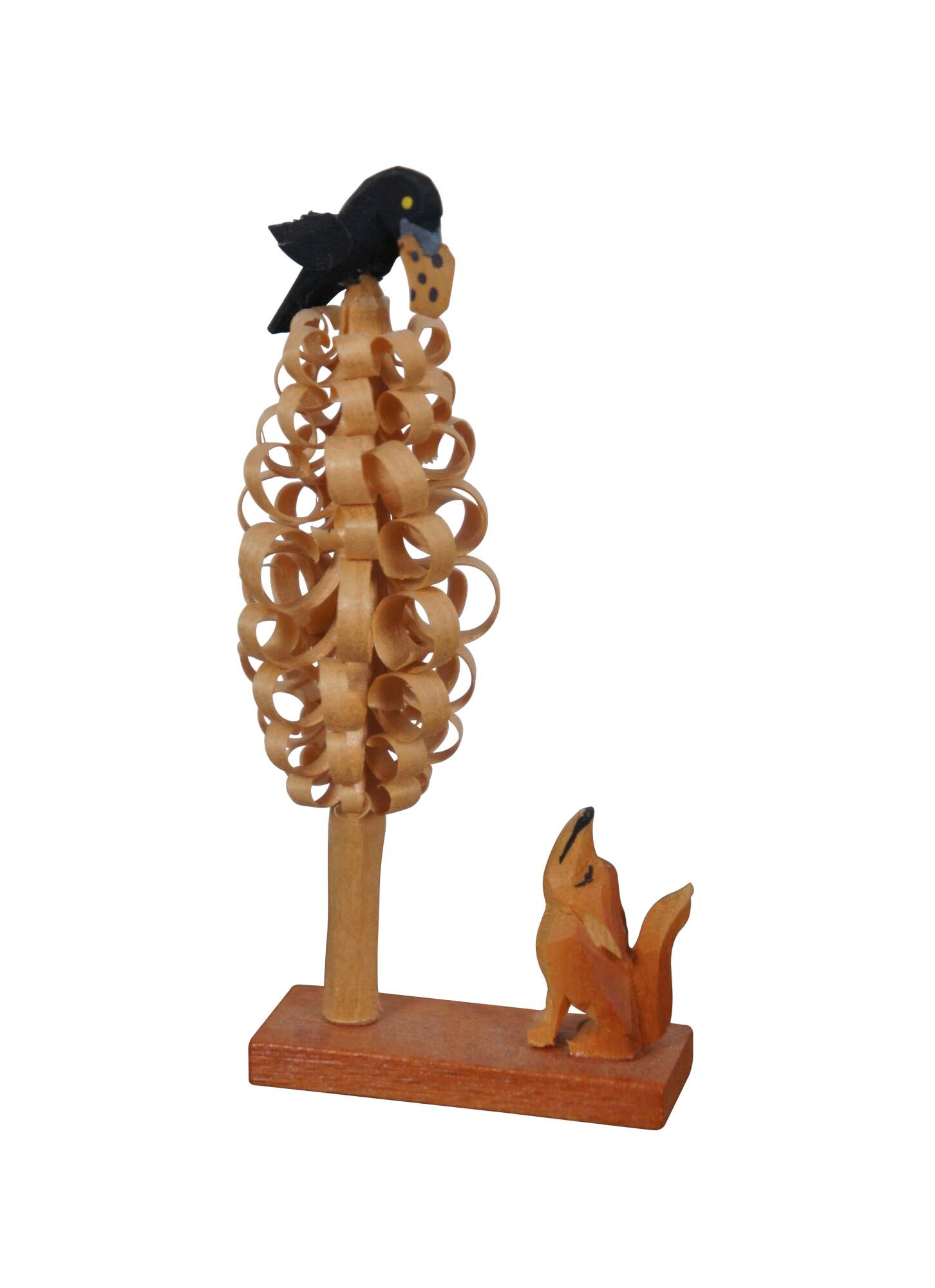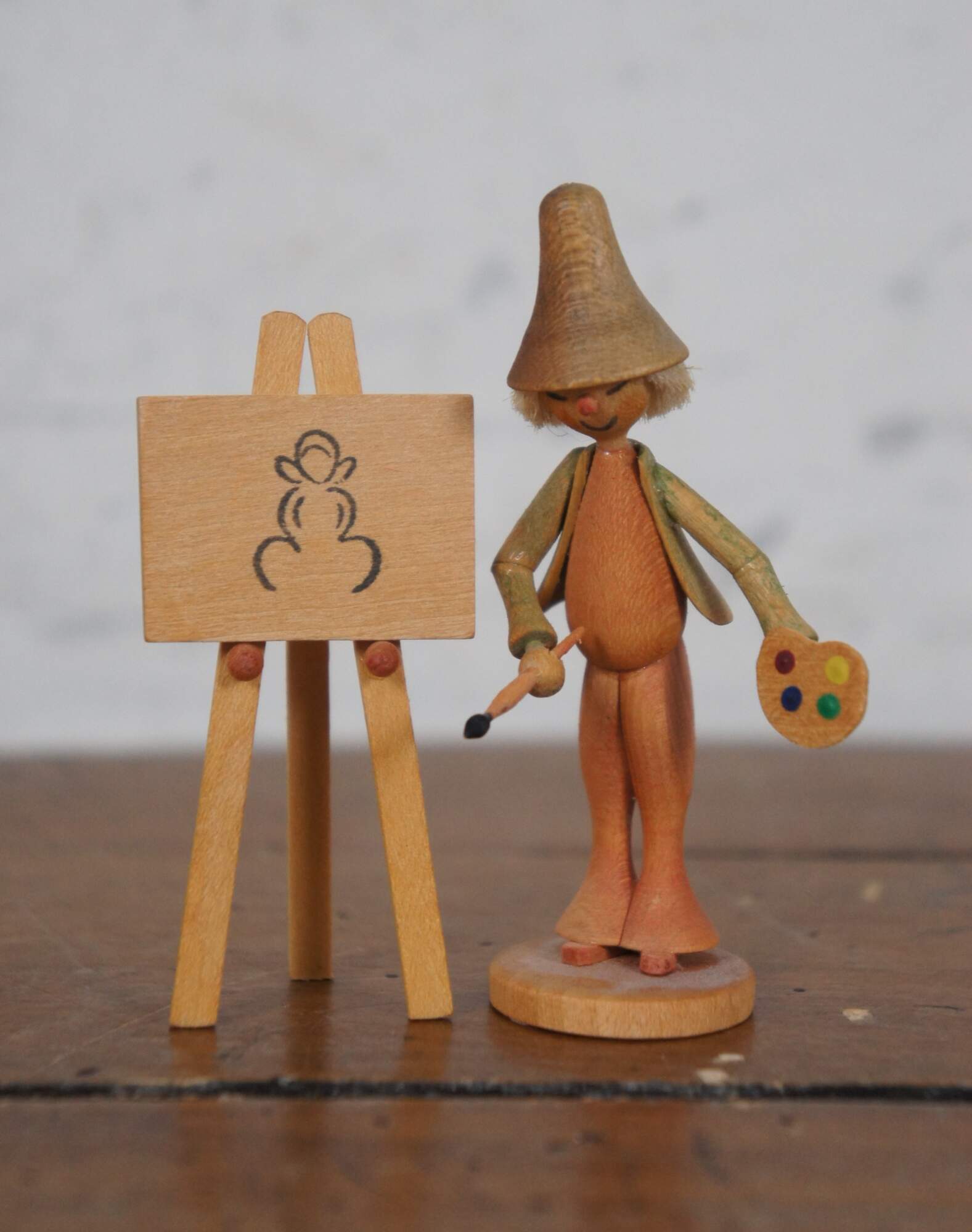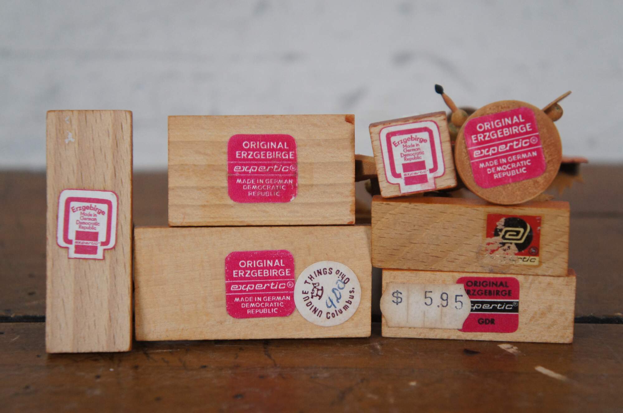 Lot of eight mid to late 20th century hand crafted German Erzgebirge / Expertic wooden figurines. Lot includes: Pair of rabbits and a fox with an oversized Easter Egg under a tree; by Emil Helbig. A fox looking up at a crow in a tree, inspired by Aesop's fable The Fox and the Crow; by Emil Helbig. A fox looking up at a bunch of purple grapes, inspired by Aesop's fable The Fox and the Grapes; by Emil Helbig. A chimney sweep leaning on a ladder, peering at a small dog; by Emil Helbig. An artist with paint palette and brush and a partial painting on an easel; by Wilhelm Busch. A fox perched on top of a wooden bucket, under which a duck or goose is hiding; by Emil Helbig. And a little Dutch girl in a striped skirt, carrying baskets of flowers; by Emil Helbig.
