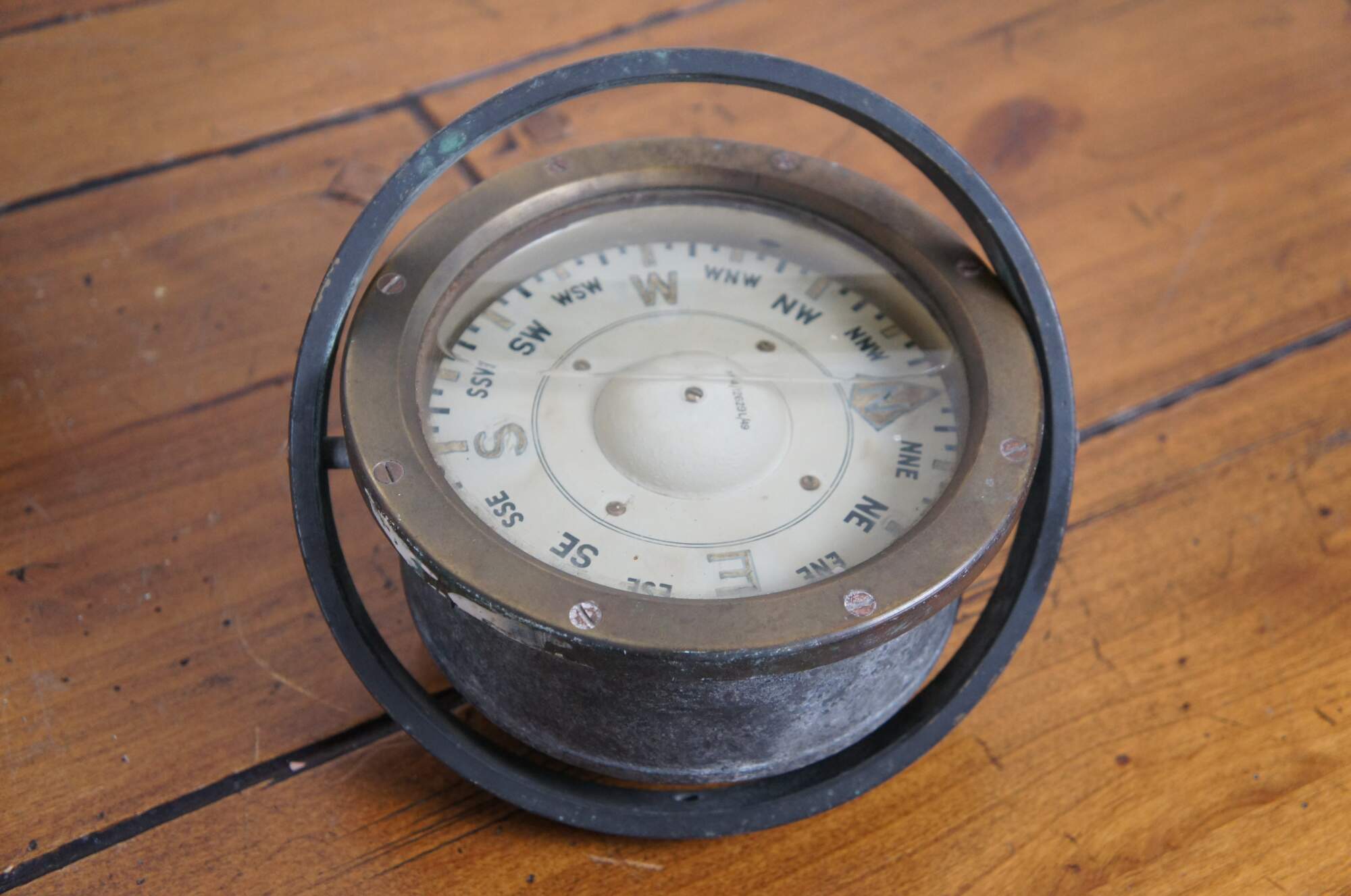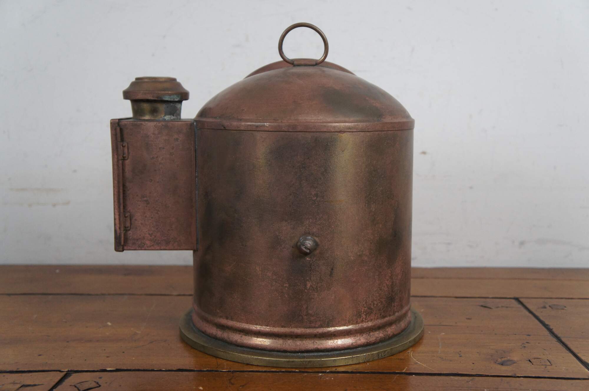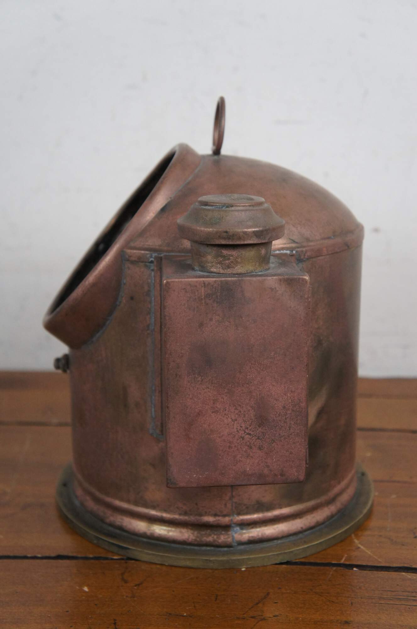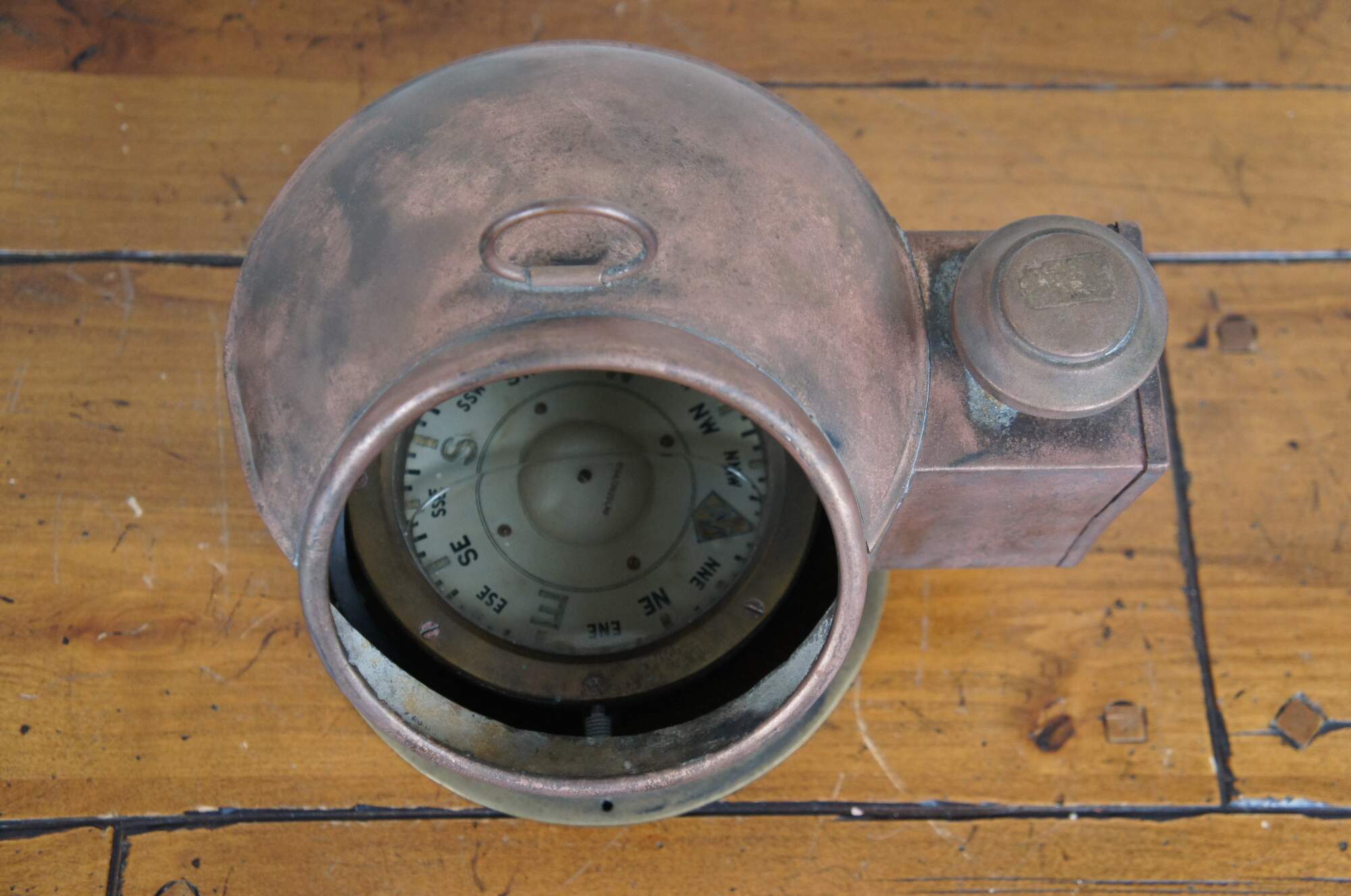 Antique English nautical ship / Yacht / lifeboat gimbal compass / binnacle. Copper and brass body with single oil lamp on one side for illumination. Gimbal Sestrel comapss marked No. B4/12629L/49. Inner ring marked 5613.
