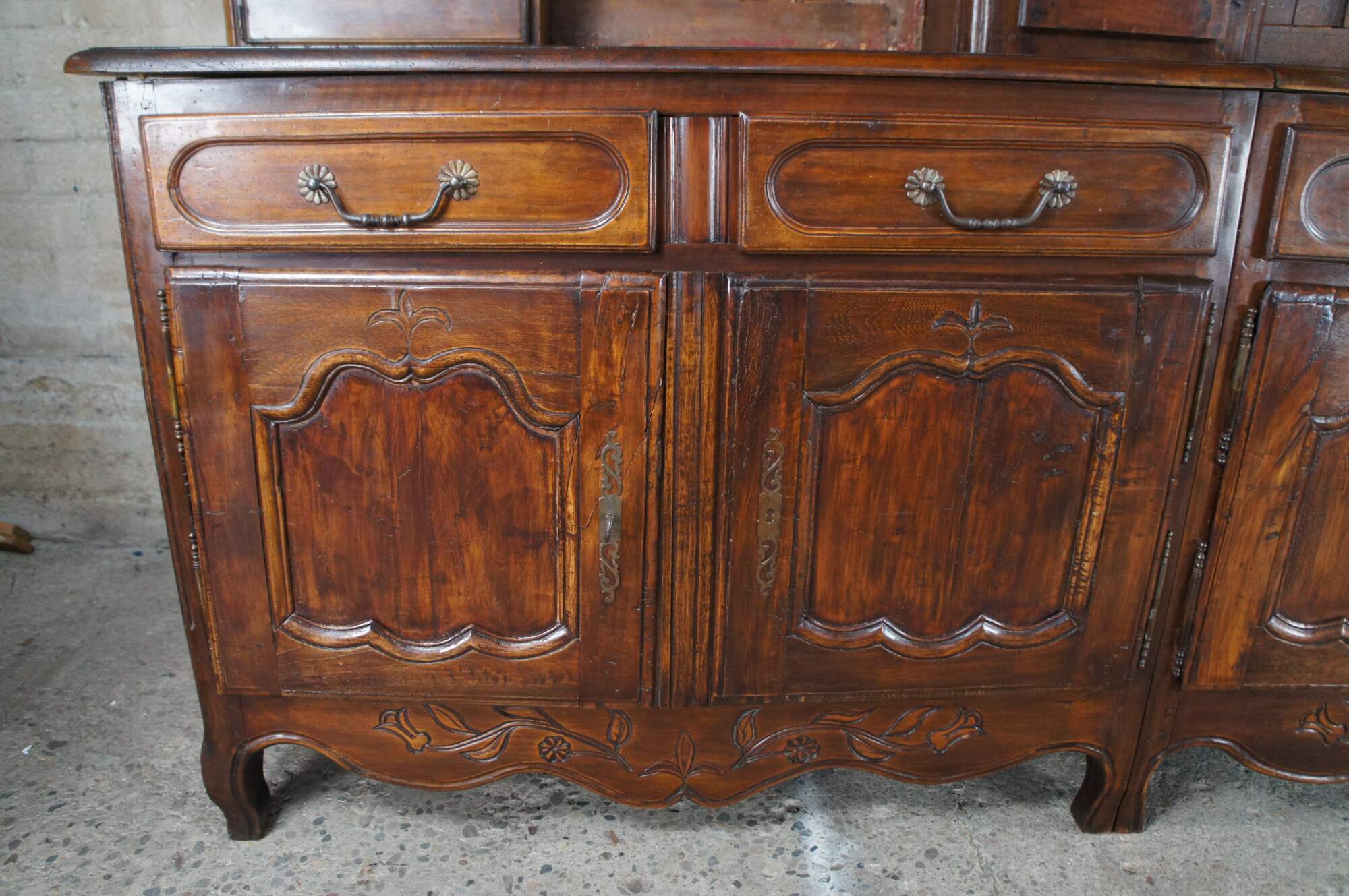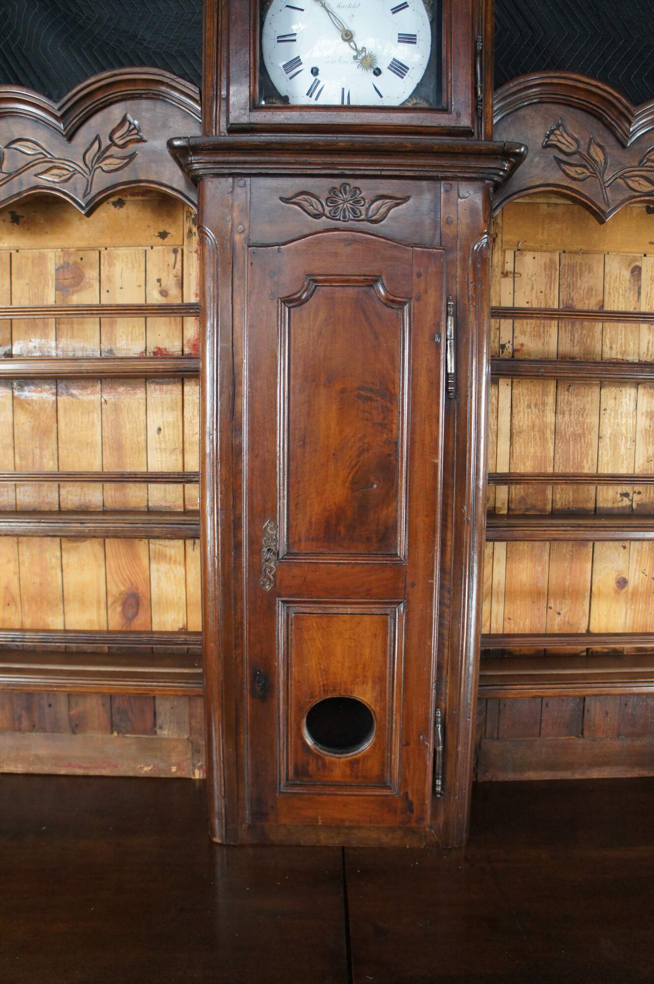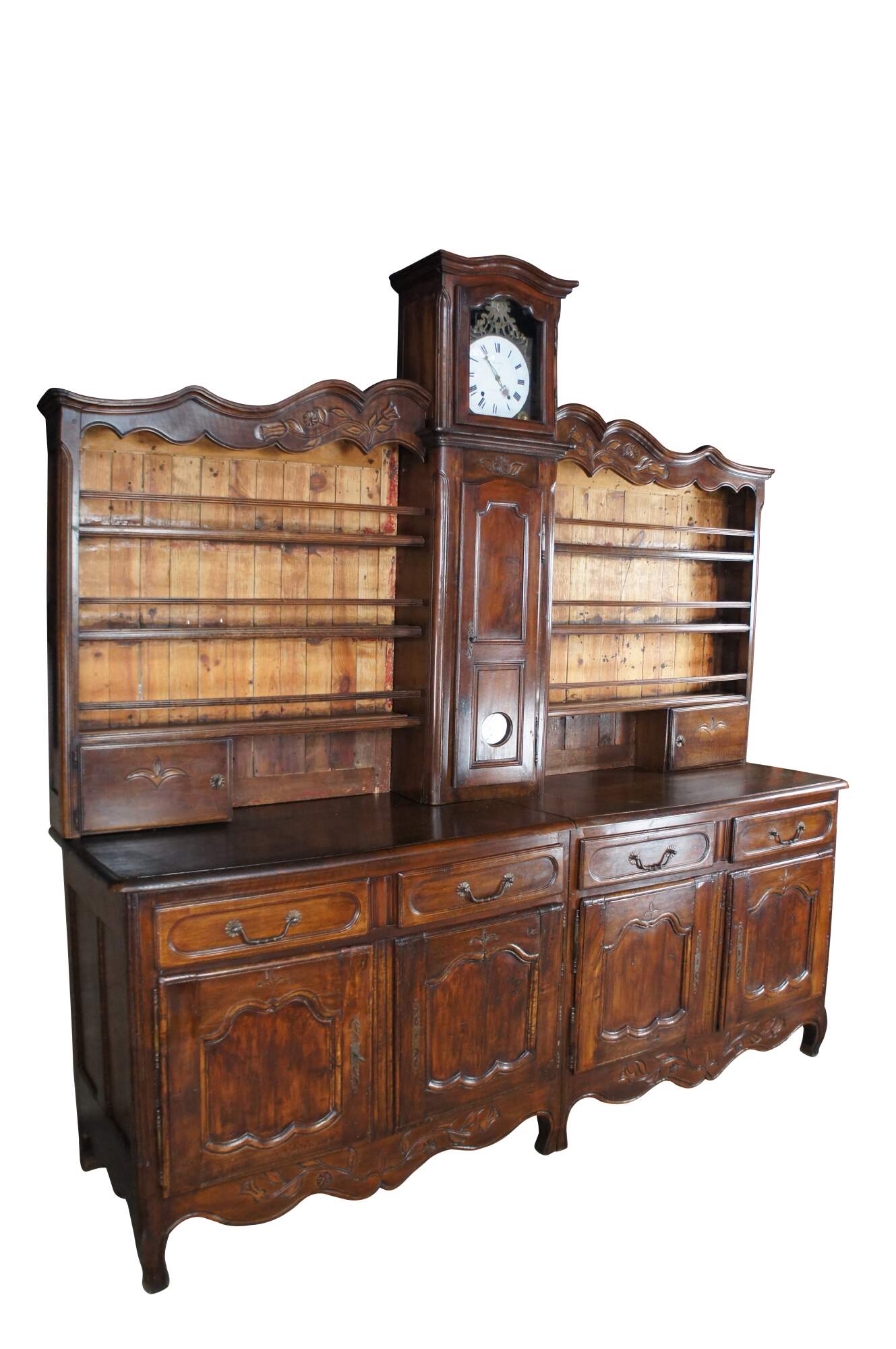 Antique late 18th century Country French buffet / hutch / vaisselier with Horloge (clock). Made of oak featuring French country / provincial styling with carved flowers / florals and fleur de list accents. A serpentin China plate rack divided by inset Grandfather style clock with brass and enameled design is supported by lower buffet with multiple drawers and cabinets. Attributed to the Bressan region of Southern France.