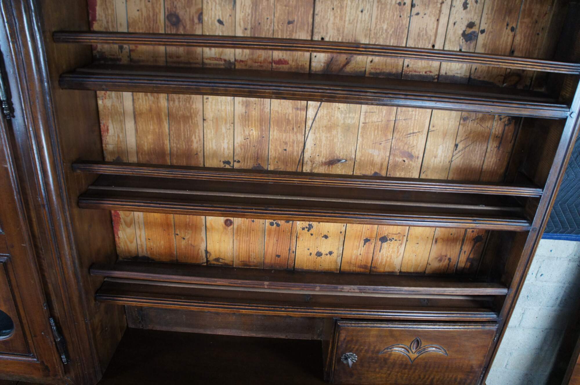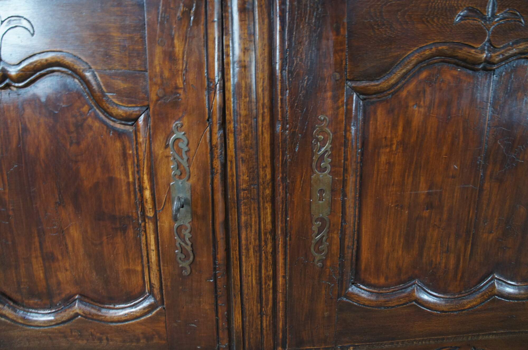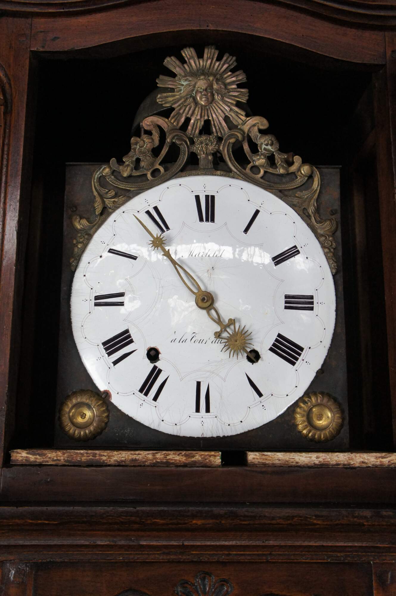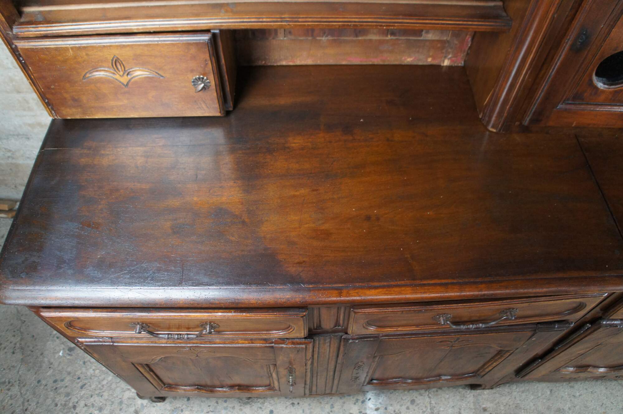 Antique late 18th century Country French buffet / hutch / vaisselier with Horloge (clock). Made of oak featuring French country / provincial styling with carved flowers / florals and fleur de list accents. A serpentin China plate rack divided by inset Grandfather style clock with brass and enameled design is supported by lower buffet with multiple drawers and cabinets. Attributed to the Bressan region of Southern France.