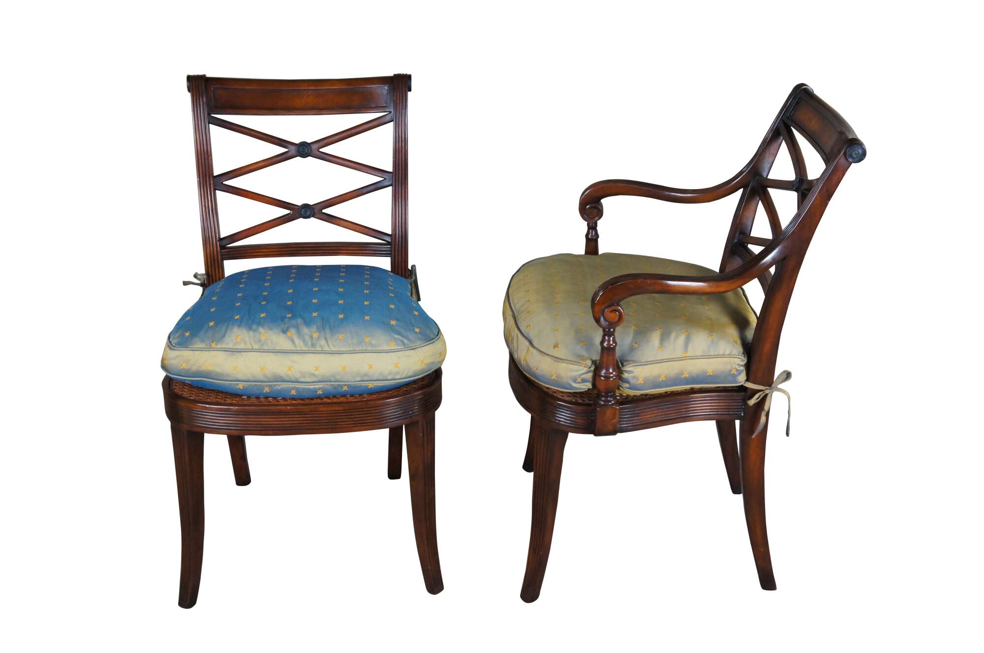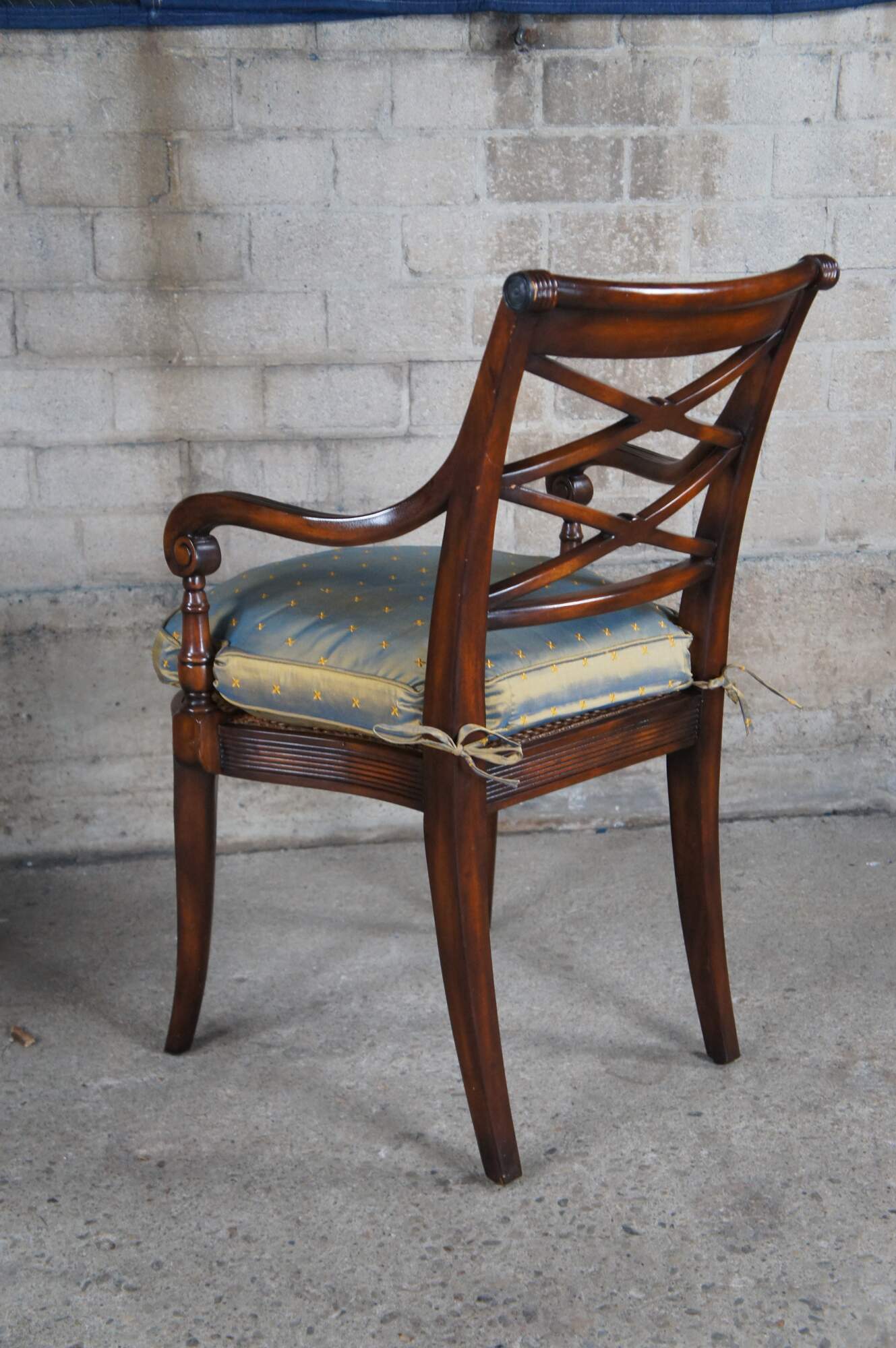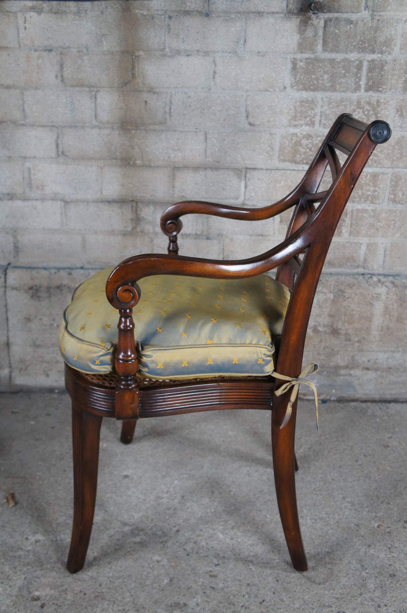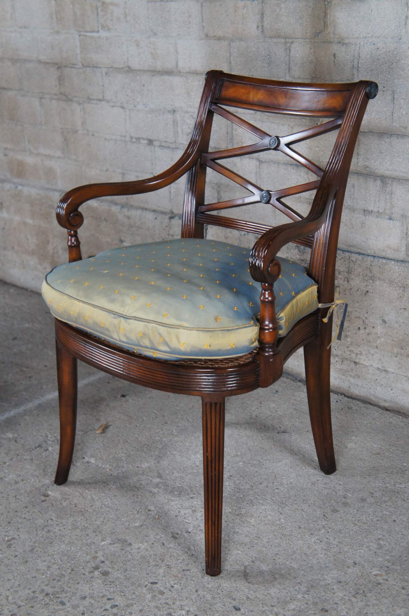 Theodore Alexander 4100. A hand carved armchair with reeded decoration, the over scroll and double 'X' pierced back above a cane seat with upholstered downfilled cushion. The chairs are made from mahogany and feature sabre legs.