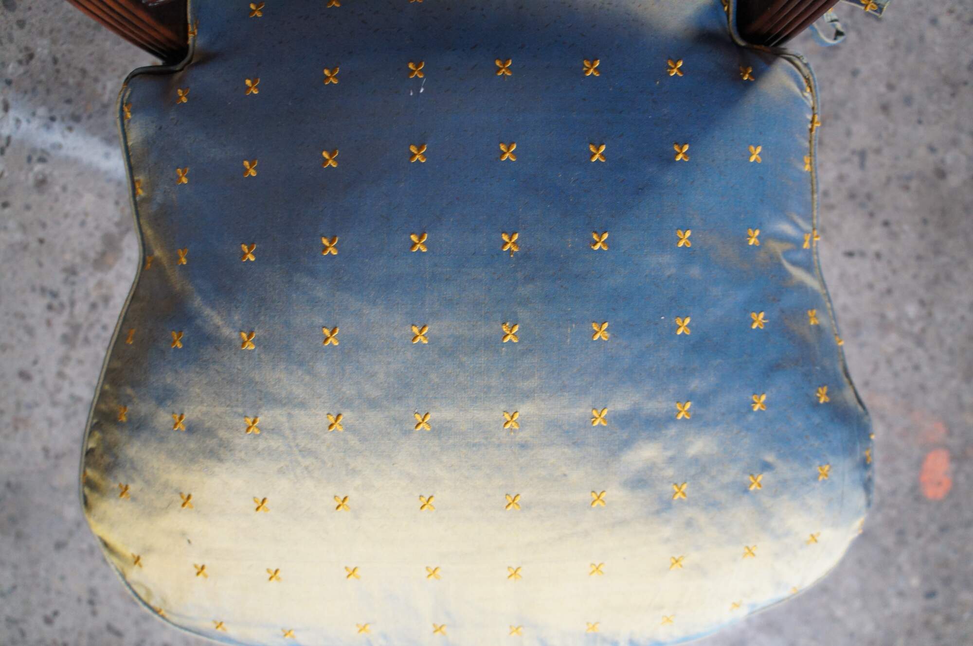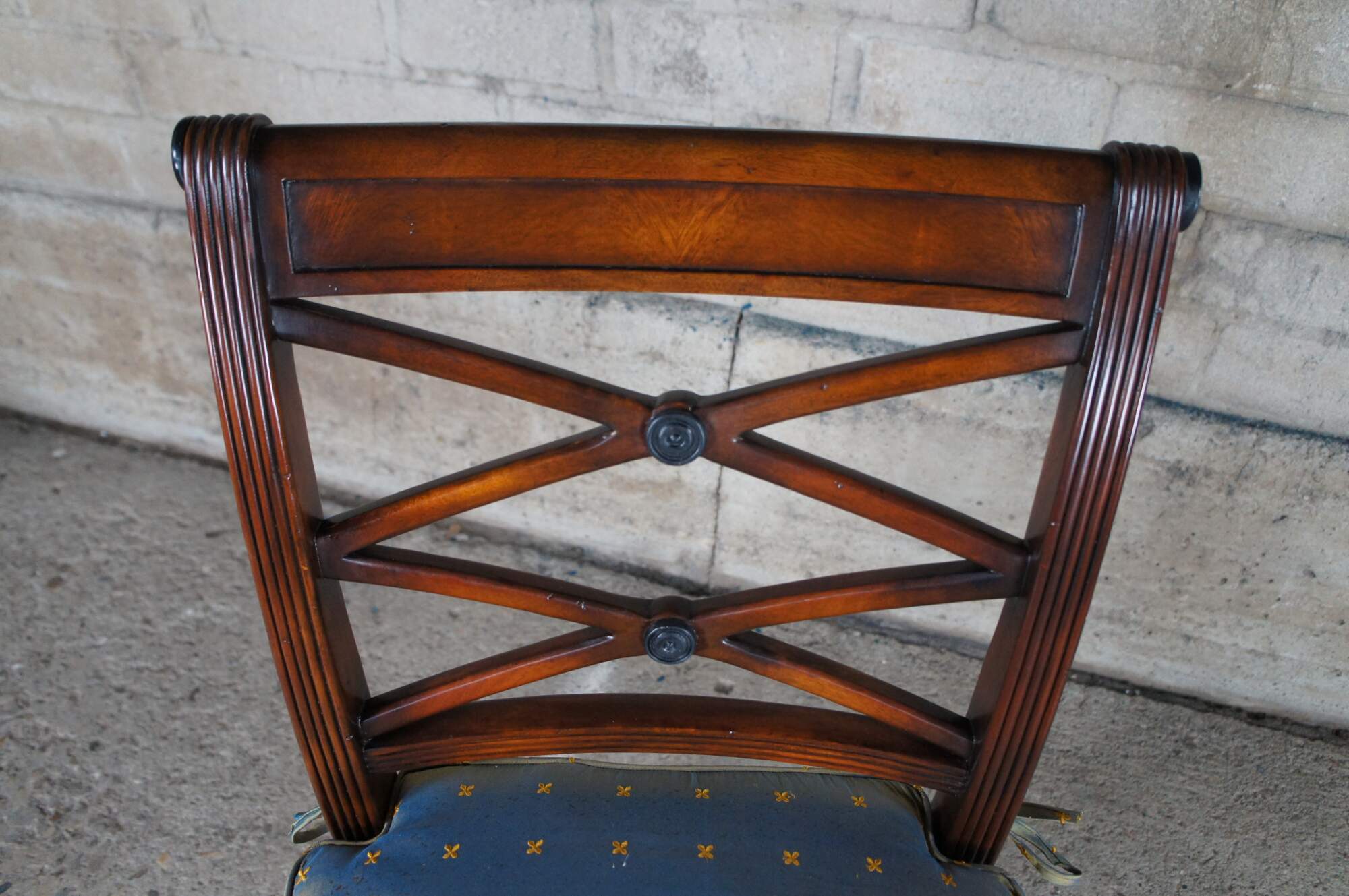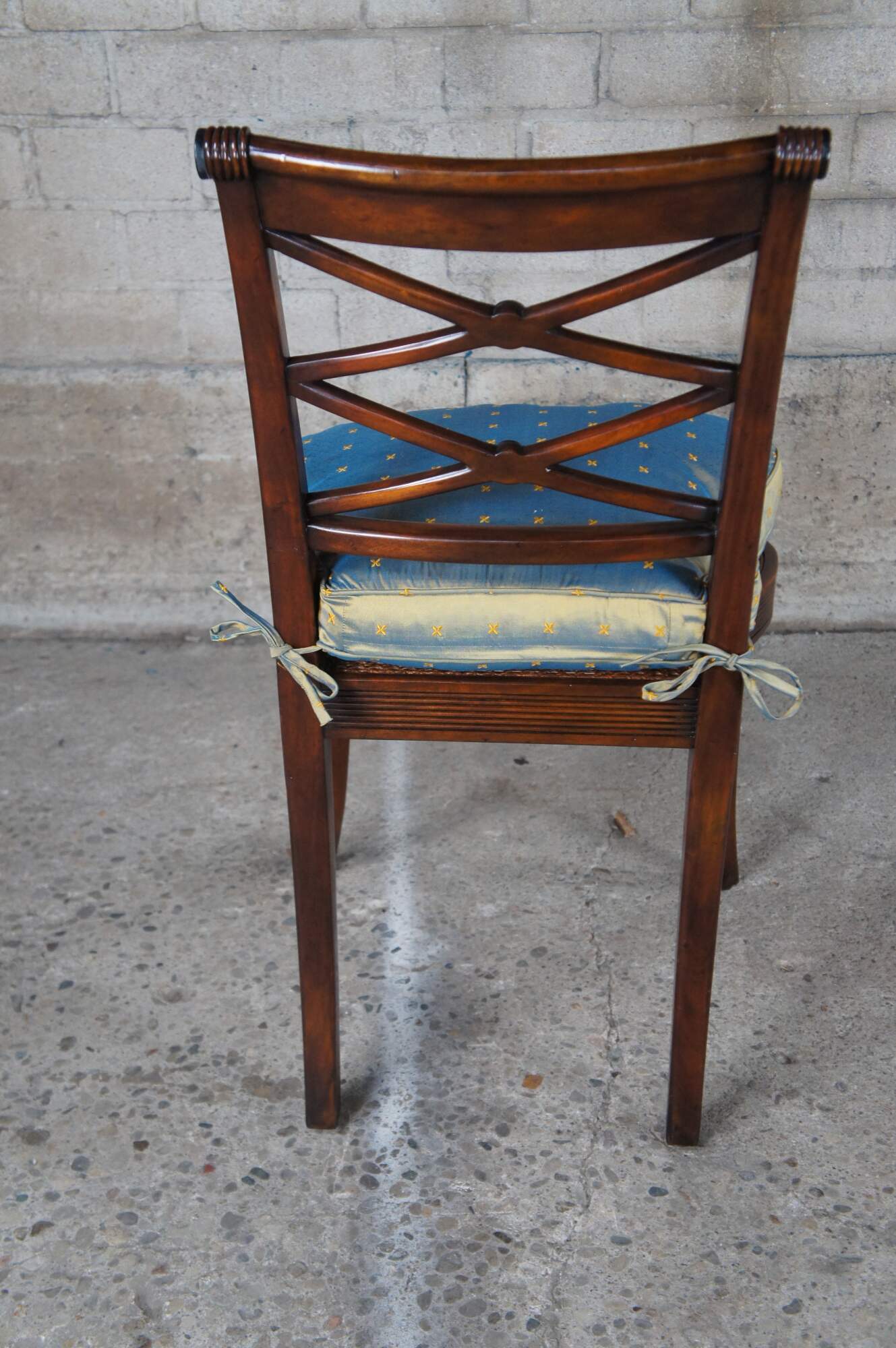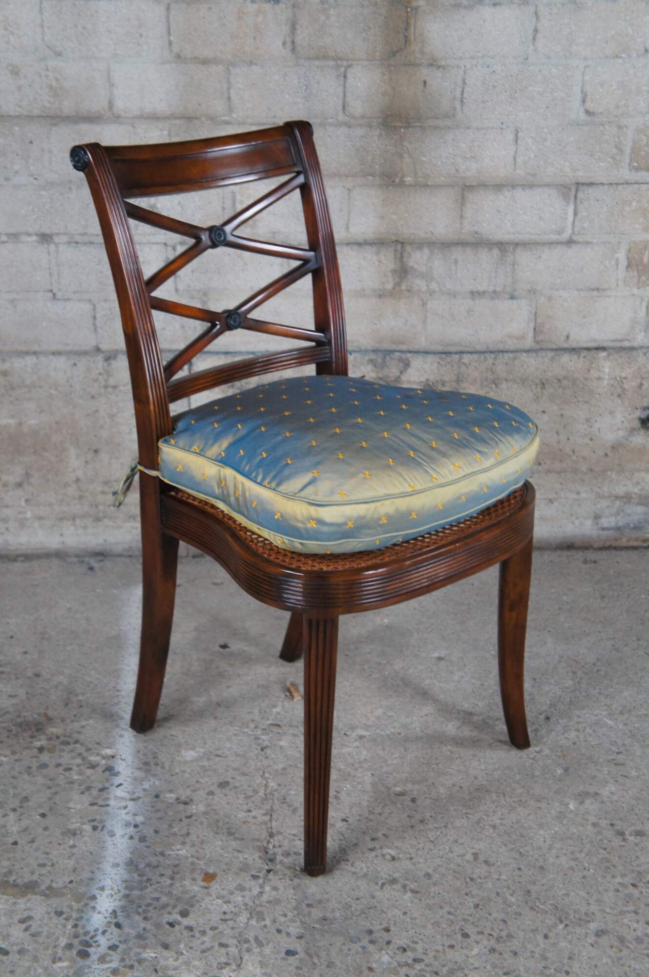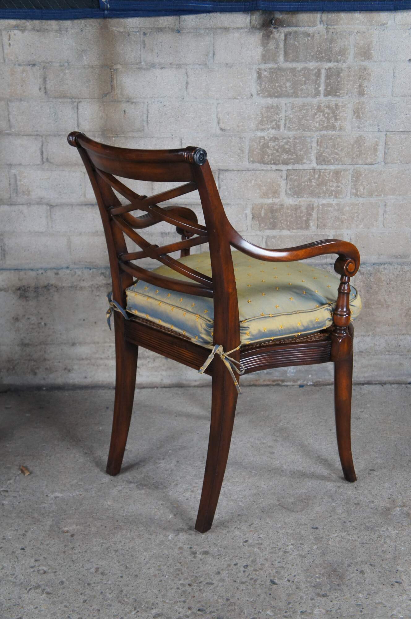 Theodore Alexander 4100. A hand carved armchair with reeded decoration, the over scroll and double 'X' pierced back above a cane seat with upholstered downfilled cushion. The chairs are made from mahogany and feature sabre legs.