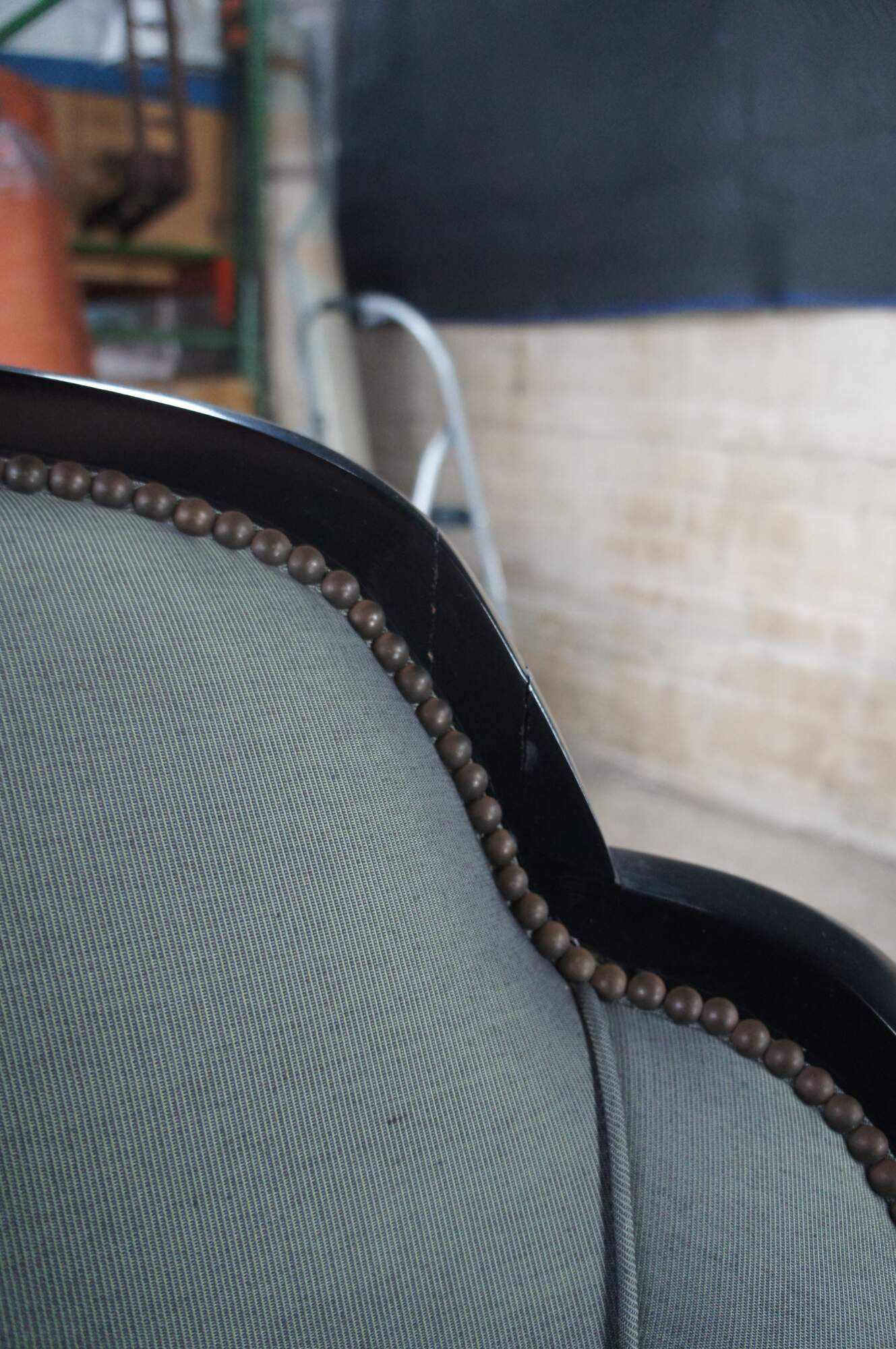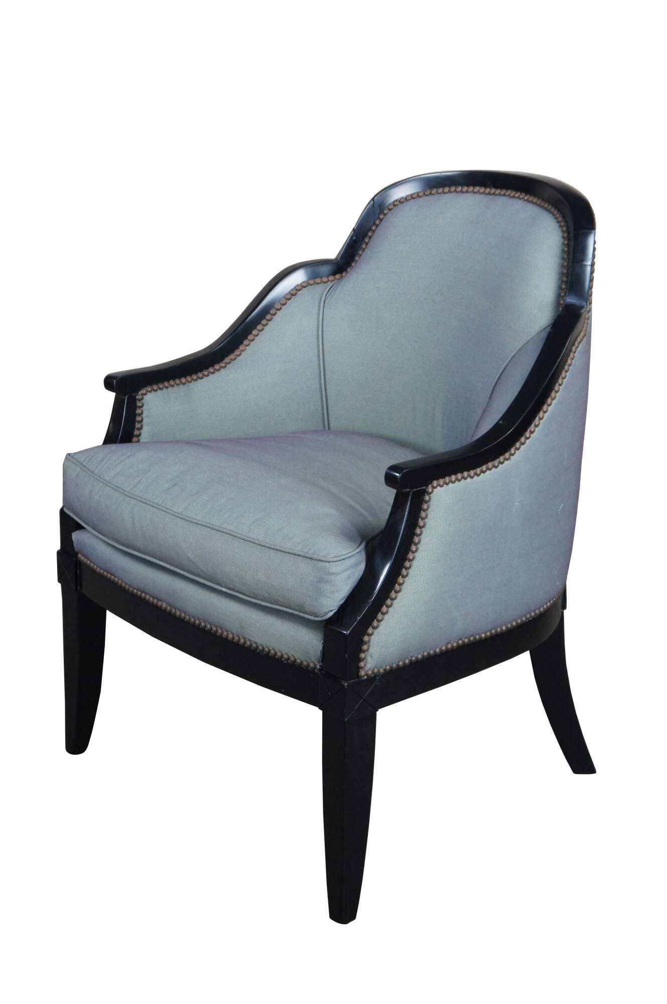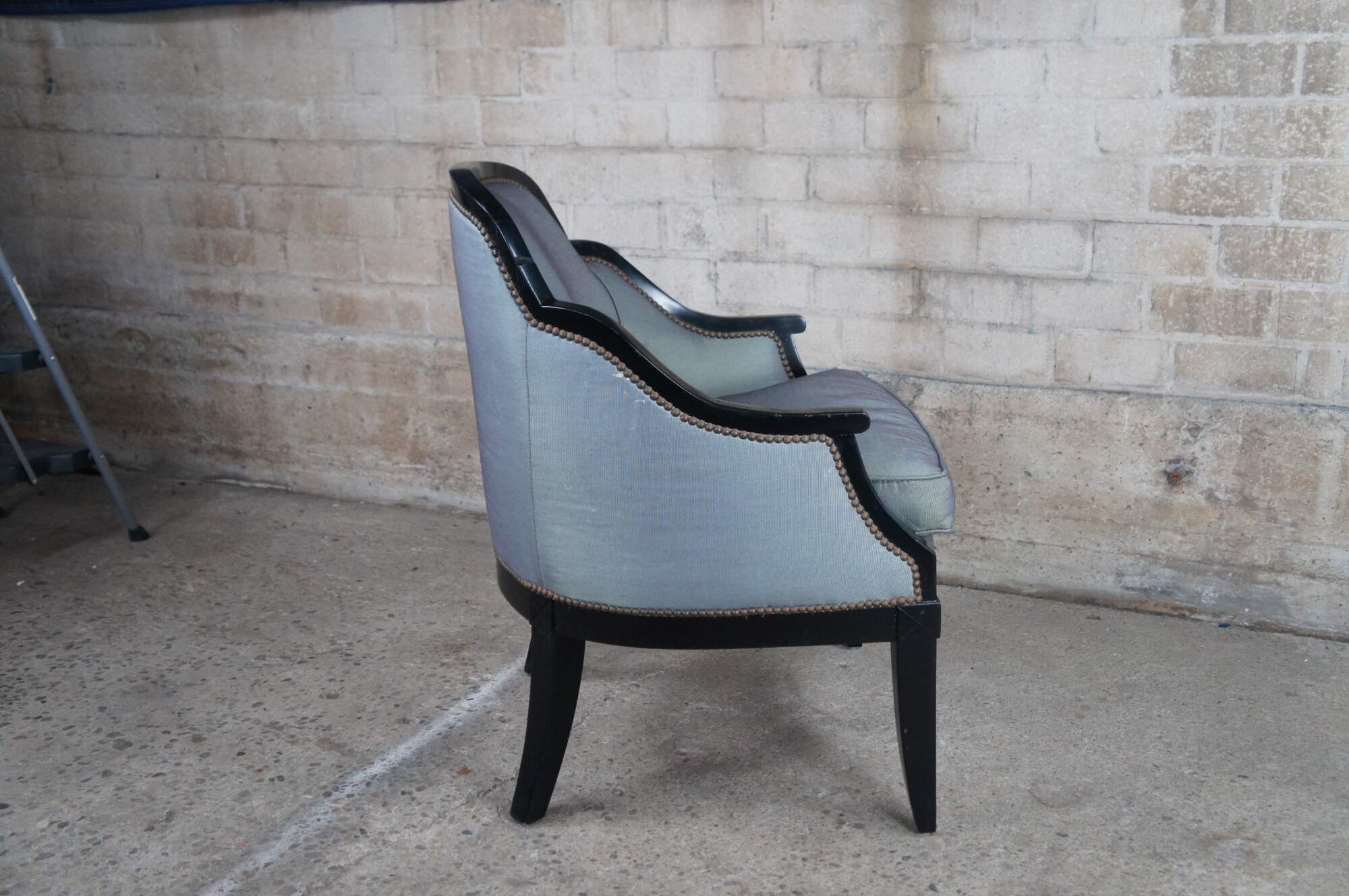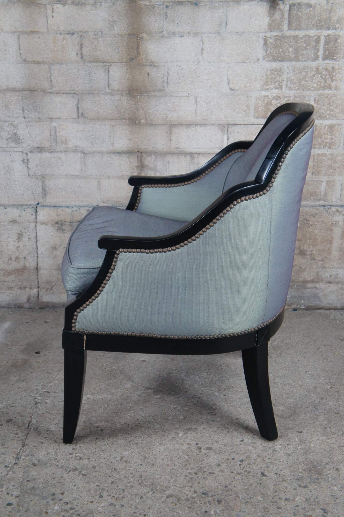 Two vintage Grafton Furniture club / lounge / library accent chairs featuring art deco style ebonized frame with scalloped / sloped arm design and nailhead trim.