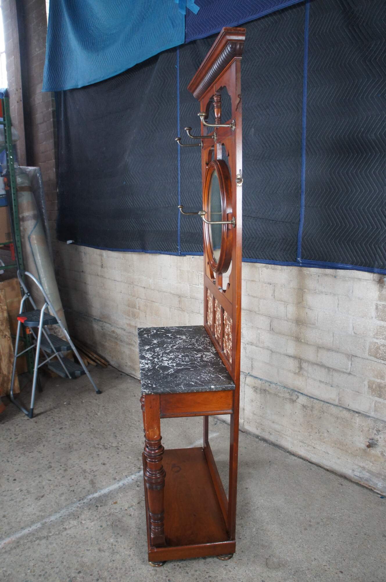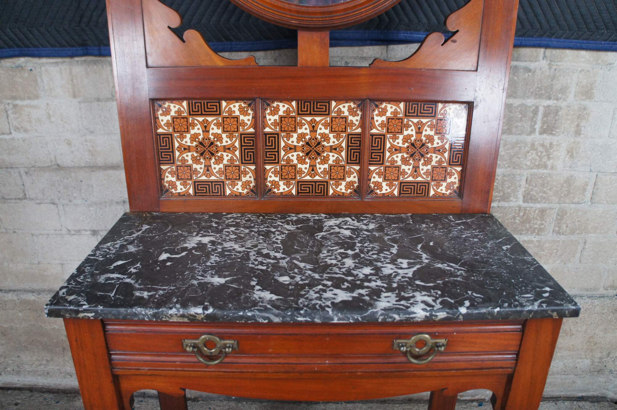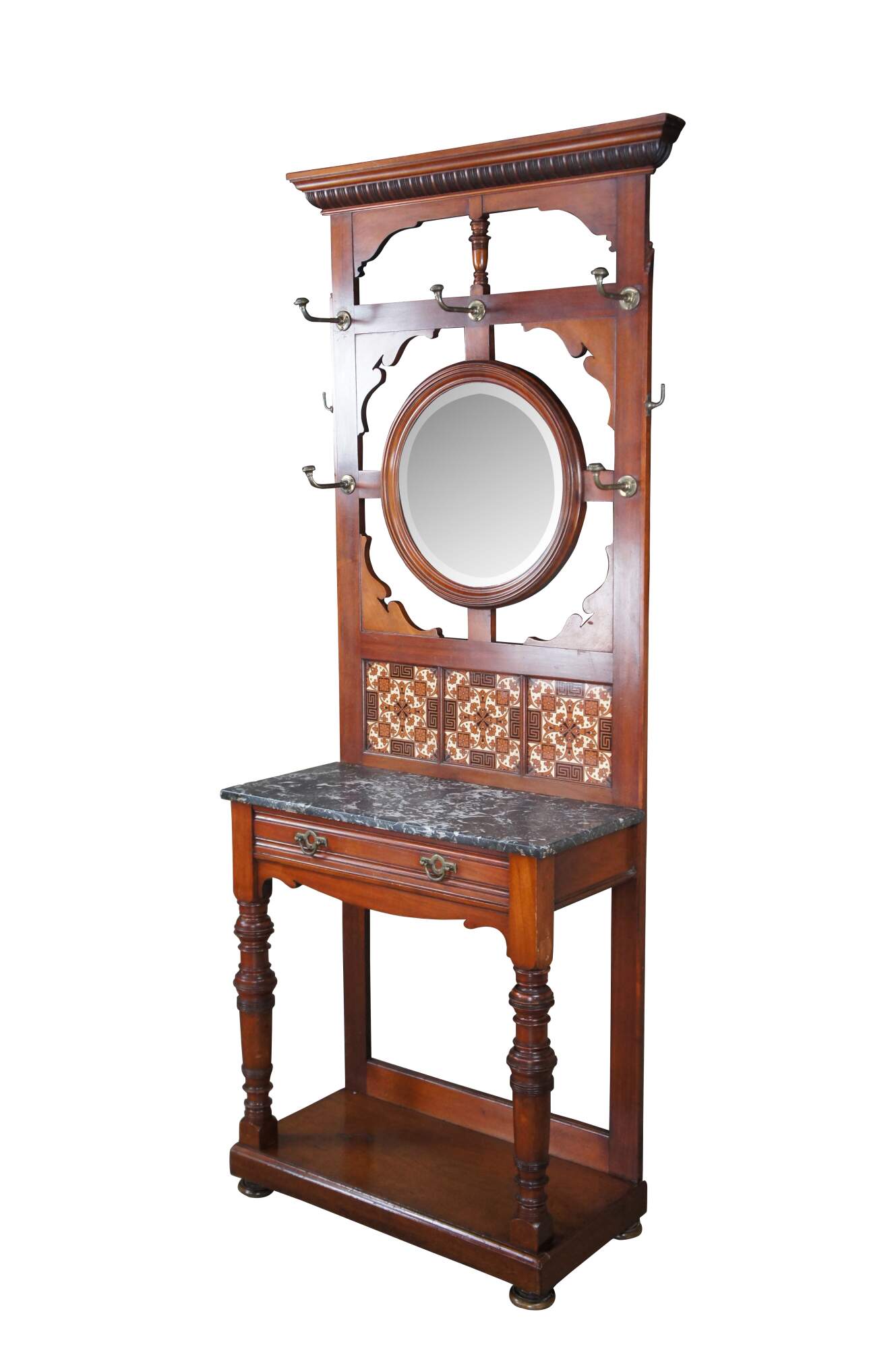 Antique Victorian era hall tree / stand / console. Made of mahogany featuring arts and crafts styling with serpentine reticulated back supporting a round beveled mirror surrouned by multiple hooks / hangers. The back features three tiled inserts, marble top, one drawer and turned legs over bun feet.