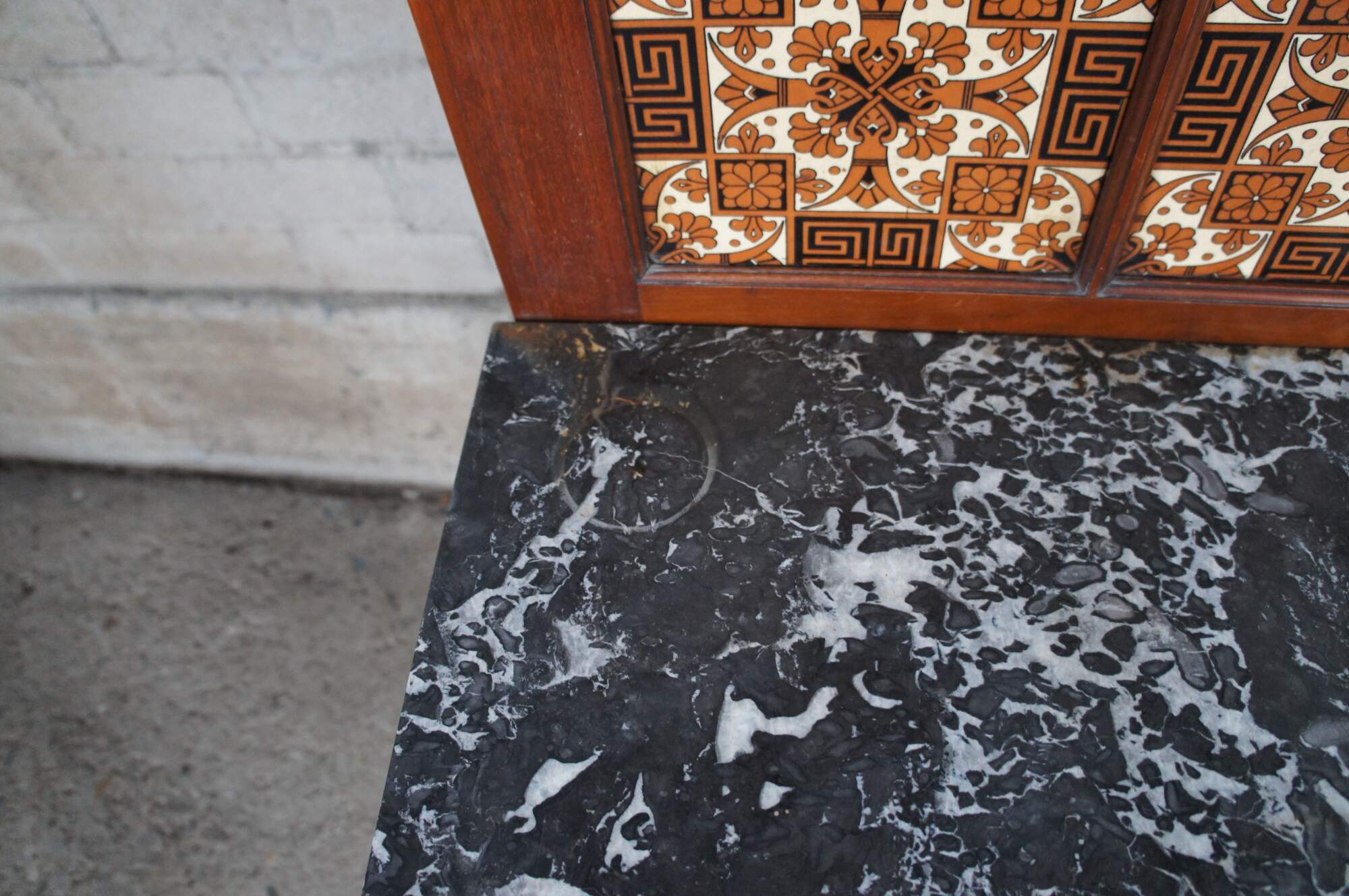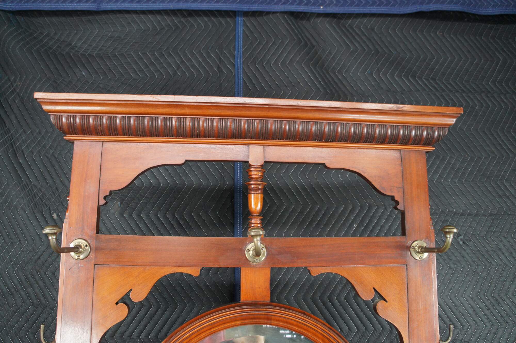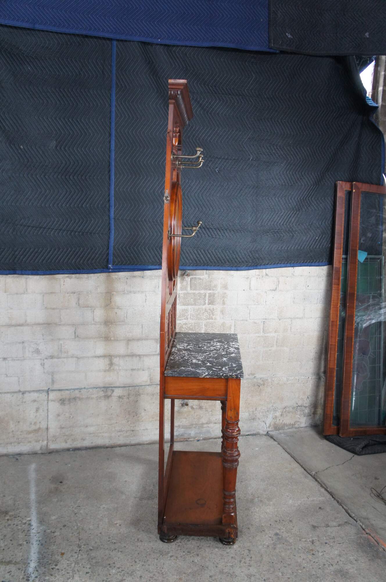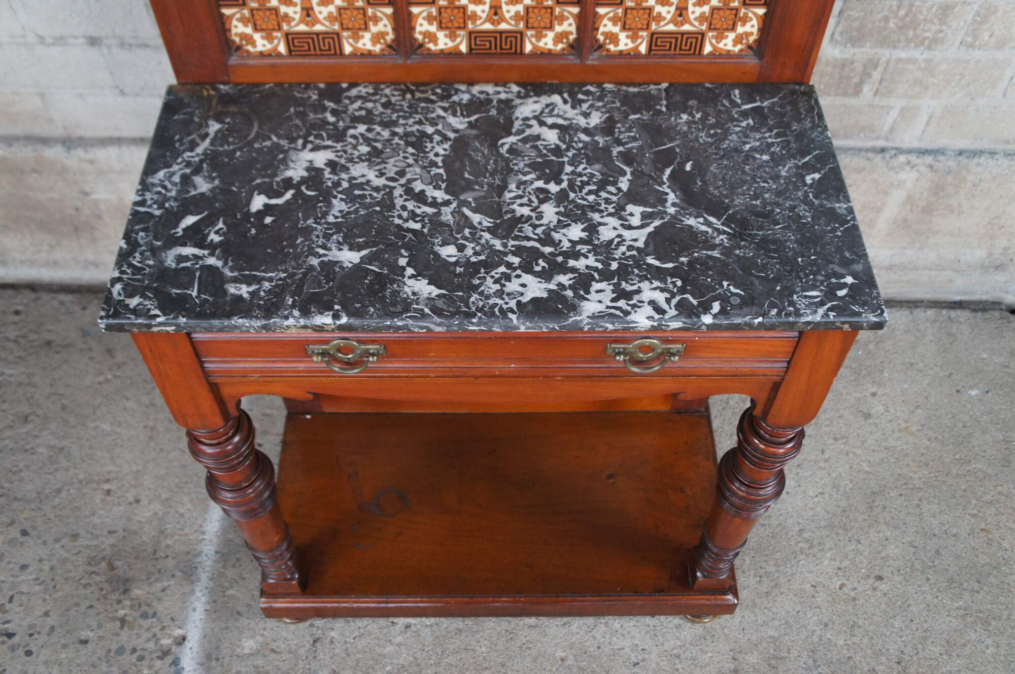 Antique Victorian era hall tree / stand / console. Made of mahogany featuring arts and crafts styling with serpentine reticulated back supporting a round beveled mirror surrouned by multiple hooks / hangers. The back features three tiled inserts, marble top, one drawer and turned legs over bun feet.