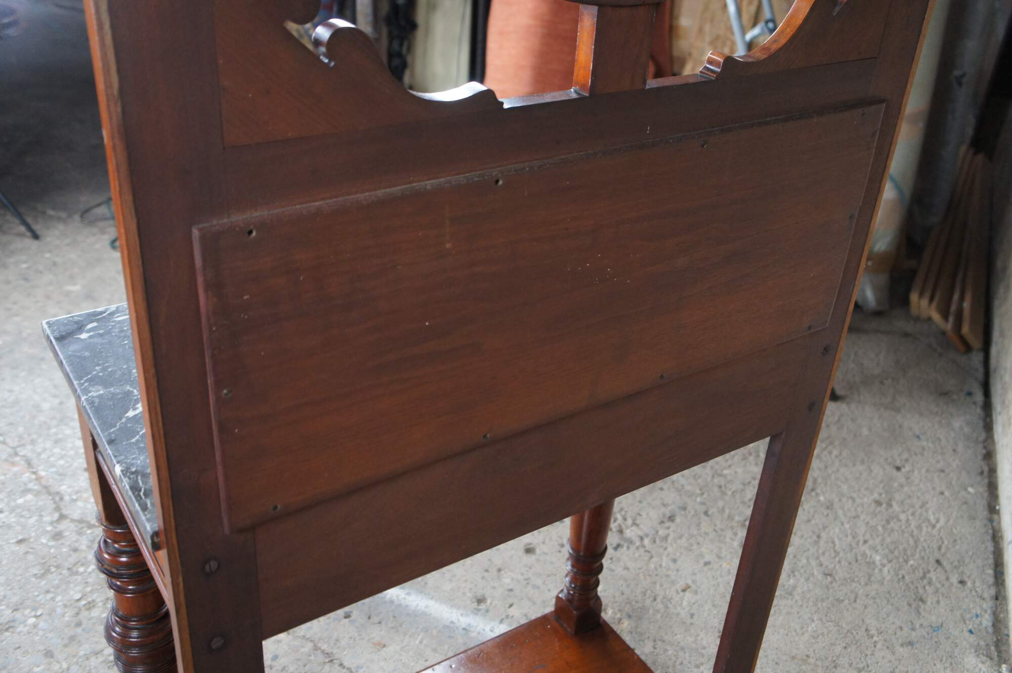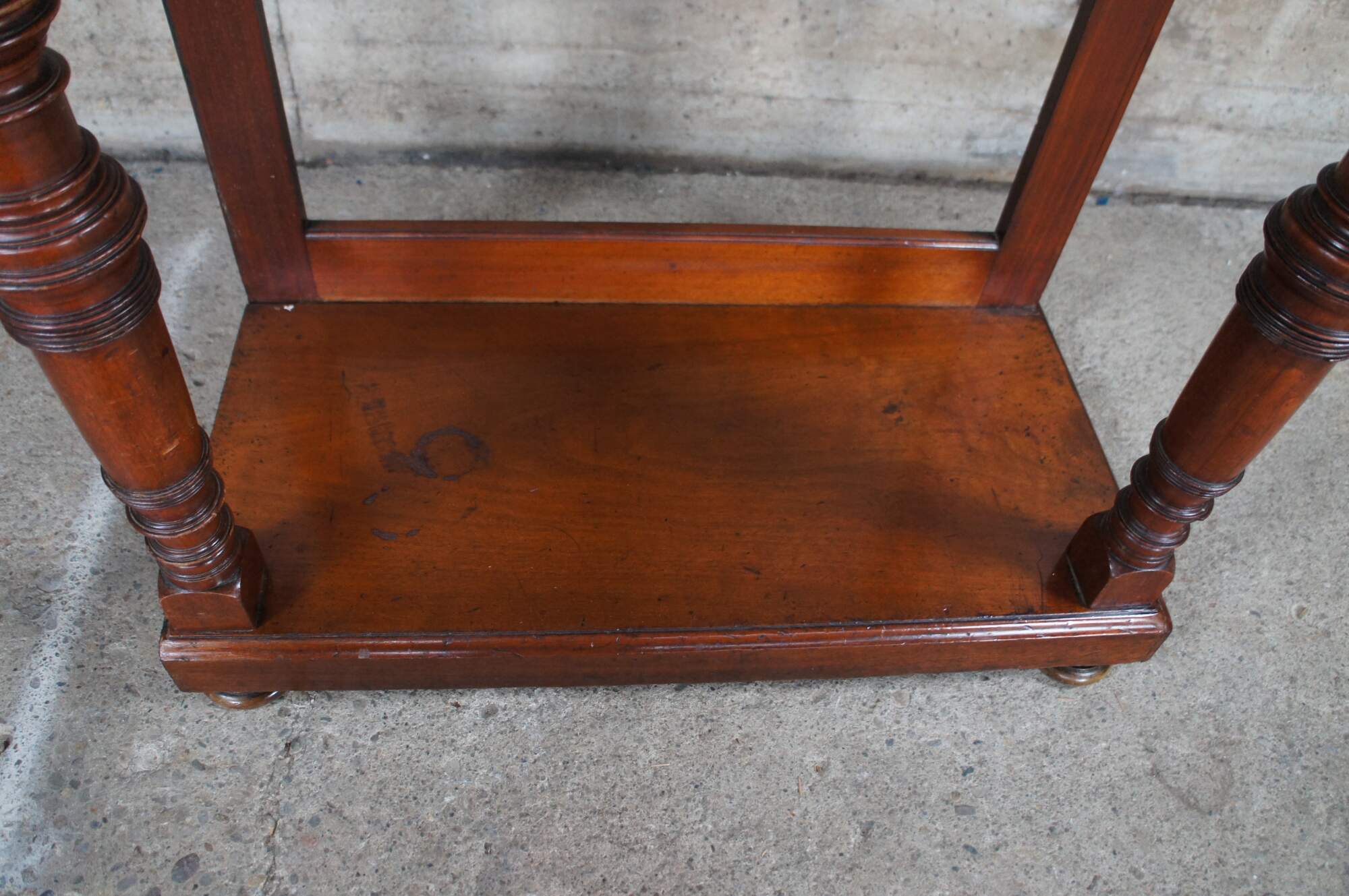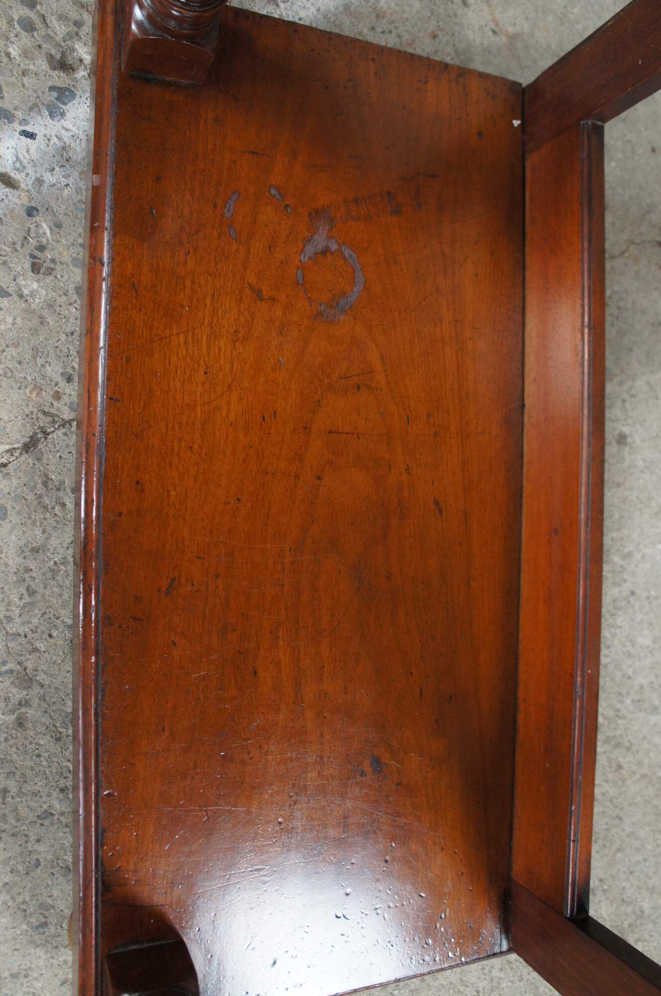 Good antique condition, wear and distressing commensurate with age and use, marking / fading / dings, few rings, hazing / streaking to mirror.