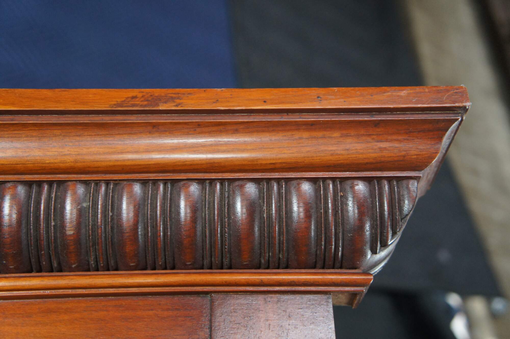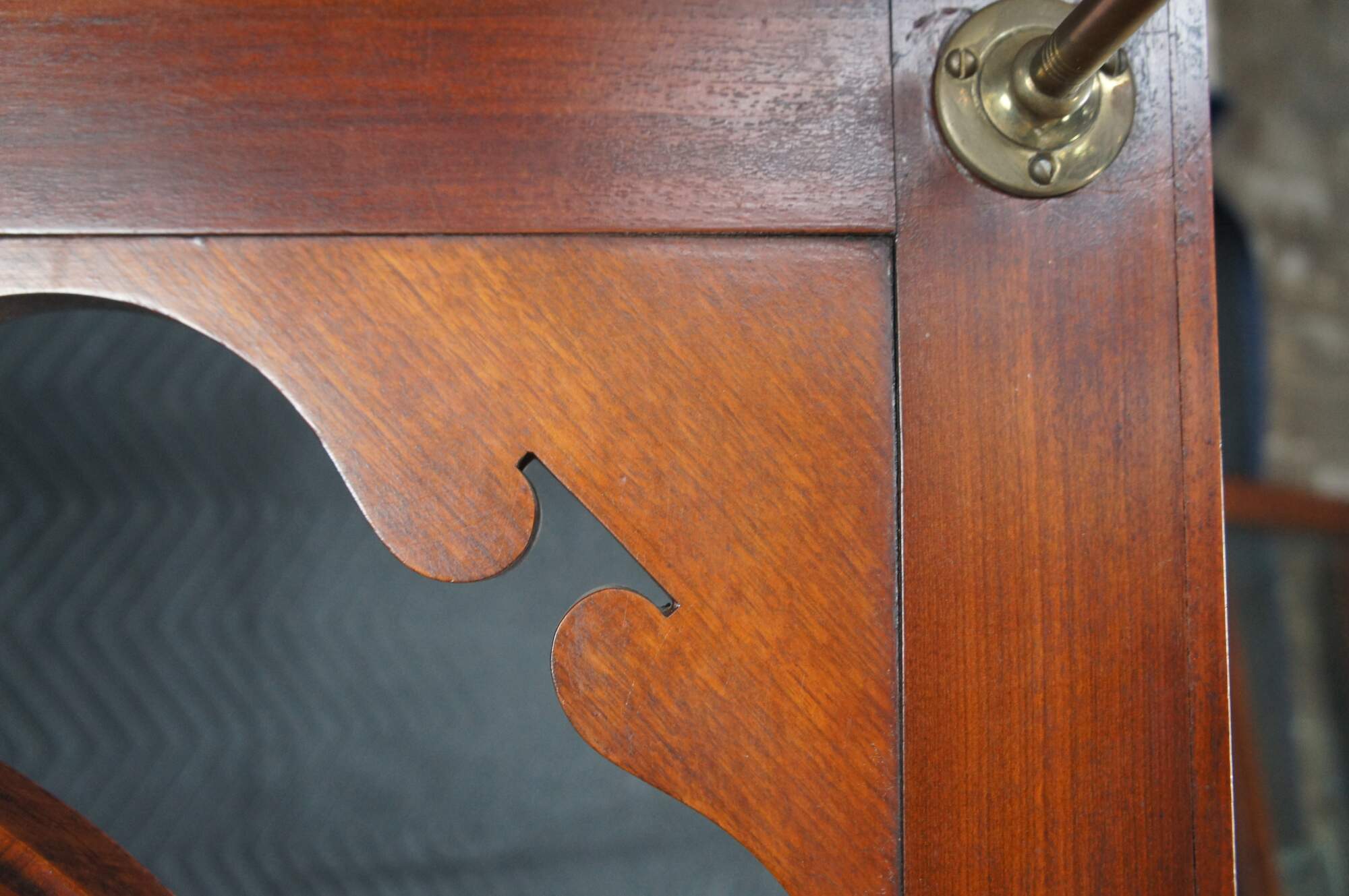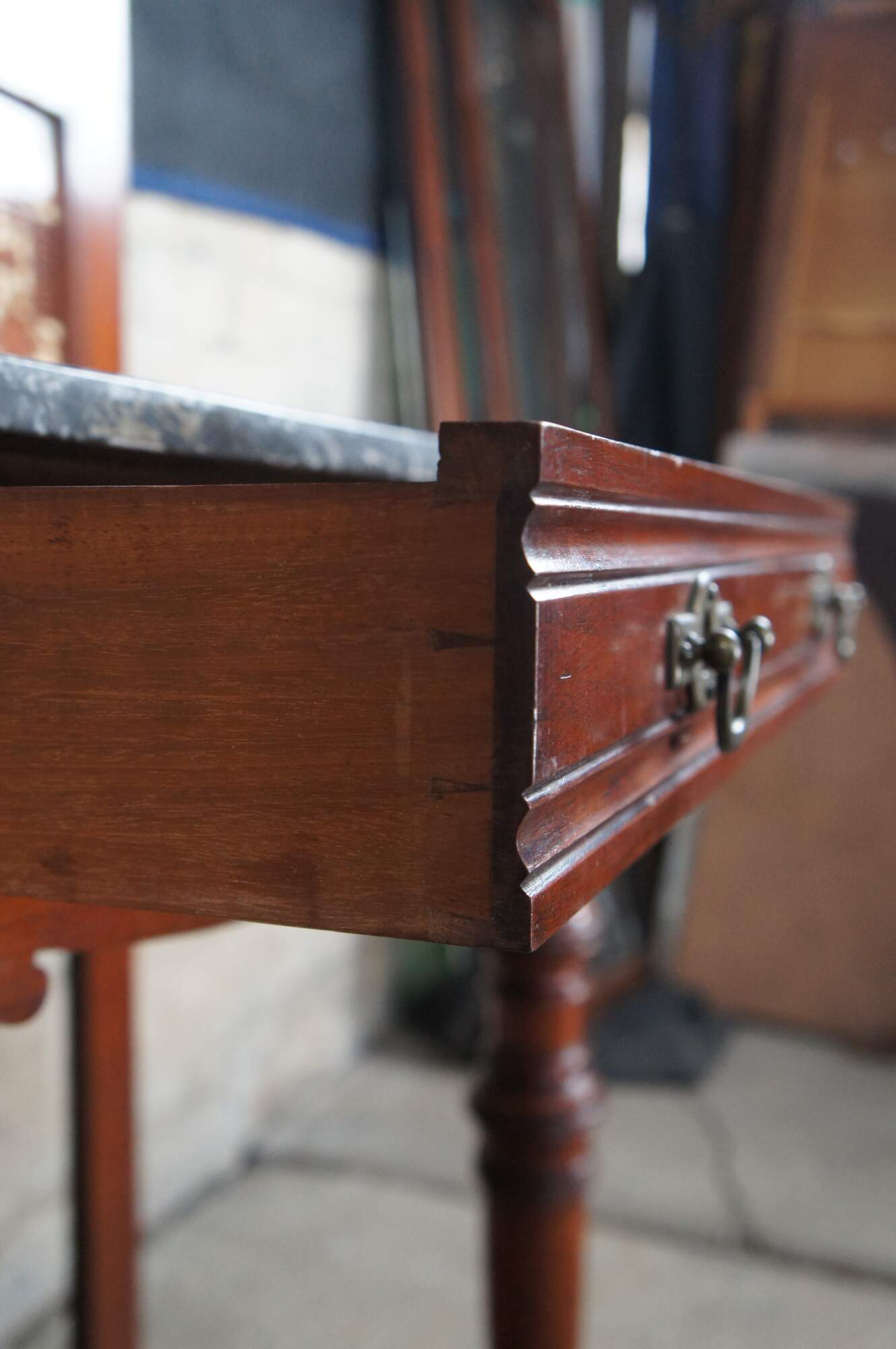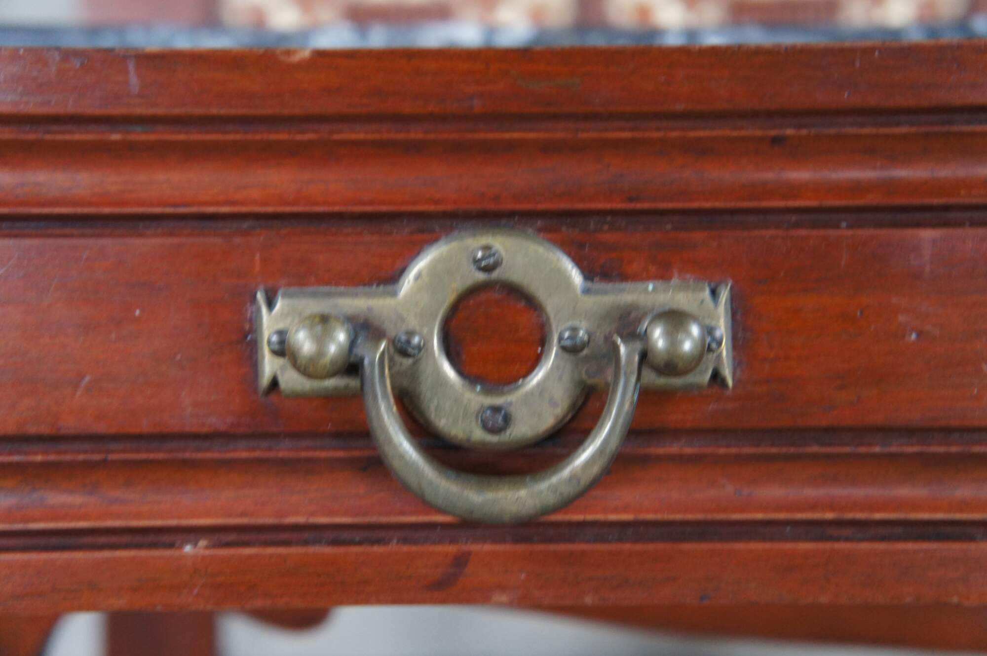 Good antique condition, wear and distressing commensurate with age and use, marking / fading / dings, few rings, hazing / streaking to mirror.