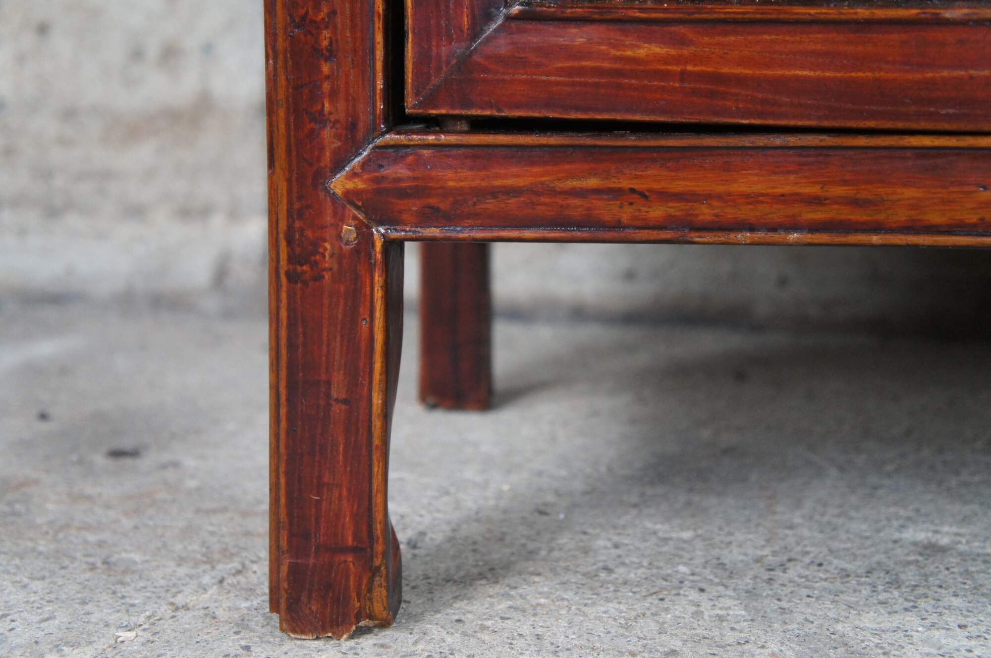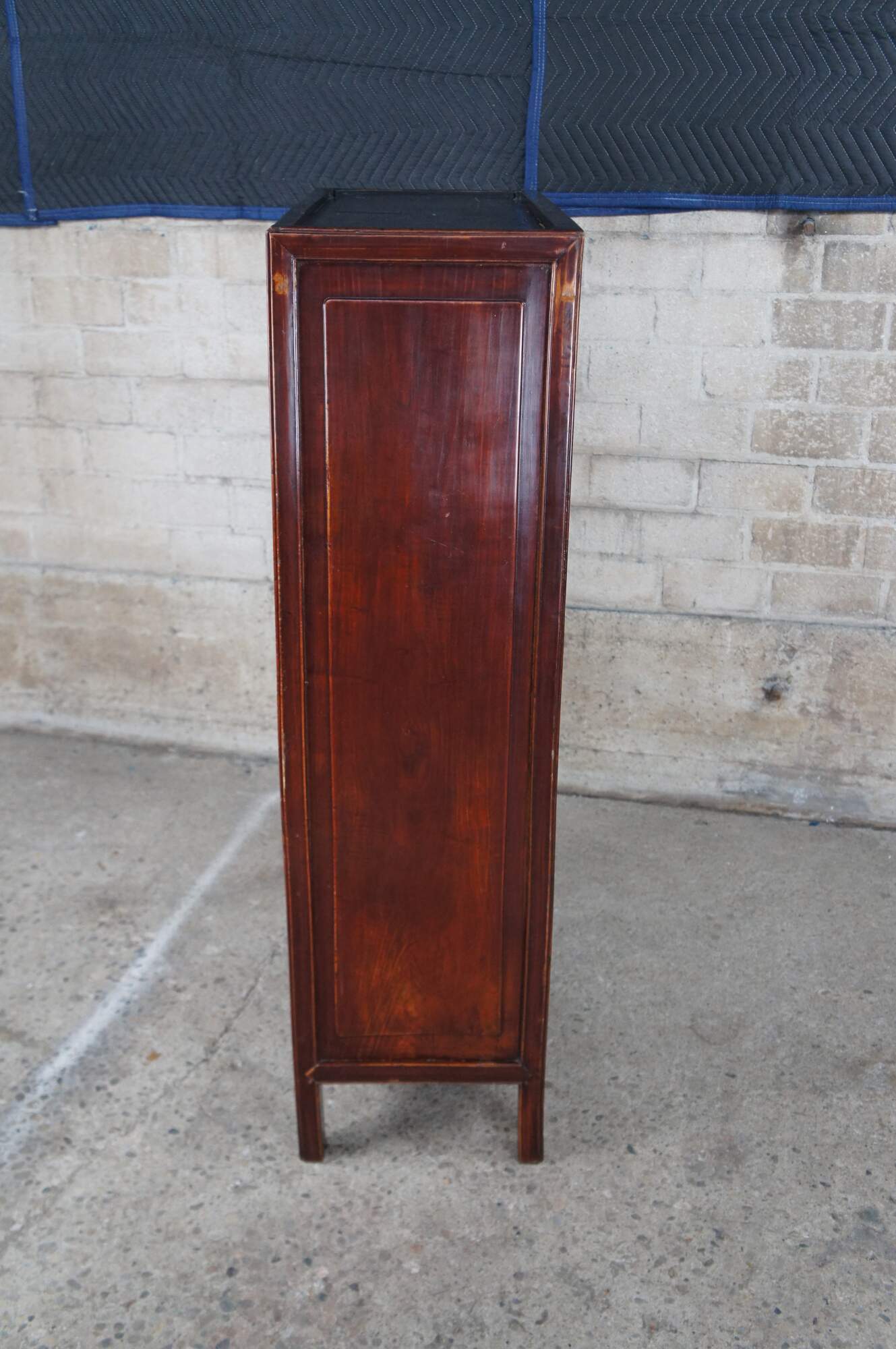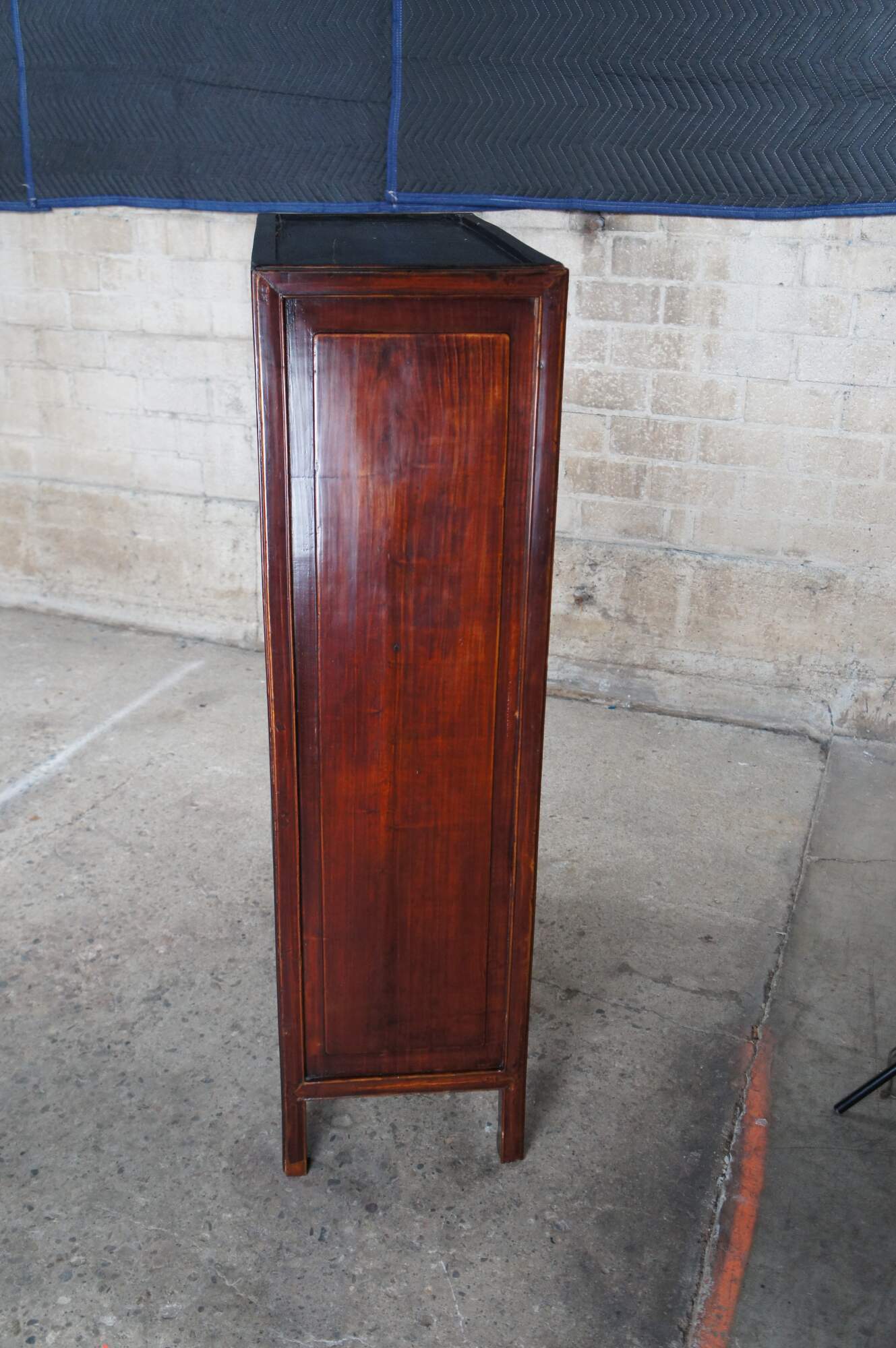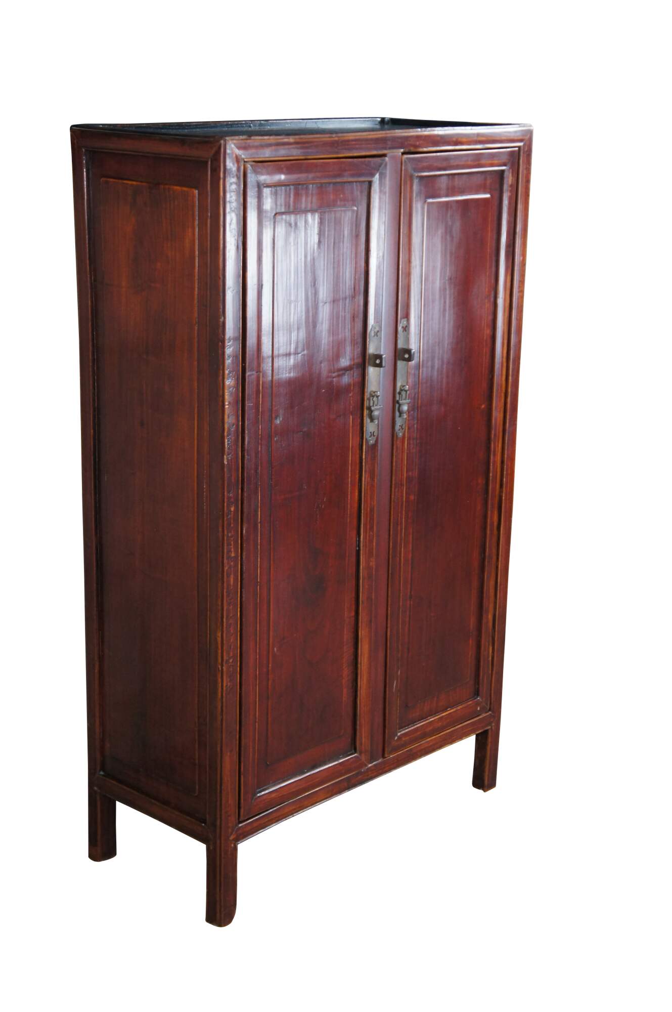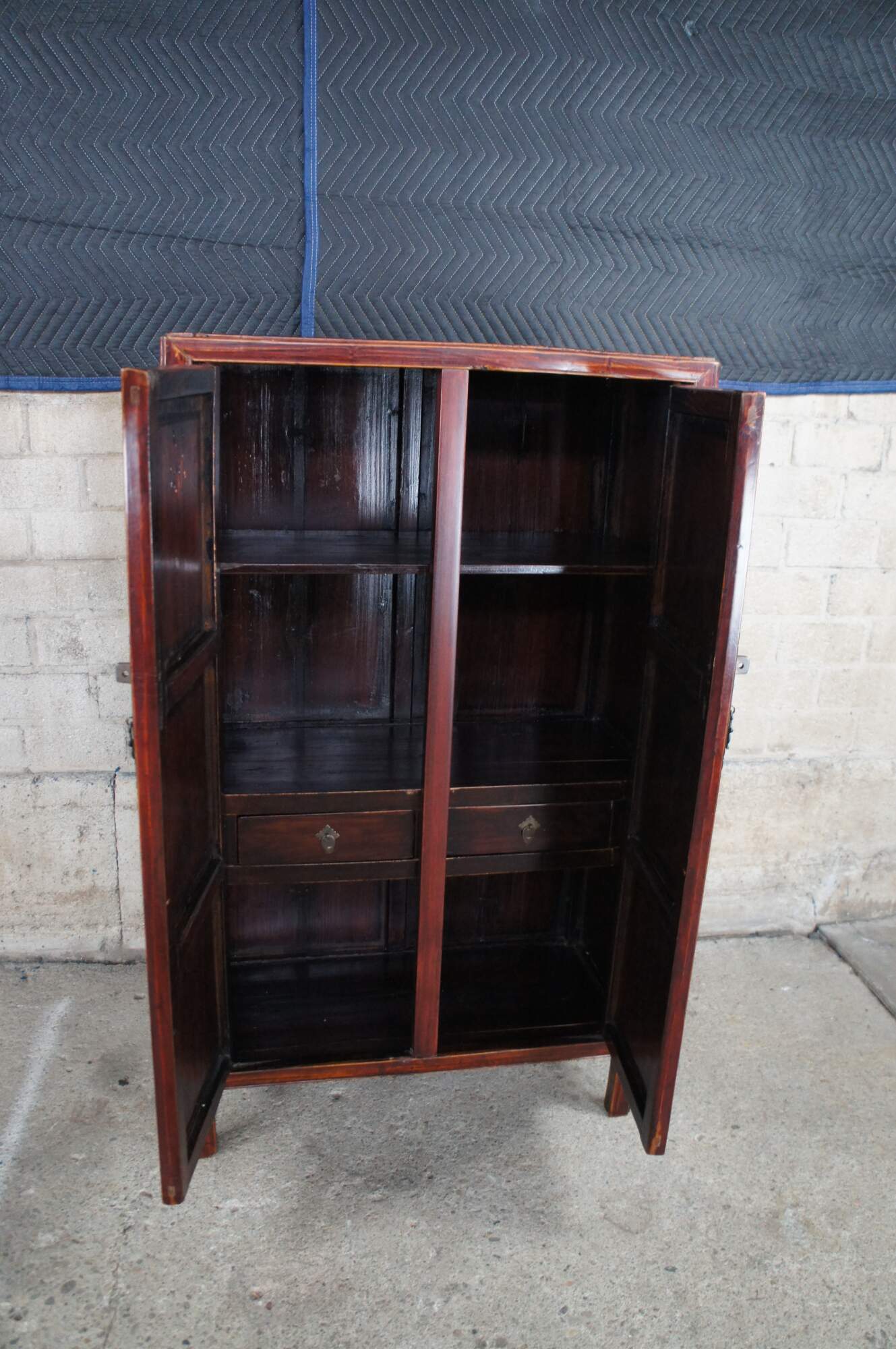 Vintage Chinese Chinoiserie Ming style wedding cabinet / cupboard / armoire / wardrobe. Made of Elm featuring a dark red / brown lacquered finish with two doors that open to reveal three shelves / storage areas and two drawers.