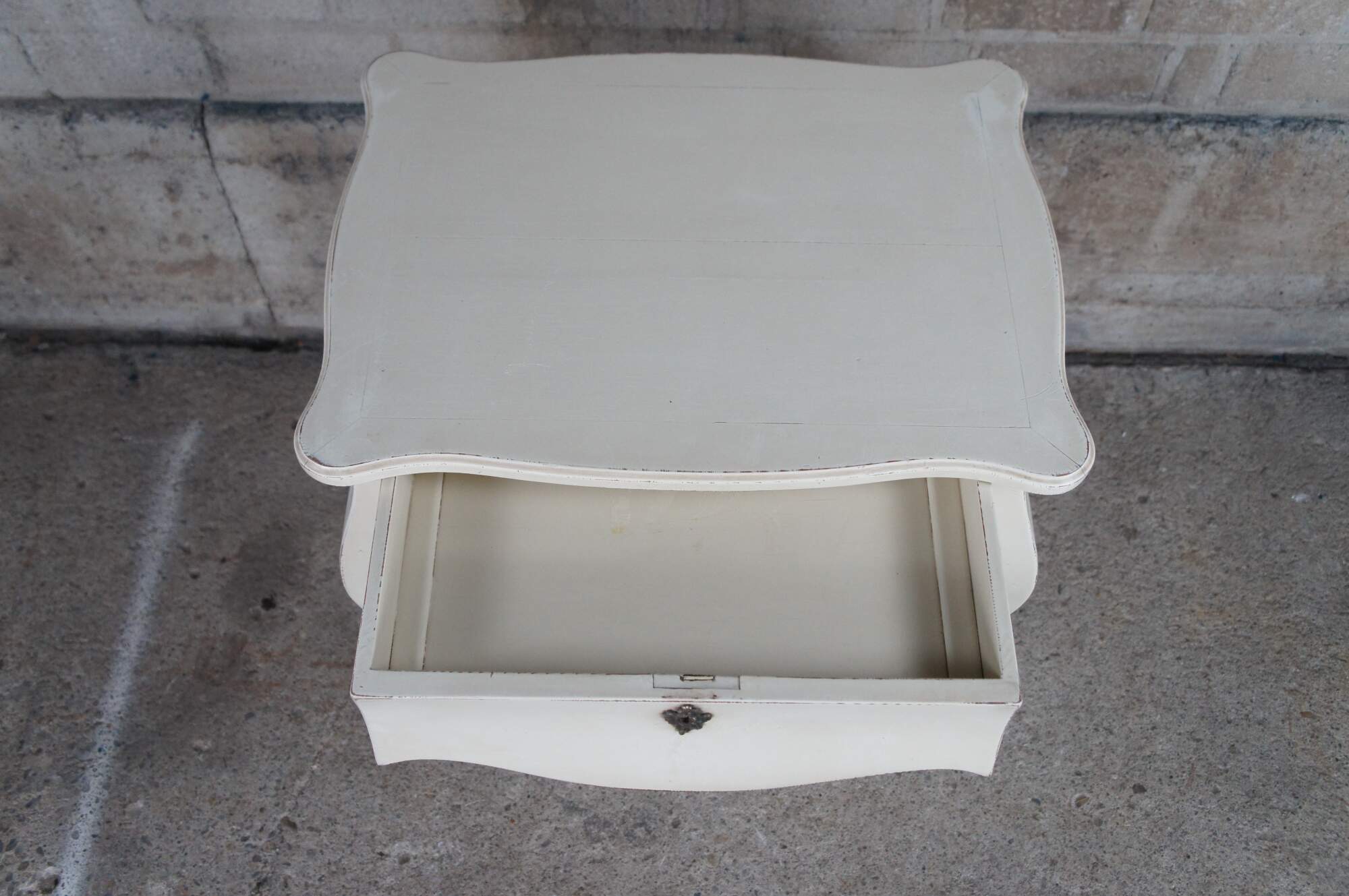 French Victorian style desk / console / table featuring chic white painted exterior with scalloped serpentine form and one drawer.