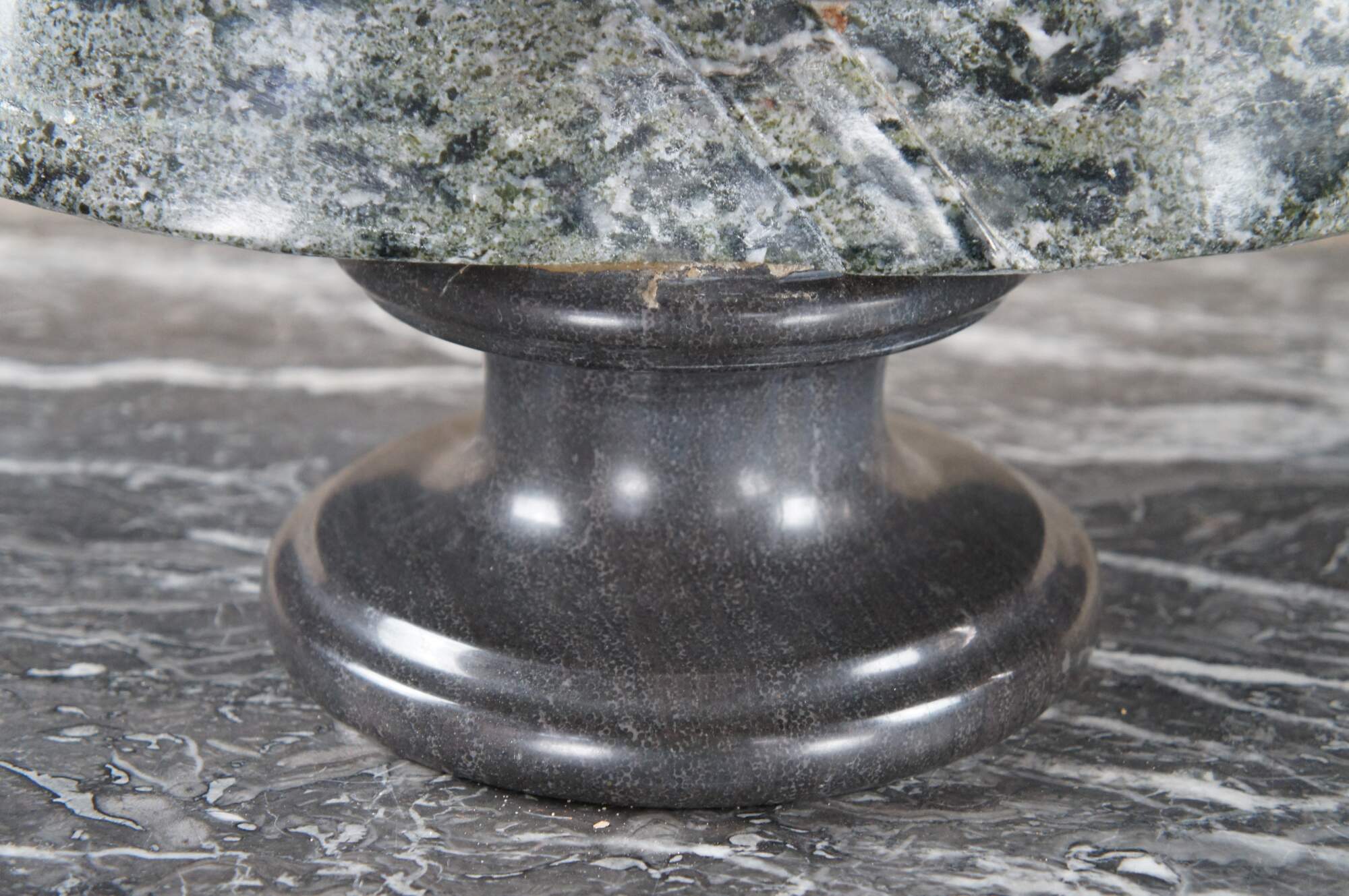 A carved two-toned marble bust depicting the image of Apollo with draped garb details. Mounted to a round tapered marble plinth. circa 20th century. Very heavy and stately. Made in Italy. Perfect for display on a table, bookcase or stand.