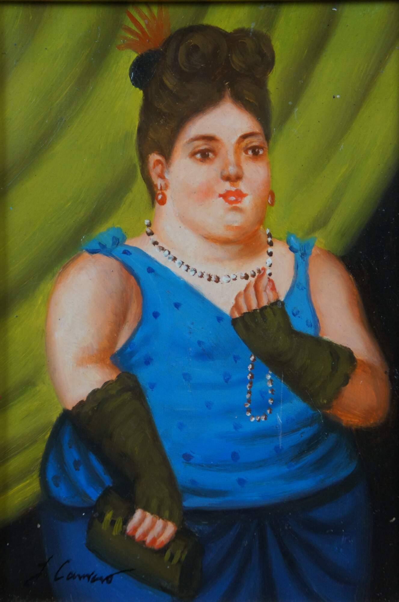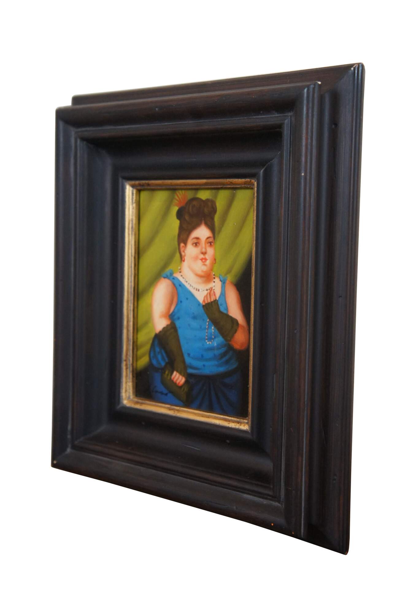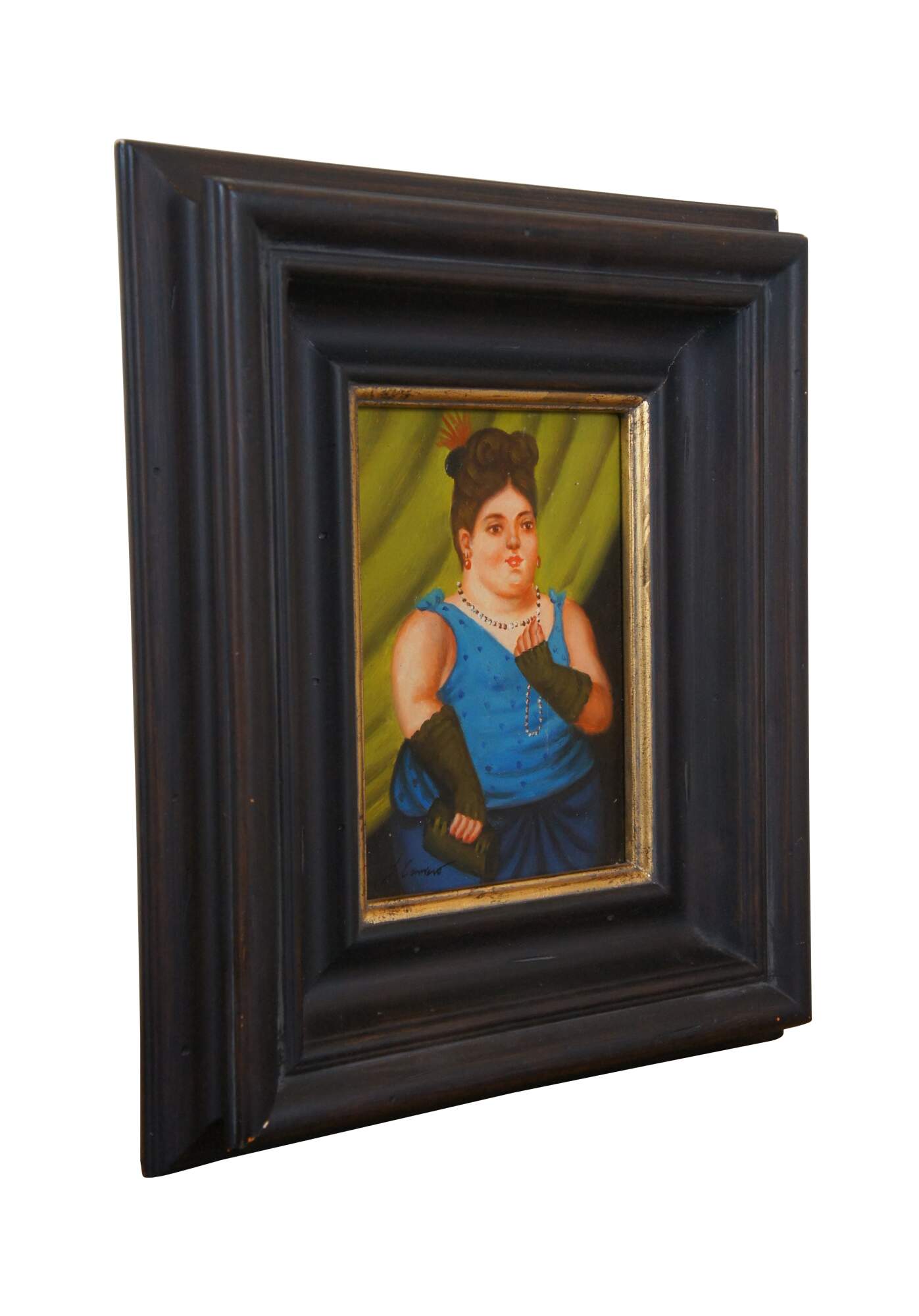 Late 20th century oil on board portrait painting after Fernando Botero's 1997 painting "Society Lady." Shows a full, round, female figure elegantly dressed in a blue gown, green gloves and clutch, right hand raised to play with her necklace of pearls. Signed J. Camus in lower left corner. Produced for Timeless Treasures. Includes Certificate of Authenticity, number AFD131516. Dark wood frame with raised bevel.