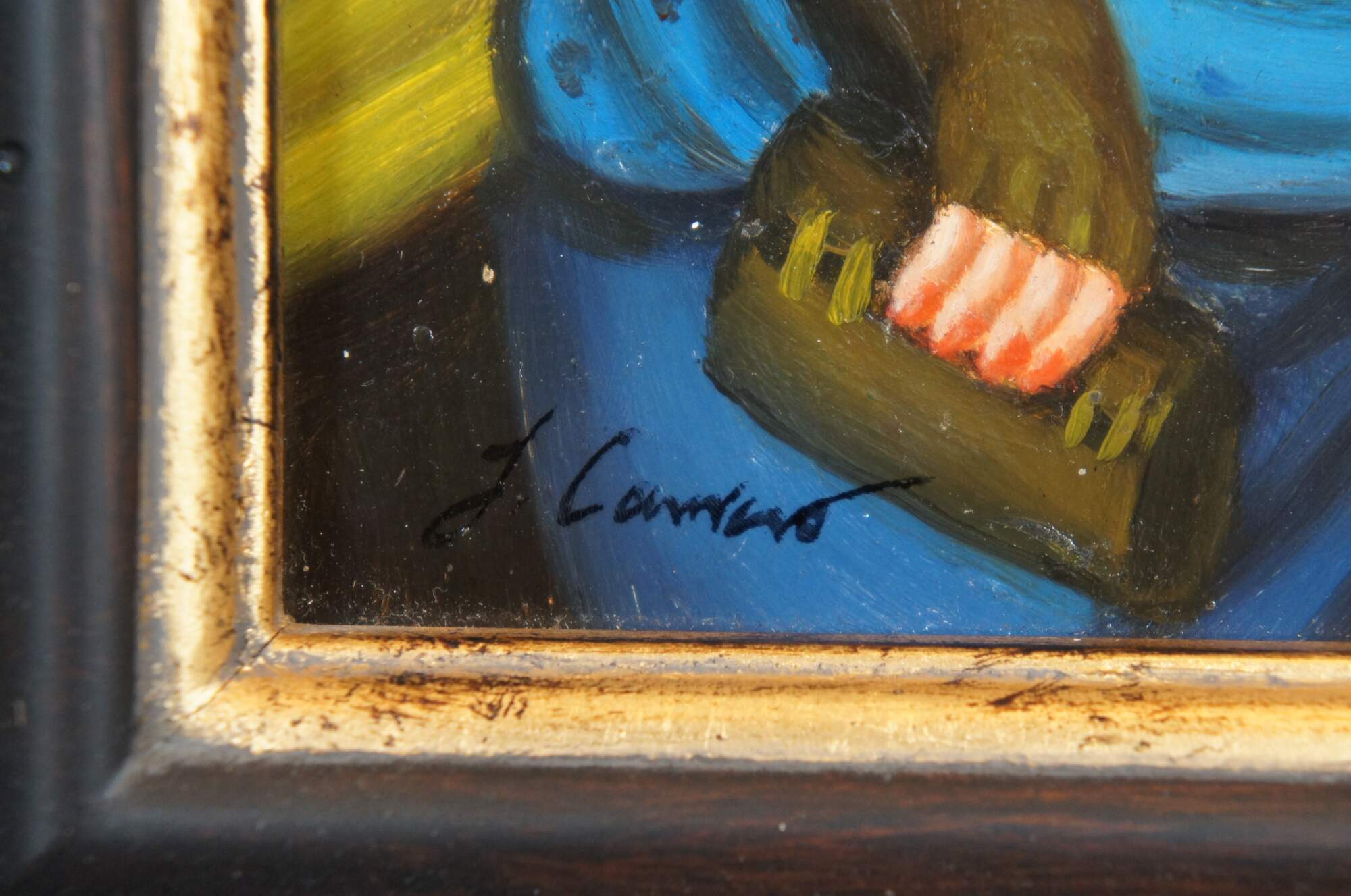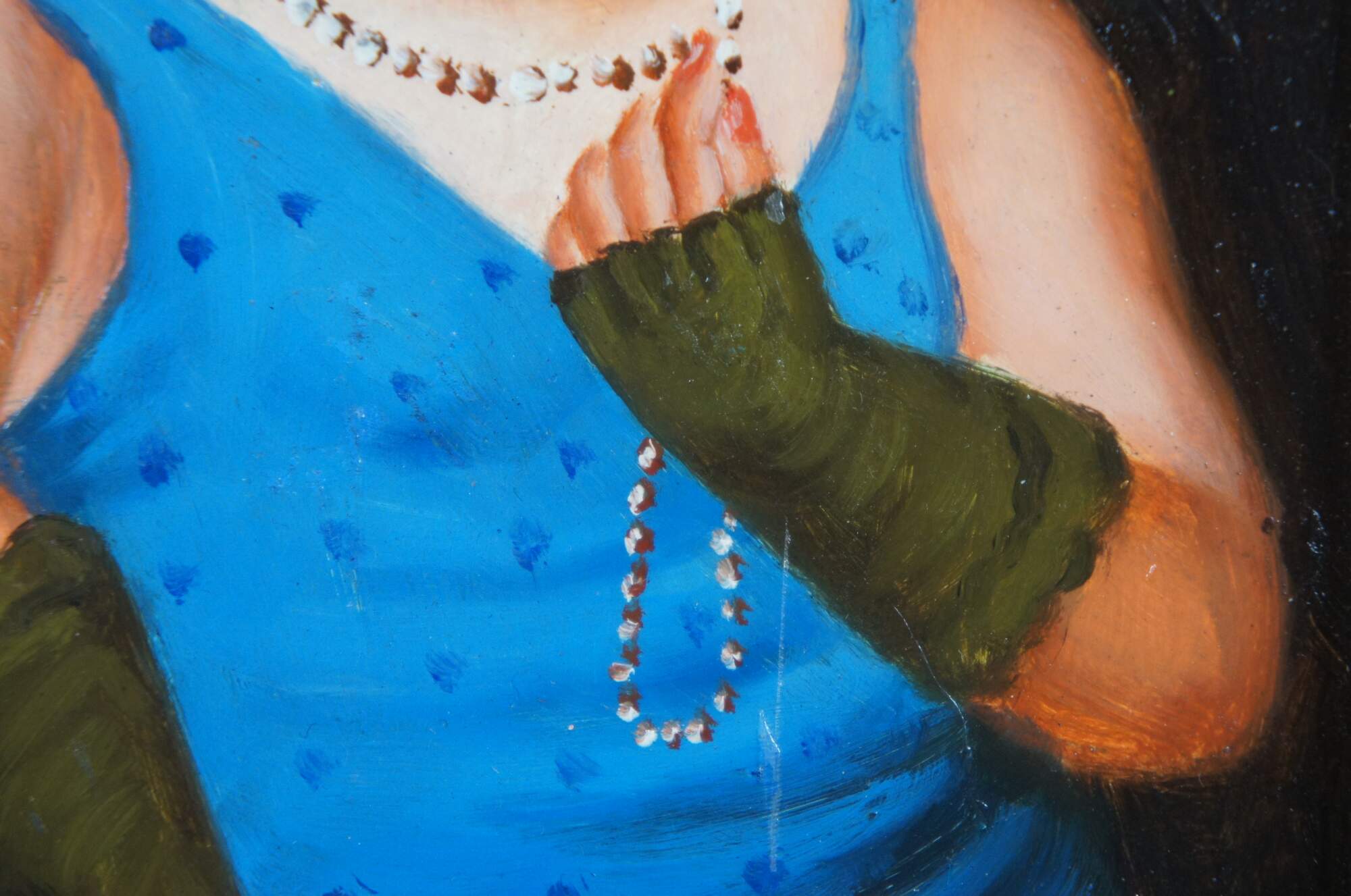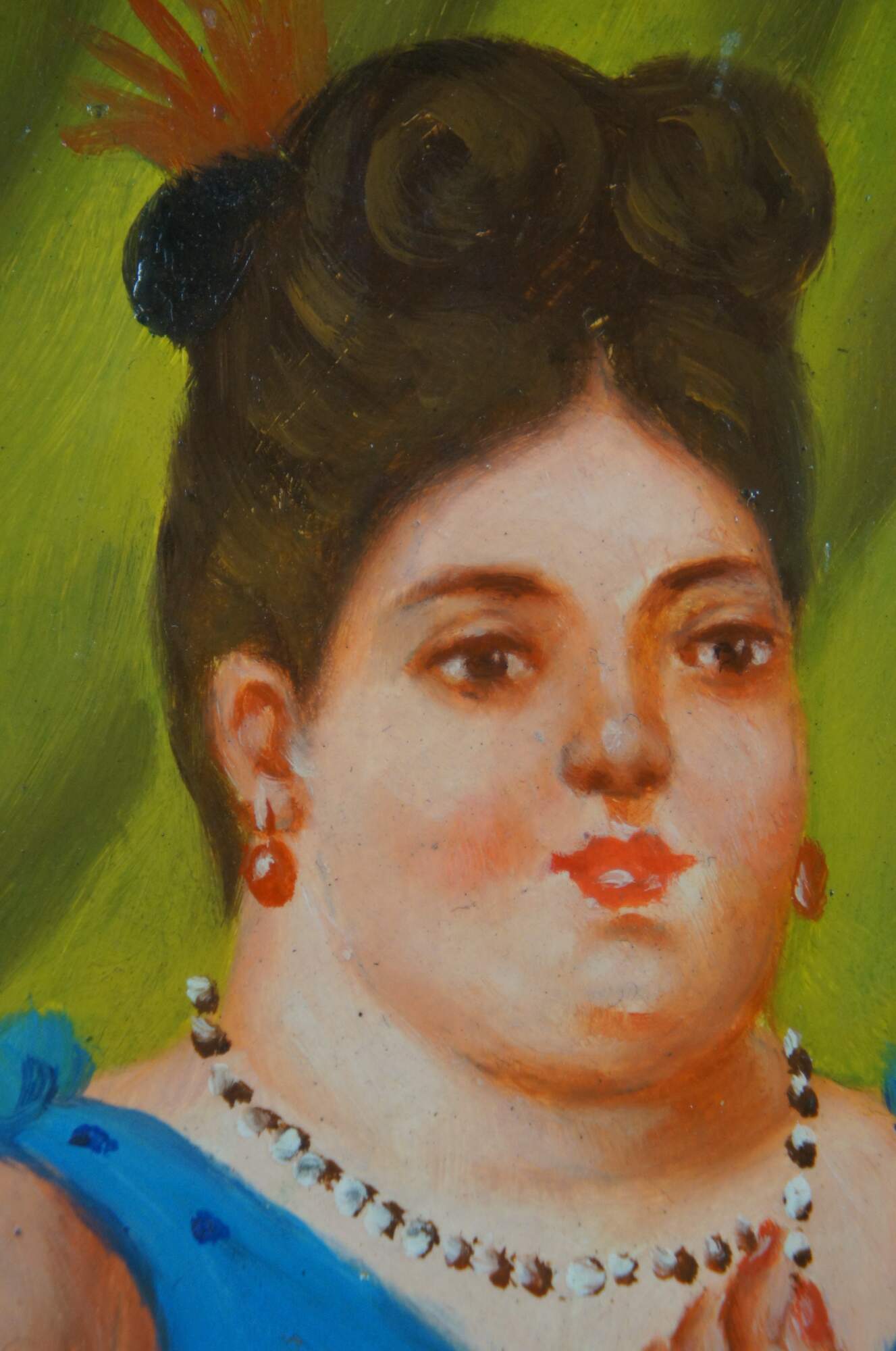 Late 20th century oil on board portrait painting after Fernando Botero's 1997 painting "Society Lady." Shows a full, round, female figure elegantly dressed in a blue gown, green gloves and clutch, right hand raised to play with her necklace of pearls. Signed J. Camus in lower left corner. Produced for Timeless Treasures. Includes Certificate of Authenticity, number AFD131516. Dark wood frame with raised bevel.