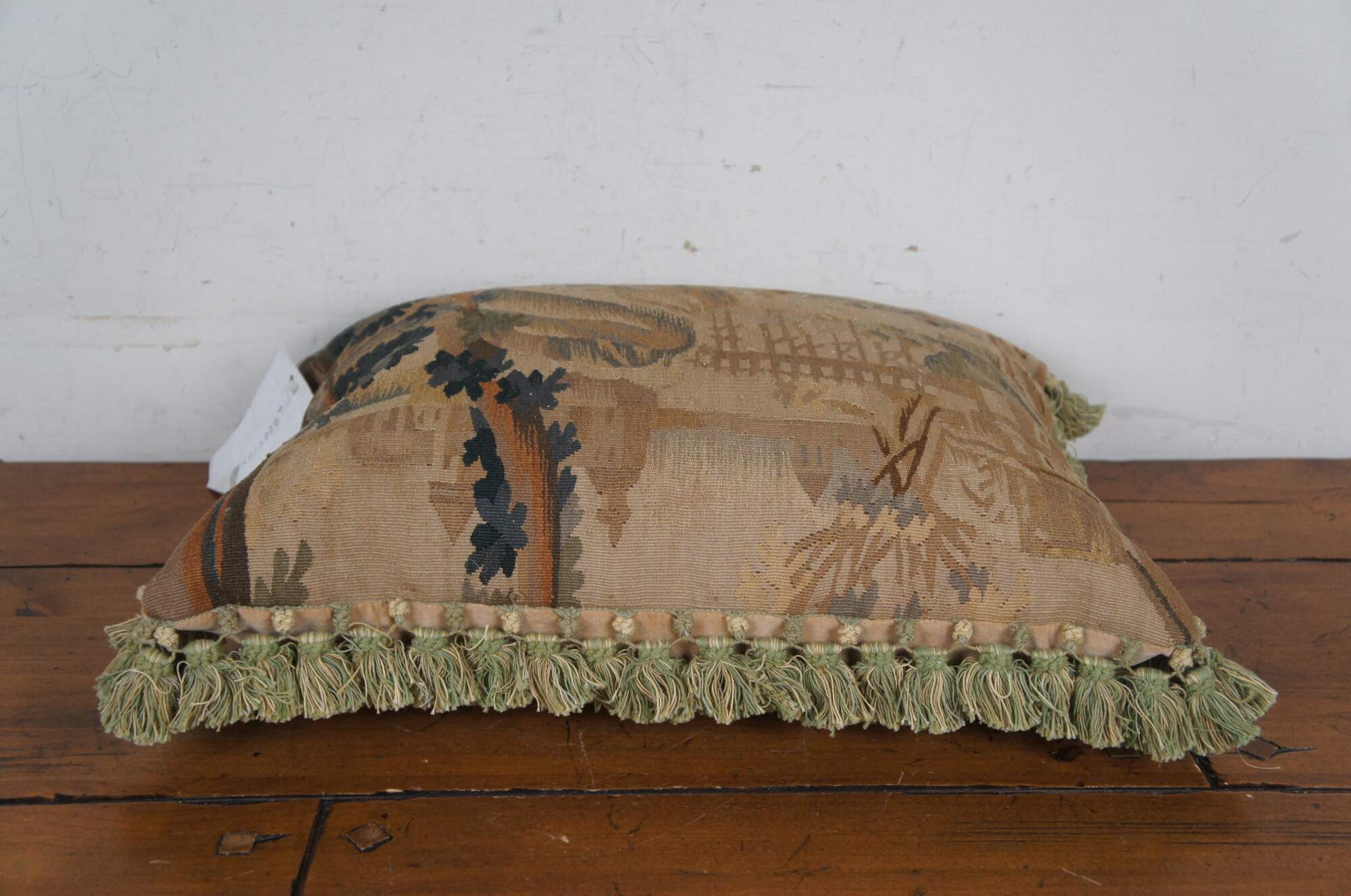 20th century French Aubusson style square throw pillow, embroidered in wool showing a cityscape along a river, framed with rocks and trees. Cream and green tassel trim. Light brown velour back with zipper closure. Down filled.