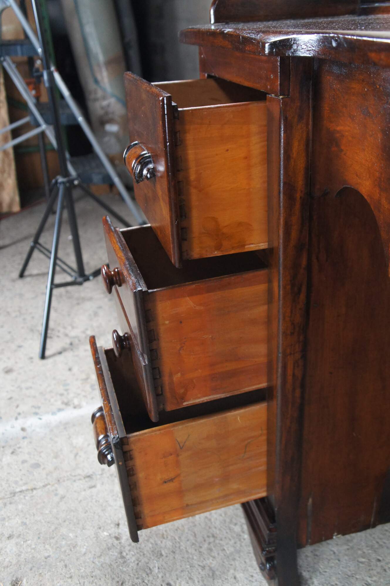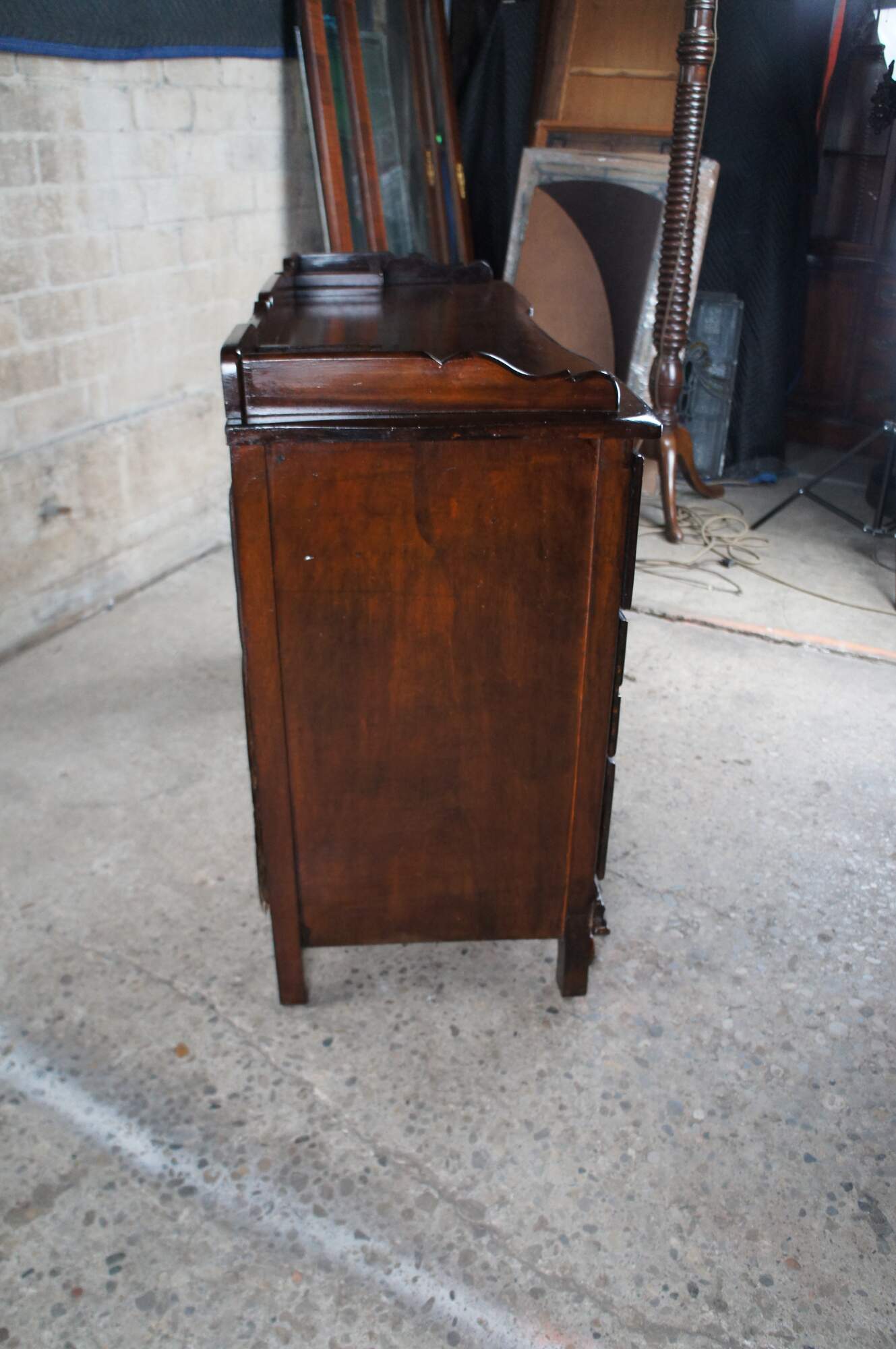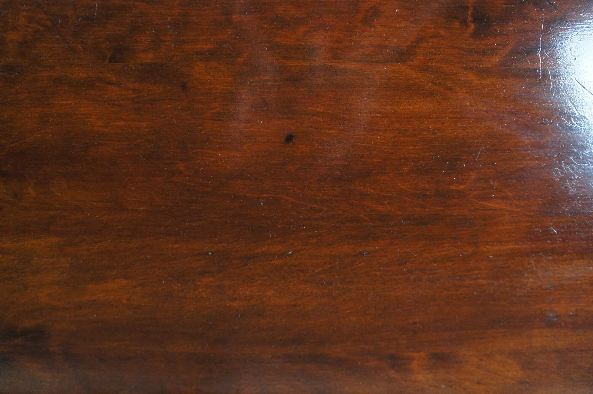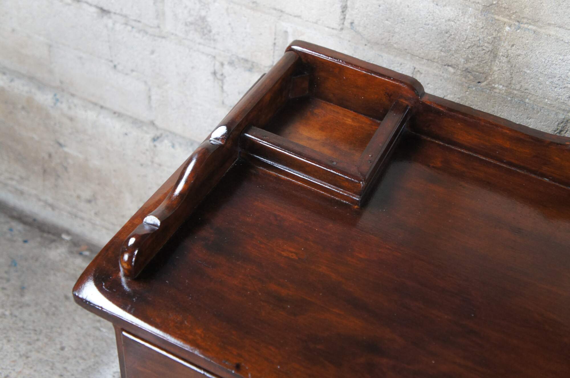 Vintage kneehole library / vanity / writing desk. Made of mahogany featuring traditional styling with upper gallery encasing two cubbies or ink compartments over multiple drawers and carved colonial scene with man on horseback riding past a farmhouse.
