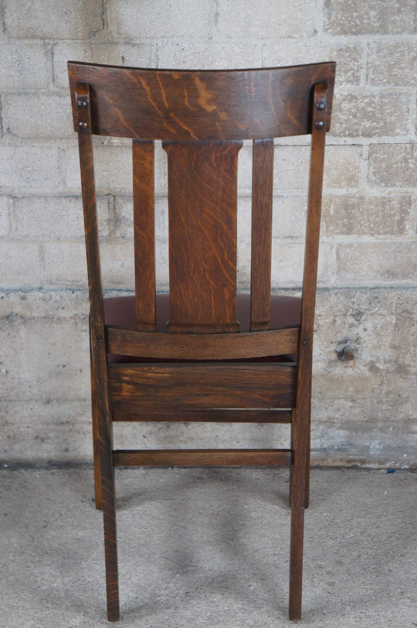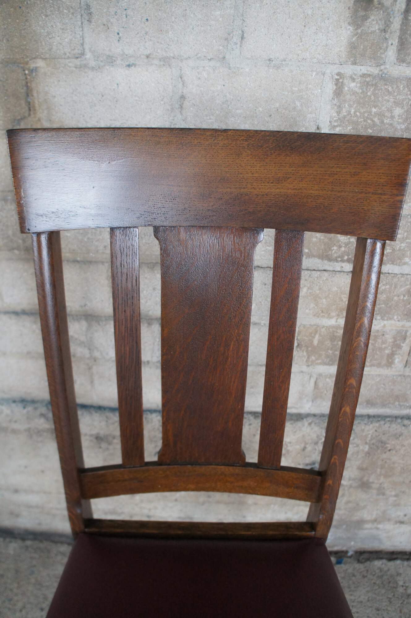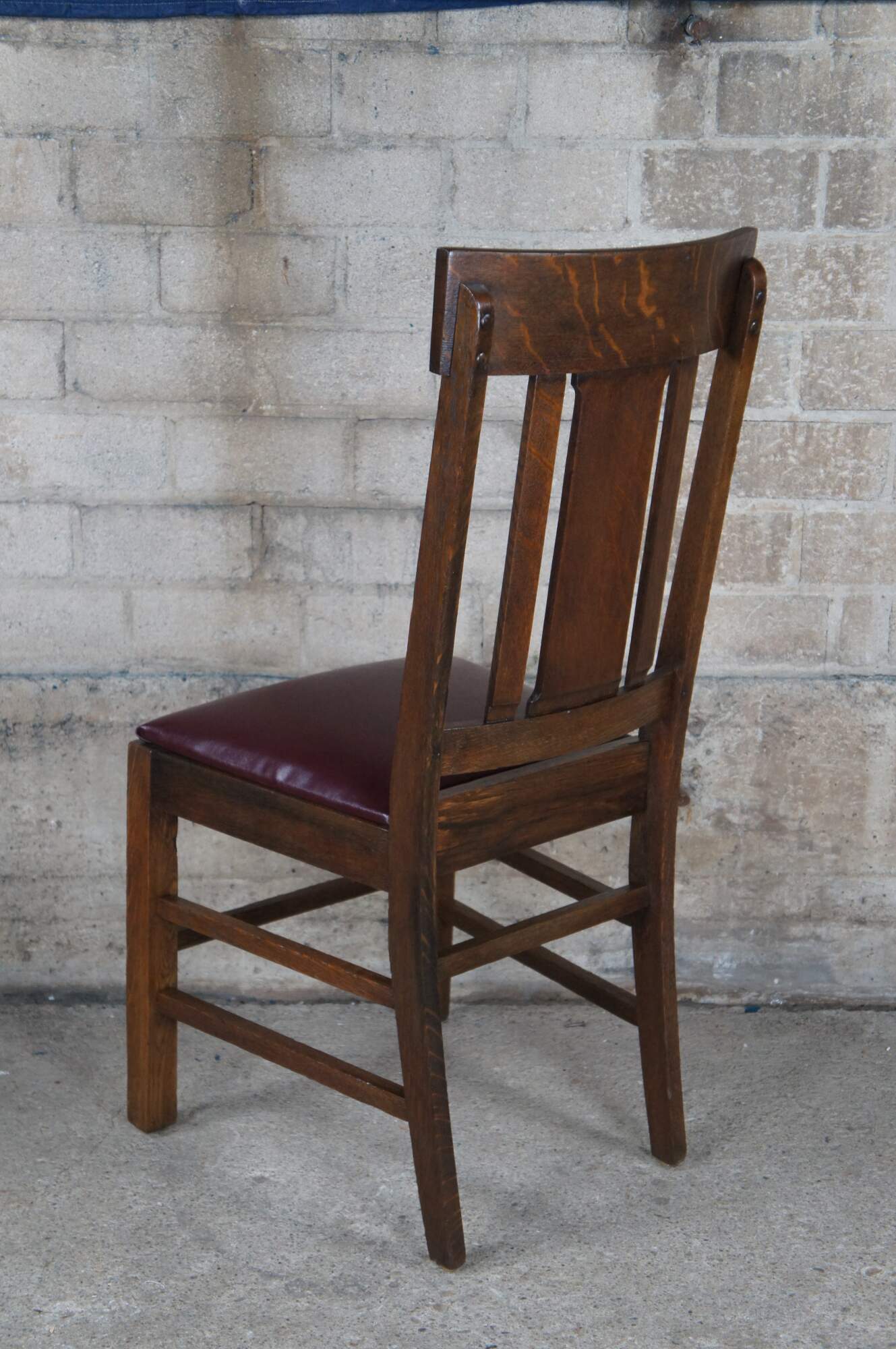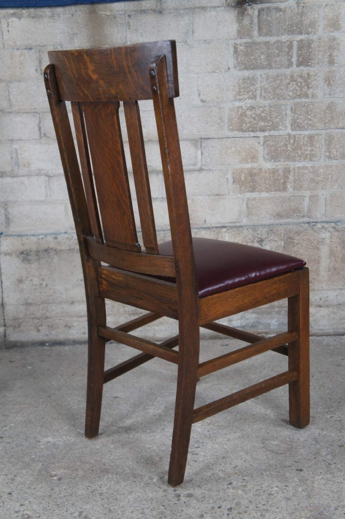 Set of four Mission style dining chairs featuring quartersawn oak, slatted backs and vinyl seats.