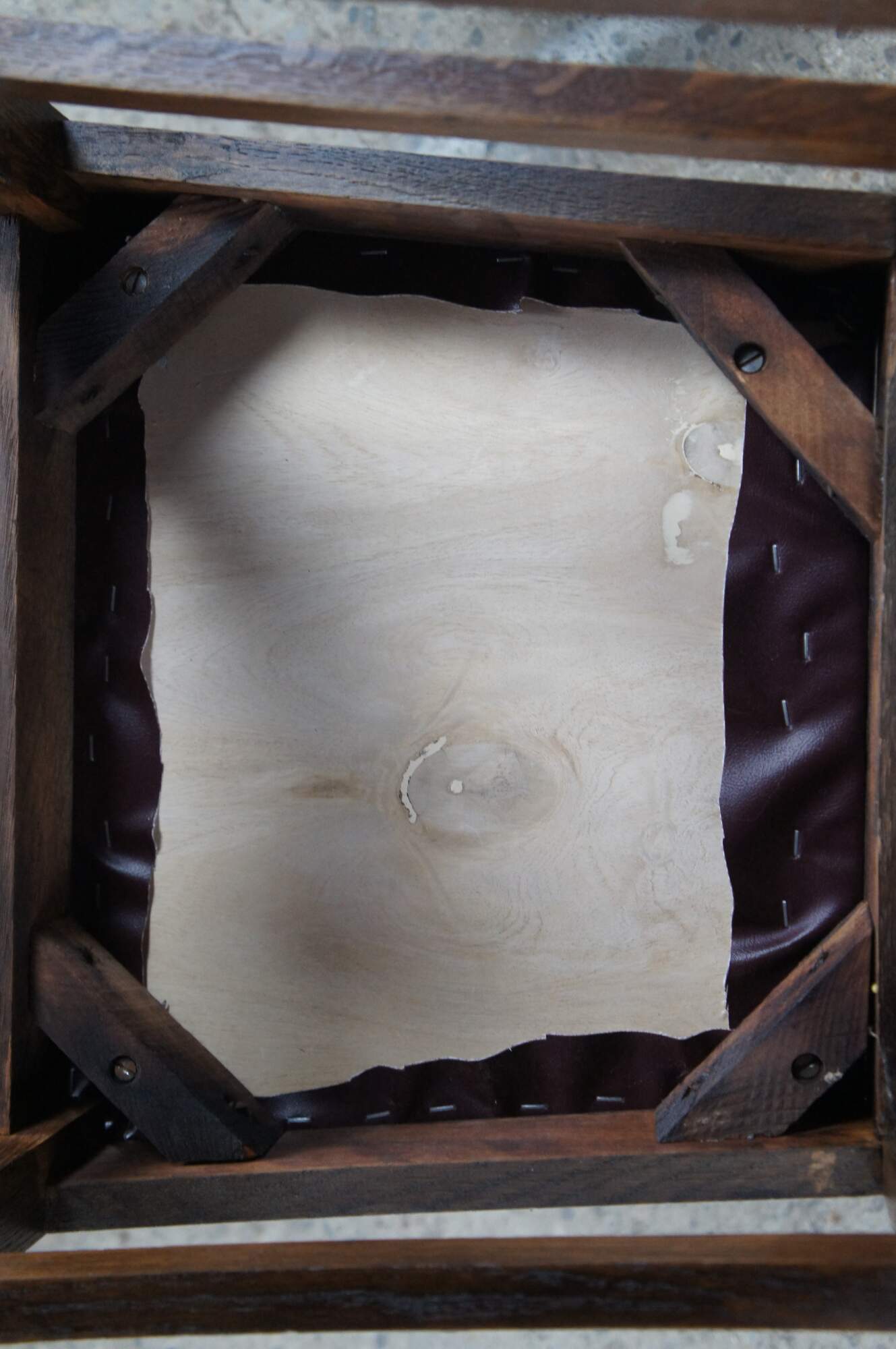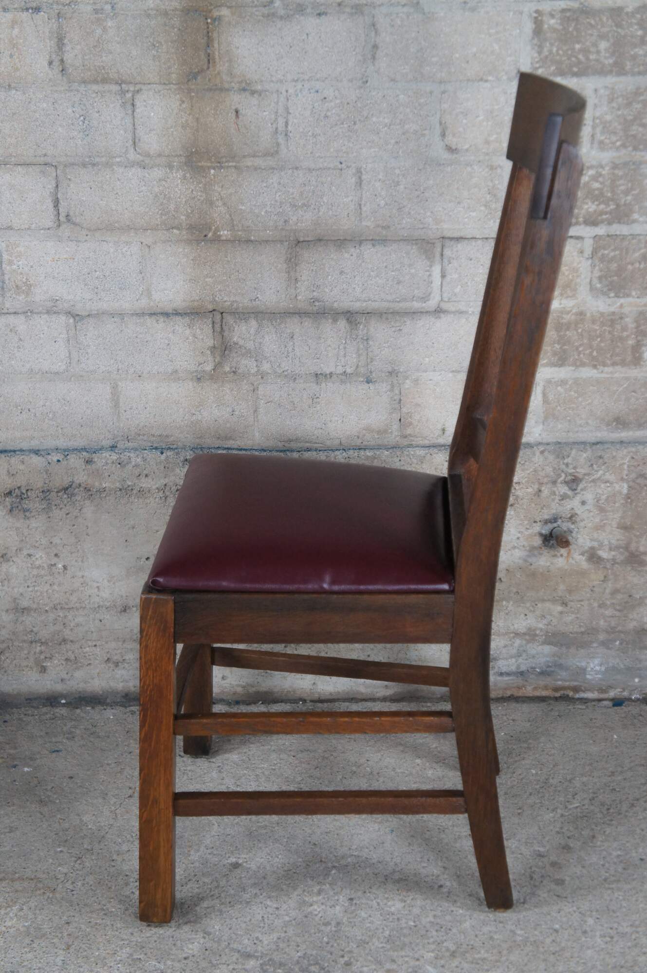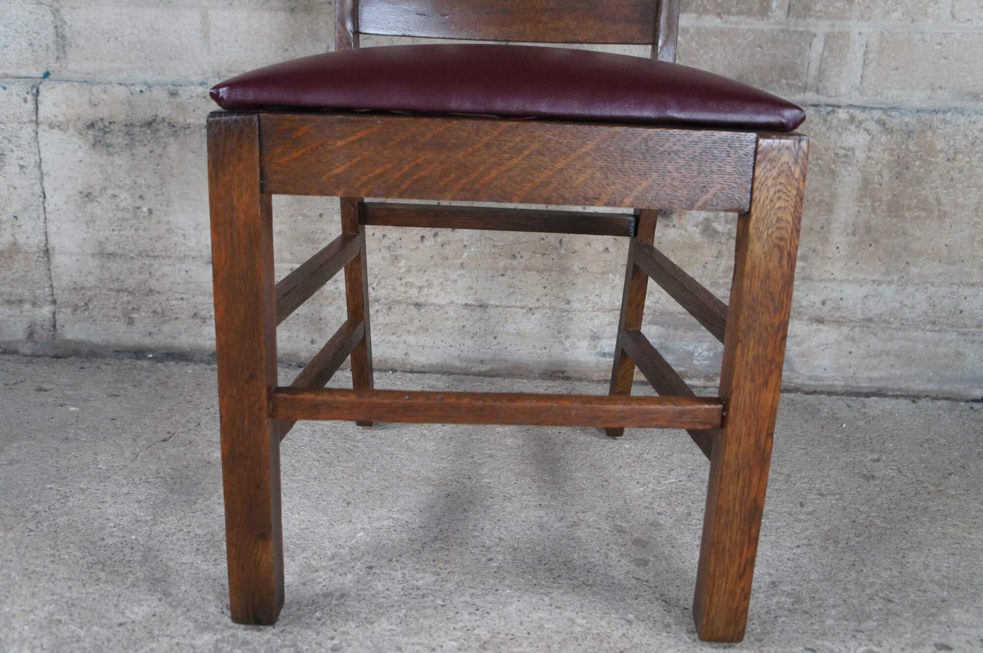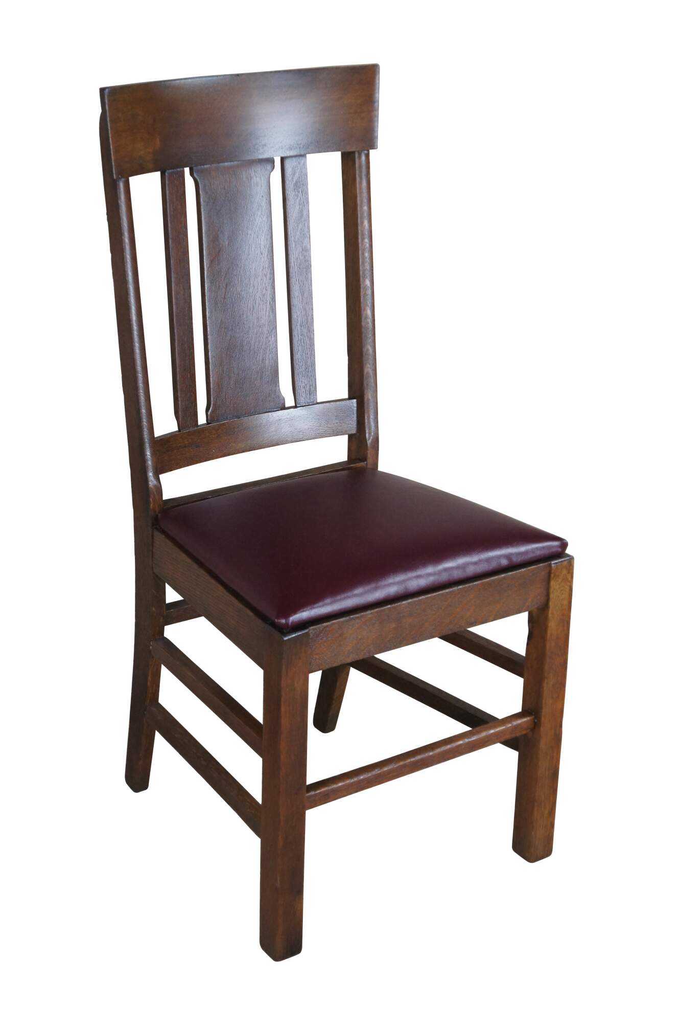 Set of four Mission style dining chairs featuring quartersawn oak, slatted backs and vinyl seats.