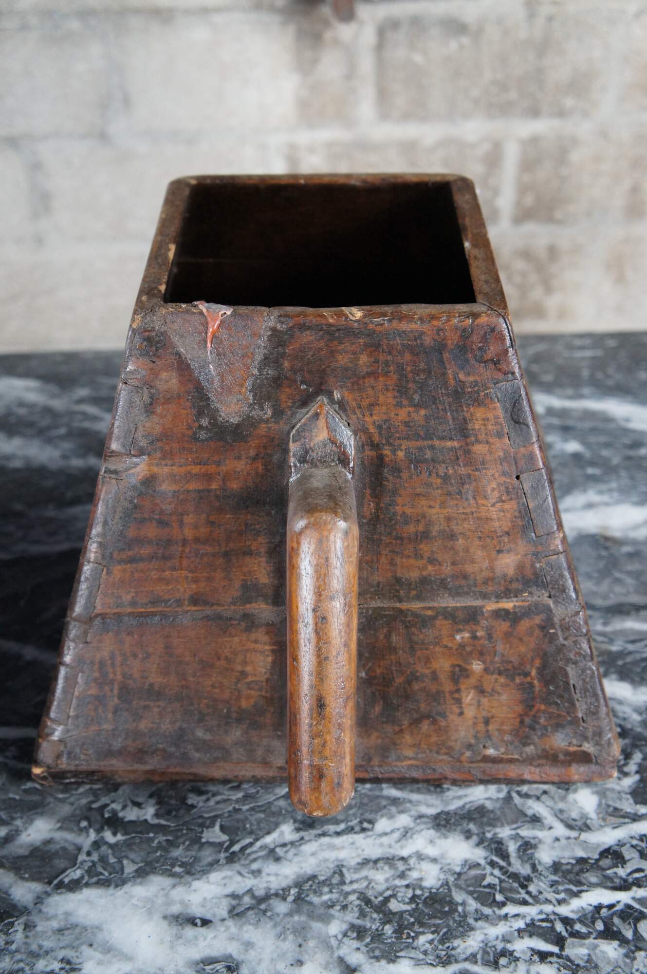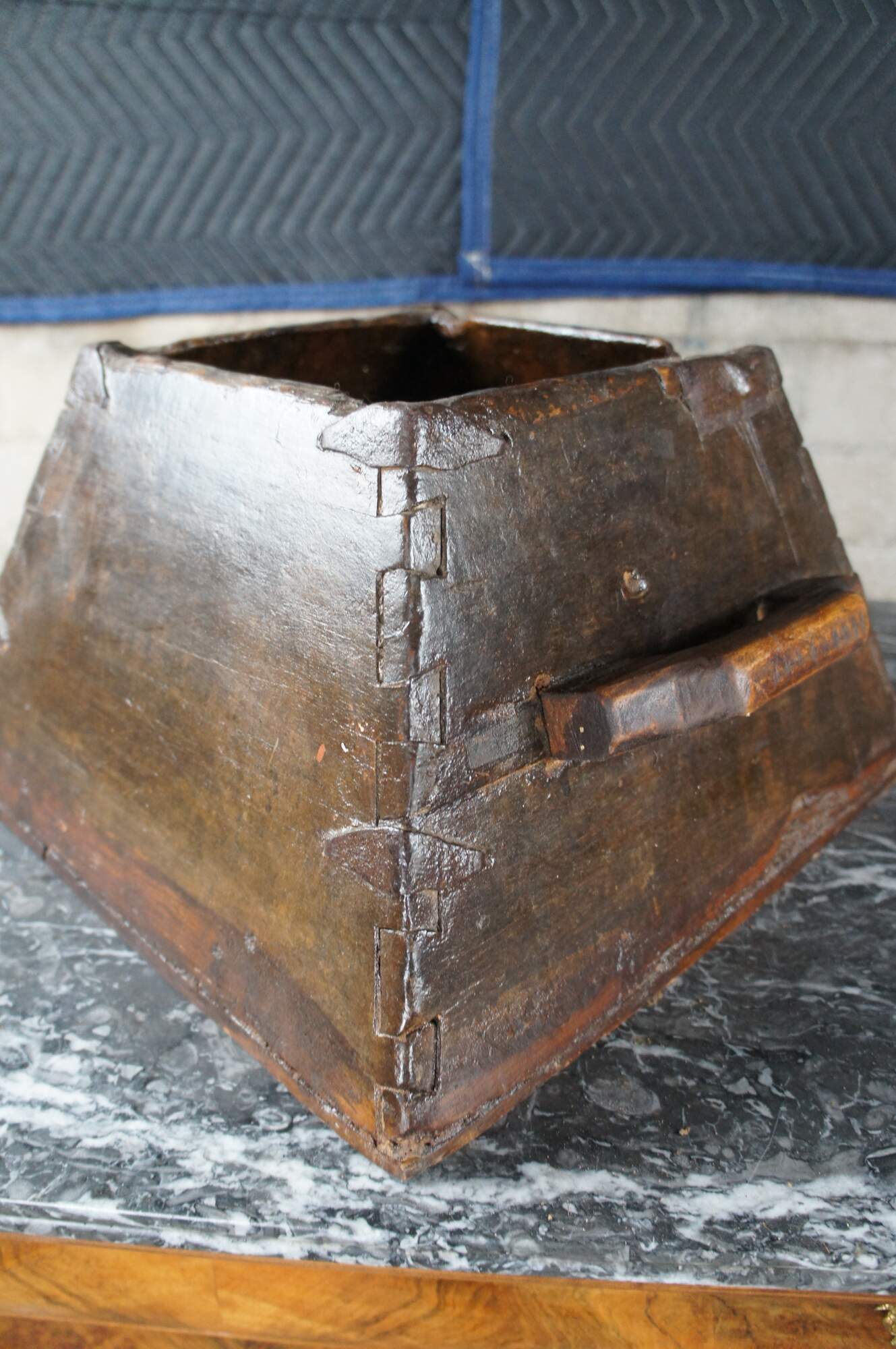 2 antique chinese handled rice baskets, circa circa 1900s. Made from elm with hand dovetailed joinery and iron banding. Wax import stamps can be found on each. A nice decorative display piece that will look great on a bookcase or off in a nook. Could be re-purposed as a planter