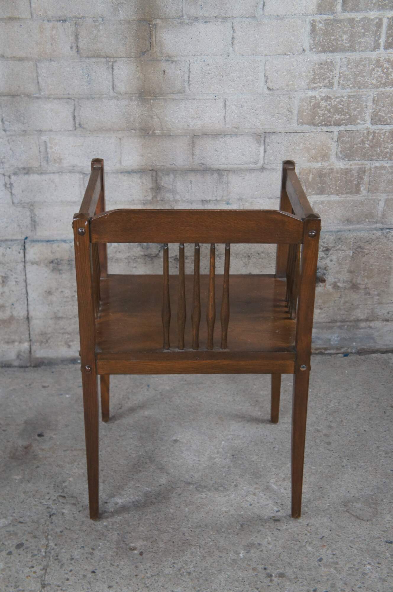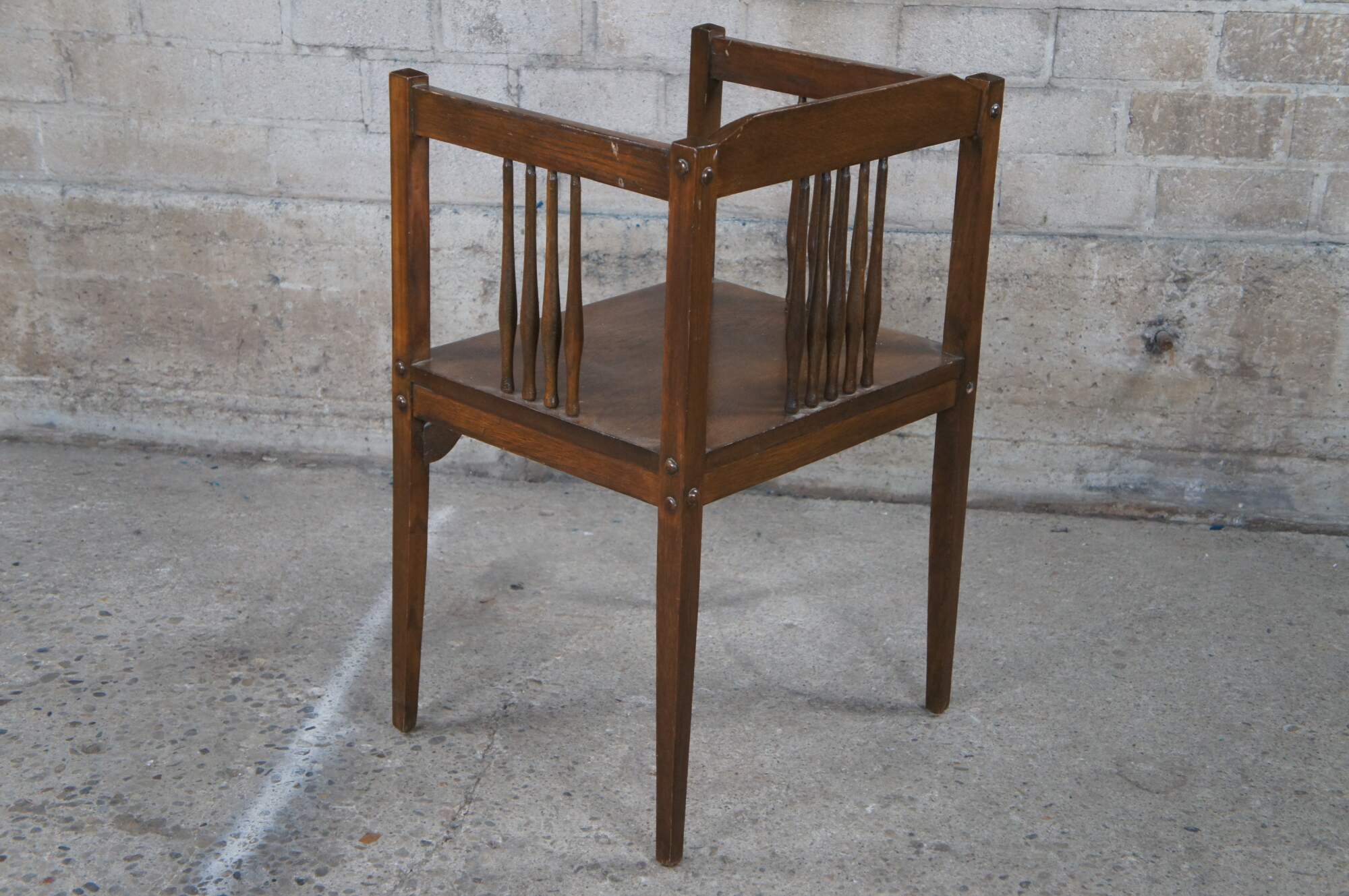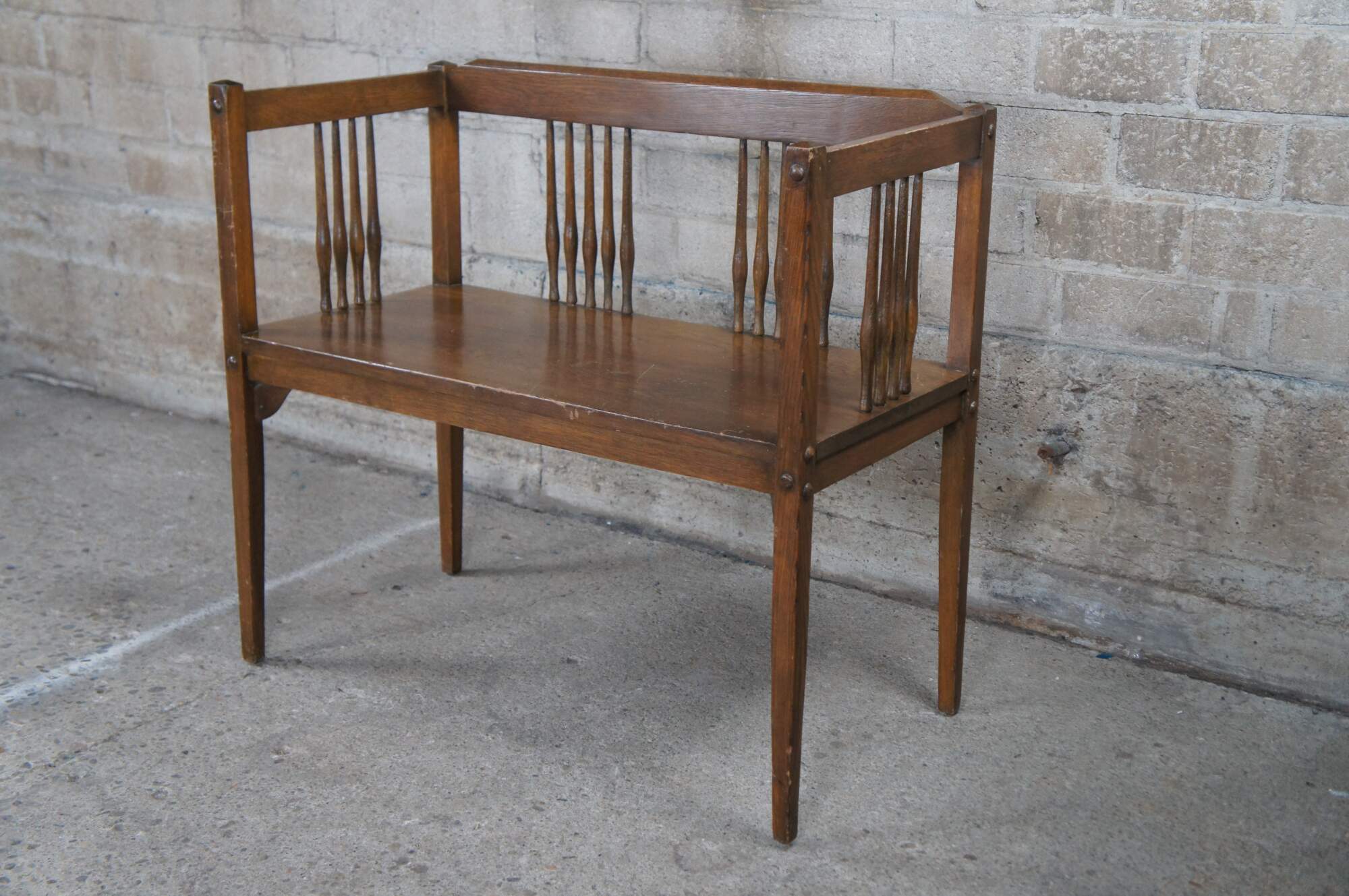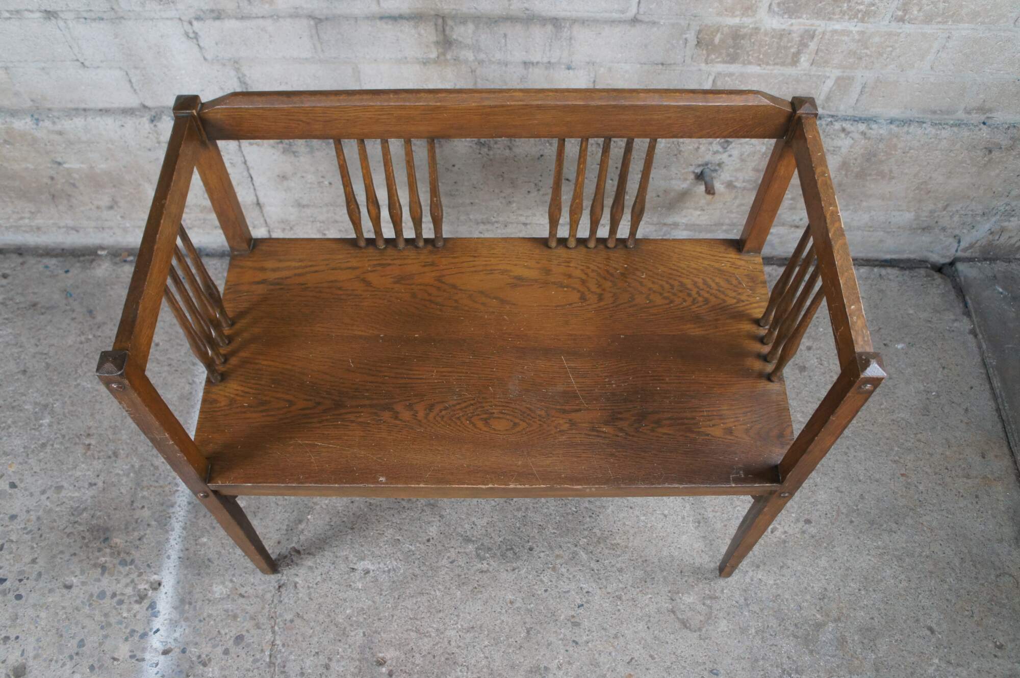 Mid to early 20th century bench / settee and arm chair. Made of oak featuring Mission and arts & crafts styling with squared design, spindles and tapered legs.