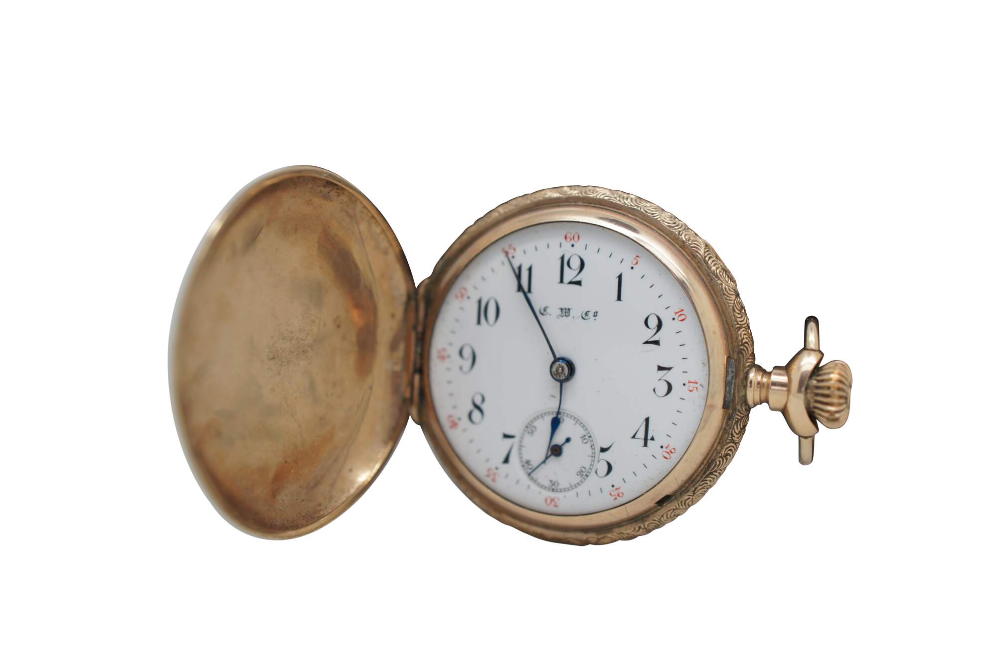 Early 20th century 8K gold pocket watch, intricately etched with swirling foliate motif around a bird and leaves on one side and foliate frame with monogram JW on the other. Case: Brooklyn Watch Case Company - Serial Number: 940416 - 8K Gold (A1 Eagle mark) - Interior of case engraved "Frank Hack / Josephine Woodrick. Movement: Continental Watch Company - Swiss - Number 9029 - White face marked C.W. Co, black and red lettering, Arabic numerals, one minute subdial, blue-black iridescent hands. Mechanical / wind up.