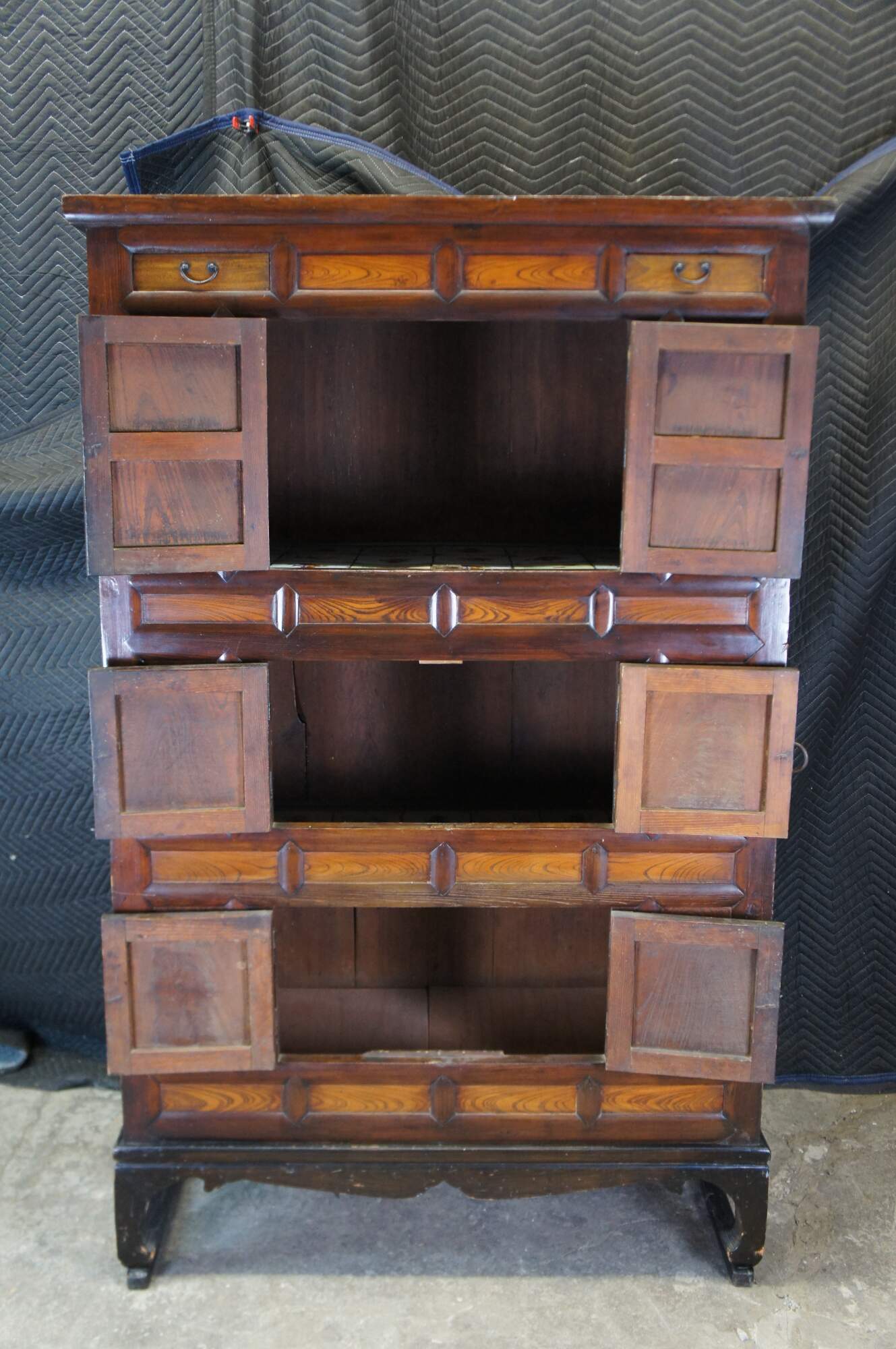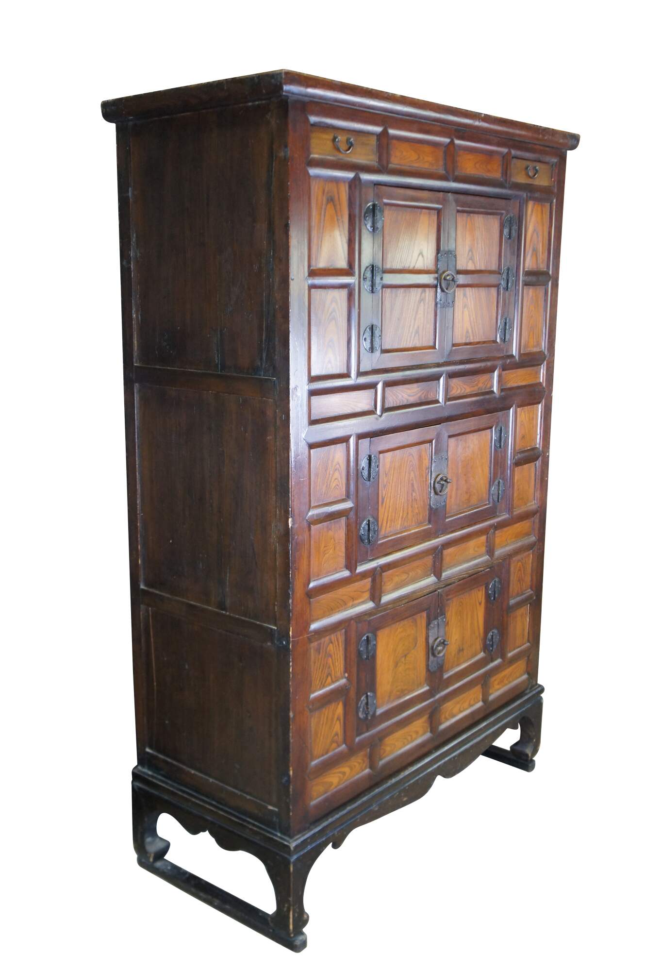 20th Century Korean Tansu Nong Bandaji tallboy wedding chests / cabinet / armoire made of elmwood featuring a two tone wood grain and brass hardware.