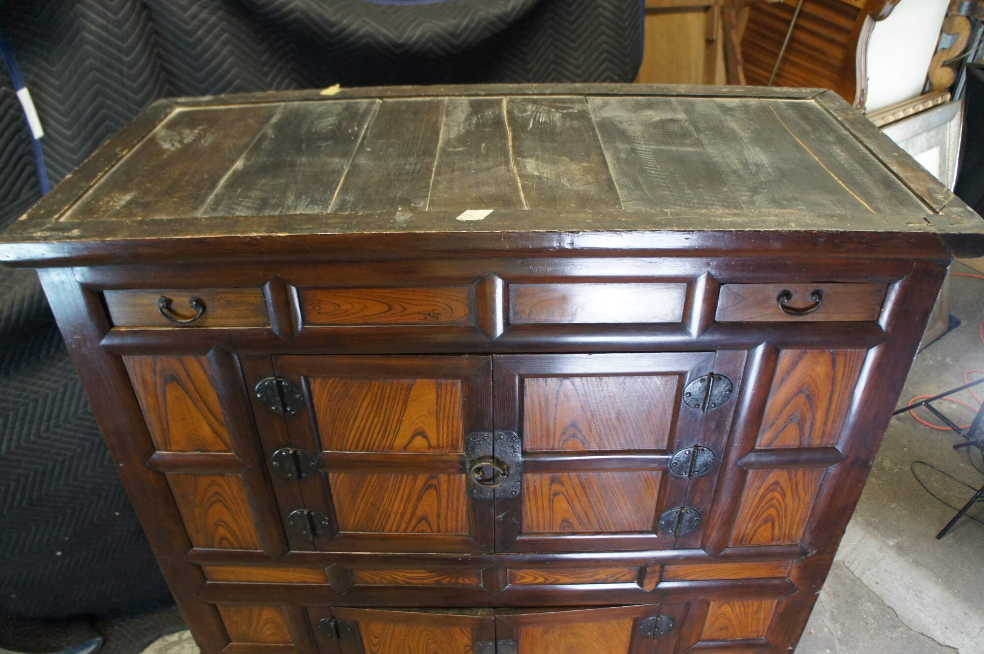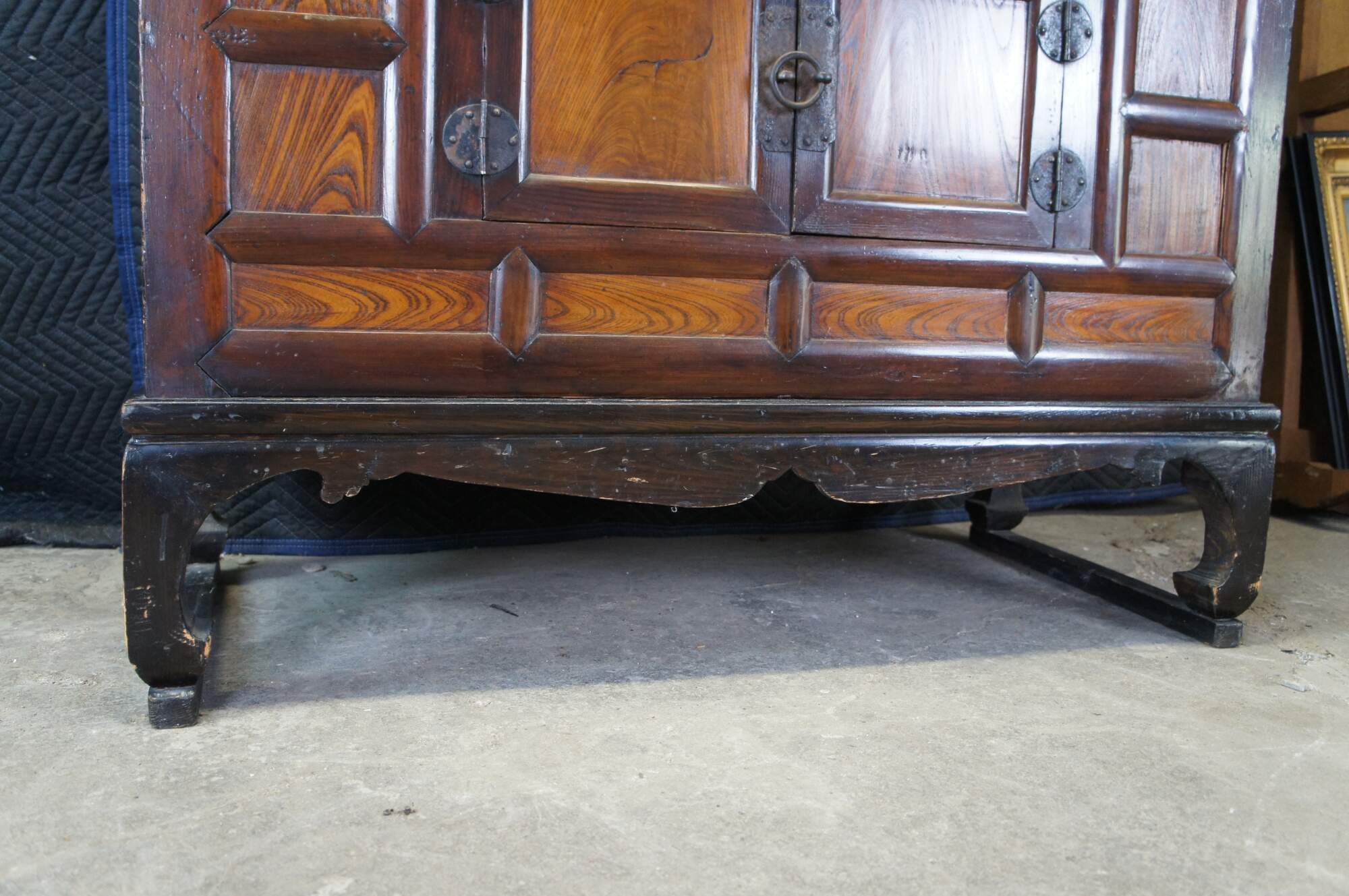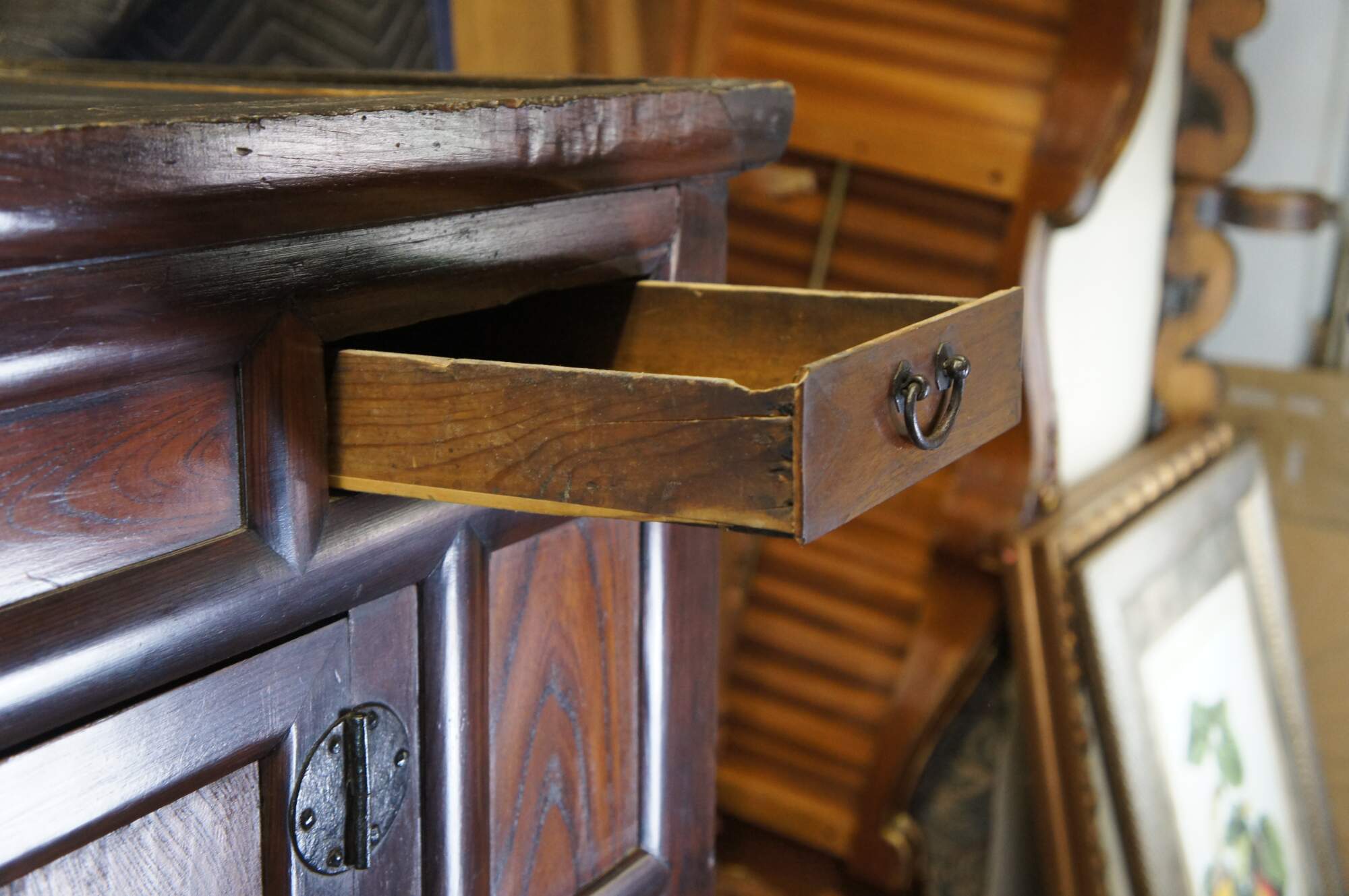 Korean Bandaji chest or trunk featuring elm frame with brass hardaware. The Korean name bandaji (literally meaning "half closing") derives from the hinged door in the front of this chest. This type of chest was one of the most essential, and most commonly found, pieces of furniture in a Korean household. Clothes, documents and valuables would be stored inside while folded blankets would be placed on top during the day (which explains why it is called a "blanket chest" in English).