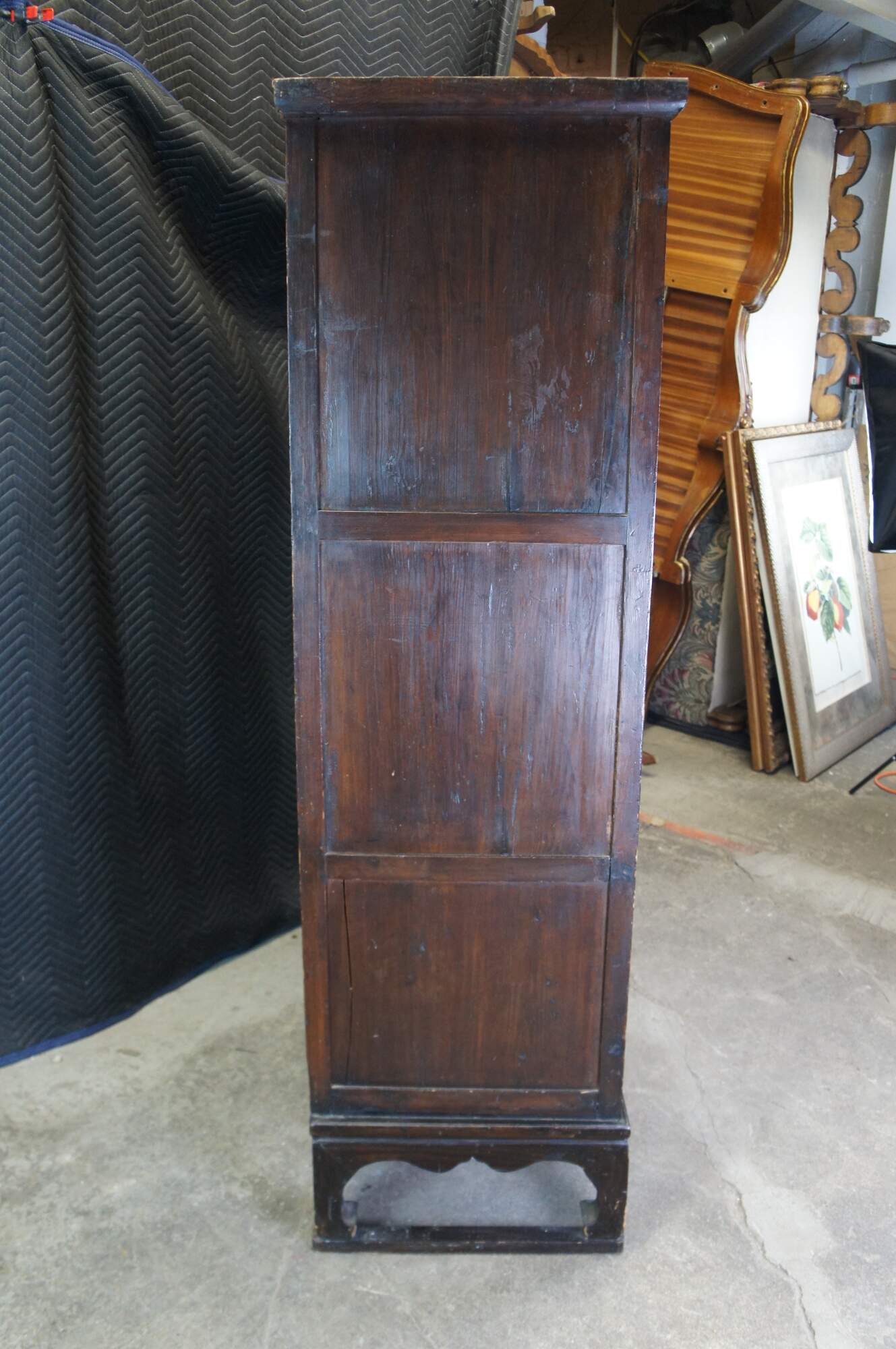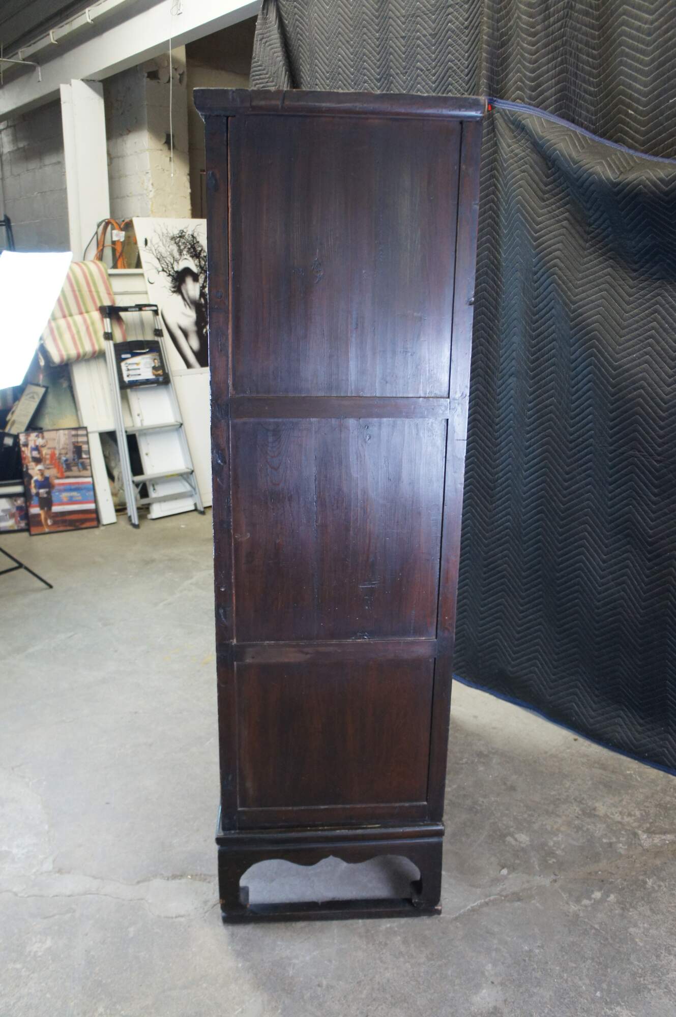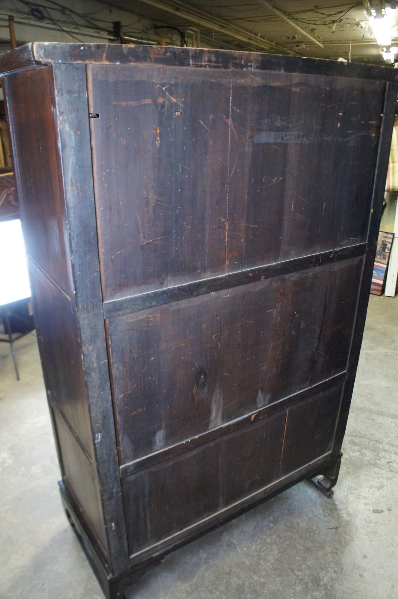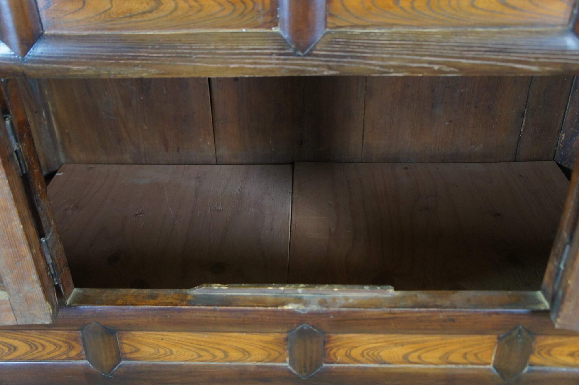 Korean Bandaji chest or trunk featuring elm frame with brass hardaware. The Korean name bandaji (literally meaning "half closing") derives from the hinged door in the front of this chest. This type of chest was one of the most essential, and most commonly found, pieces of furniture in a Korean household. Clothes, documents and valuables would be stored inside while folded blankets would be placed on top during the day (which explains why it is called a "blanket chest" in English).