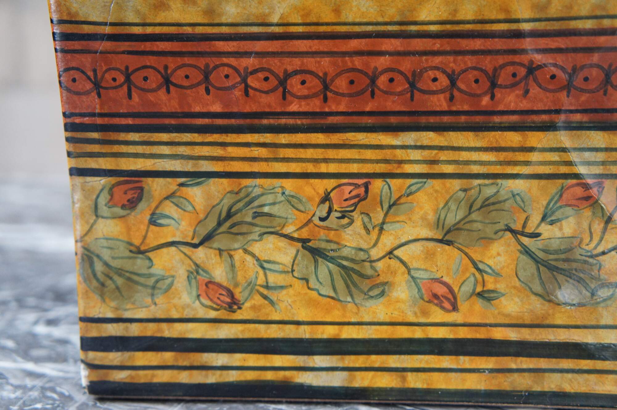 An impressive lacquered keepsake box by Maitland Smith, circa 1990s. Features a chioniserie motif with flowers and asian figures. the box is in the form of a treasure chest with hinged lid and black interior. Includes brass lion head handle along the front.