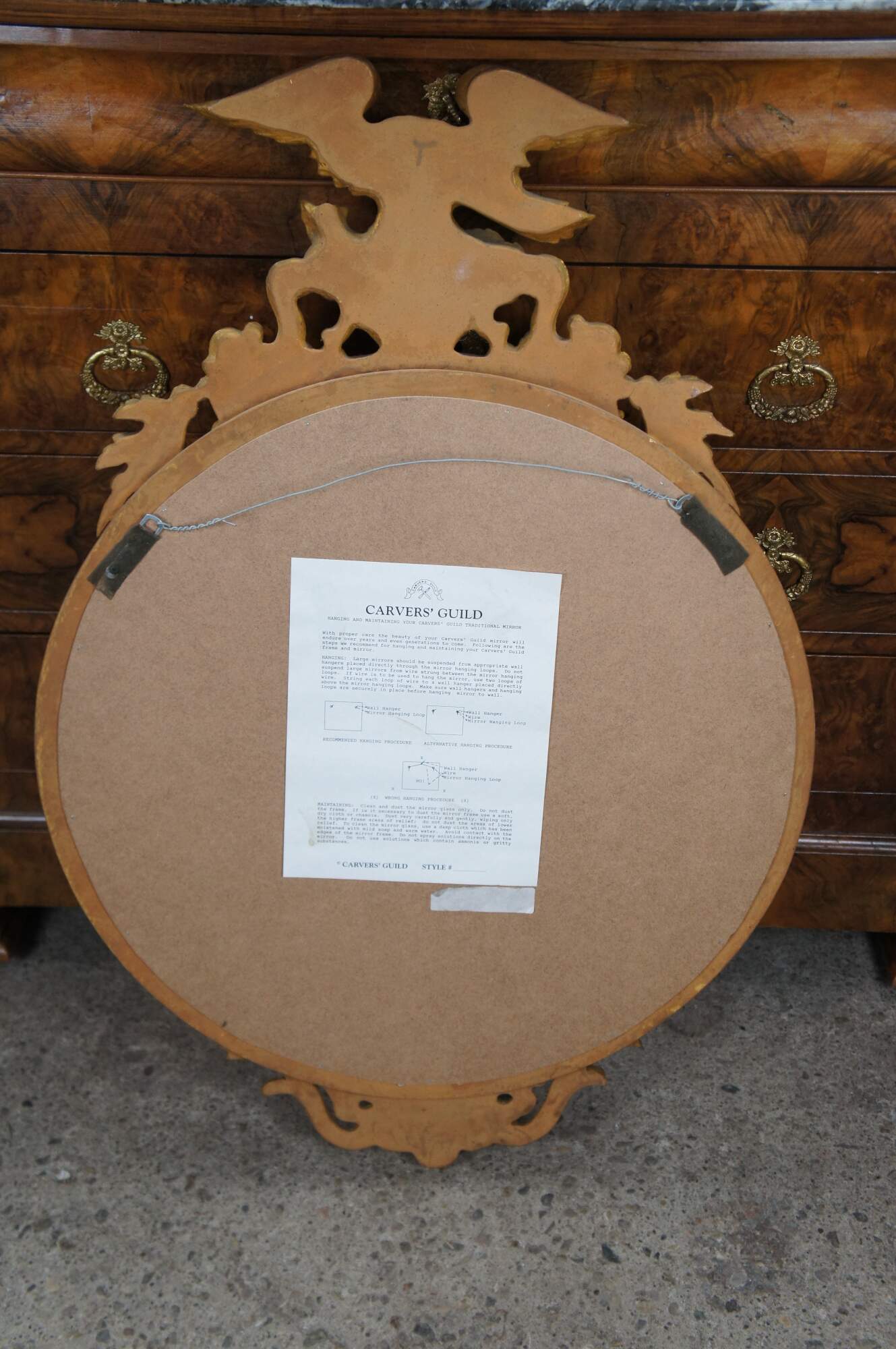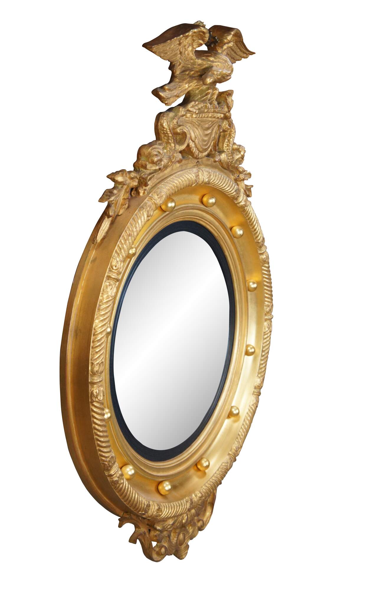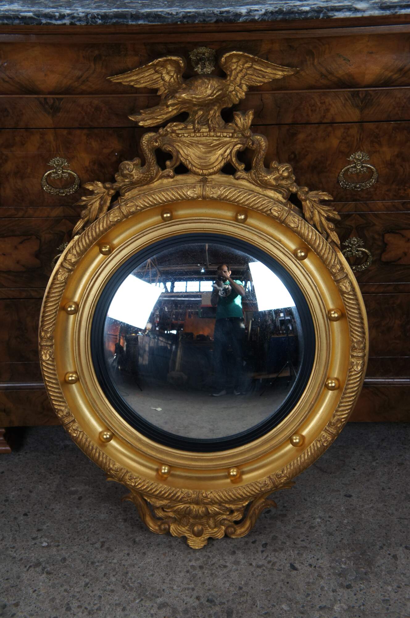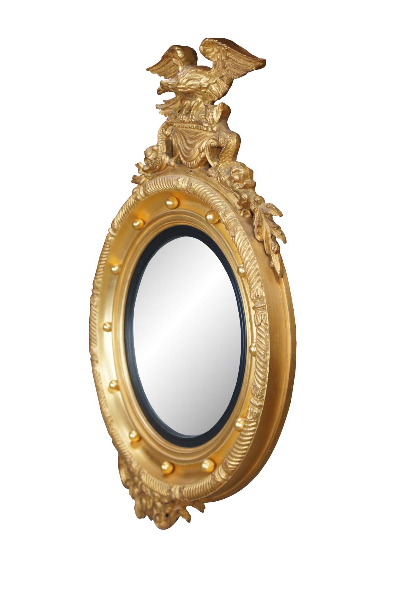 An impressive Federal Bullseye mirror by Carvers Guild. Features a thick gold gilt frame with convex mirror at the center and ebonized trim. Showcases an eagle and foliate crown over a rope twisted frame and scalliped lower portion. A regal addition to any space.