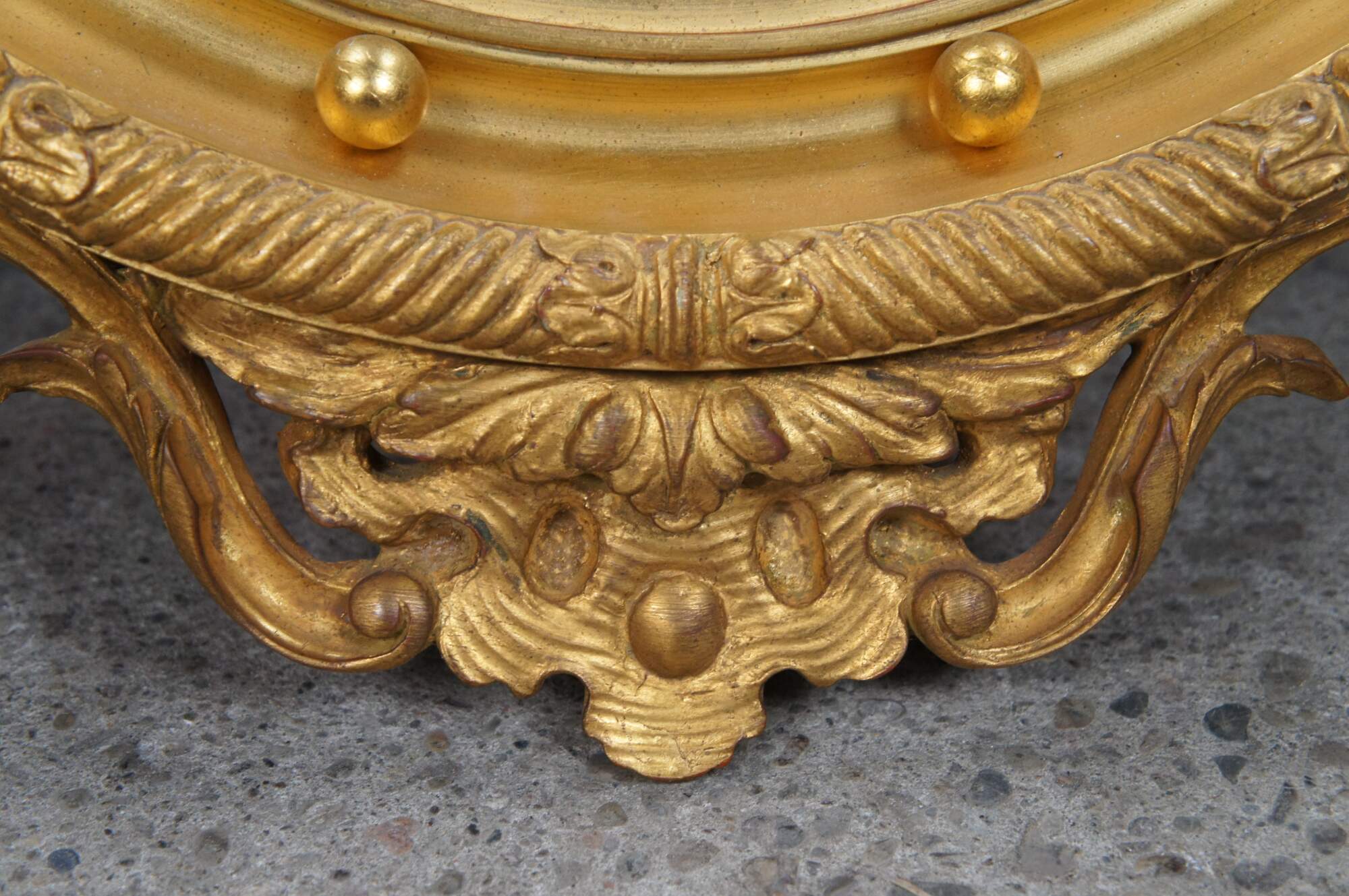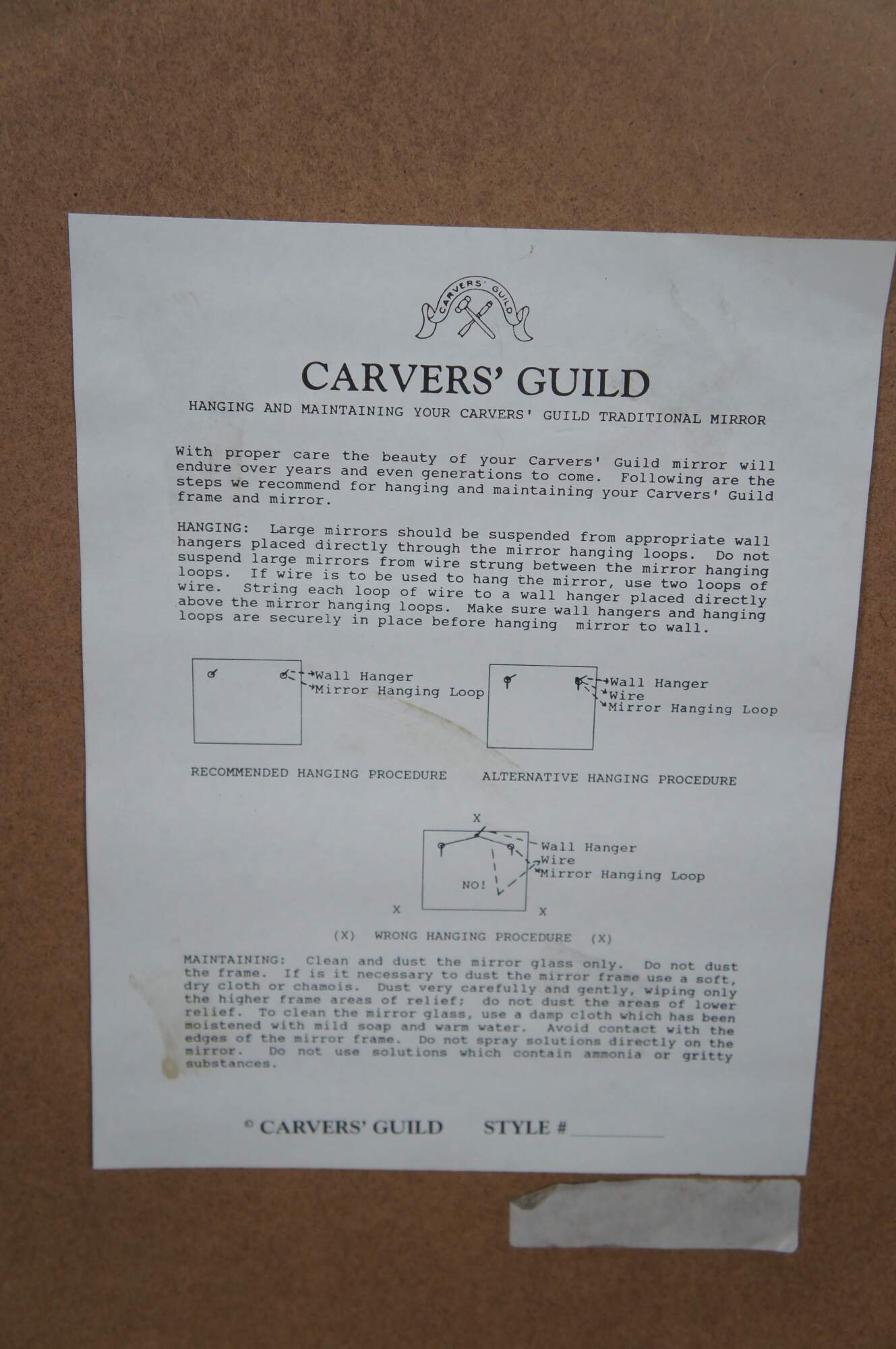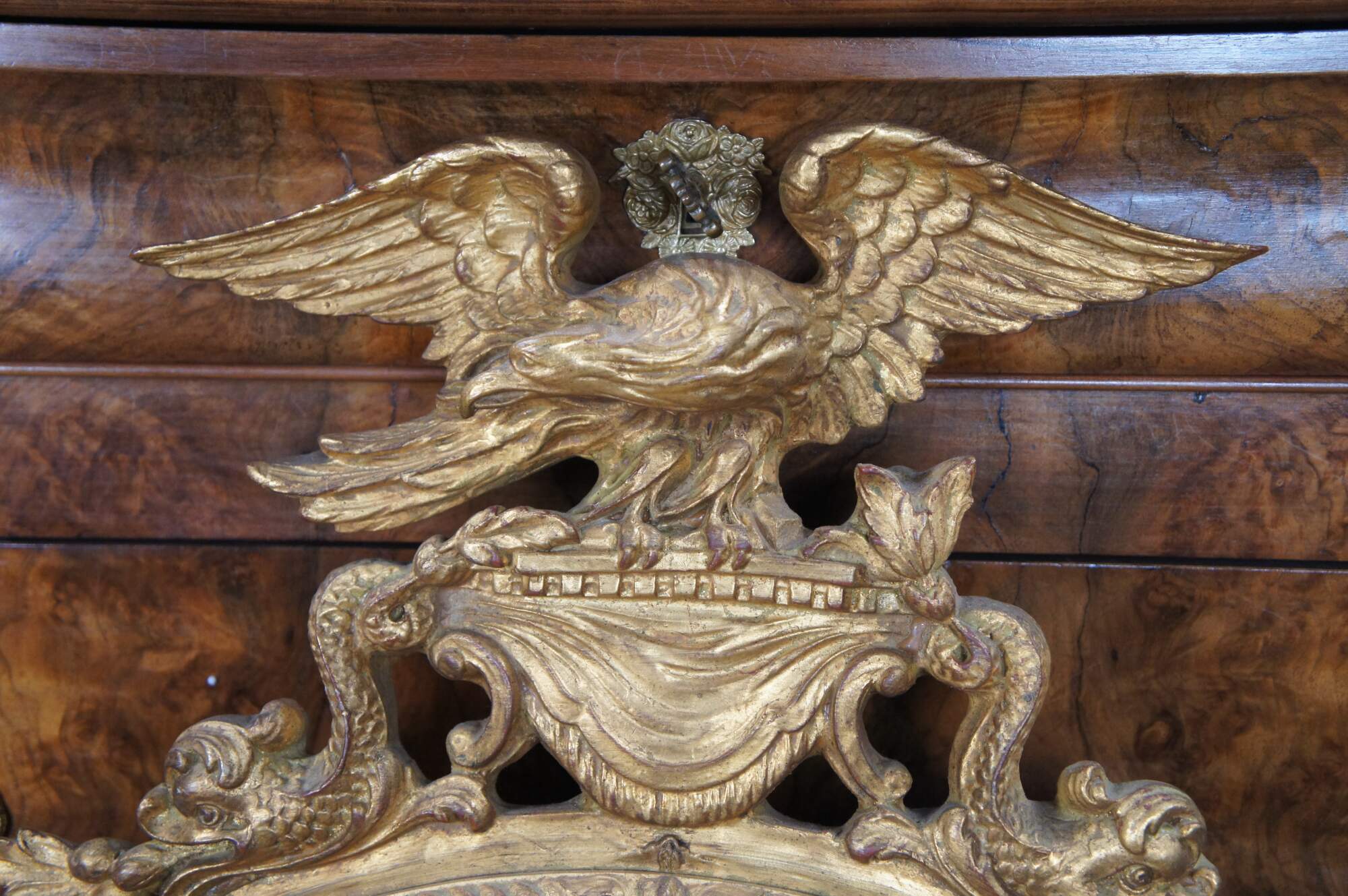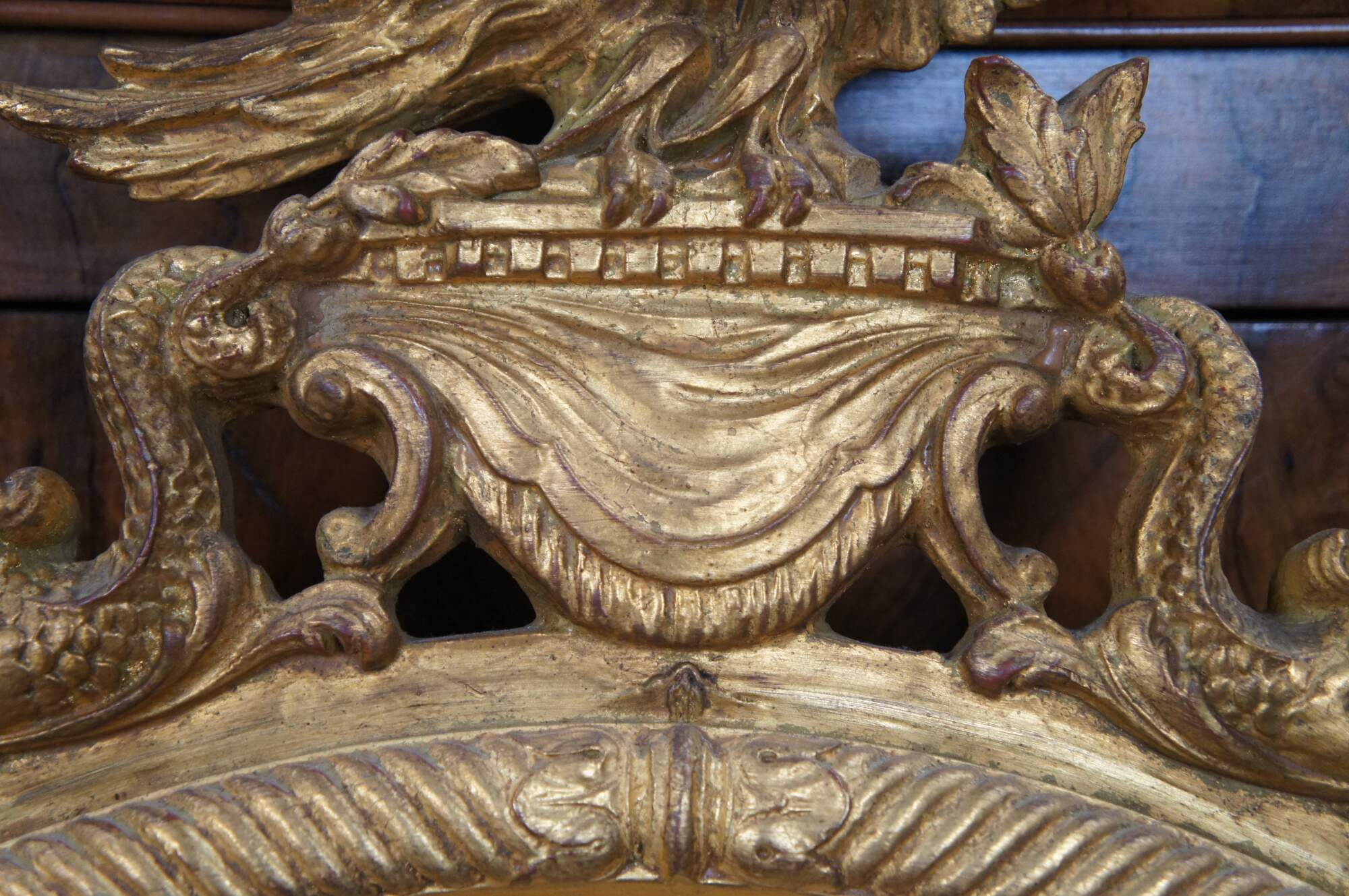 An impressive Federal Bullseye mirror by Carvers Guild. Features a thick gold gilt frame with convex mirror at the center and ebonized trim. Showcases an eagle and foliate crown over a rope twisted frame and scalliped lower portion. A regal addition to any space.