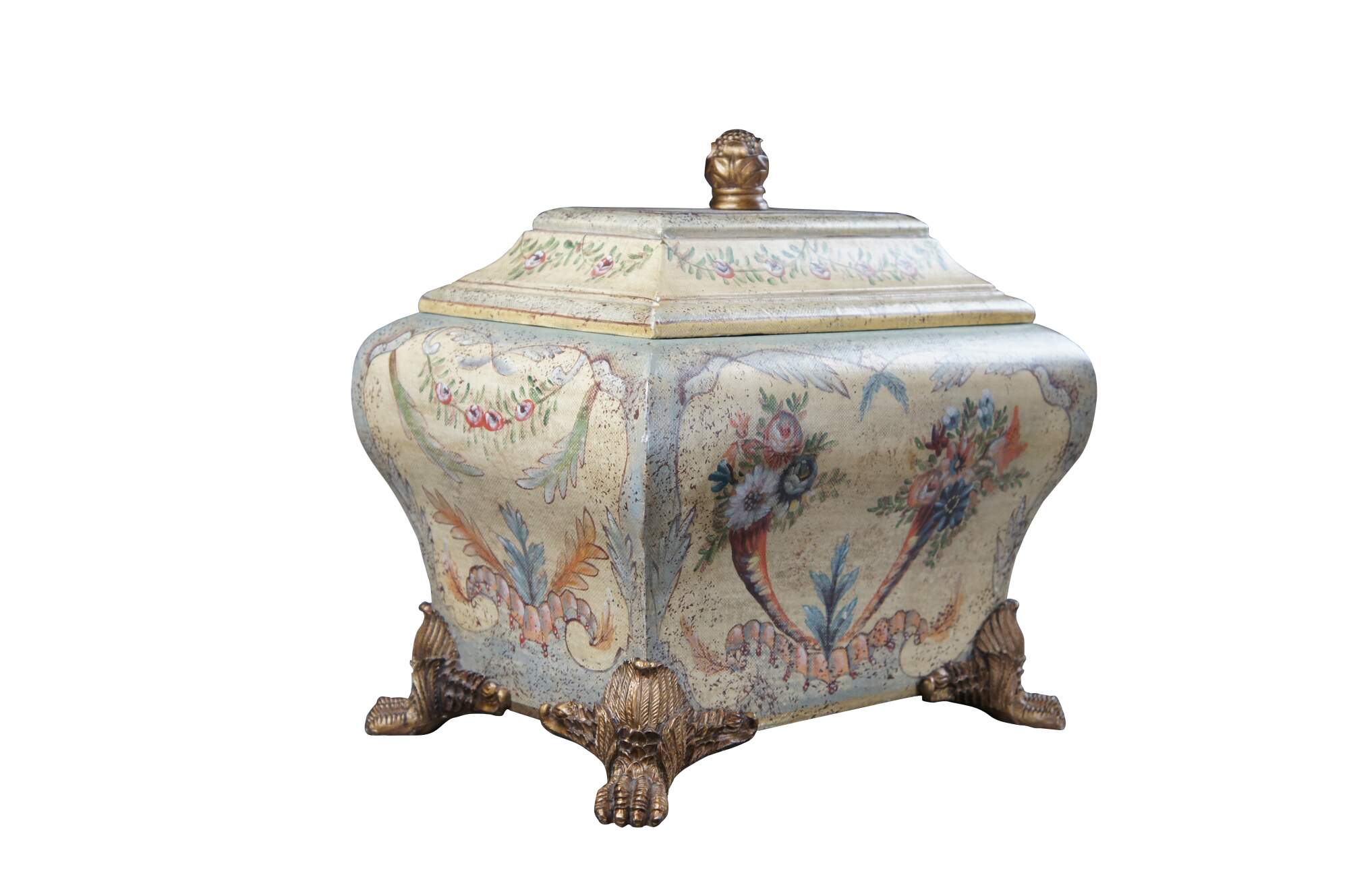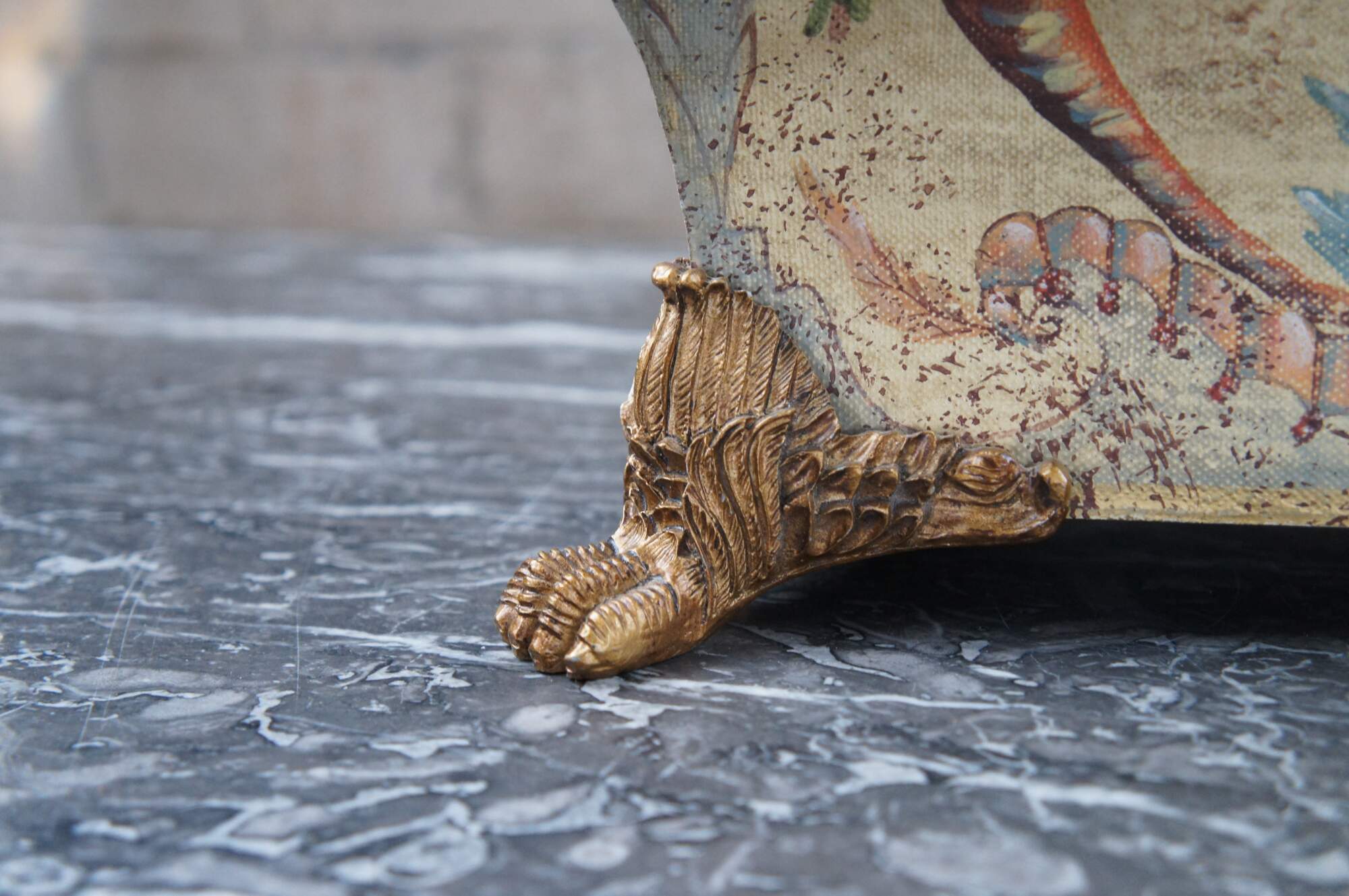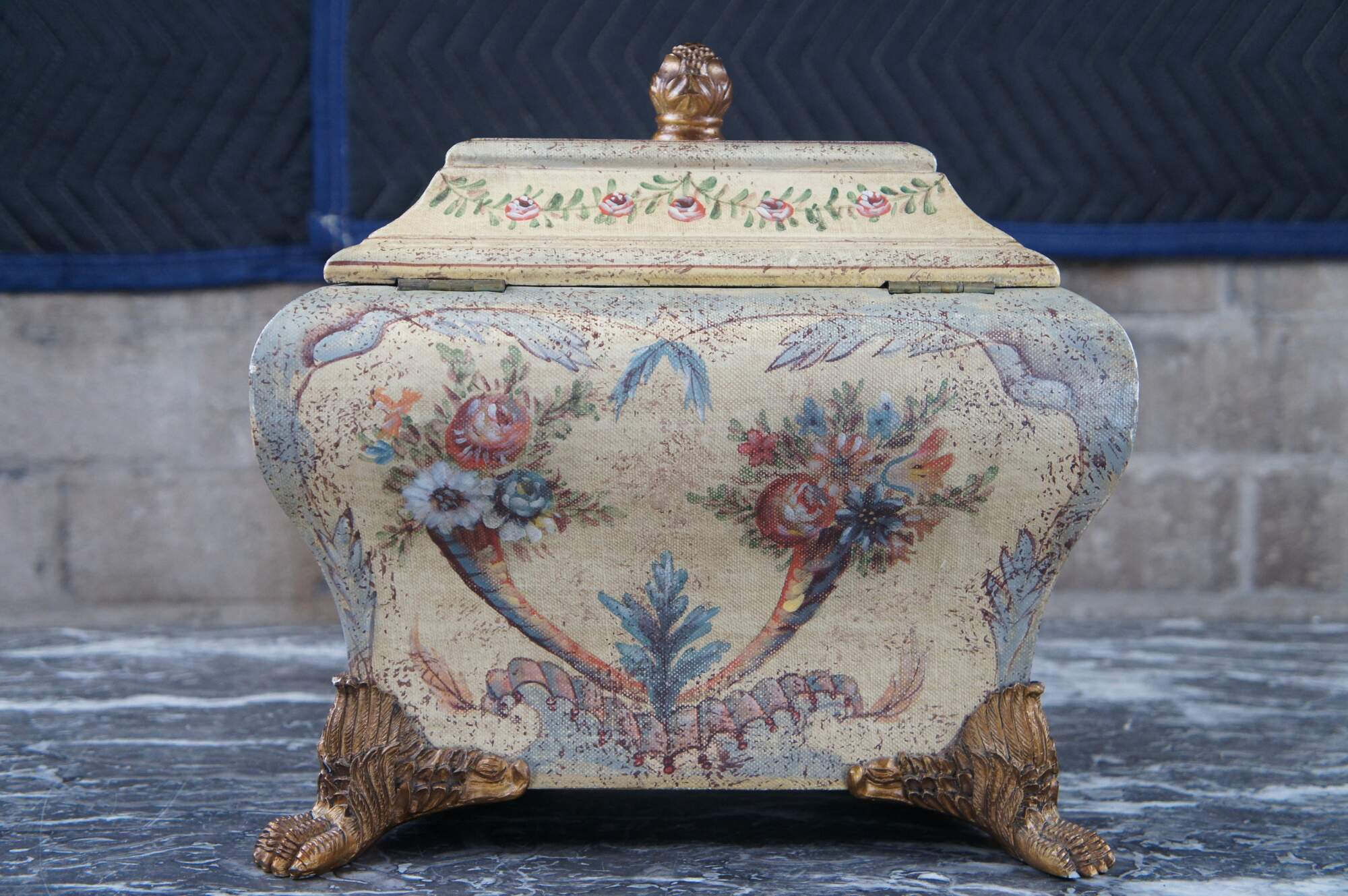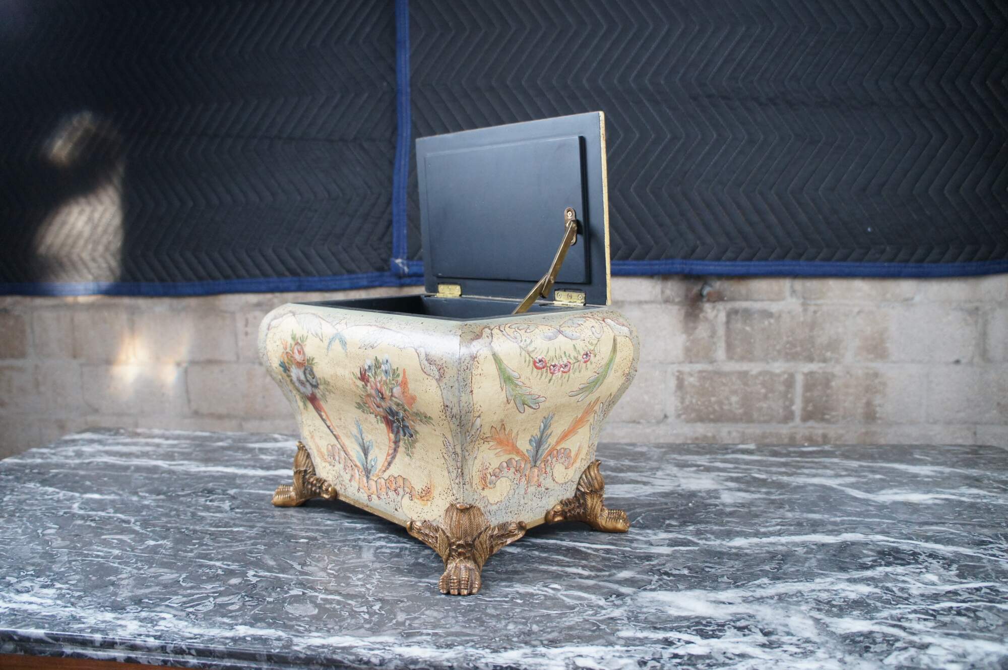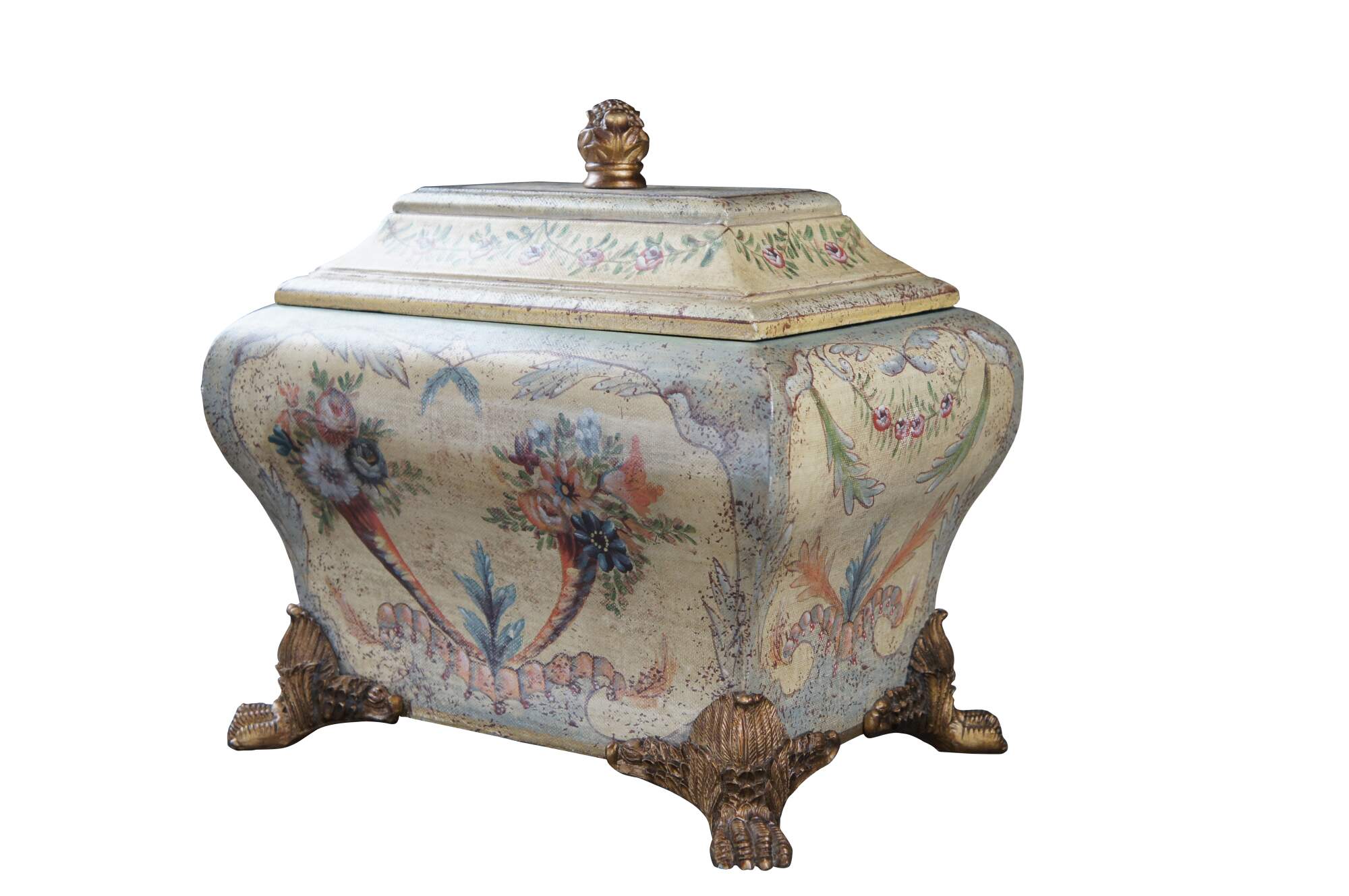 Decorative French inspired trinket box. Features a bombe form with floral motif over golden claw feet.