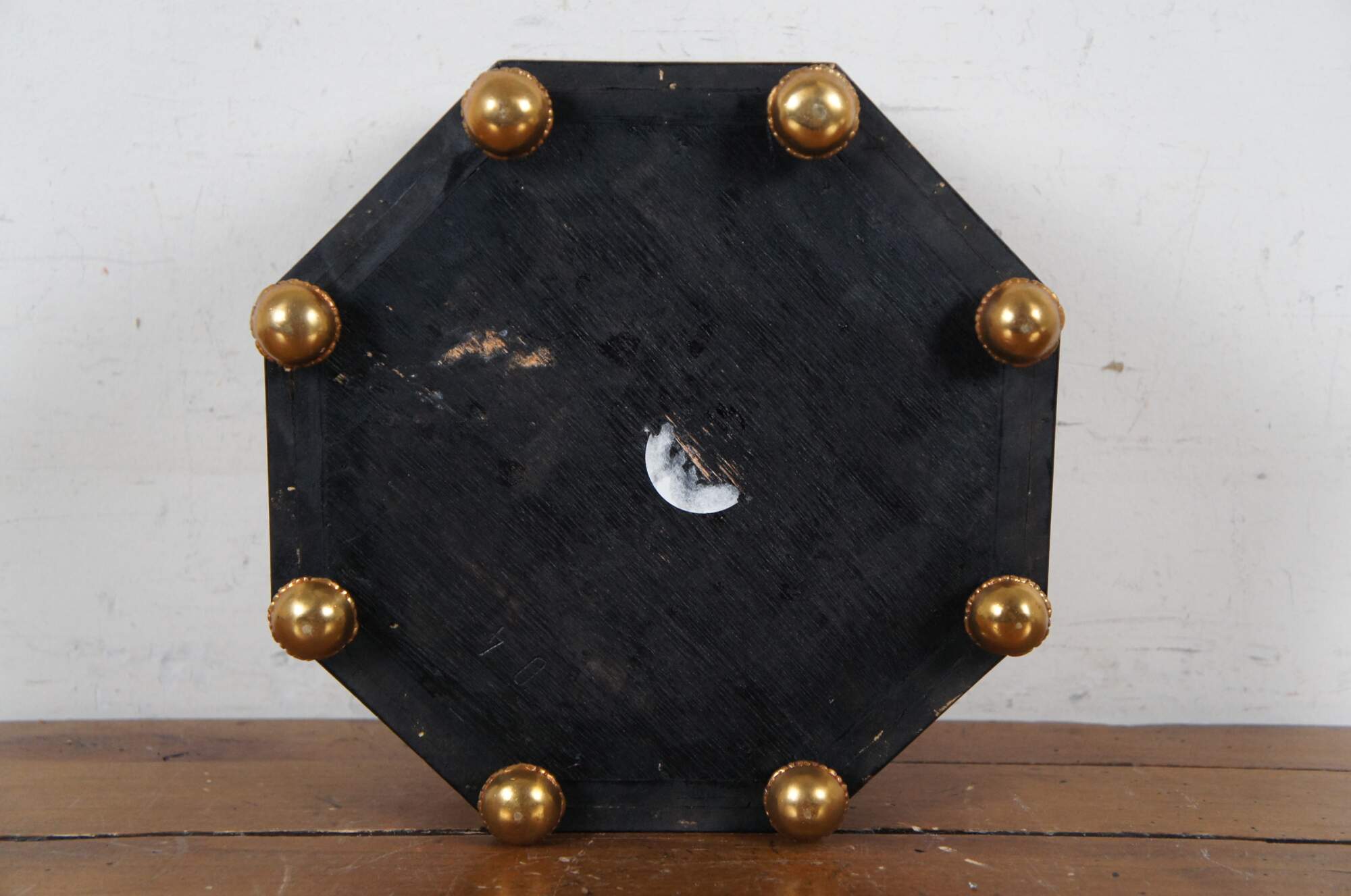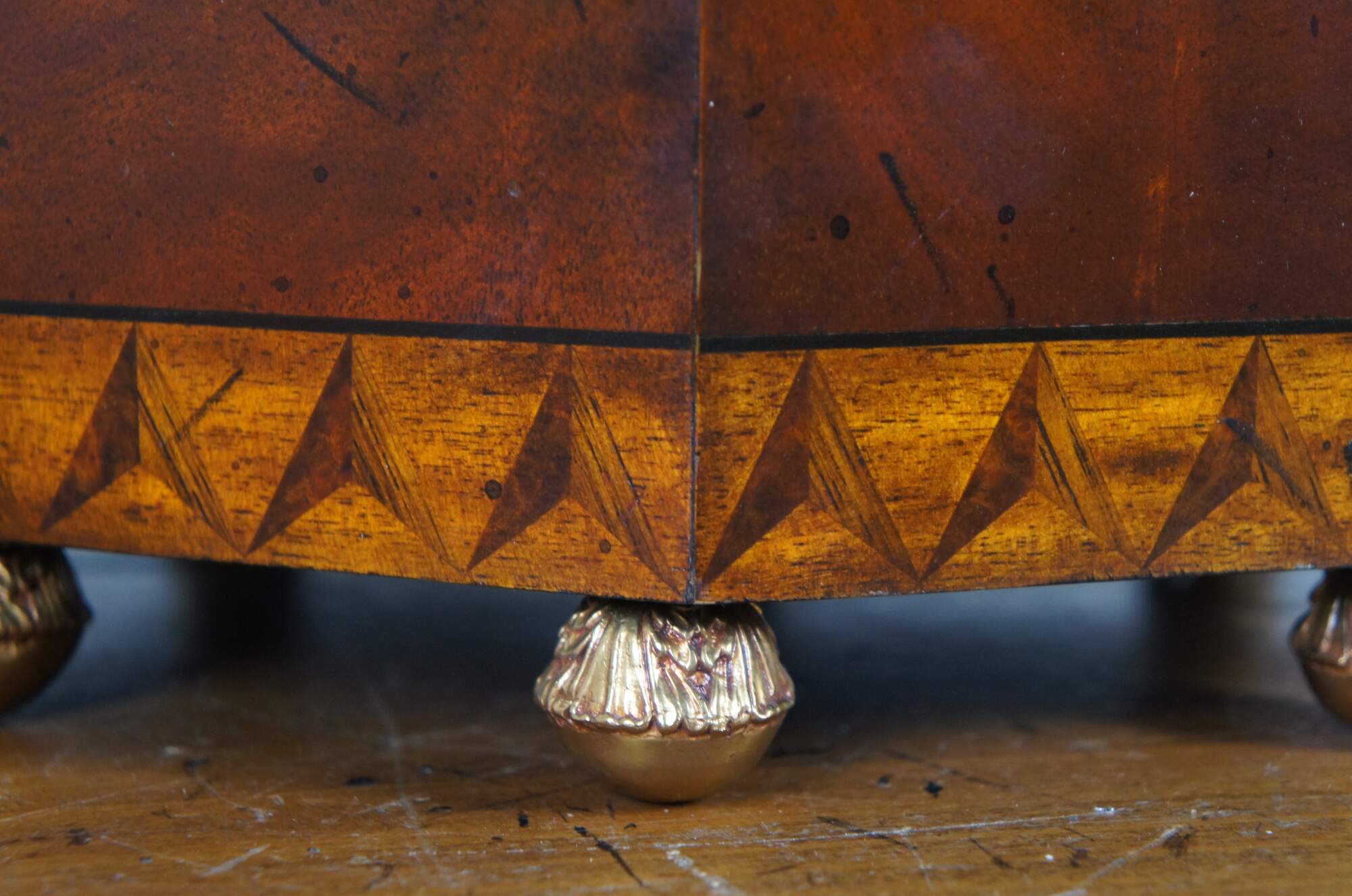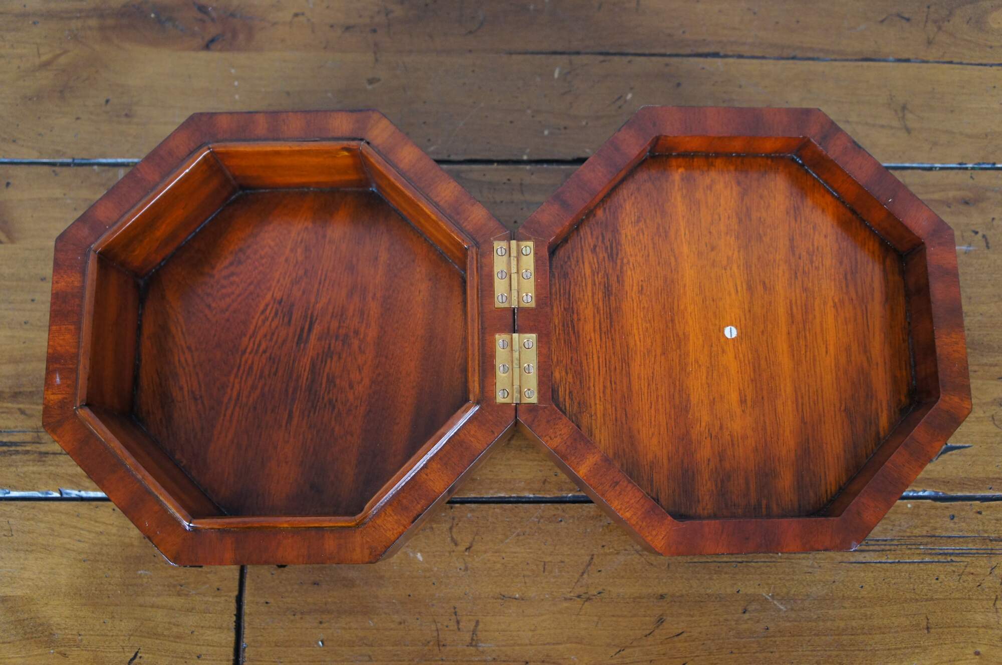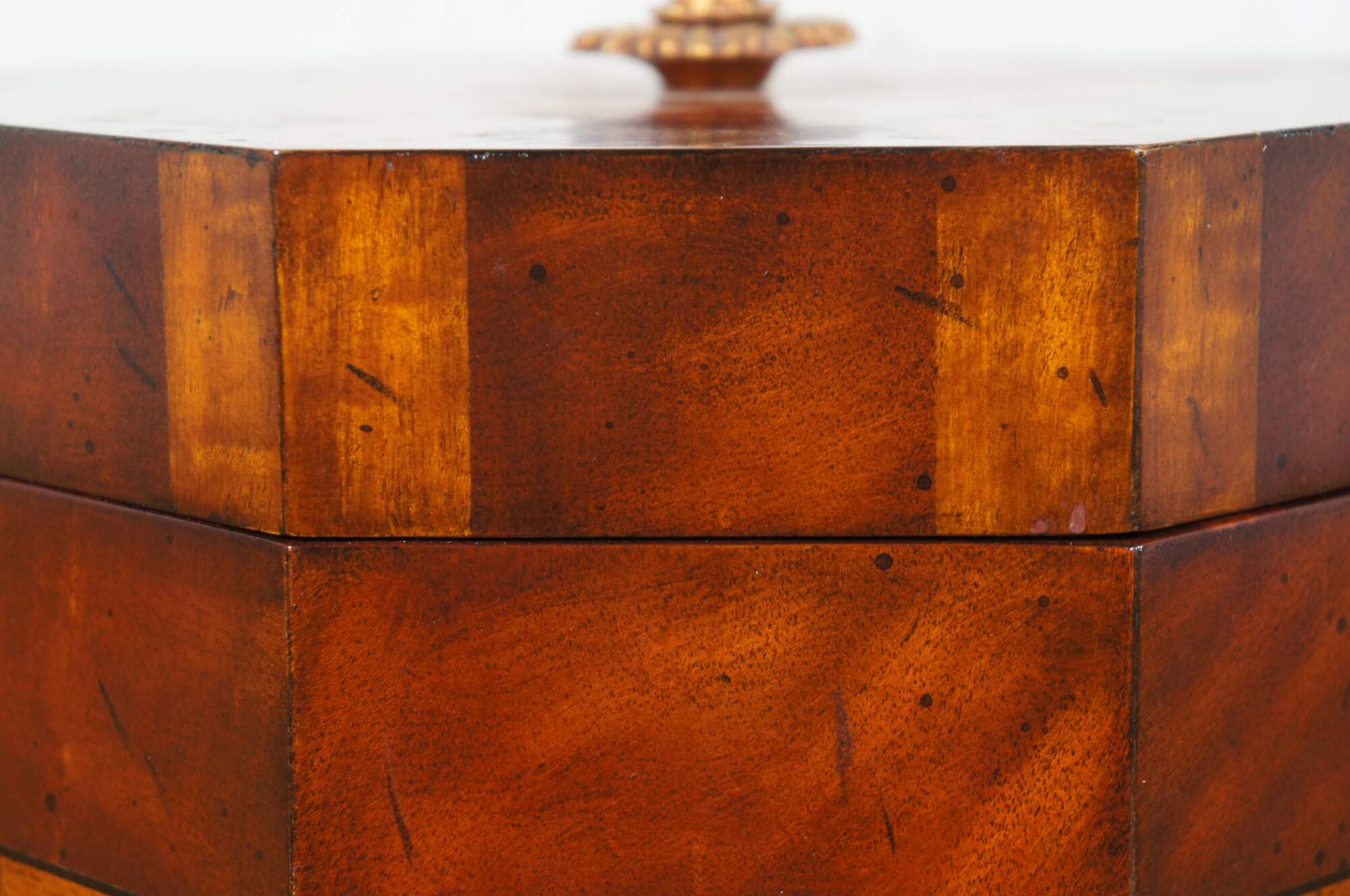 Vintage trinket / keepsake / jewelry / cigar box / casket / chest by Maitland Smith. Octagonal form made from mahogany featuring an parquetry design of inlaid fruitwood, hinged lid, six round, brass, foliate feet, and brass pineapple finial.