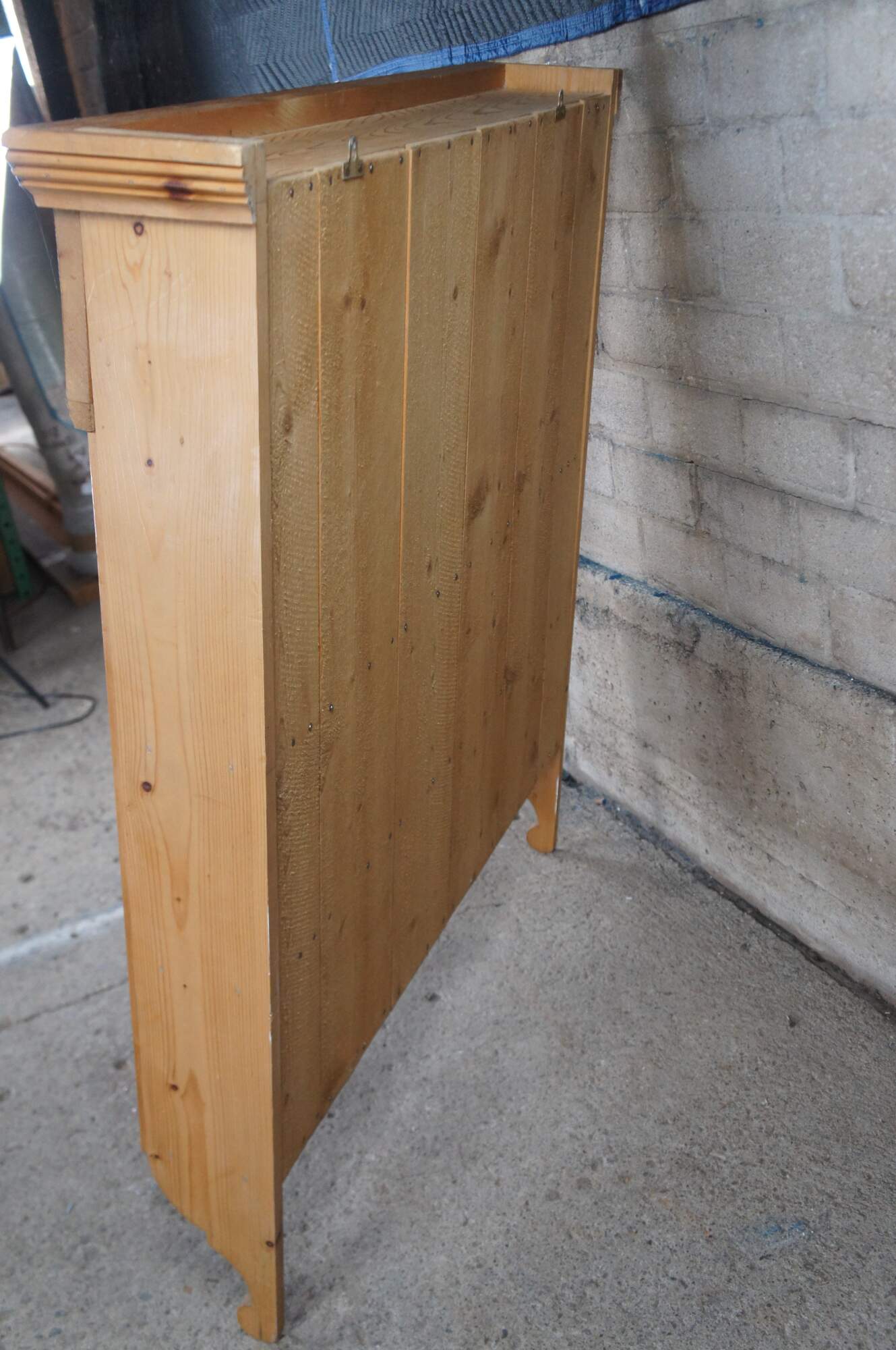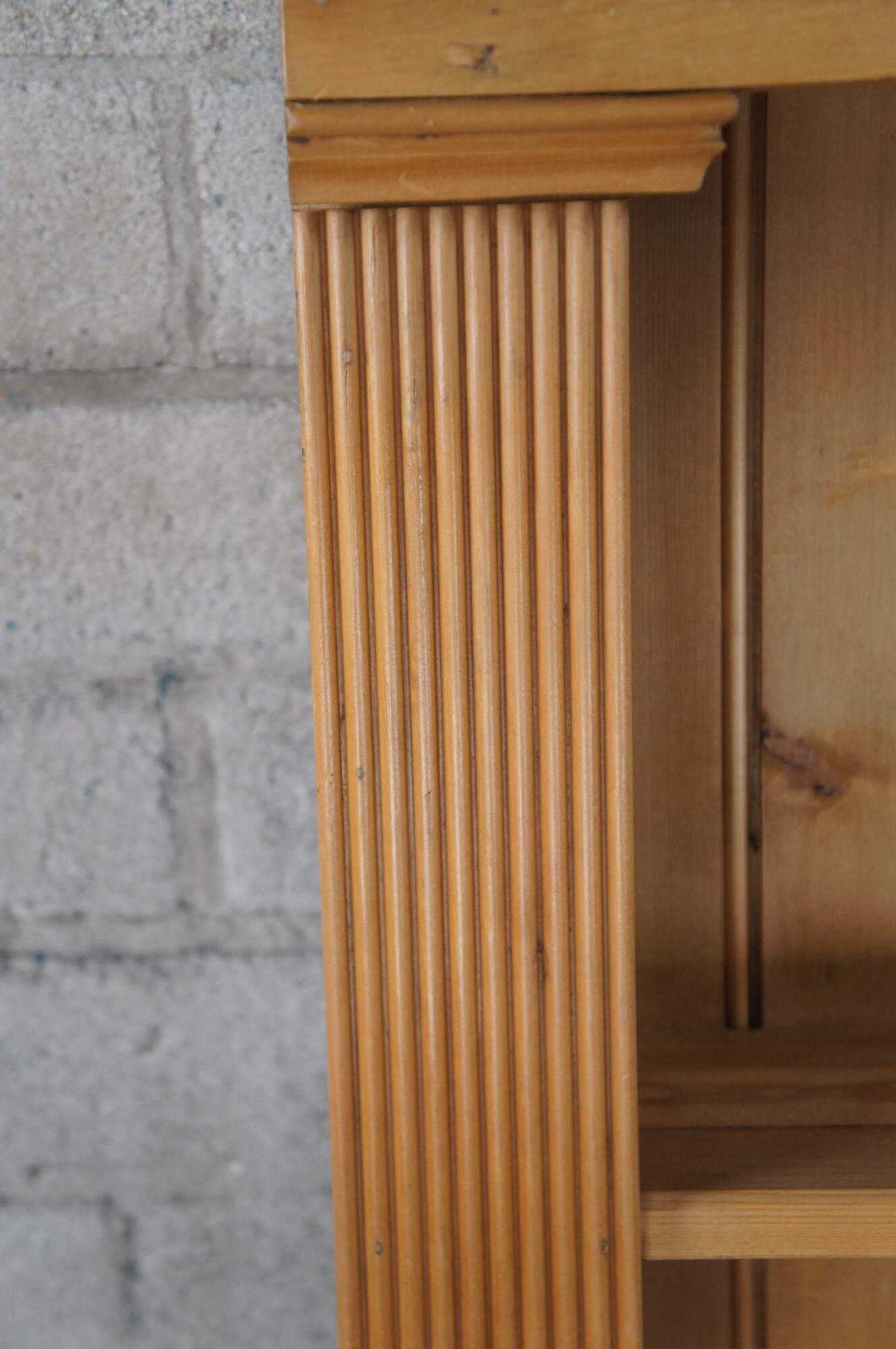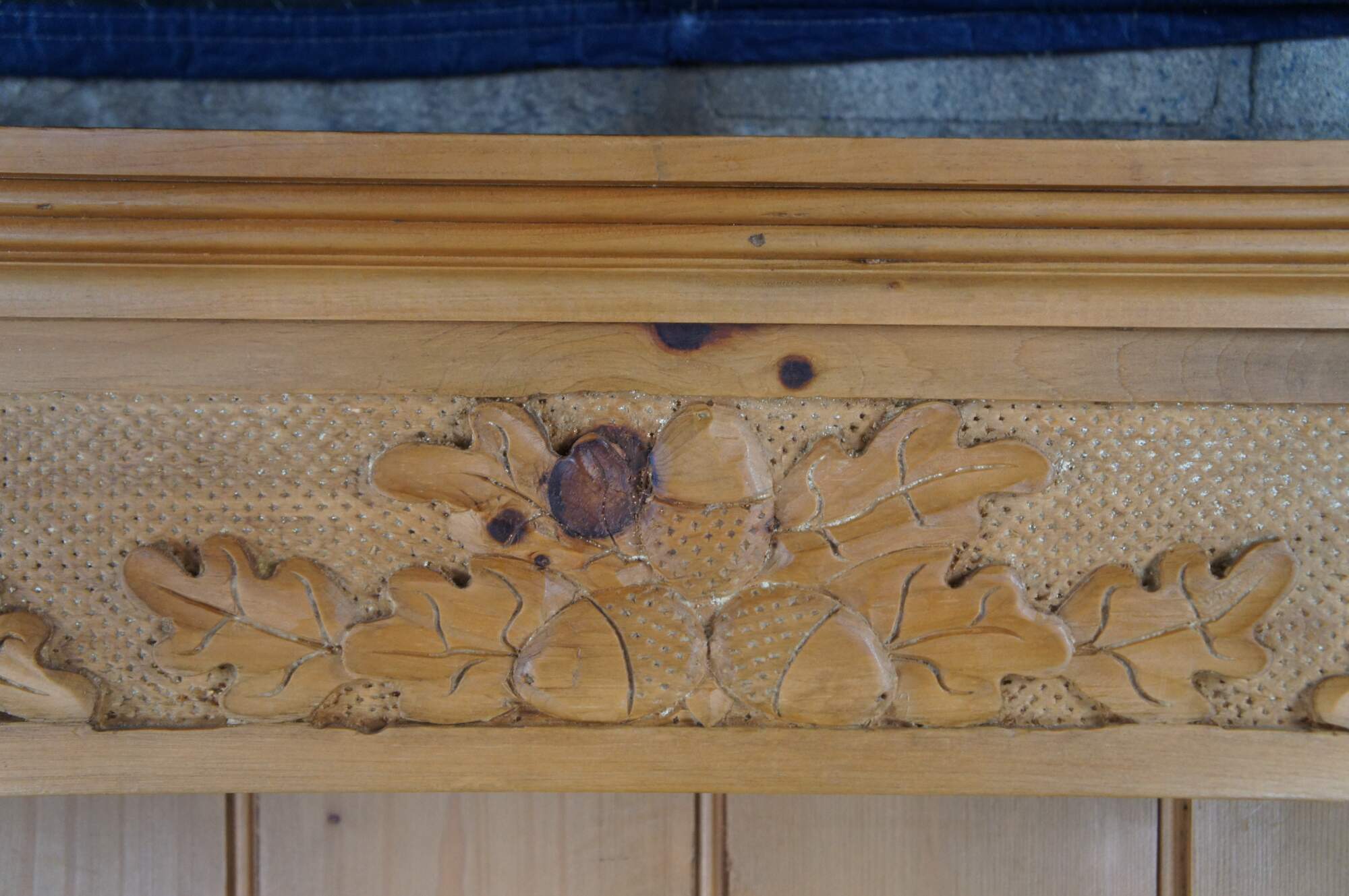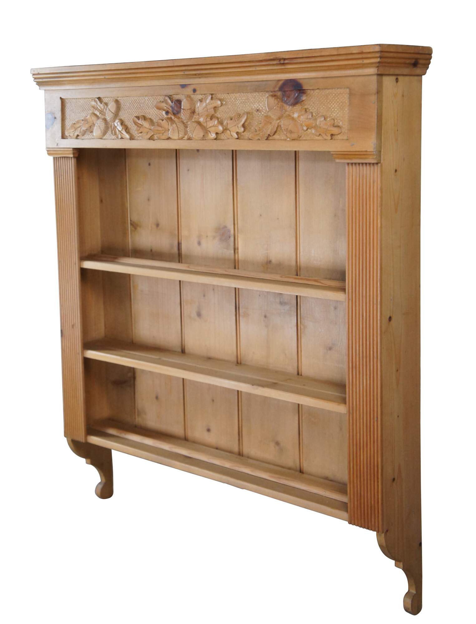 Very large vintage Garcia Imports country farmhouse wall shelf / book shelf / plate display rack. Made of pine featuring English styling with acorn and leaf theme carving and three tiered shelves flanked by fluted moulding.