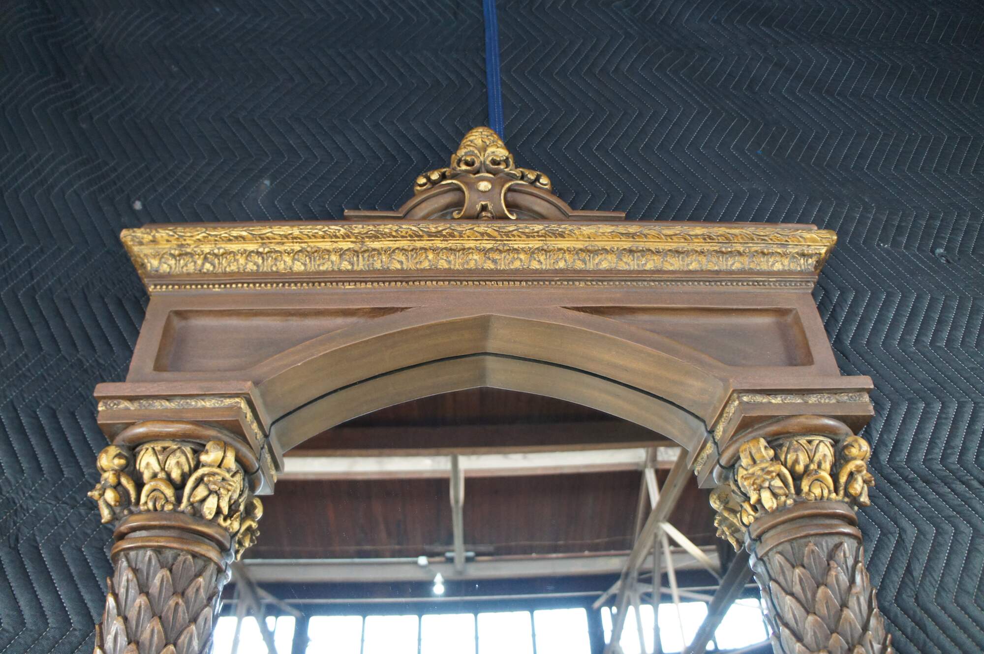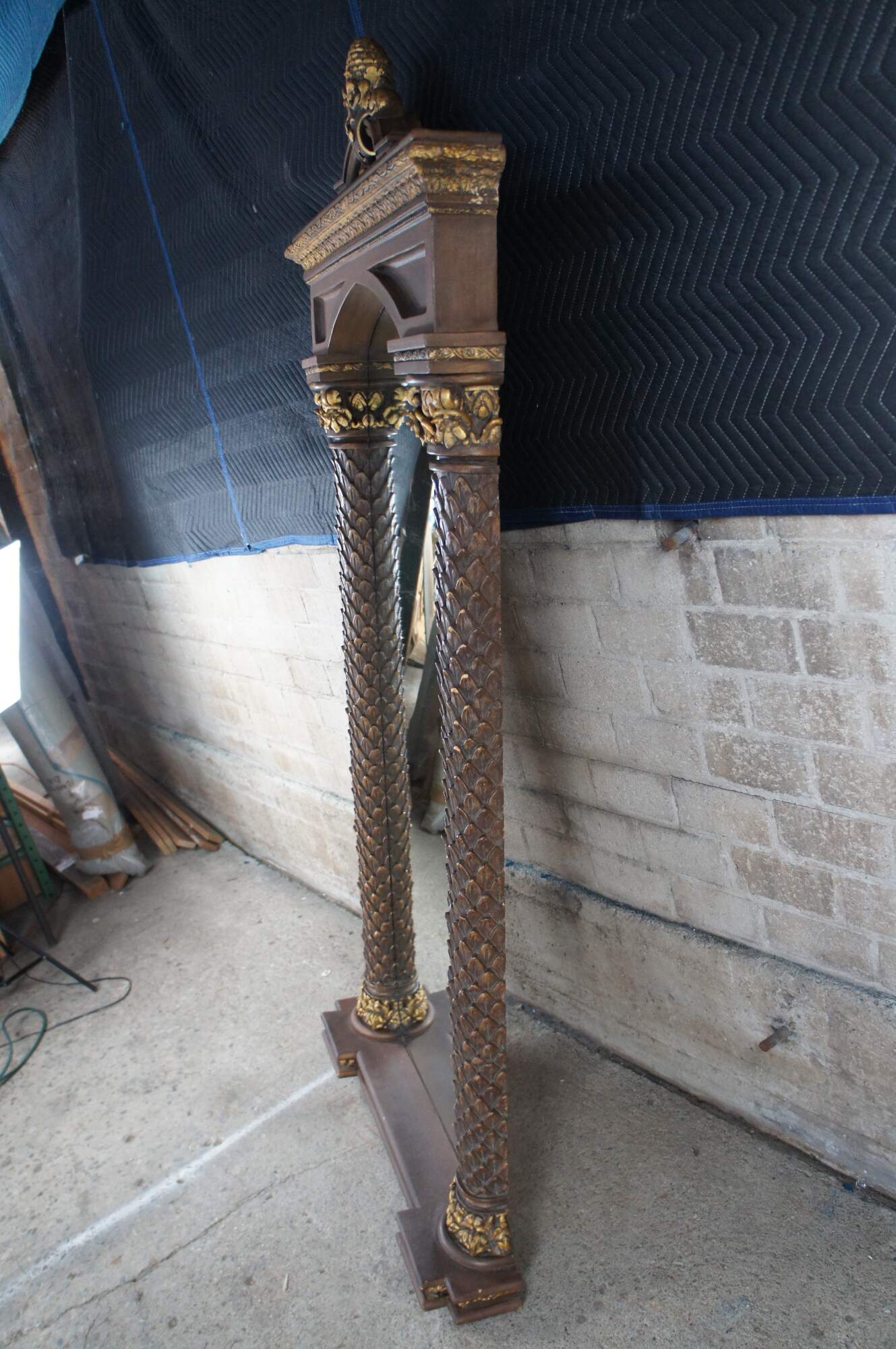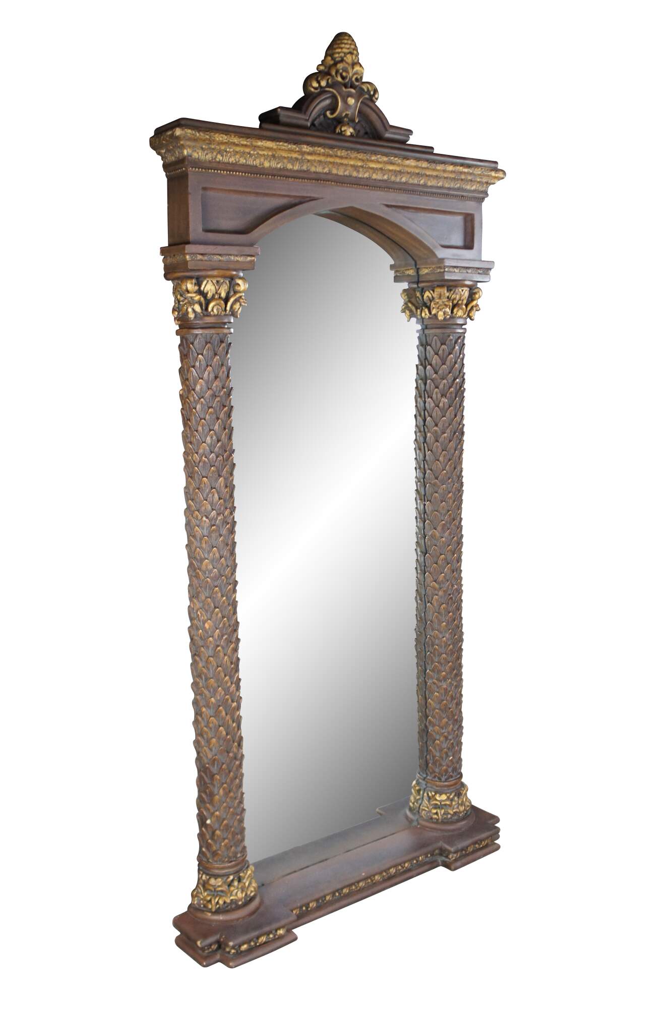 Timeless Reflections Regency style mirror, circa last quarter 20th century. Features two ornate columns with gold acanthus accents and pineapple / fleur de list crown. Made by Timeless Industries in Mexico