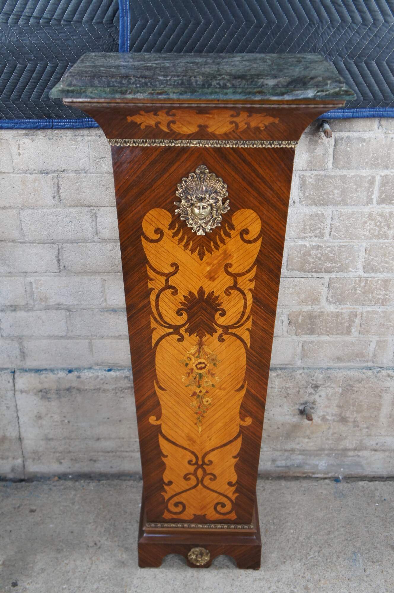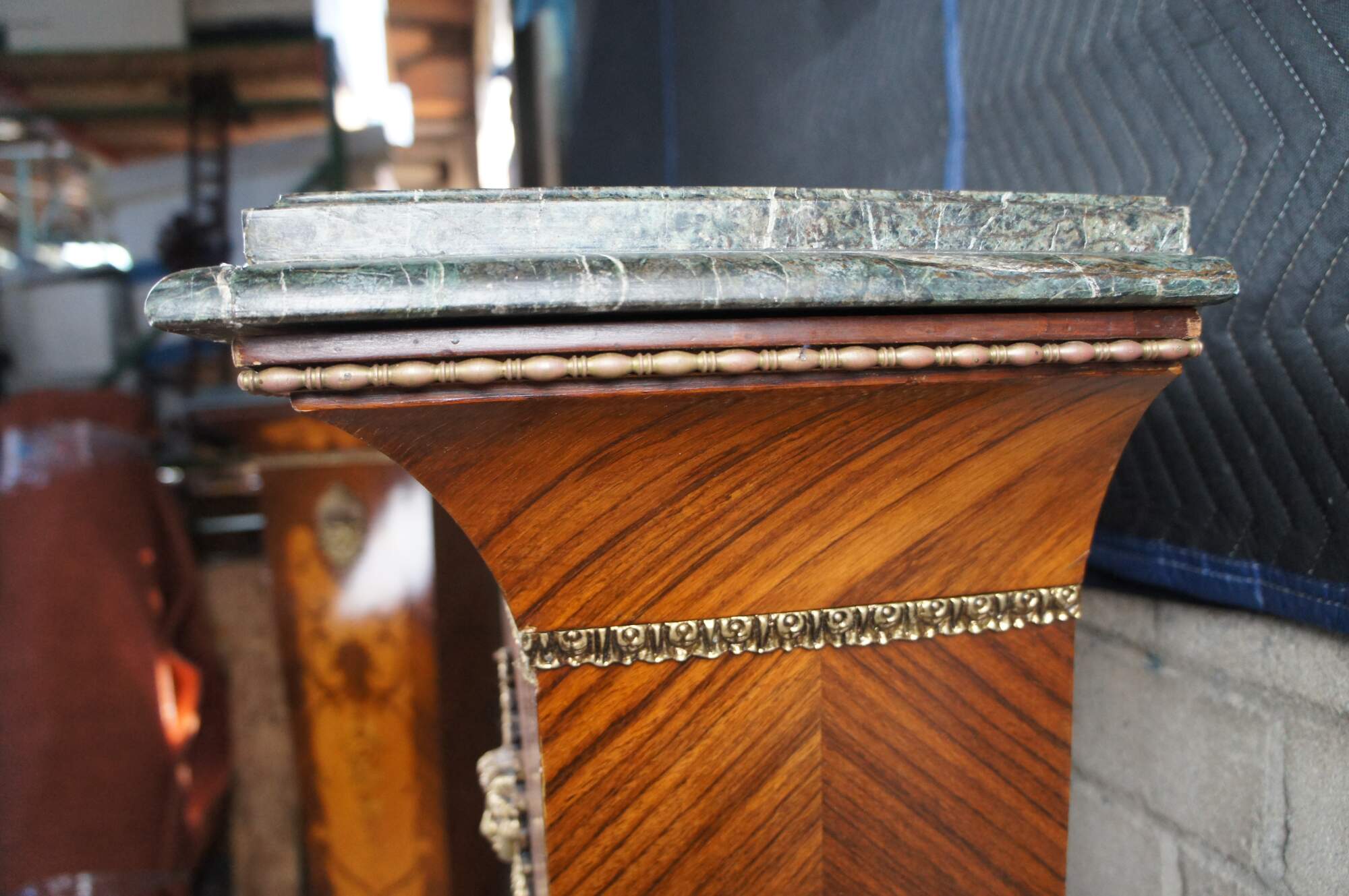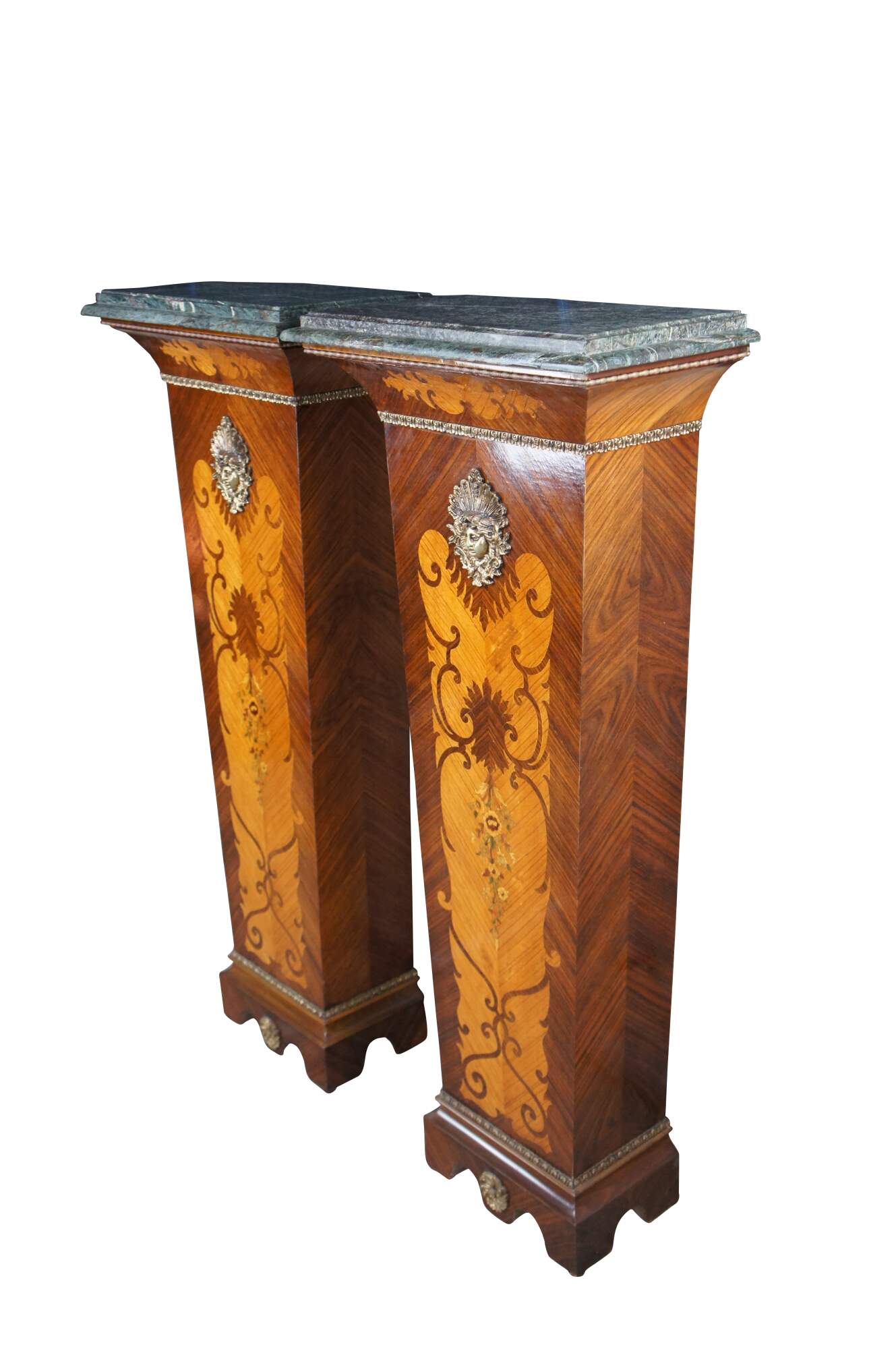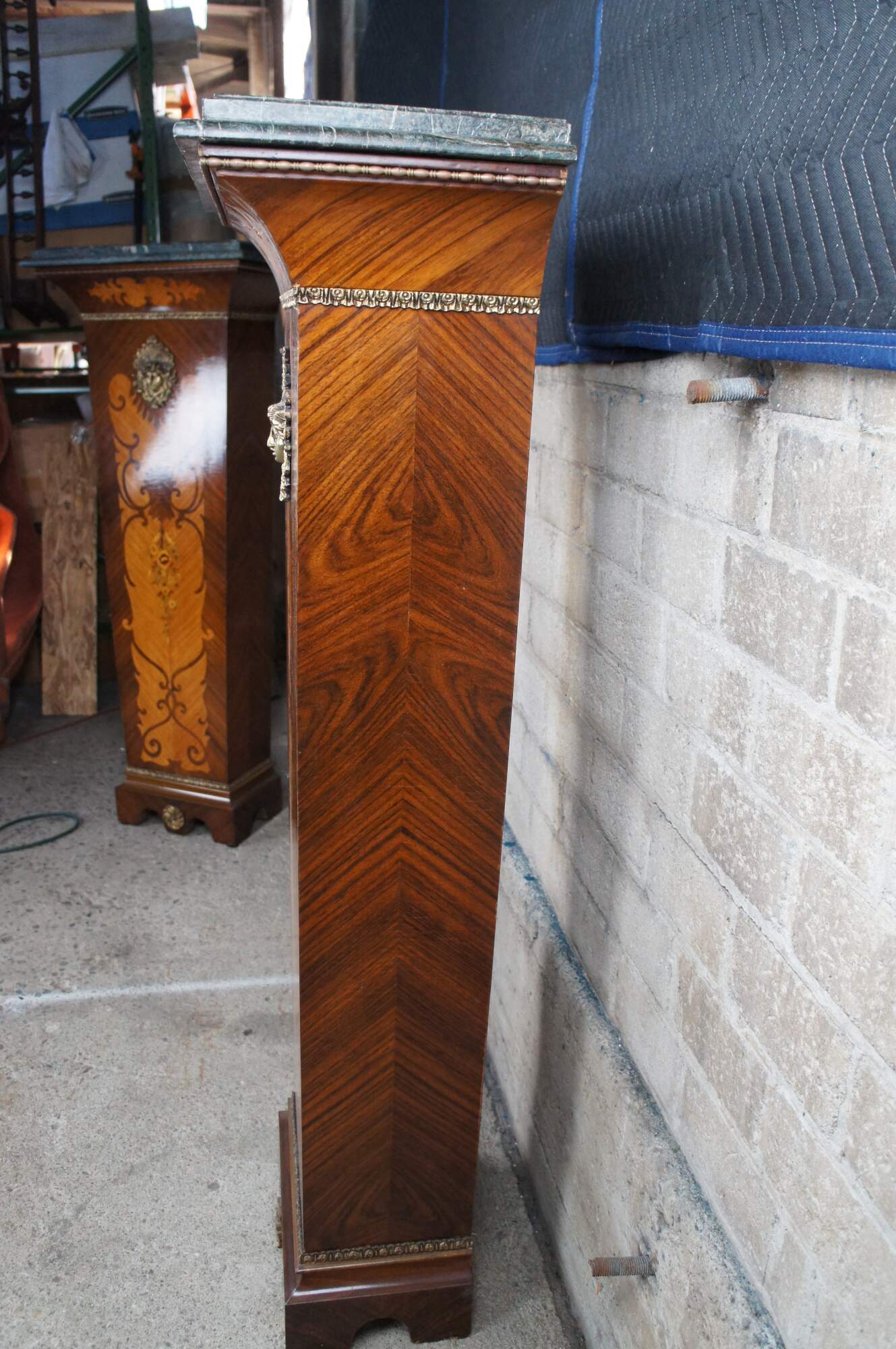 Pair of two French Louis XV style sculpture stands or clock / bust pedestals. Made of walnut and fruitwood featuring tapered form with inlaid matchbook walnut parquetry design and floral marquetry. Each features a beveled green marble top, gilded brass accents and bracket feet.