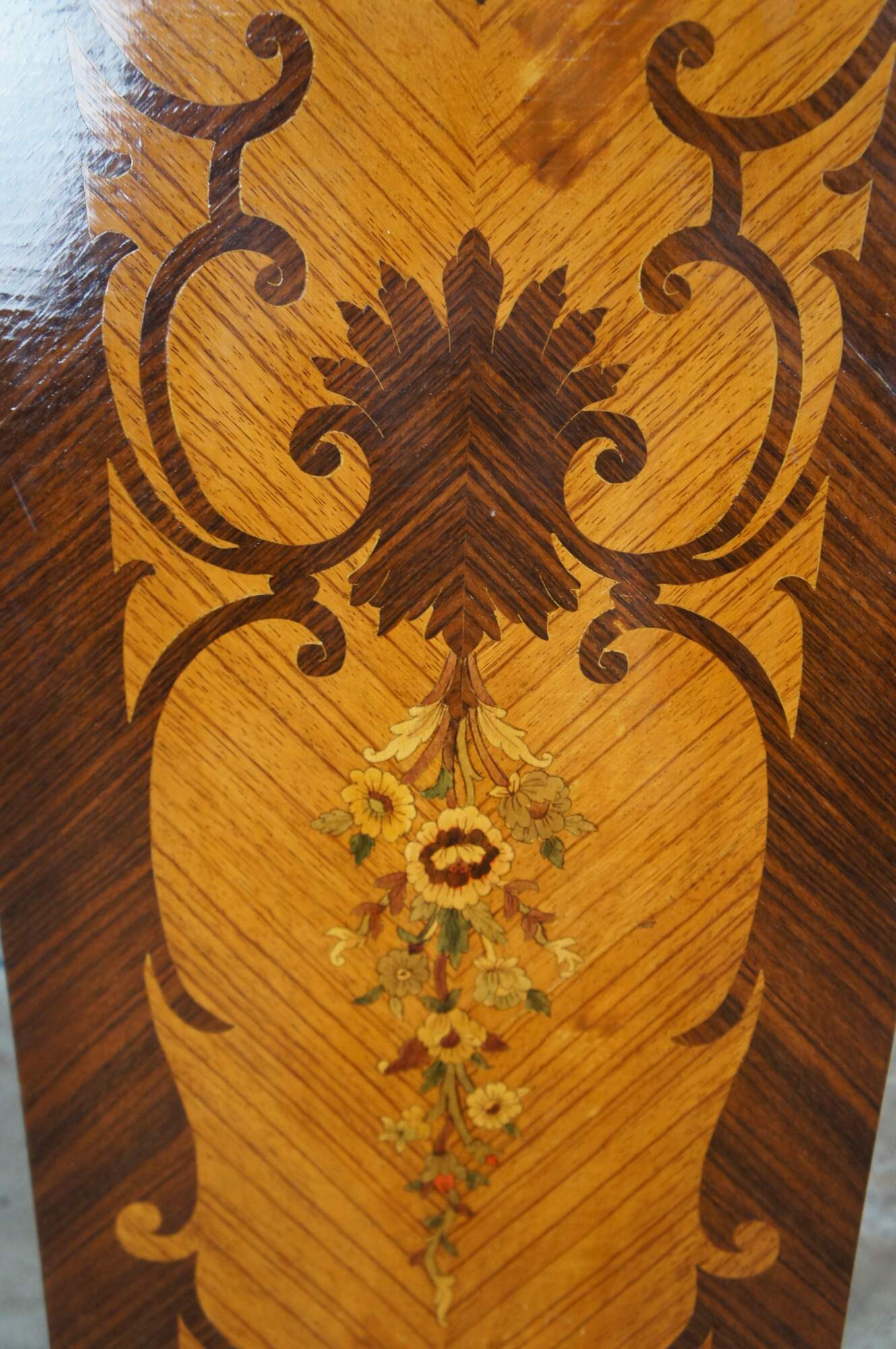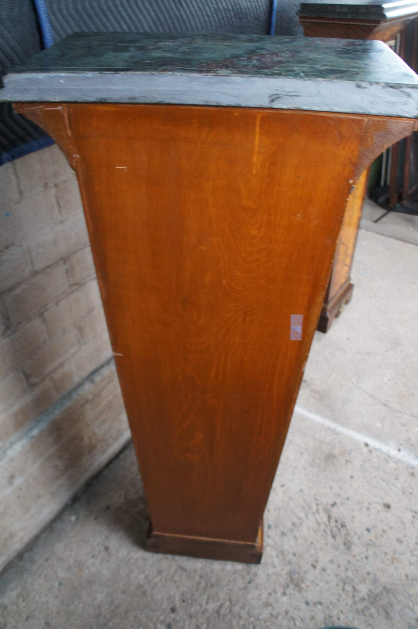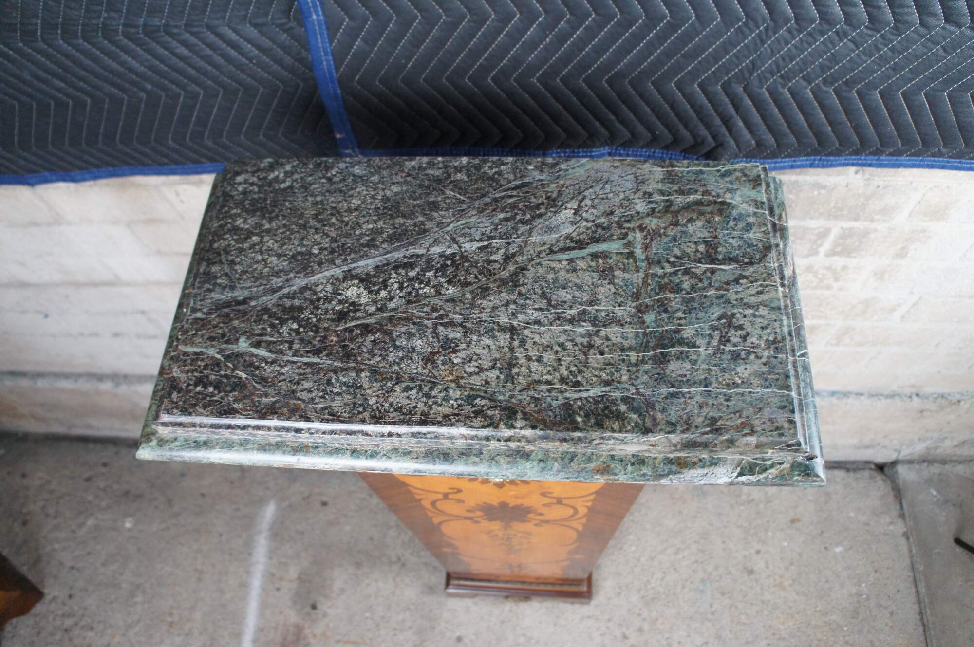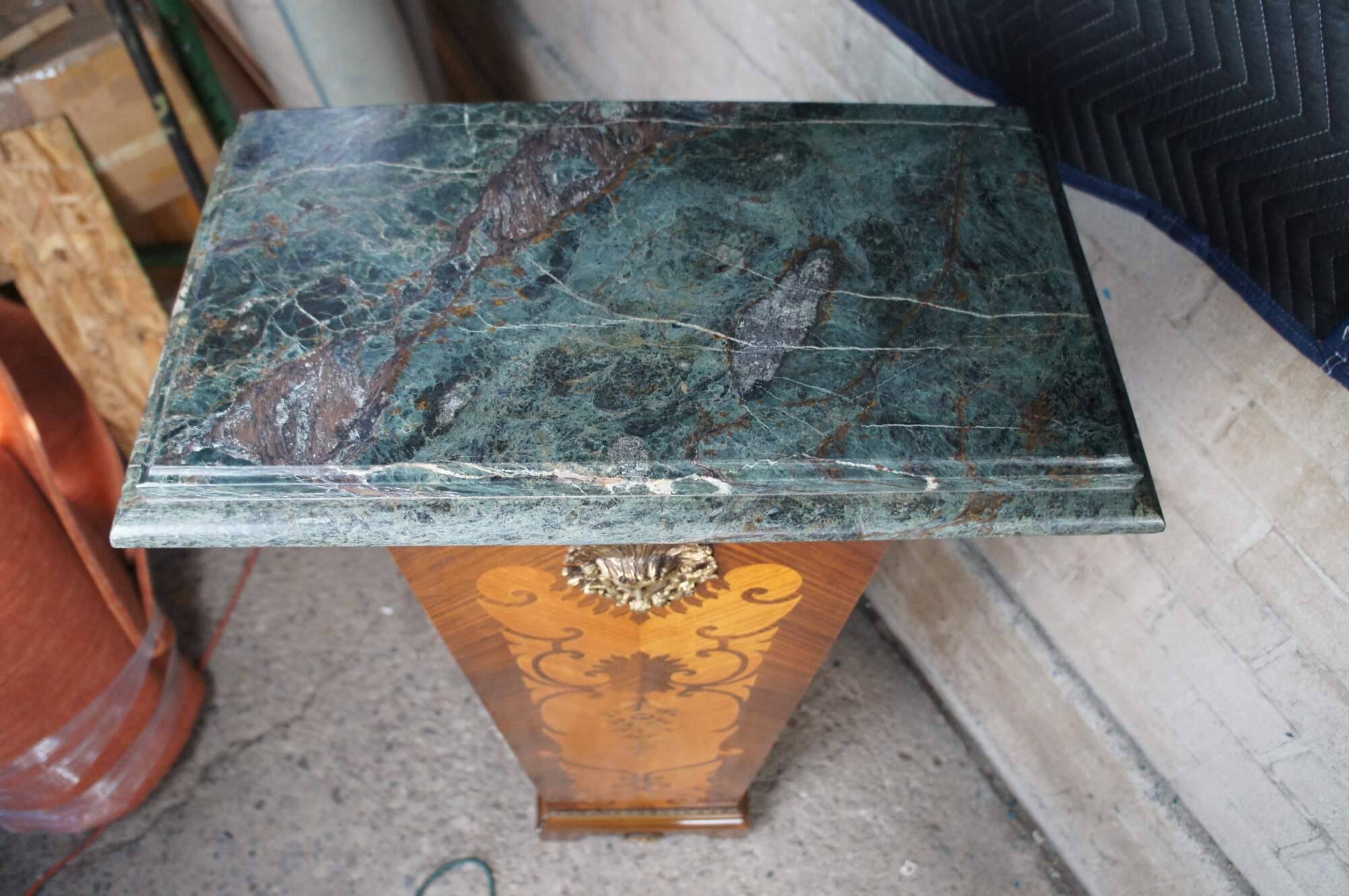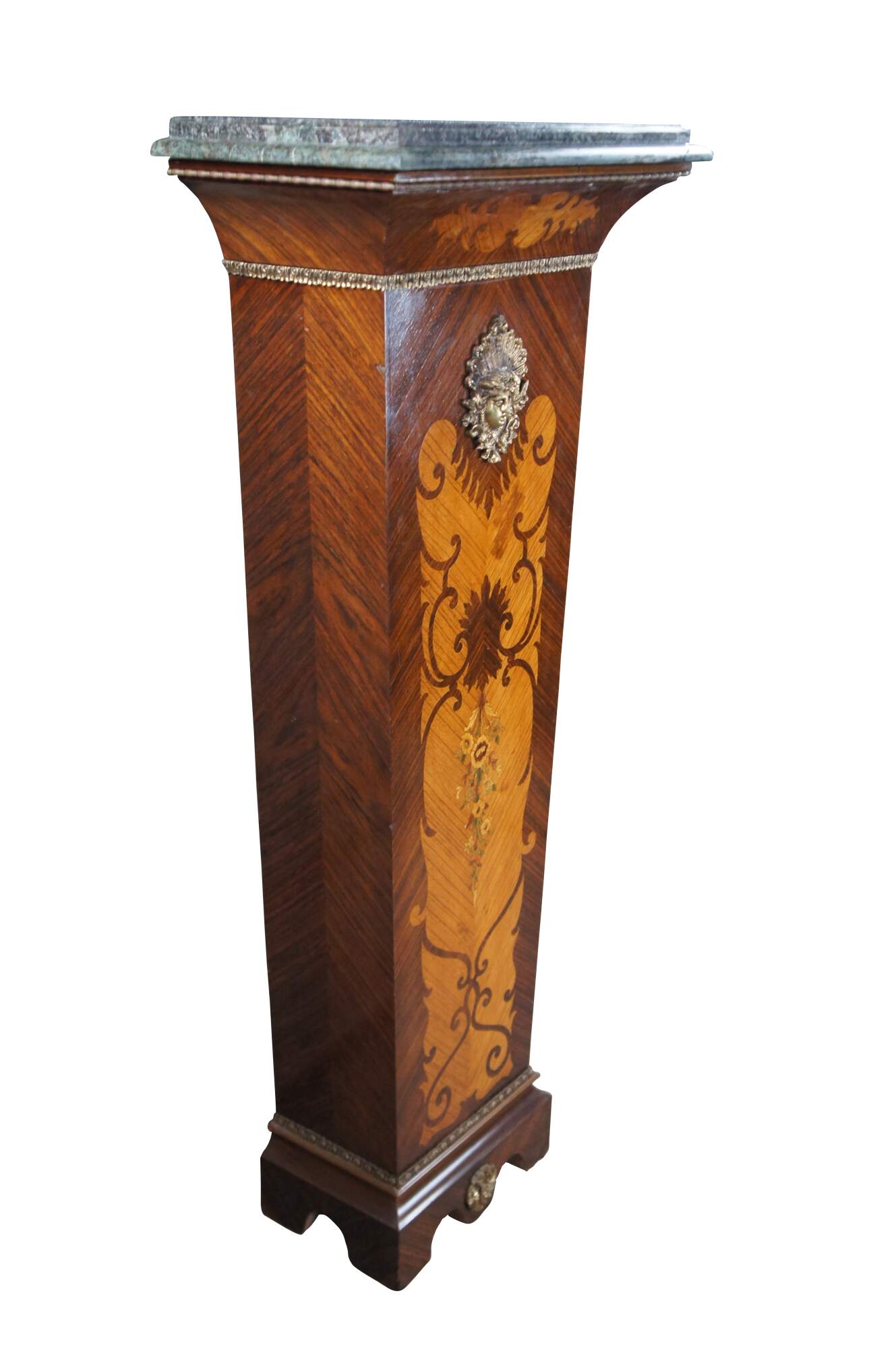 Pair of two French Louis XV style sculpture stands or clock / bust pedestals. Made of walnut and fruitwood featuring tapered form with inlaid matchbook walnut parquetry design and floral marquetry. Each features a beveled green marble top, gilded brass accents and bracket feet.