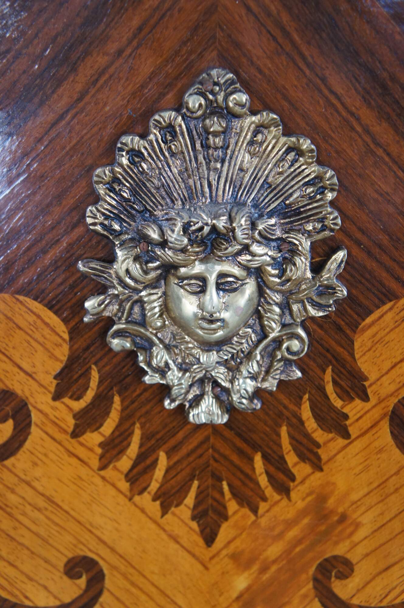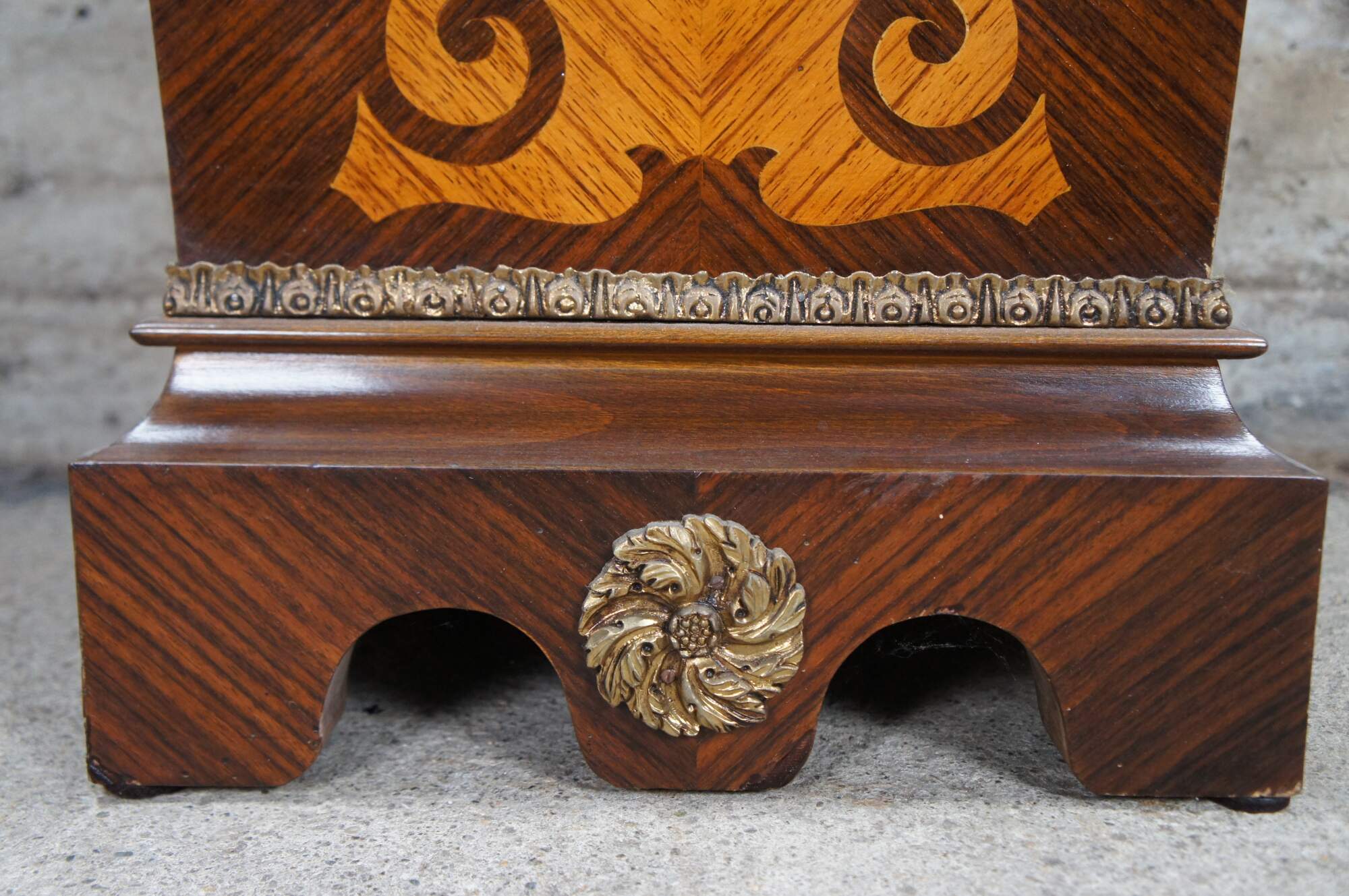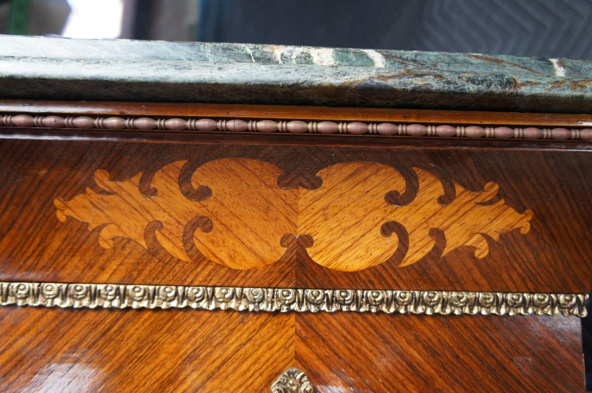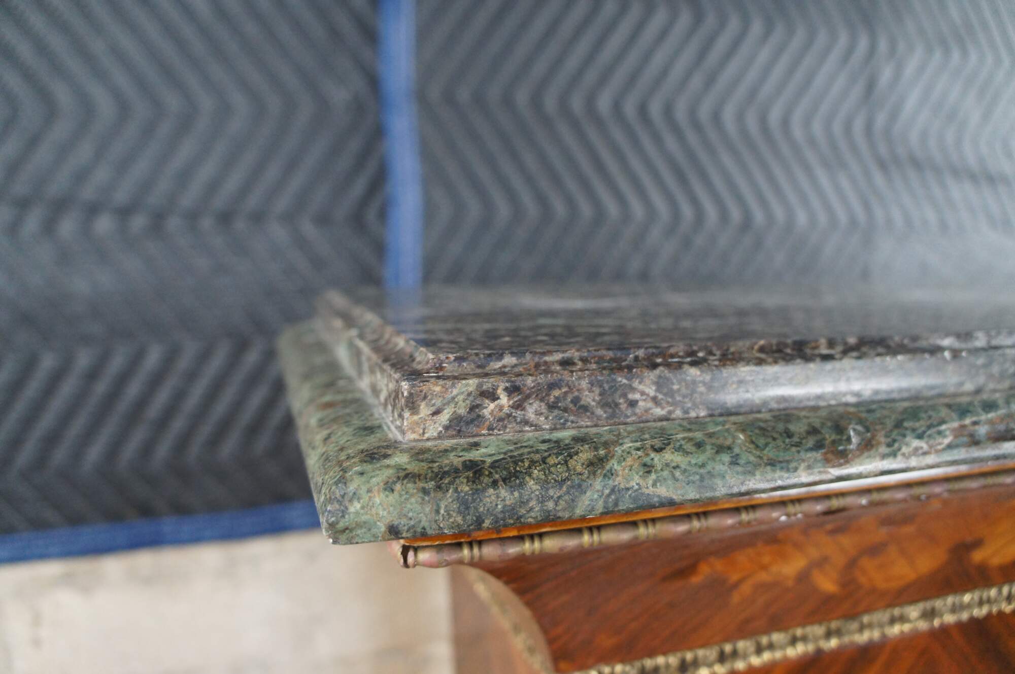 Pair of two French Louis XV style sculpture stands or clock / bust pedestals. Made of walnut and fruitwood featuring tapered form with inlaid matchbook walnut parquetry design and floral marquetry. Each features a beveled green marble top, gilded brass accents and bracket feet.