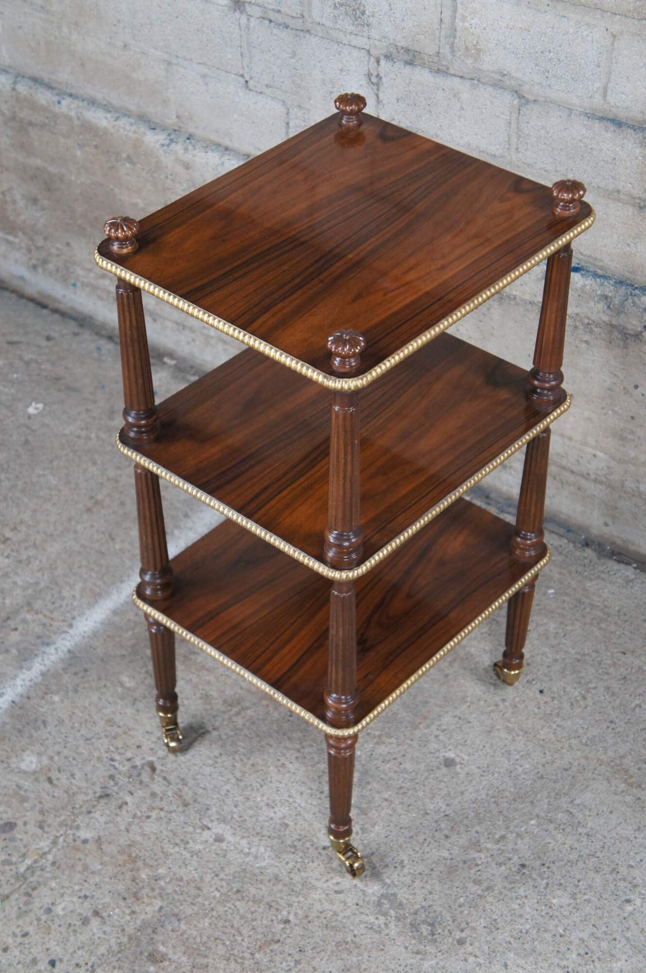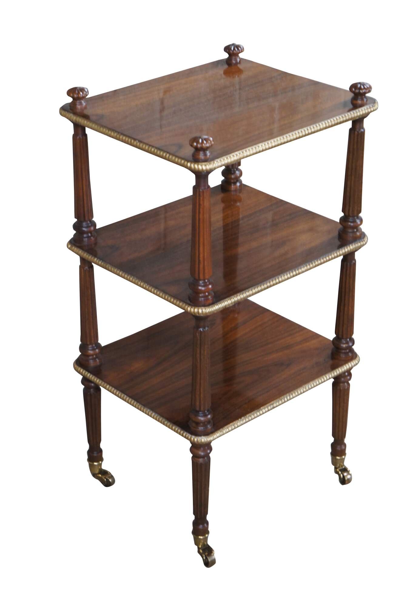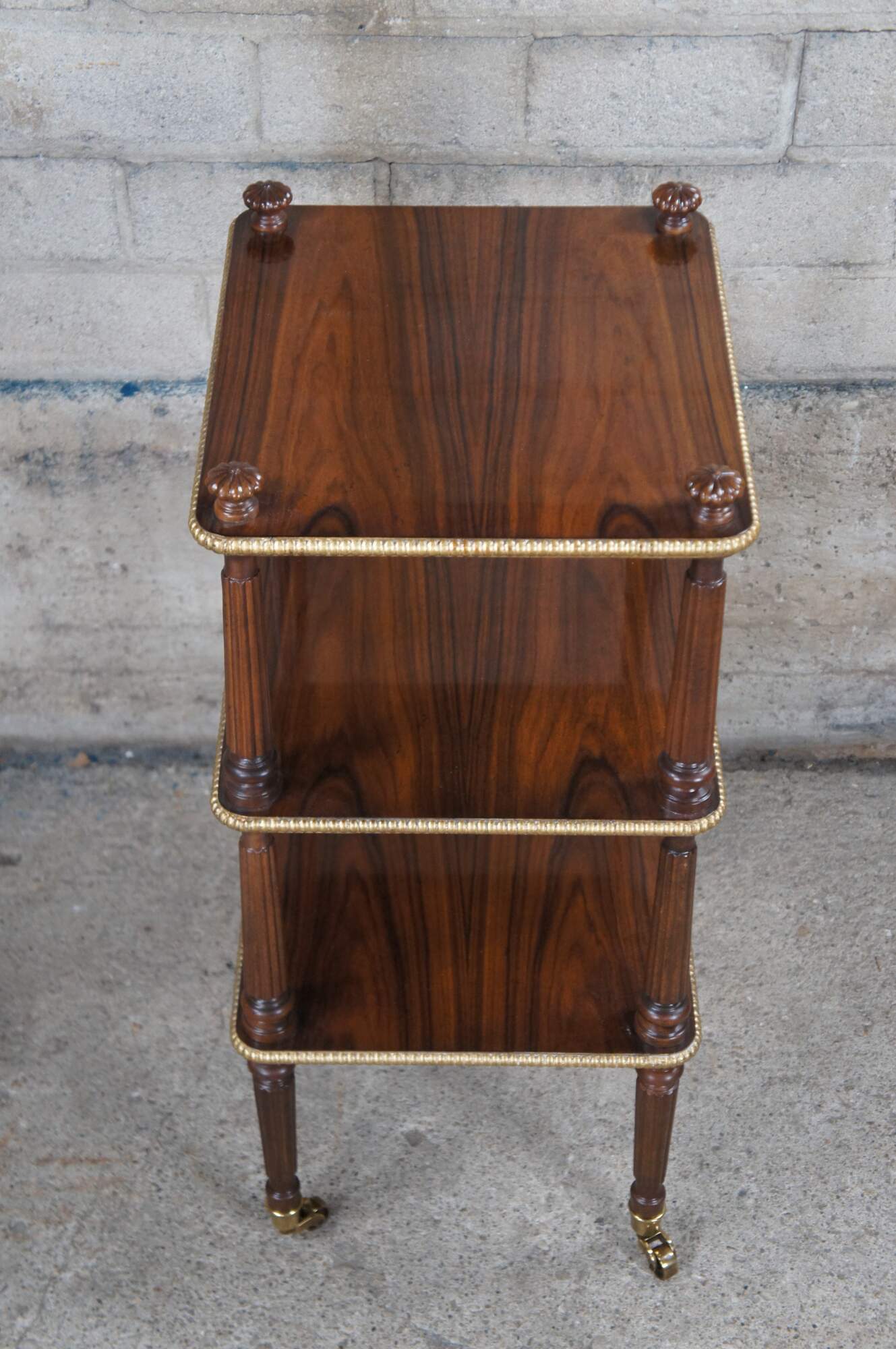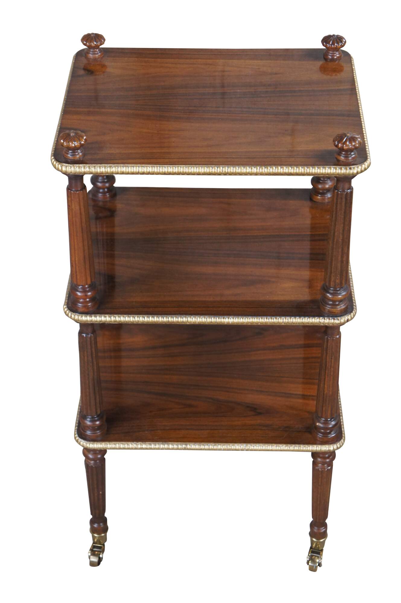 Vintage Baker Stately Homes Collection bar cart, side table or stand. Made of rosewood featuring tiered design with gilded gadrooned edges, turned and fluted columns, ornate finials and brass castors.