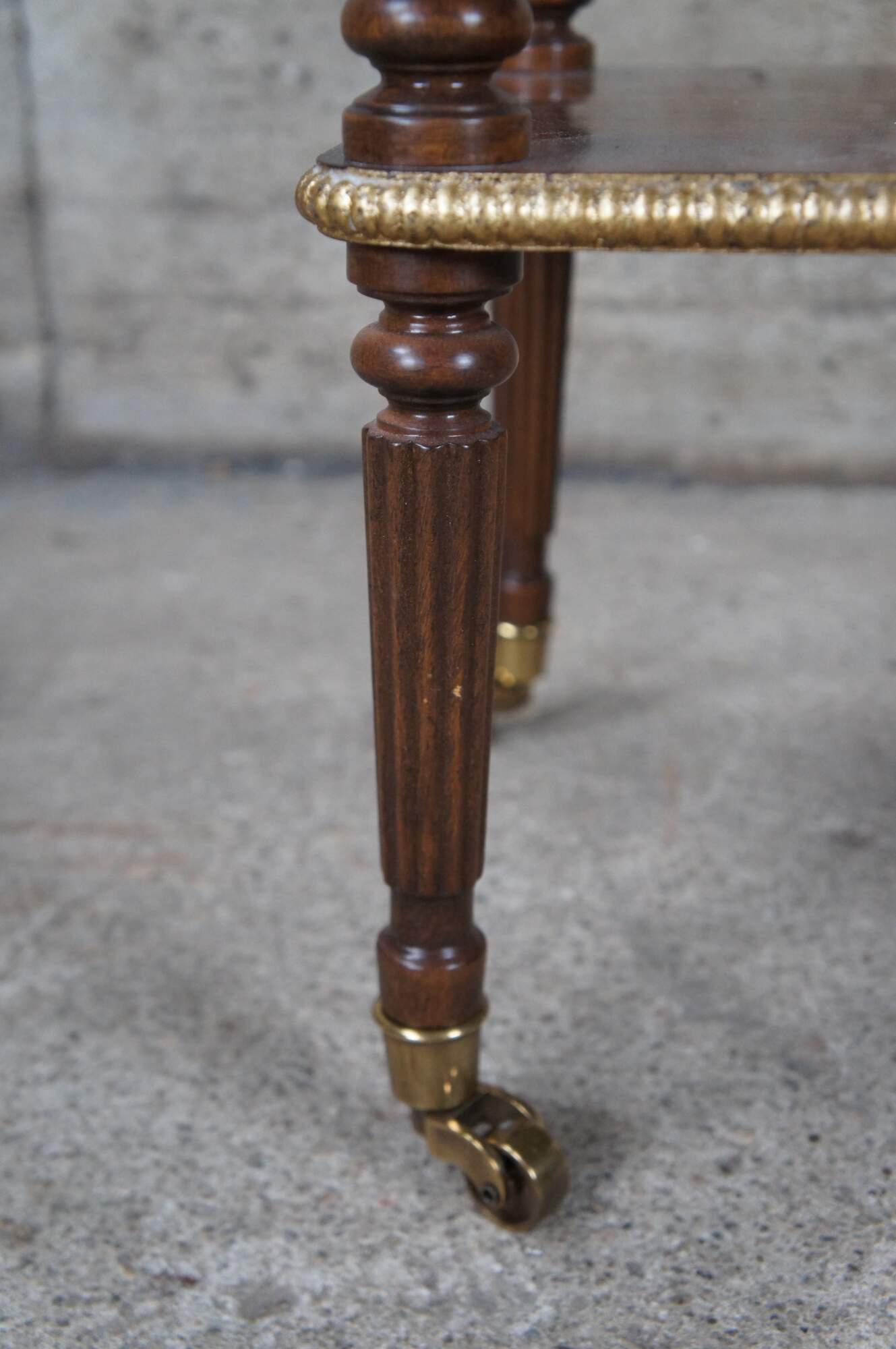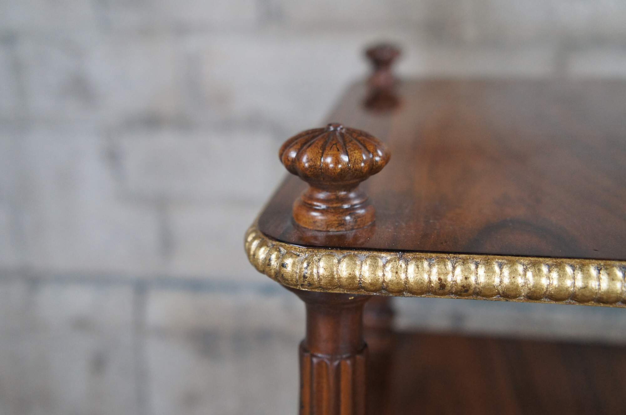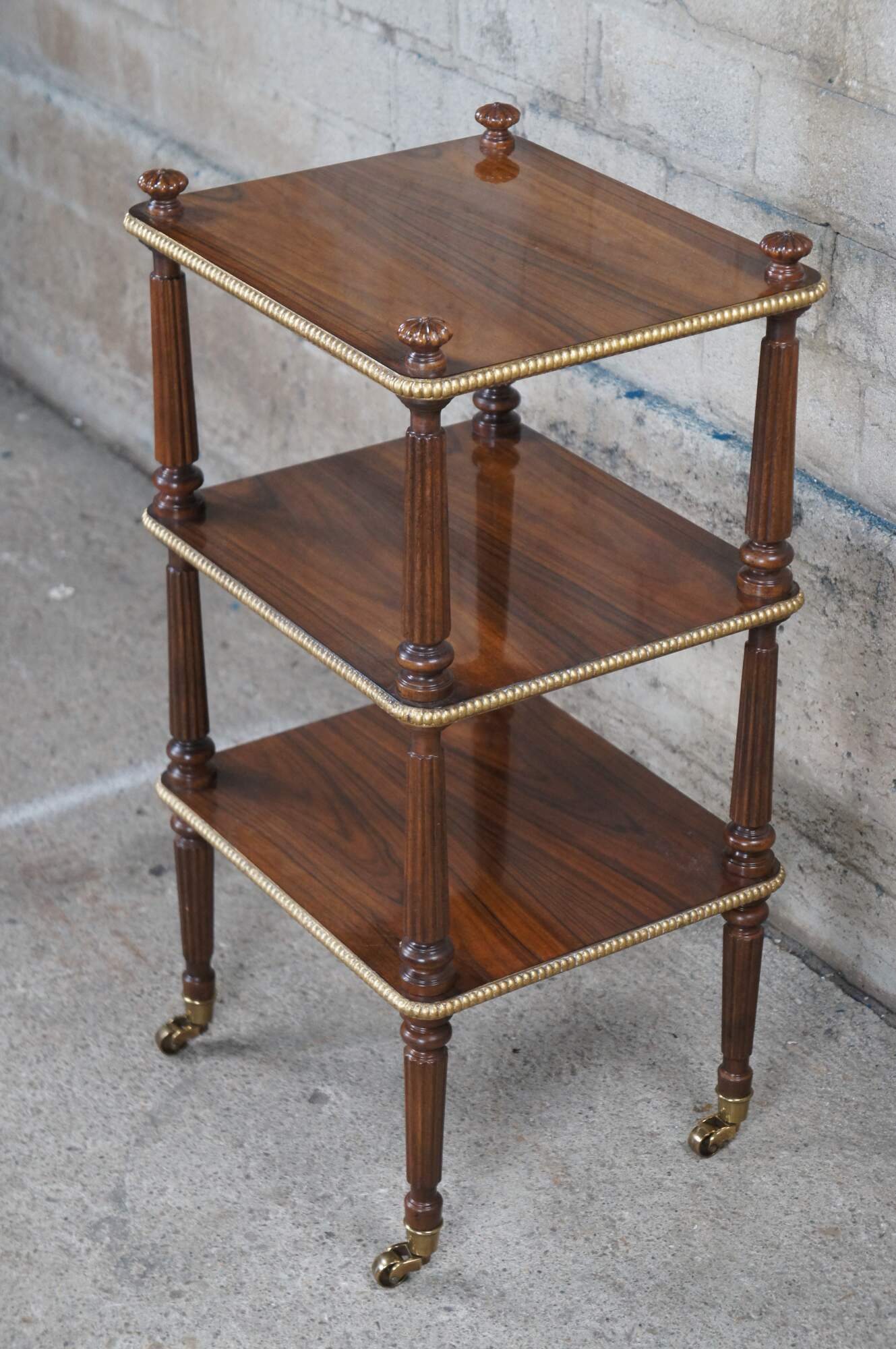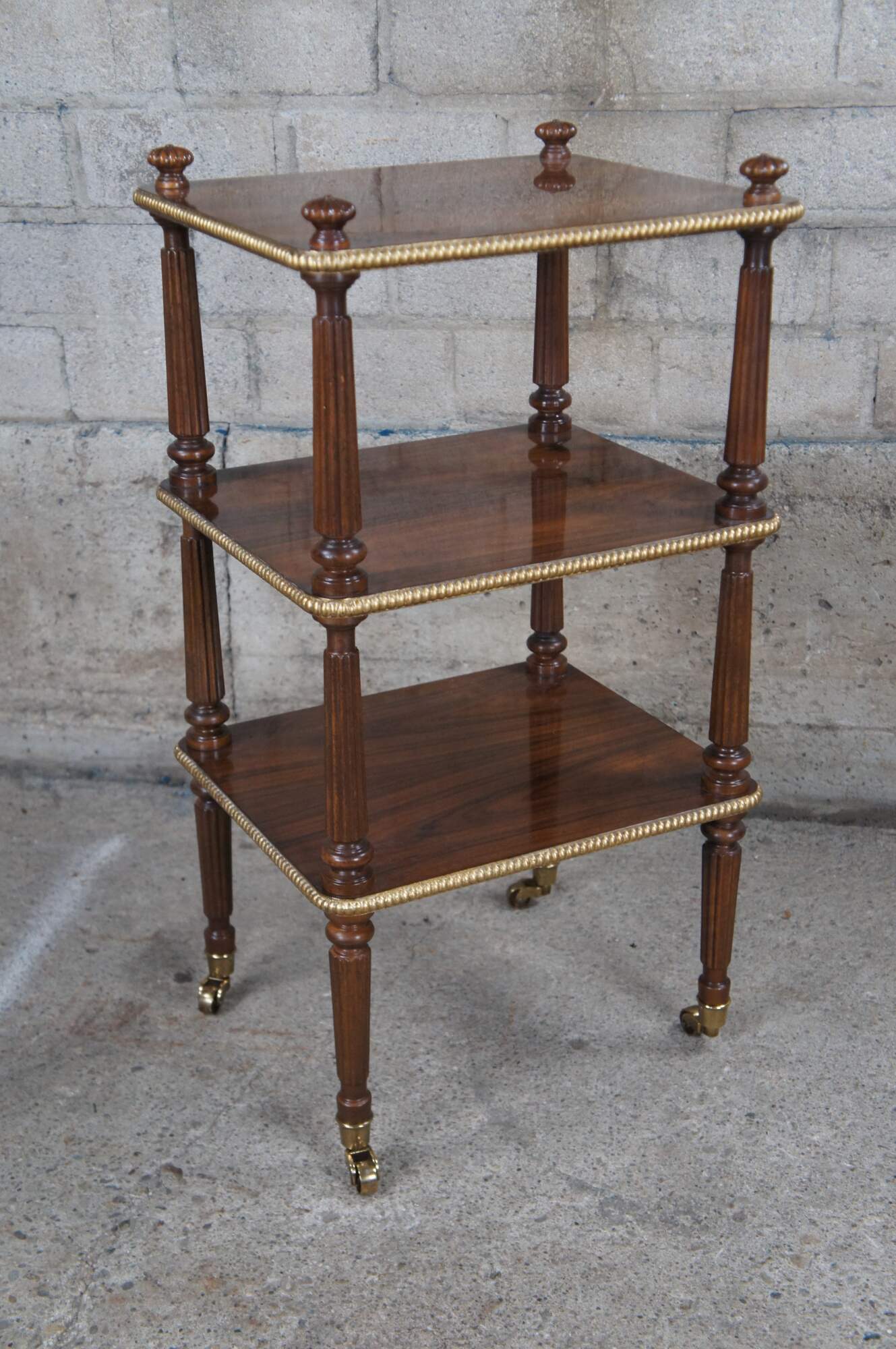 Vintage Baker Stately Homes Collection bar cart, side table or stand. Made of rosewood featuring tiered design with gilded gadrooned edges, turned and fluted columns, ornate finials and brass castors.