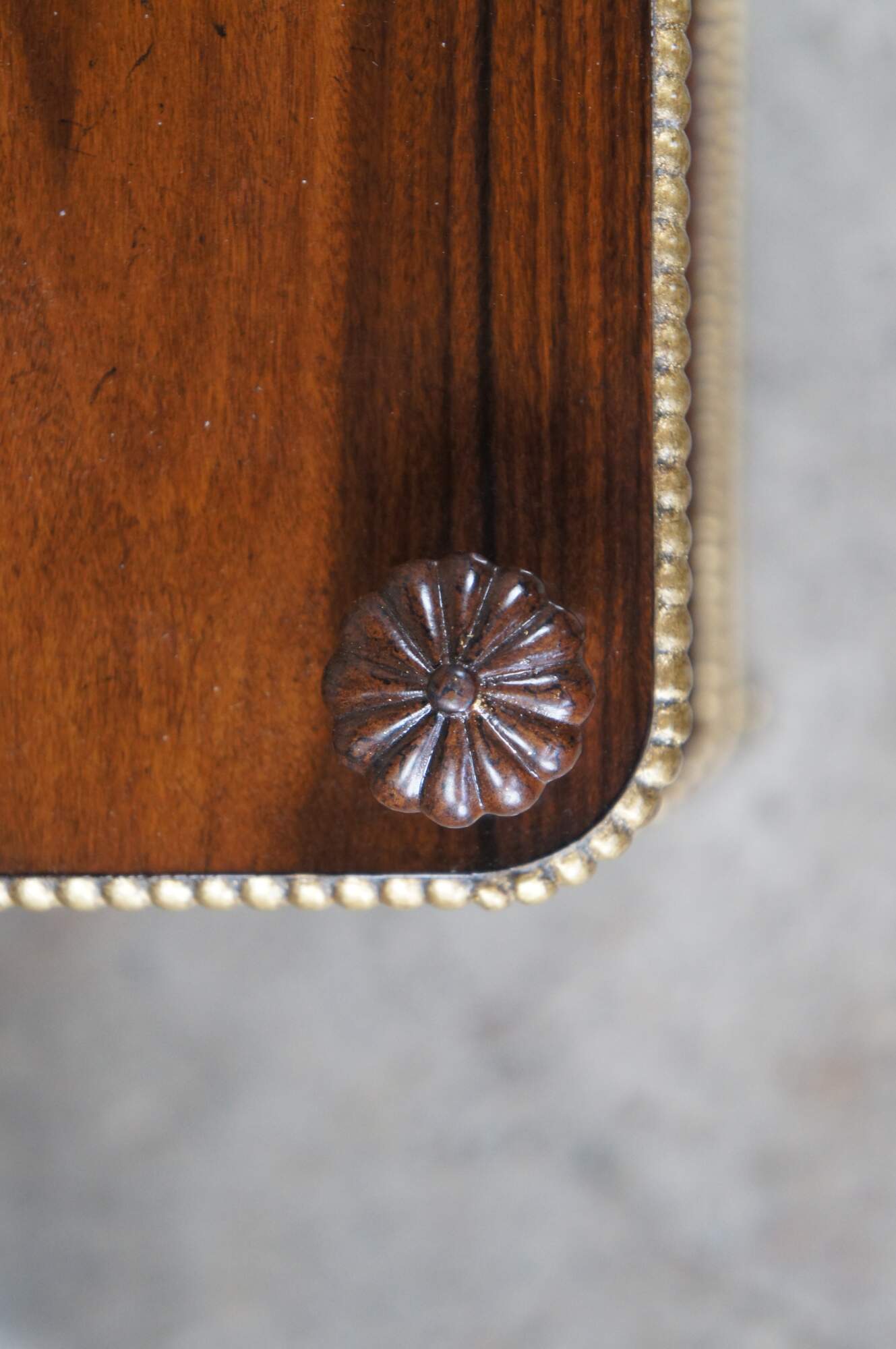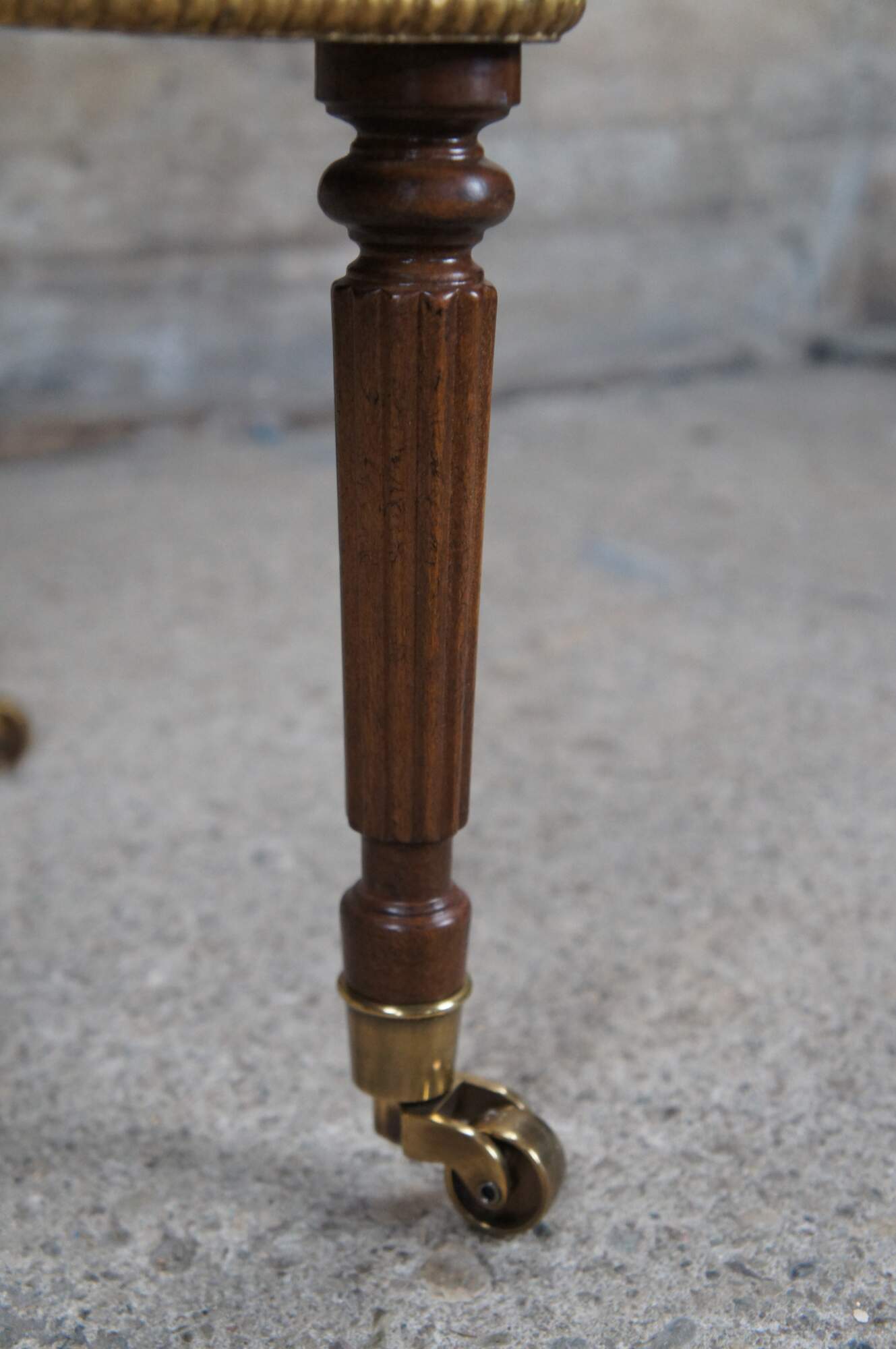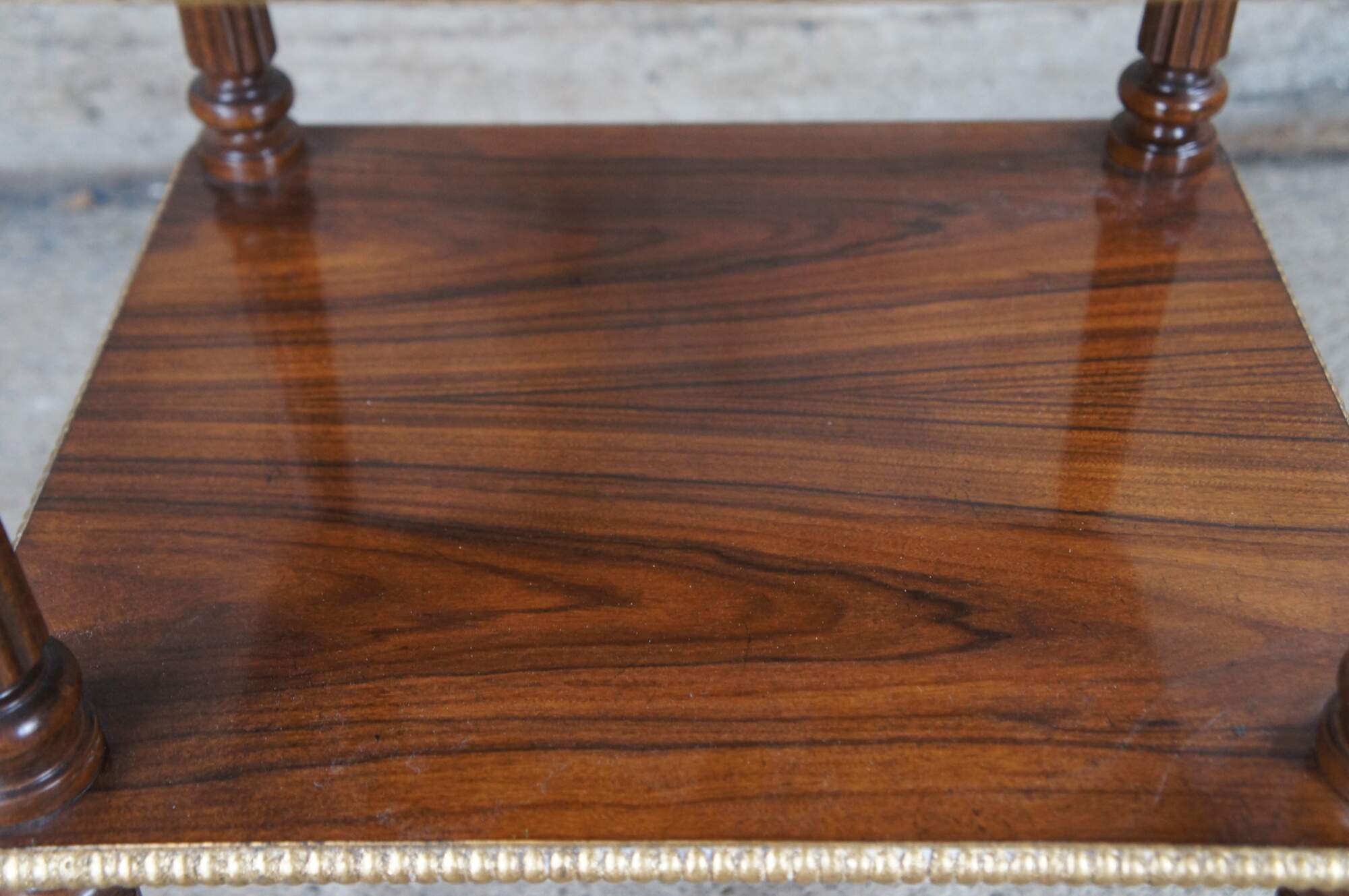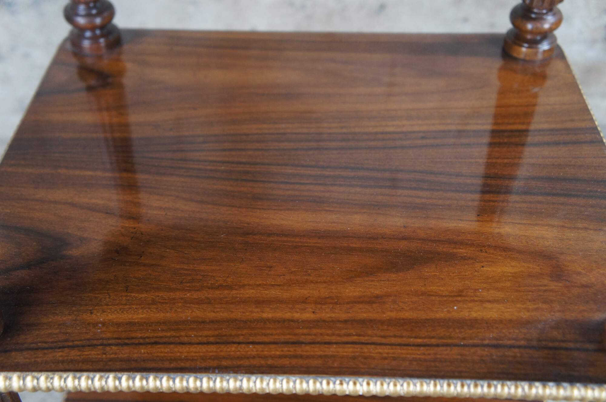 Vintage Baker Stately Homes Collection bar cart, side table or stand. Made of rosewood featuring tiered design with gilded gadrooned edges, turned and fluted columns, ornate finials and brass castors.