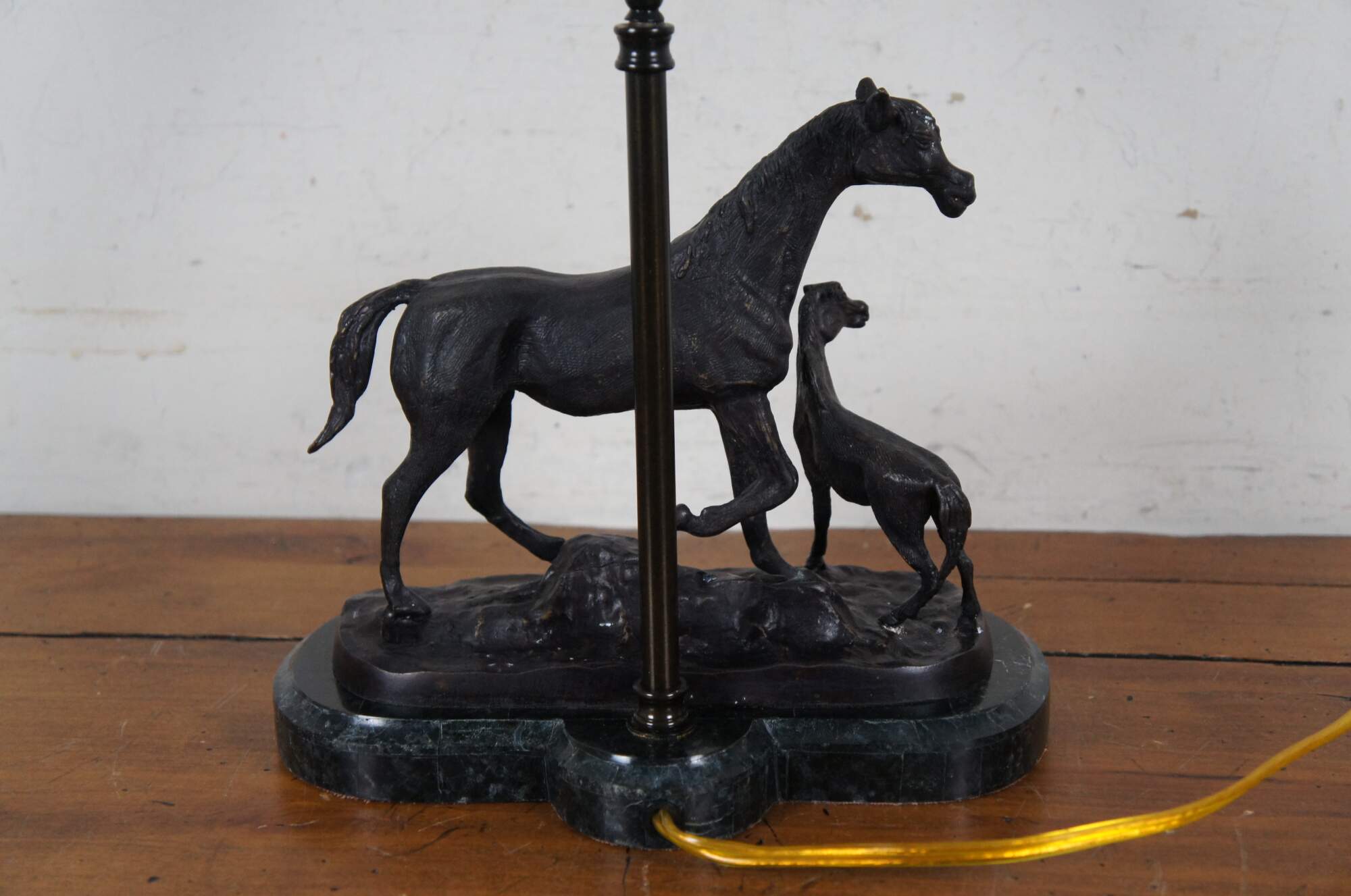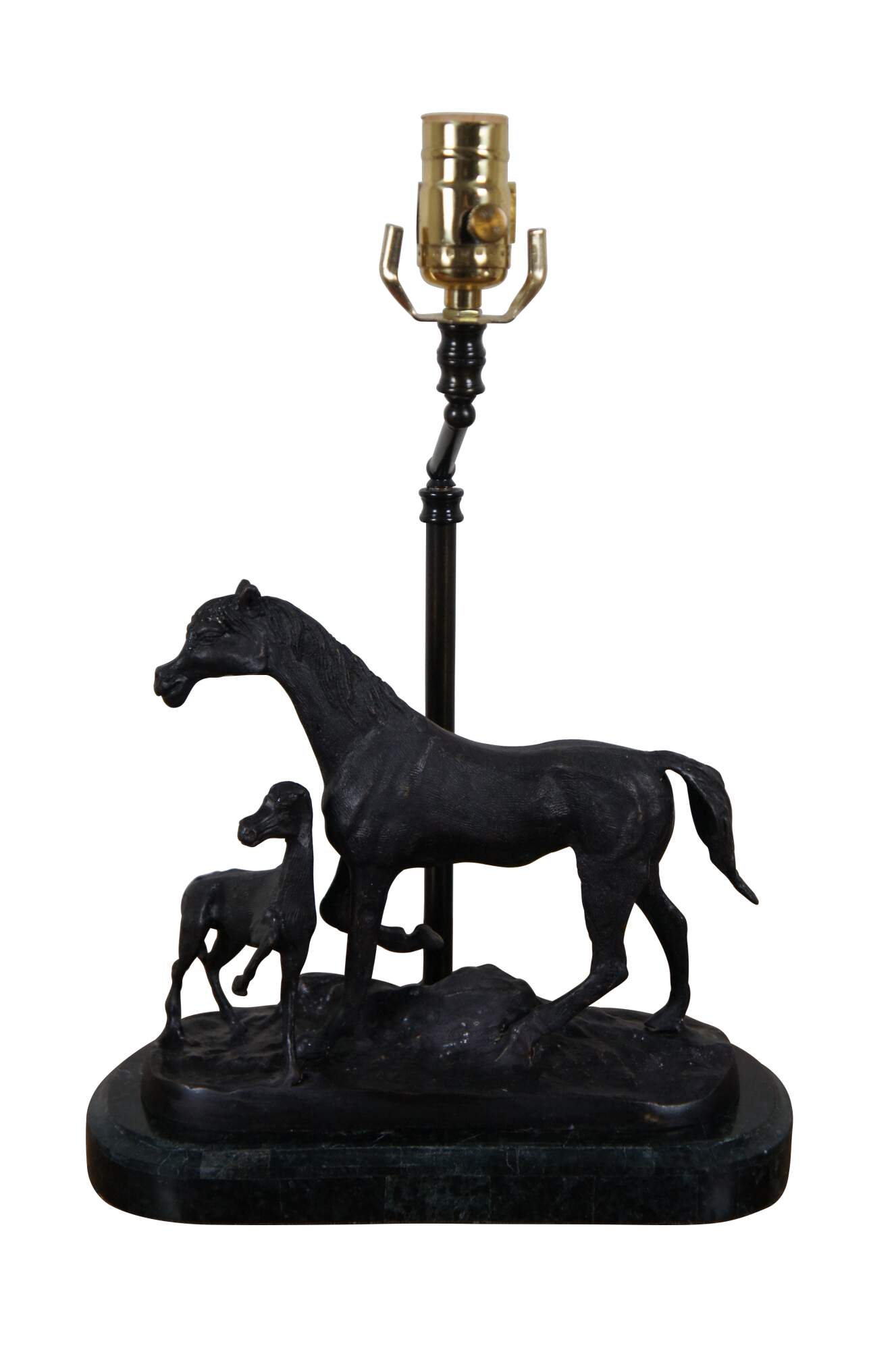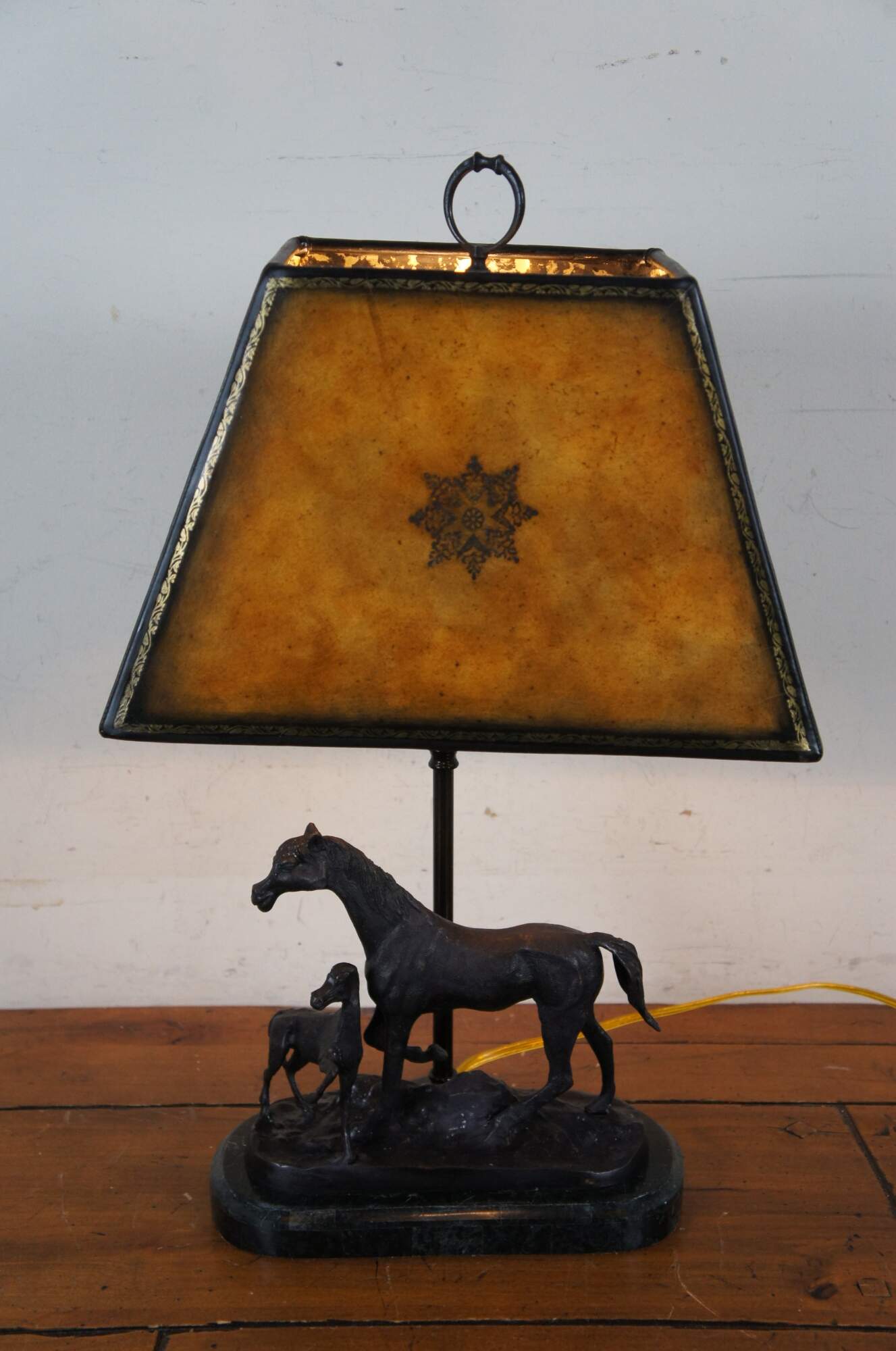 Vintage figural horse bronze table lamp by Maitland Smith featuring a mare and foal in tableau on a charcoal black marble clad base. Includes hard and rectangular tooled / gilded leather shade with foiled interior. Horse bit shaped finial. Hand made in Philippines.