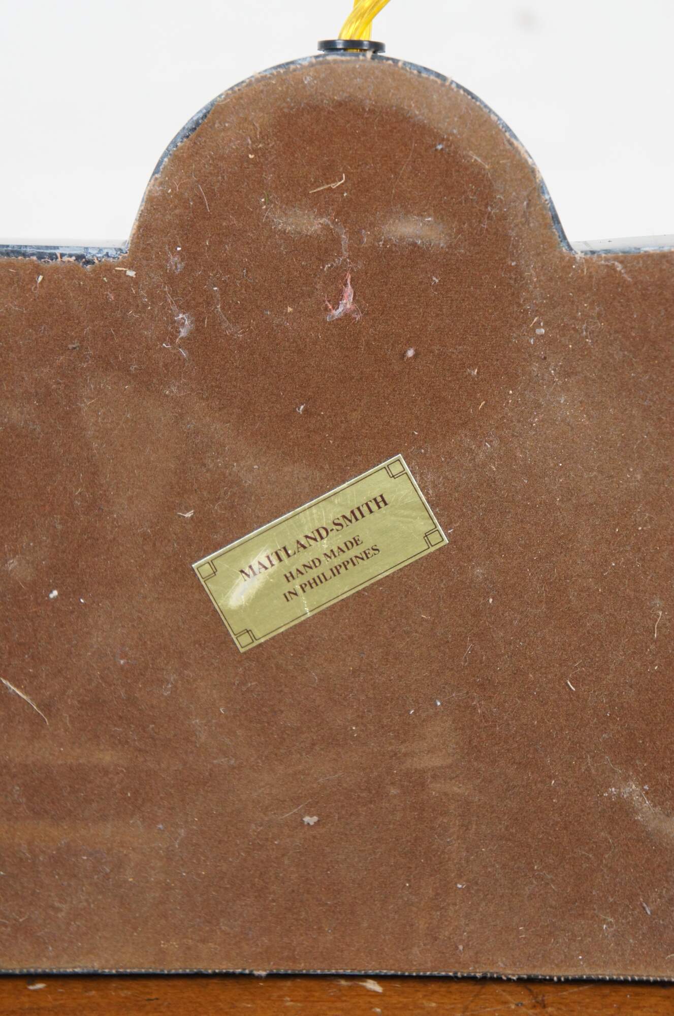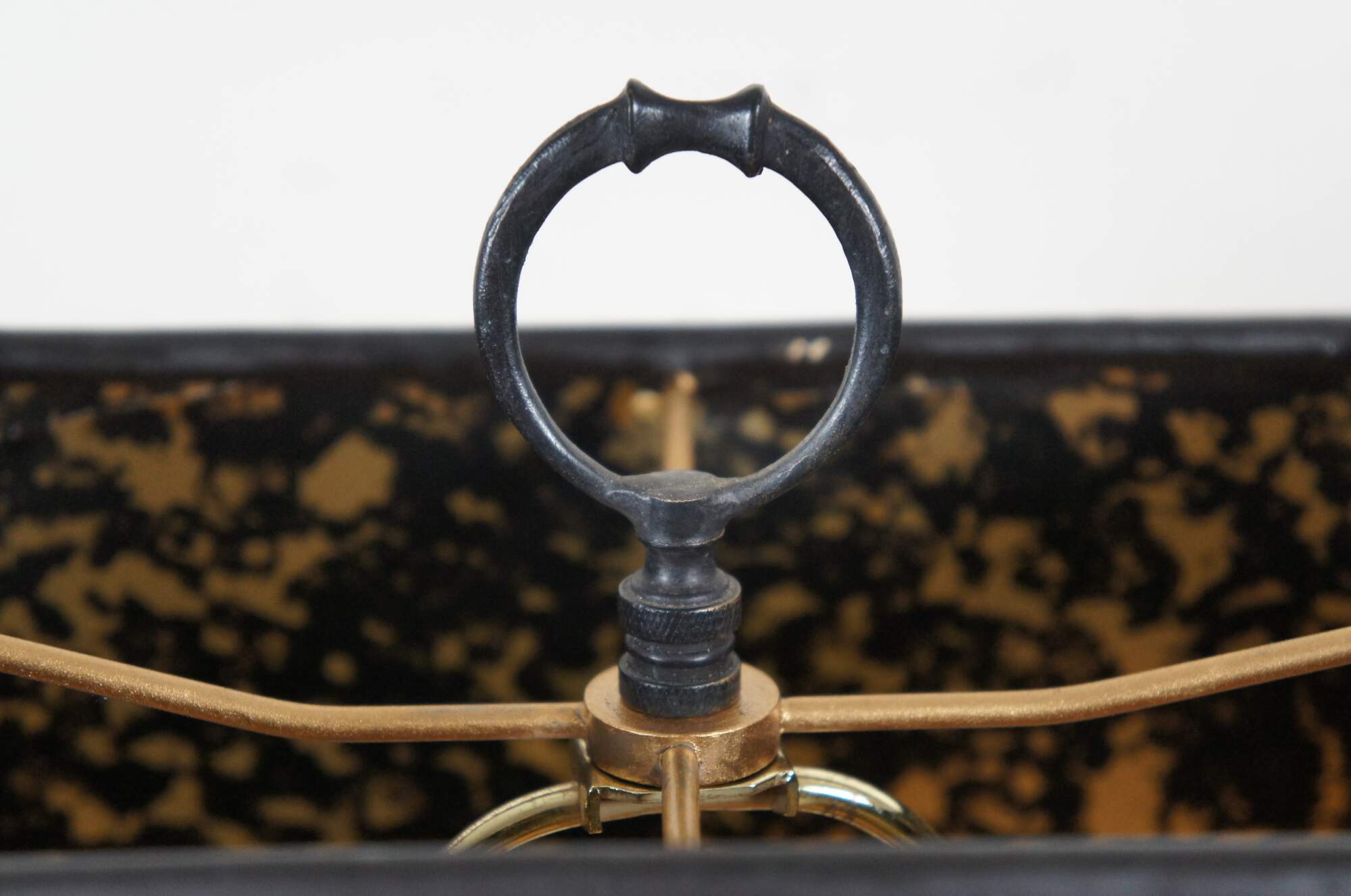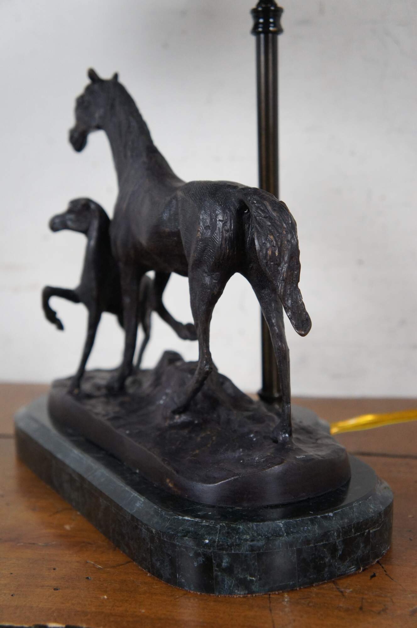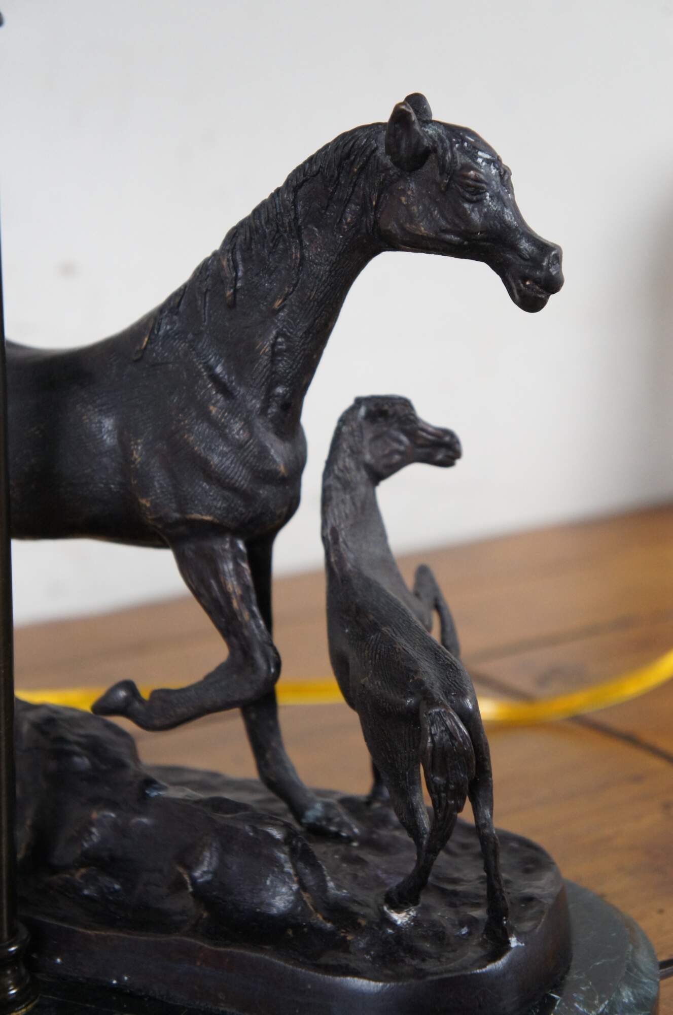 Vintage figural horse bronze table lamp by Maitland Smith featuring a mare and foal in tableau on a charcoal black marble clad base. Includes hard and rectangular tooled / gilded leather shade with foiled interior. Horse bit shaped finial. Hand made in Philippines.