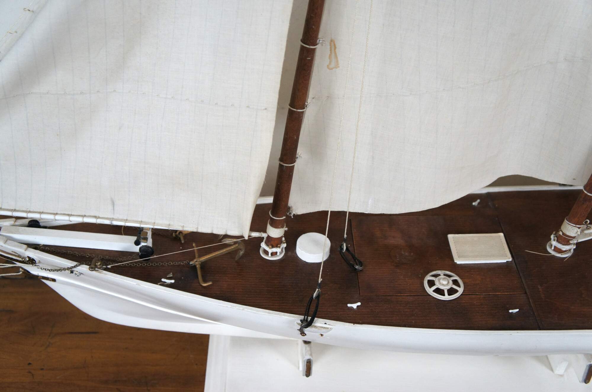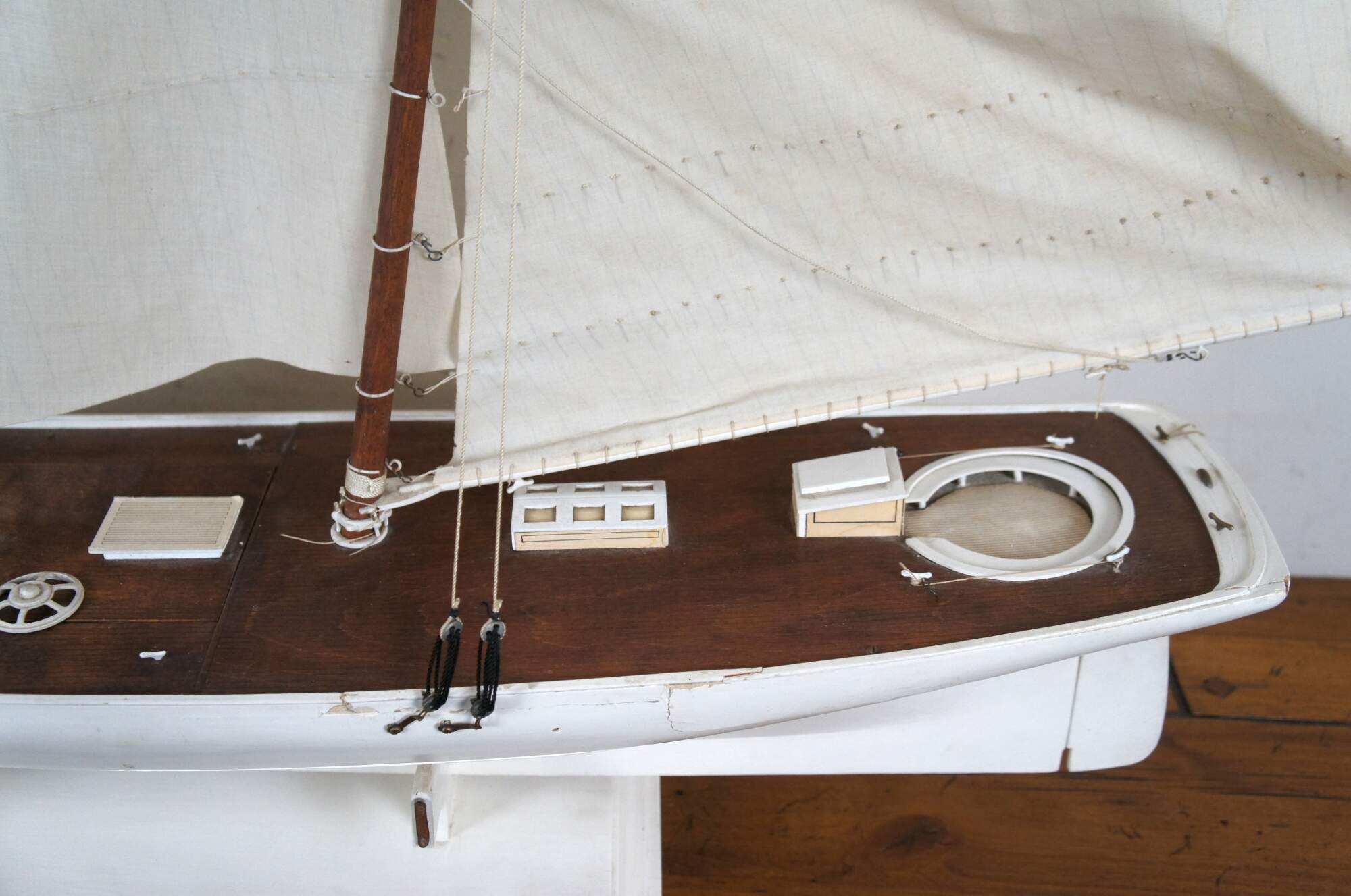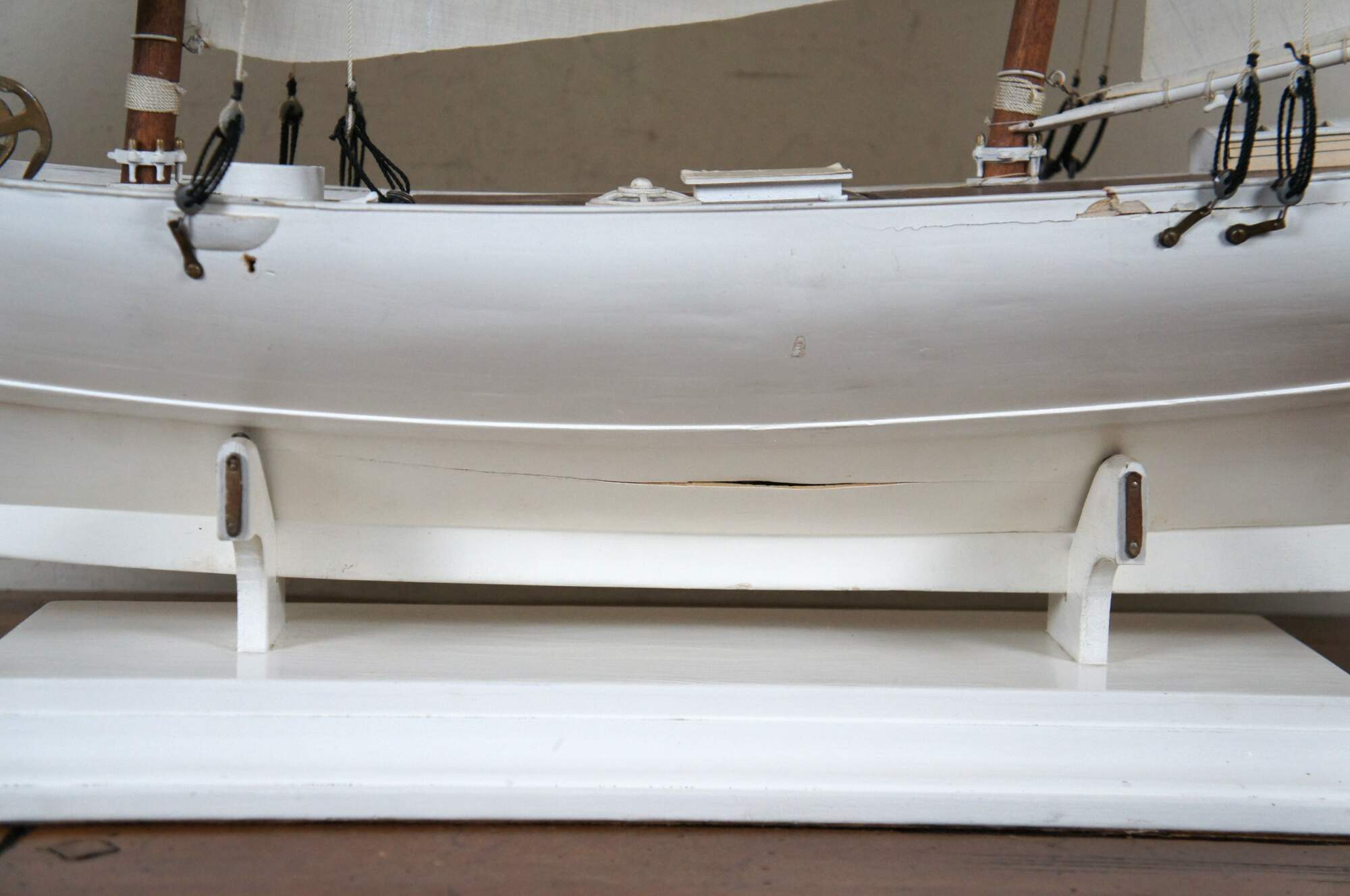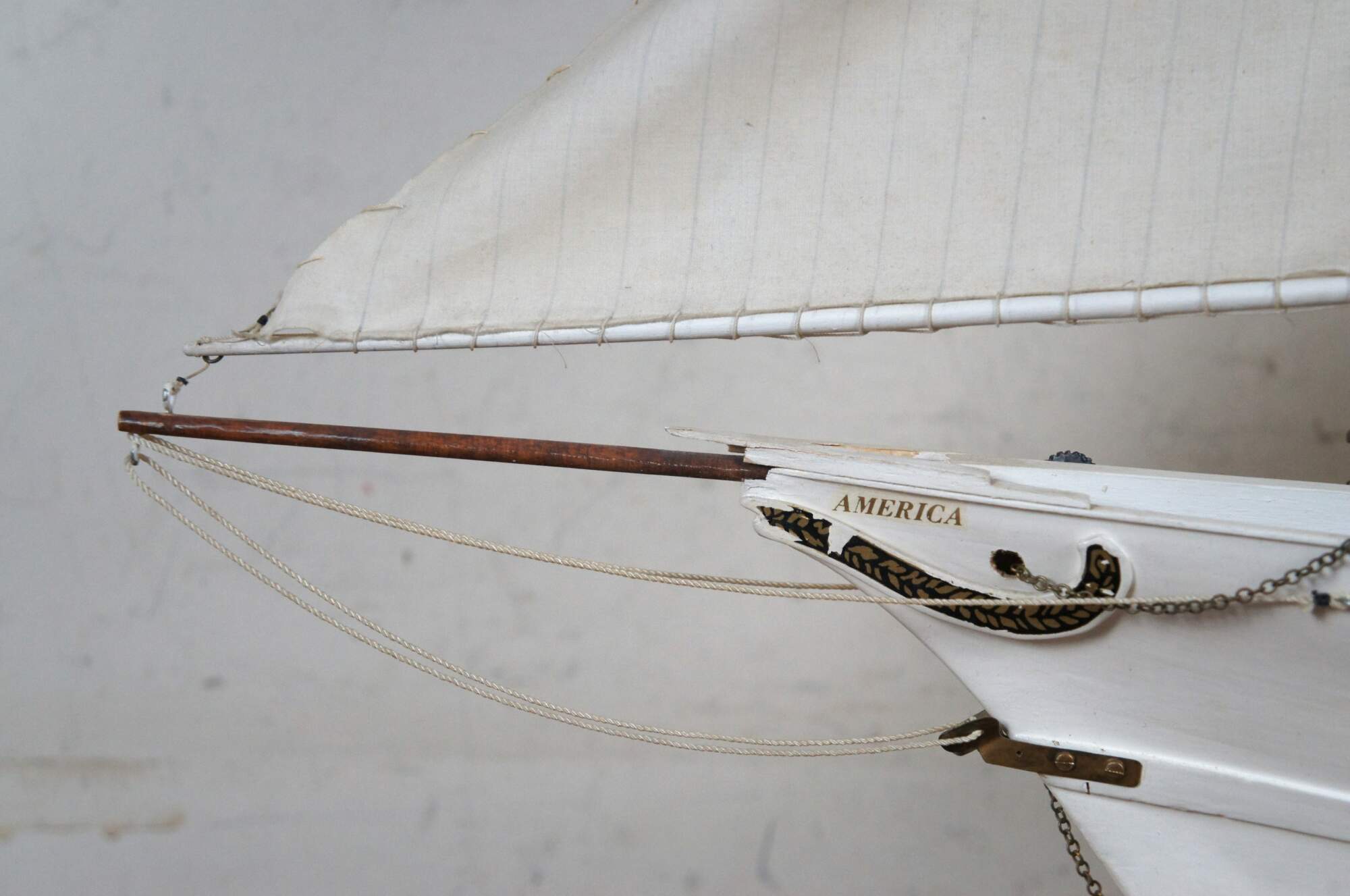 Mid to late 20th century hand made model sailboat. Painted white with dark brown deck and canvas sails. Named "America" with American eagle at stern.