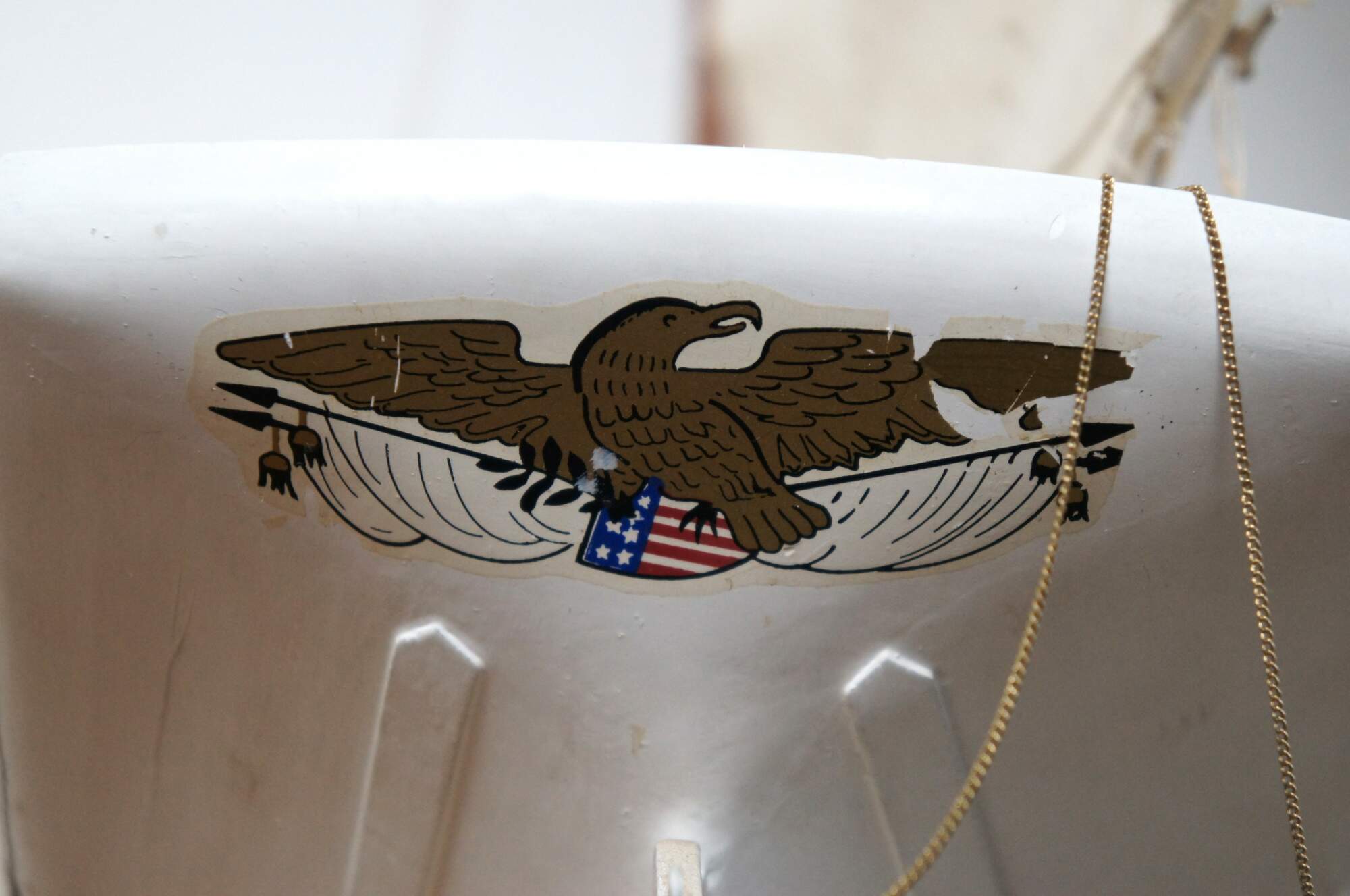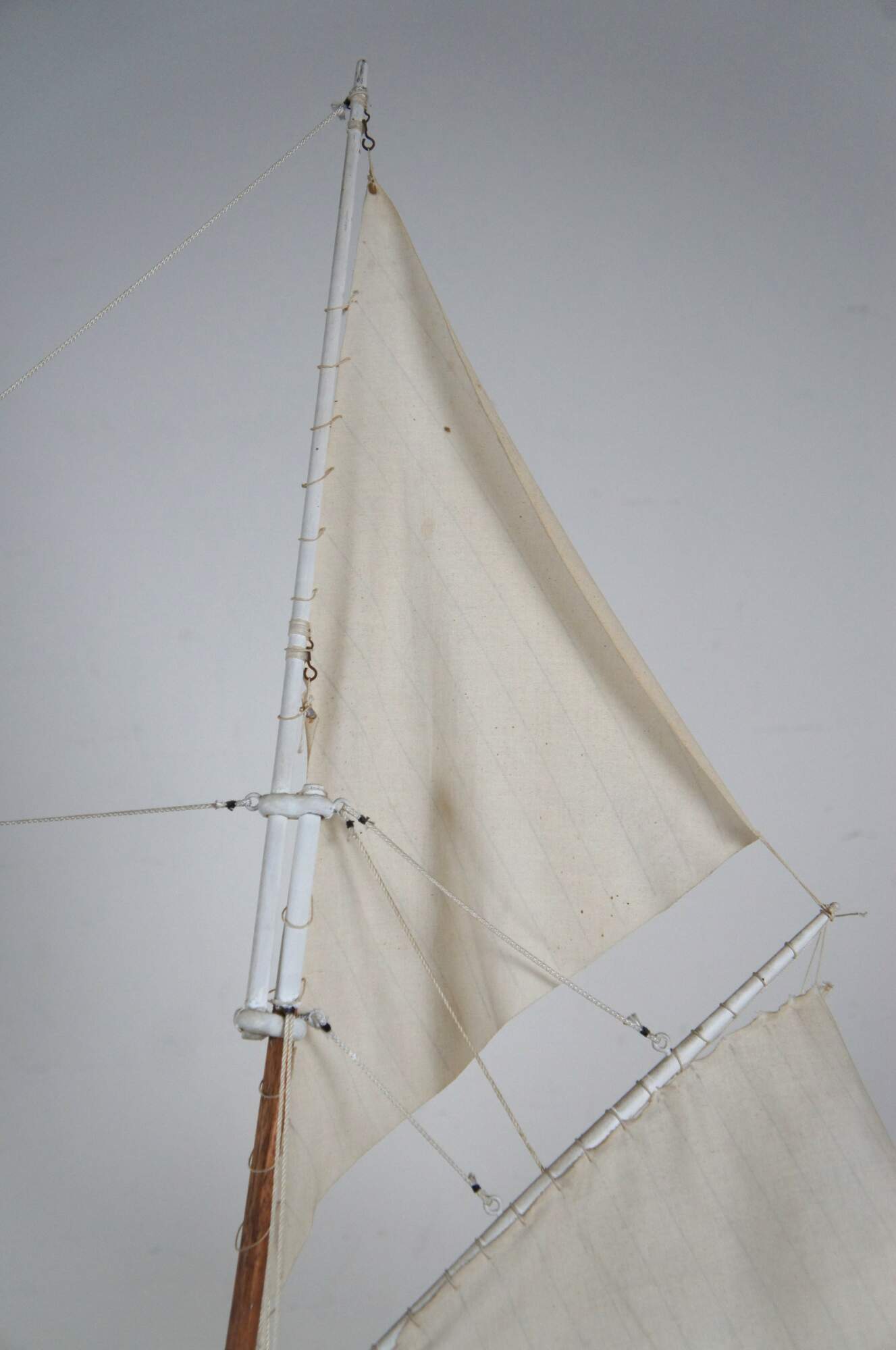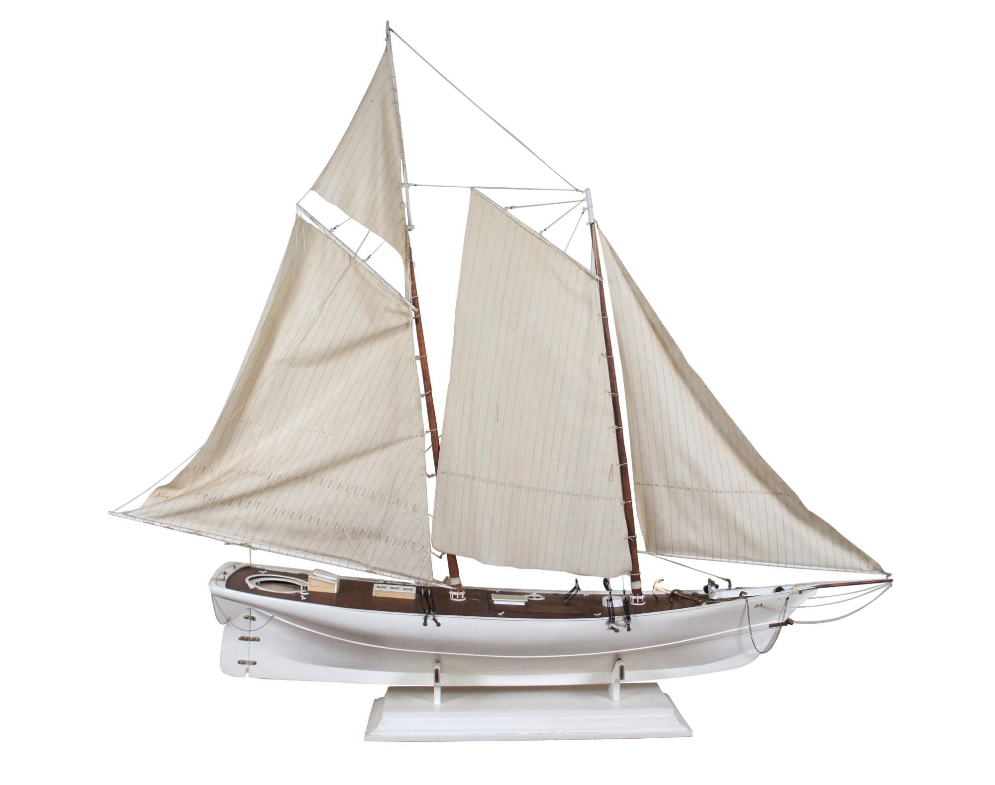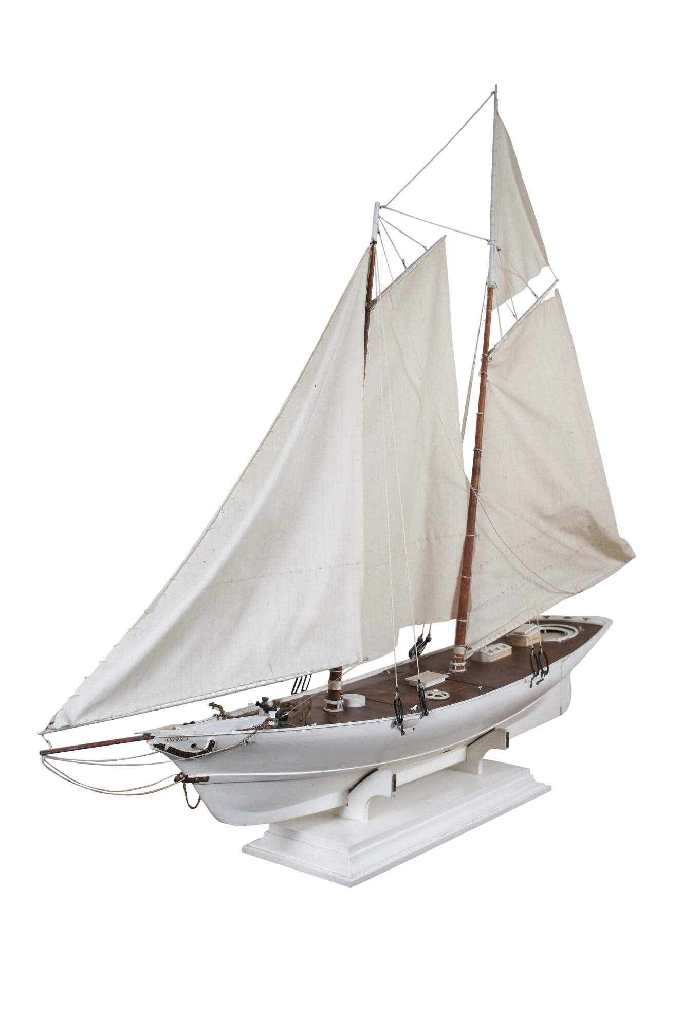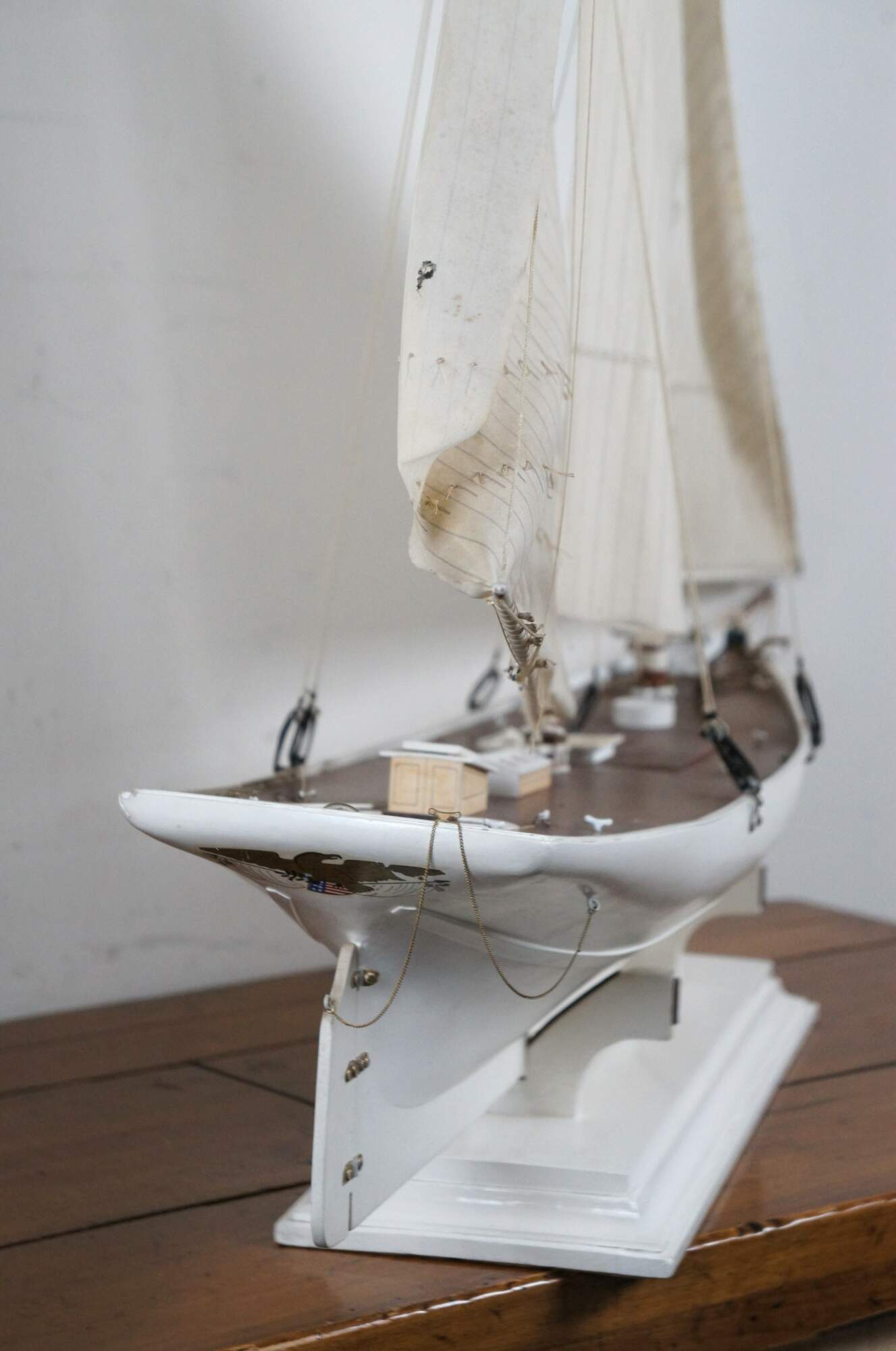 Mid to late 20th century hand made model sailboat. Painted white with dark brown deck and canvas sails. Named "America" with American eagle at stern.