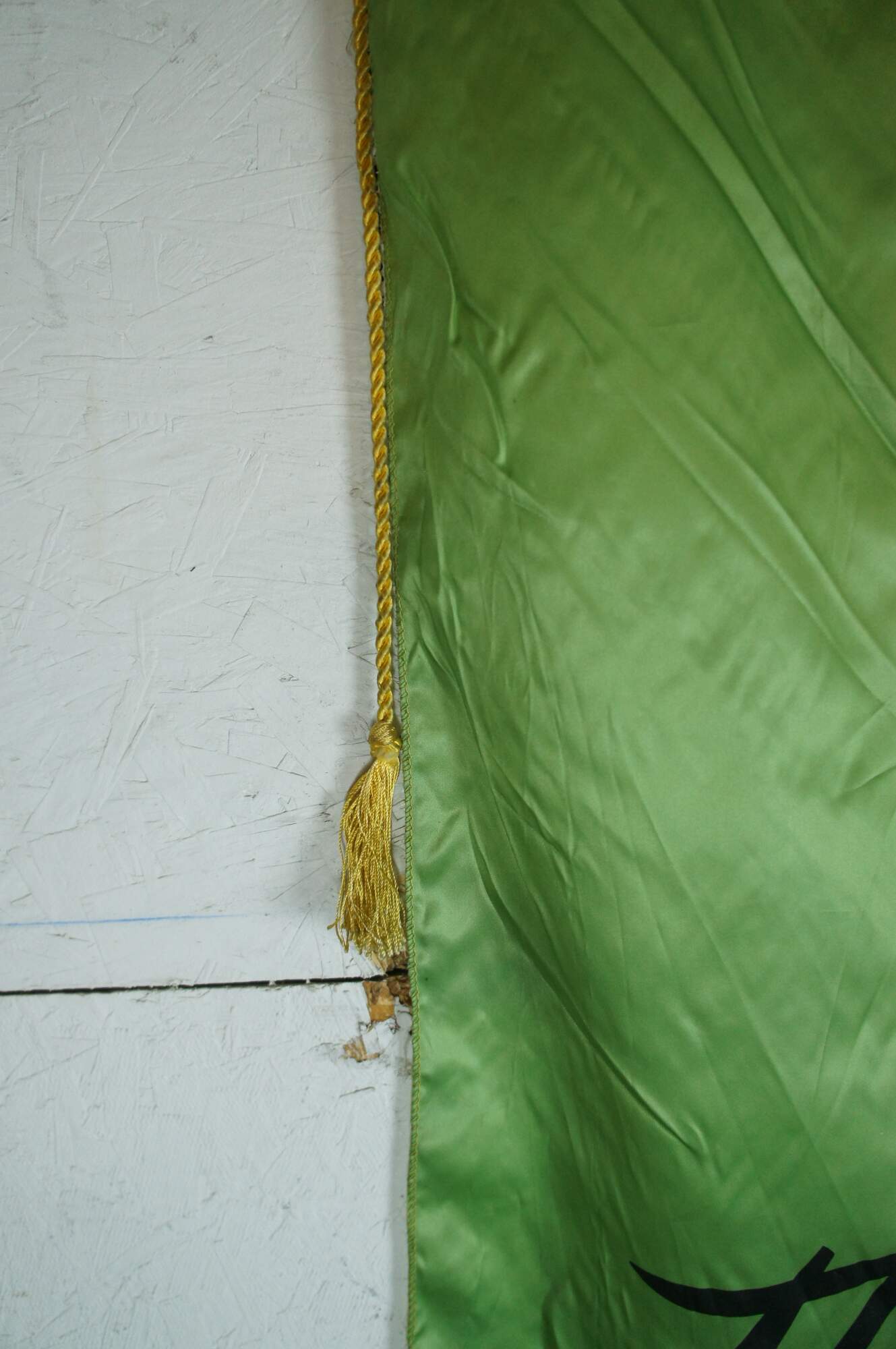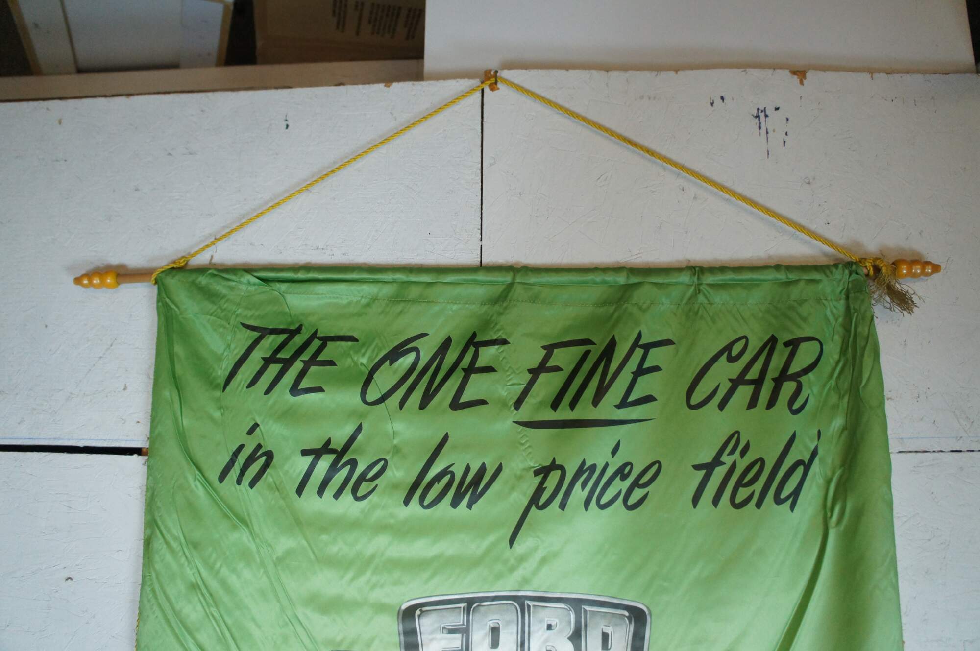1950 Ford car dealership silk banner. "The One Fine Car in the Low Price Field - The '50 Ford" Green background with text above and blow the Ford triple lion coat of arms logo. Gold fringe along the bottom. Hung from gold cord and wooden staff with turned finials. Manufactured by Ingelstroem-Oberlin, Inc of Massillon, Ohio.