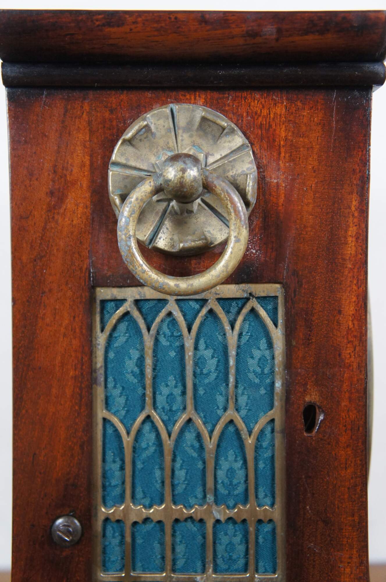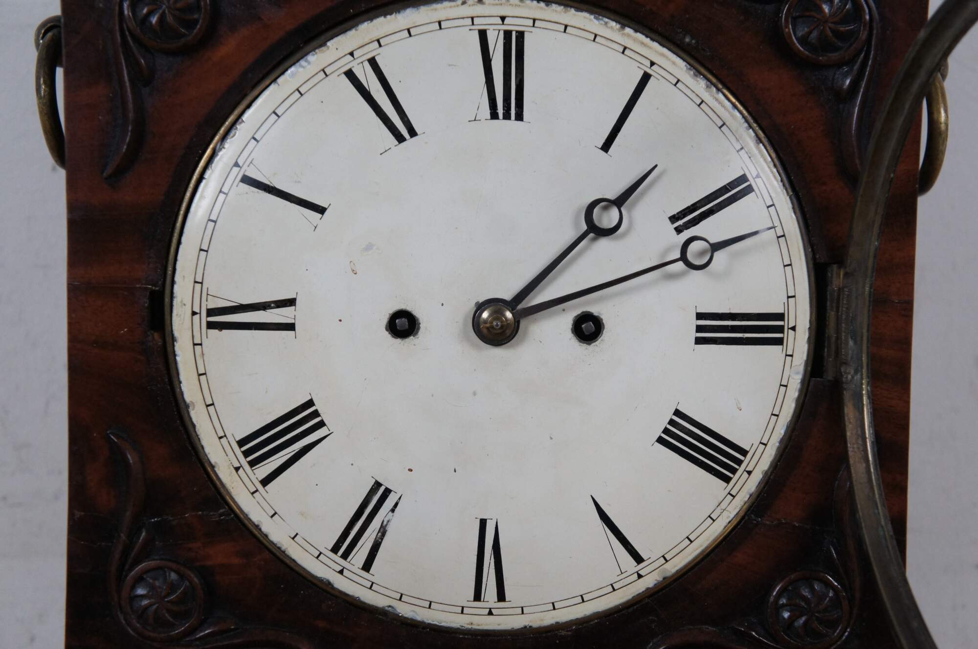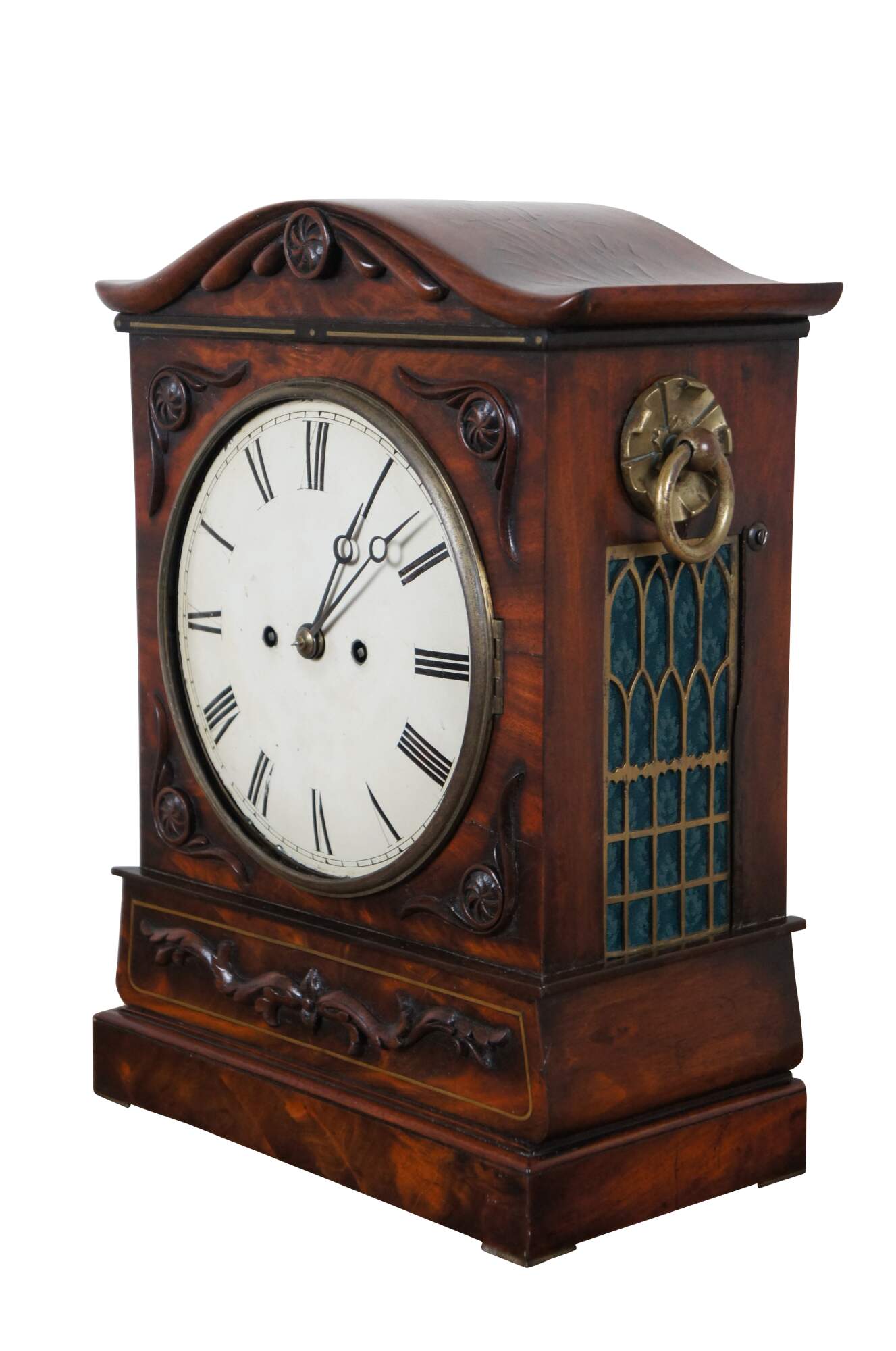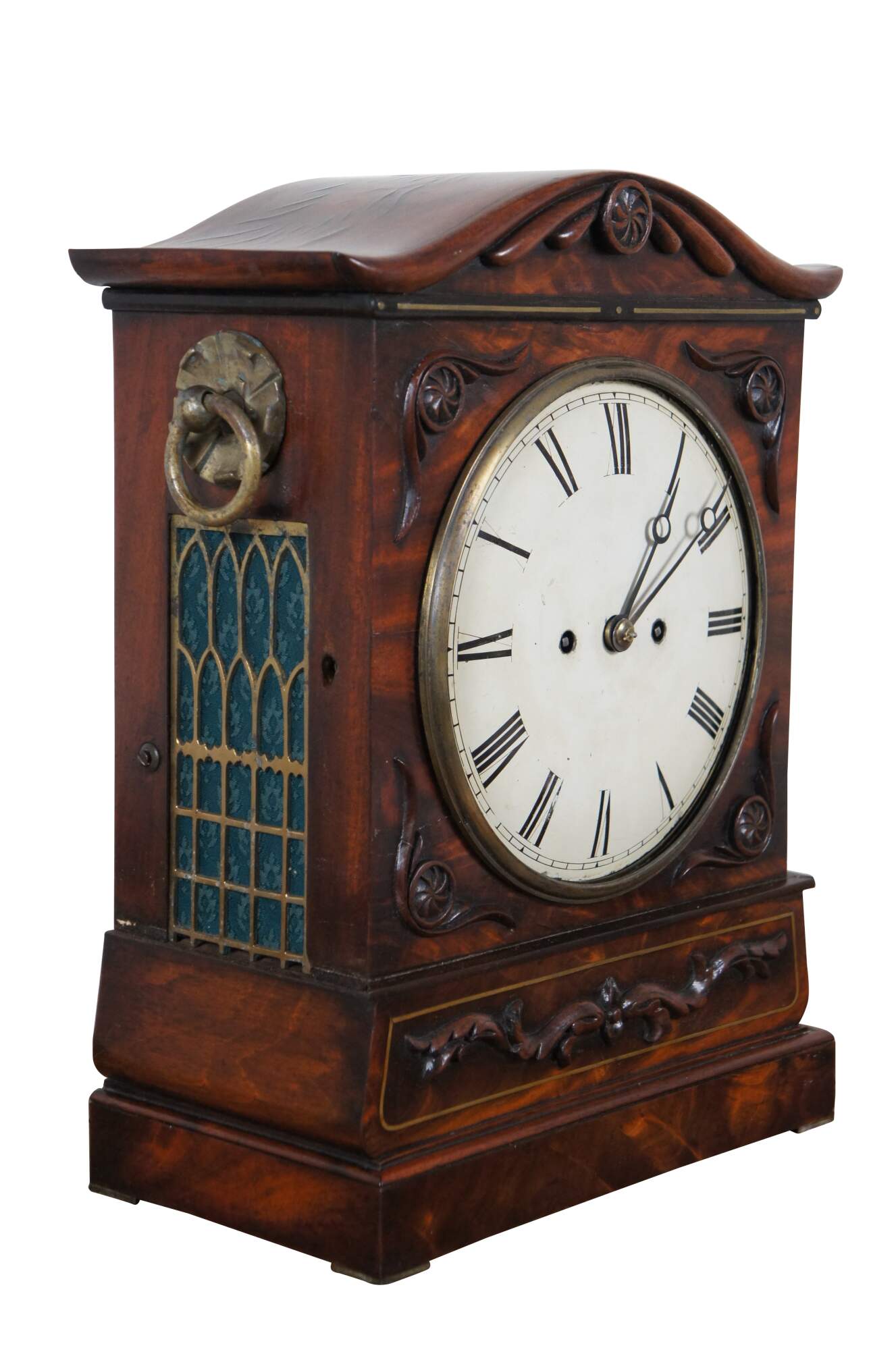 Antique 19th century Georgian, key wind, double / twin fusee bracket clock with pull chime cord. Flame mahogany case with oxbow top and carved pinwheels and scrolls. Sides feature brass rind handles over cathedral window panels backed with deep teal embossed velvet. Glass back showing chime / pendulum. White painted metal face with black lettering, Roman numerals, black metal hands.