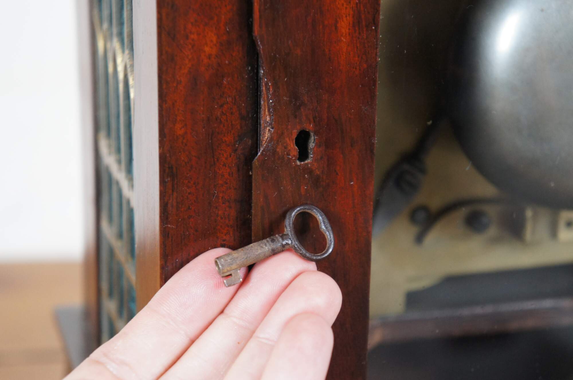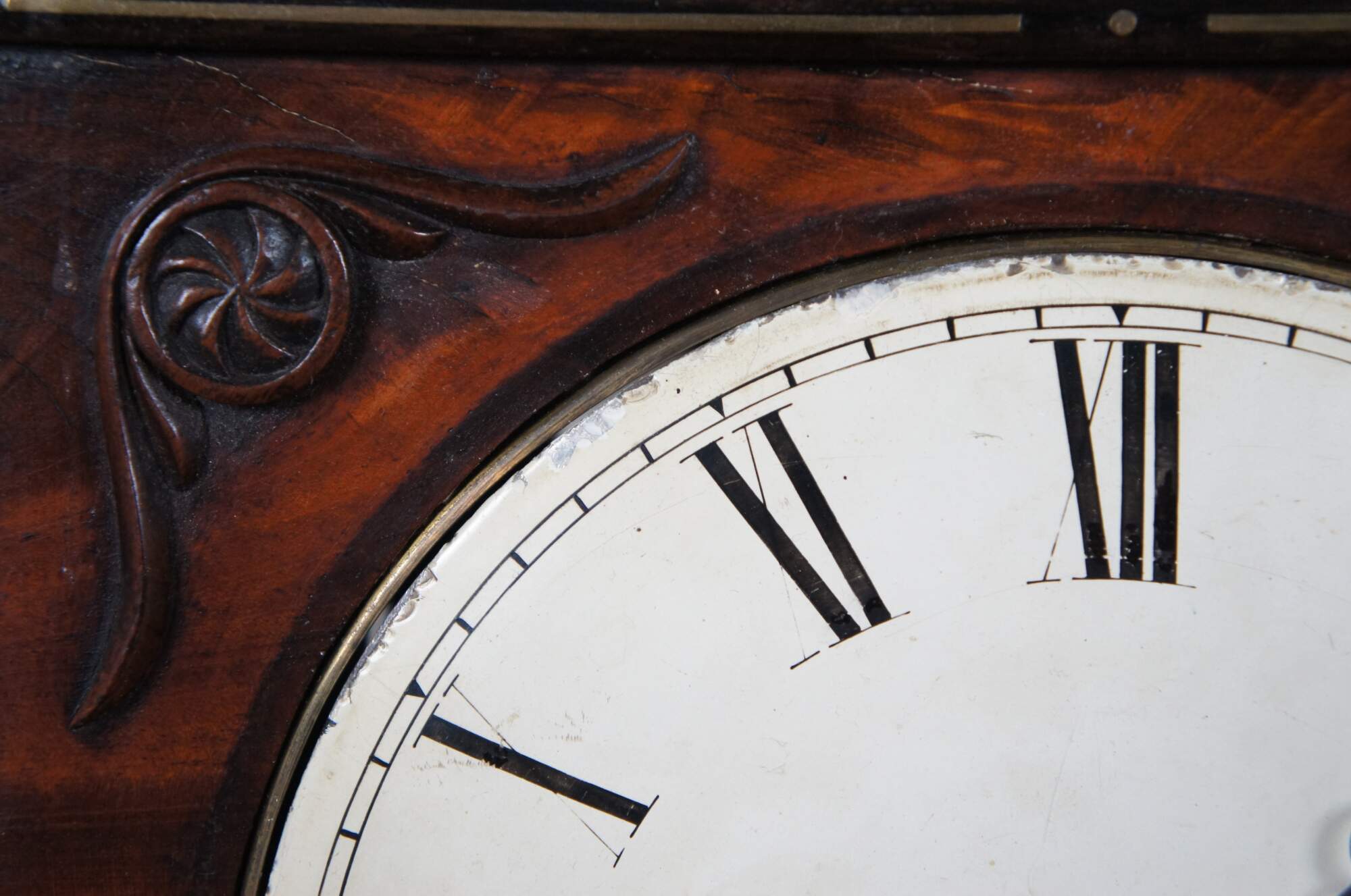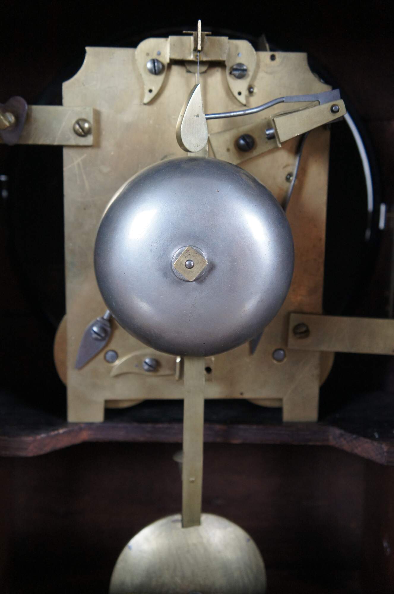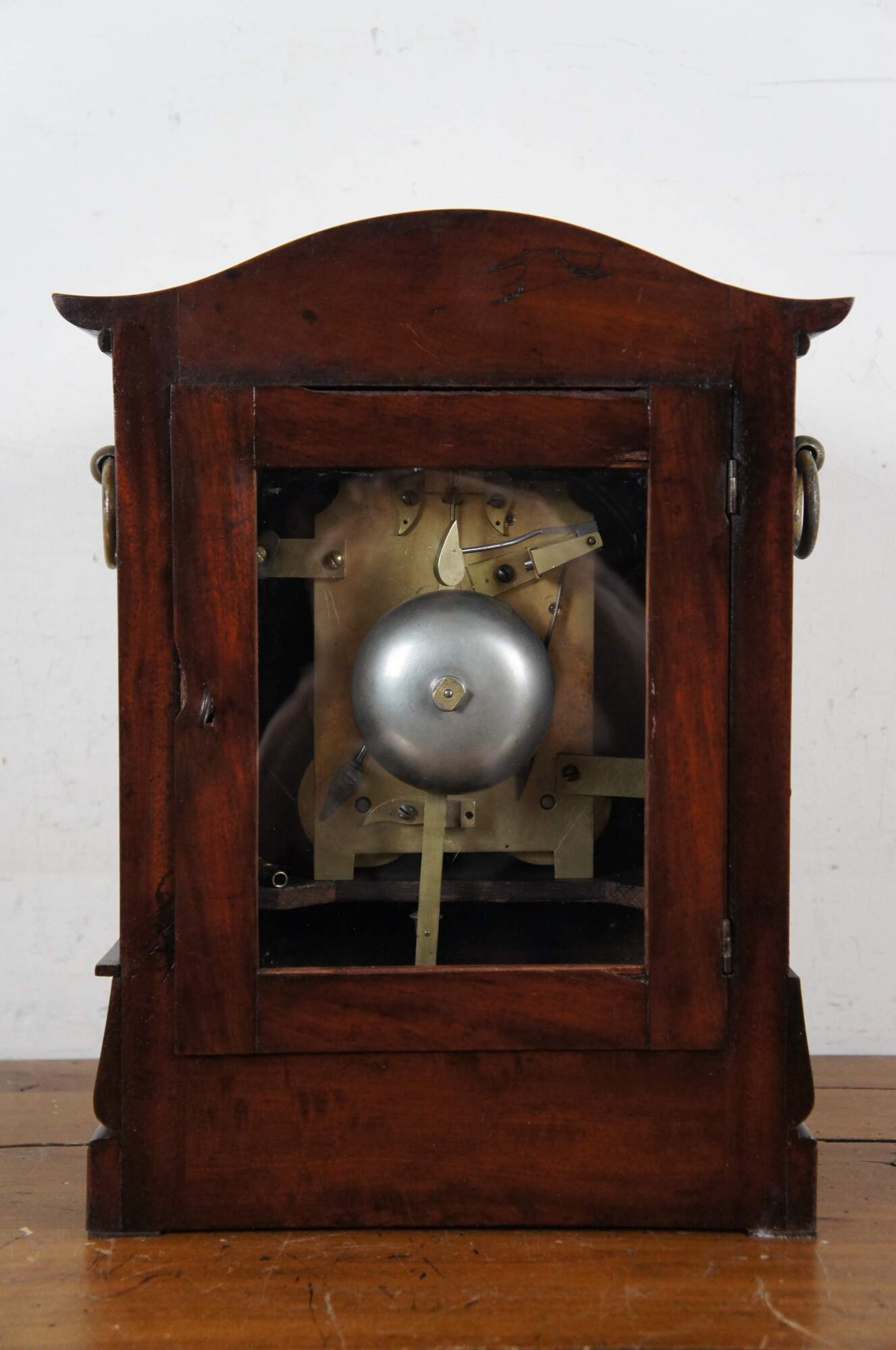 Antique 19th century Georgian, key wind, double / twin fusee bracket clock with pull chime cord. Flame mahogany case with oxbow top and carved pinwheels and scrolls. Sides feature brass rind handles over cathedral window panels backed with deep teal embossed velvet. Glass back showing chime / pendulum. White painted metal face with black lettering, Roman numerals, black metal hands.