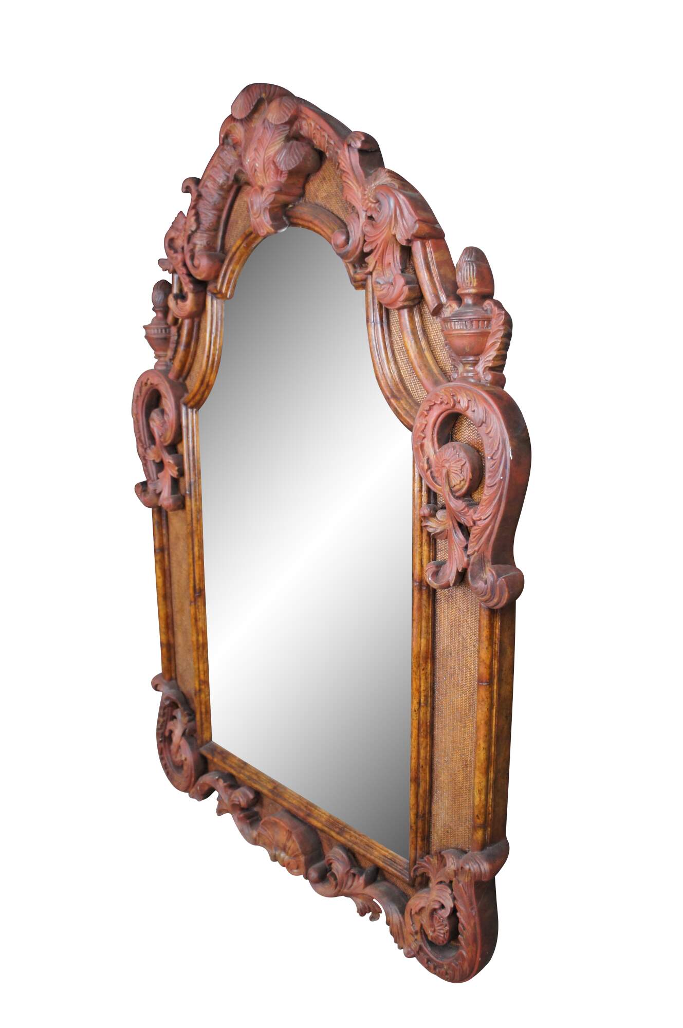 A stately Baroque Rococo style wall hanging mirror by Maitland Smith, circa last quarter 20th century. Made from walnut with a rattan backing and ornate low relief painted embellishments. Features an arched crown centered by Prince of Wales feathers, flanked by trophy finials and acanthus S scrolling foliate throughout. Mirror is naturally antiqued.