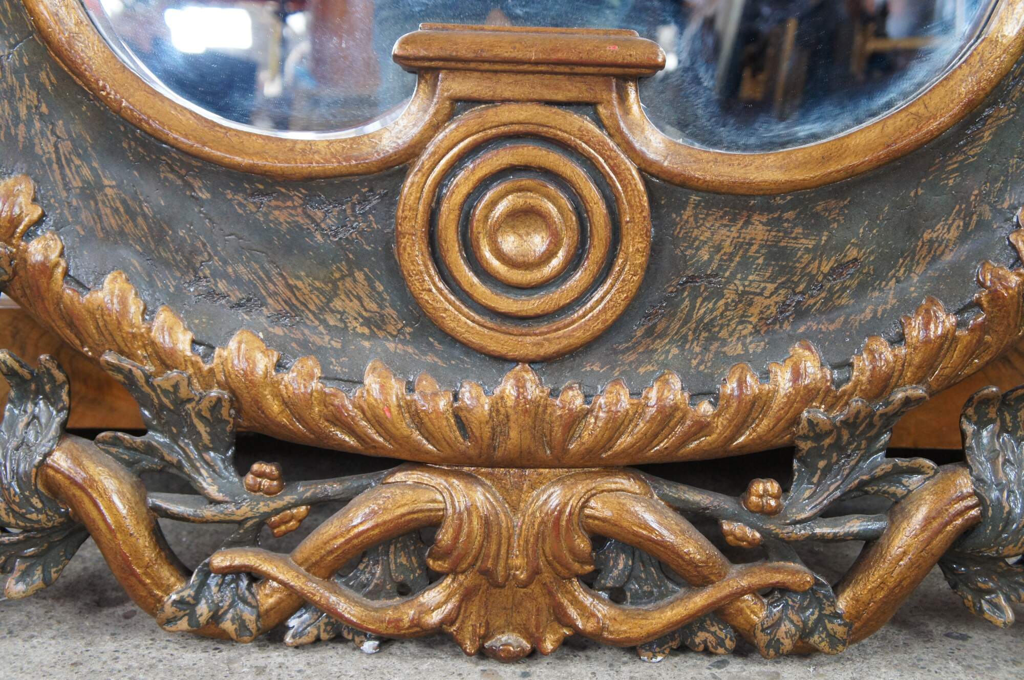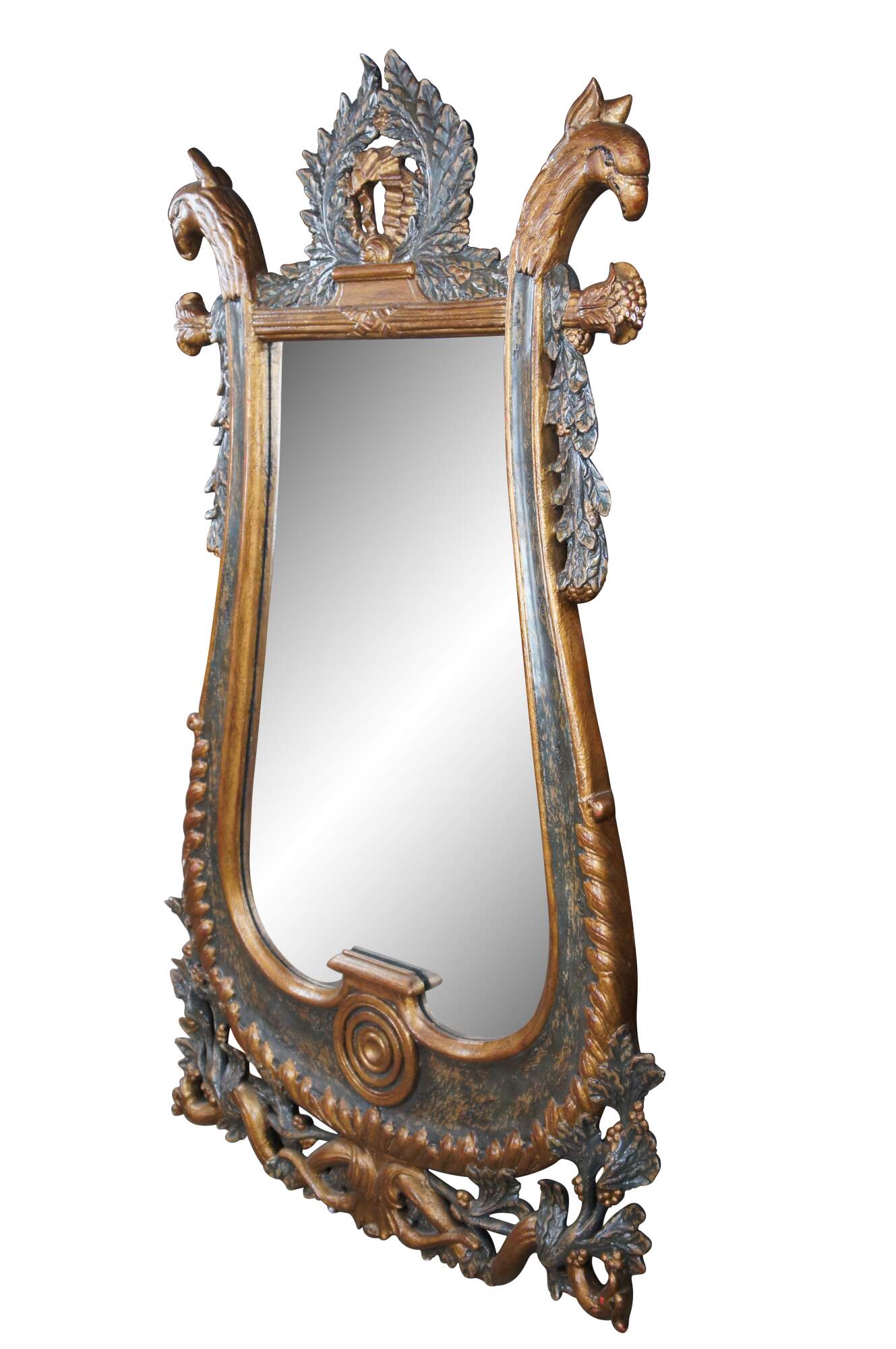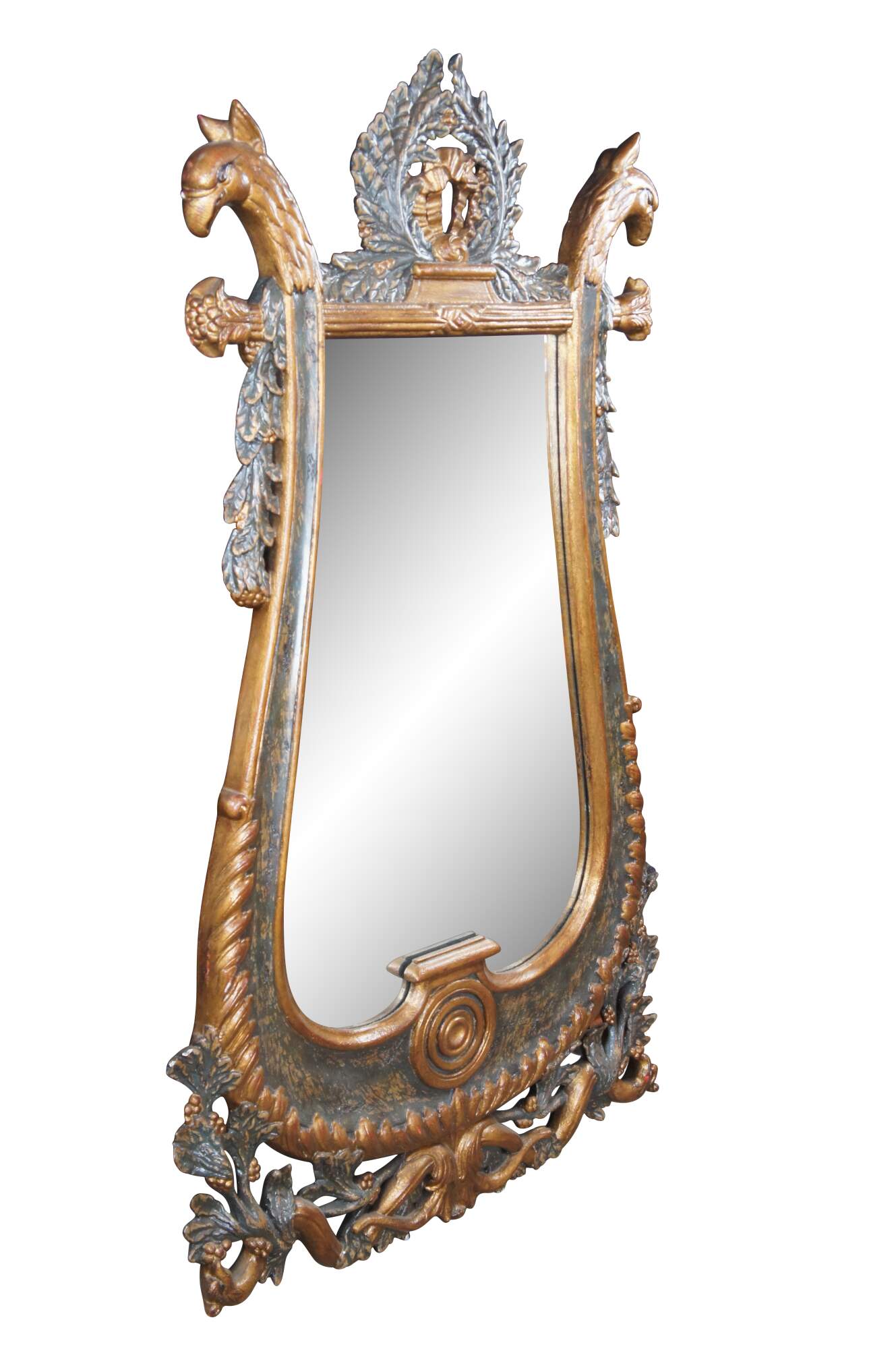 An elegant Louis XVI inspired wall hanging mirror by Alfonso Marina, circa late 20th century. Made from mahogany with ornate painted details. Features a lyre shape with ornate central wreath flanked by figural griffon heads. The body of the mirror showcases berry and acanthus motif. Exceptional design and craftmanship by world renowned furniture craftsman Alfonso Marina. Great for use as an over mantel, wall hanging or vanity mirror.