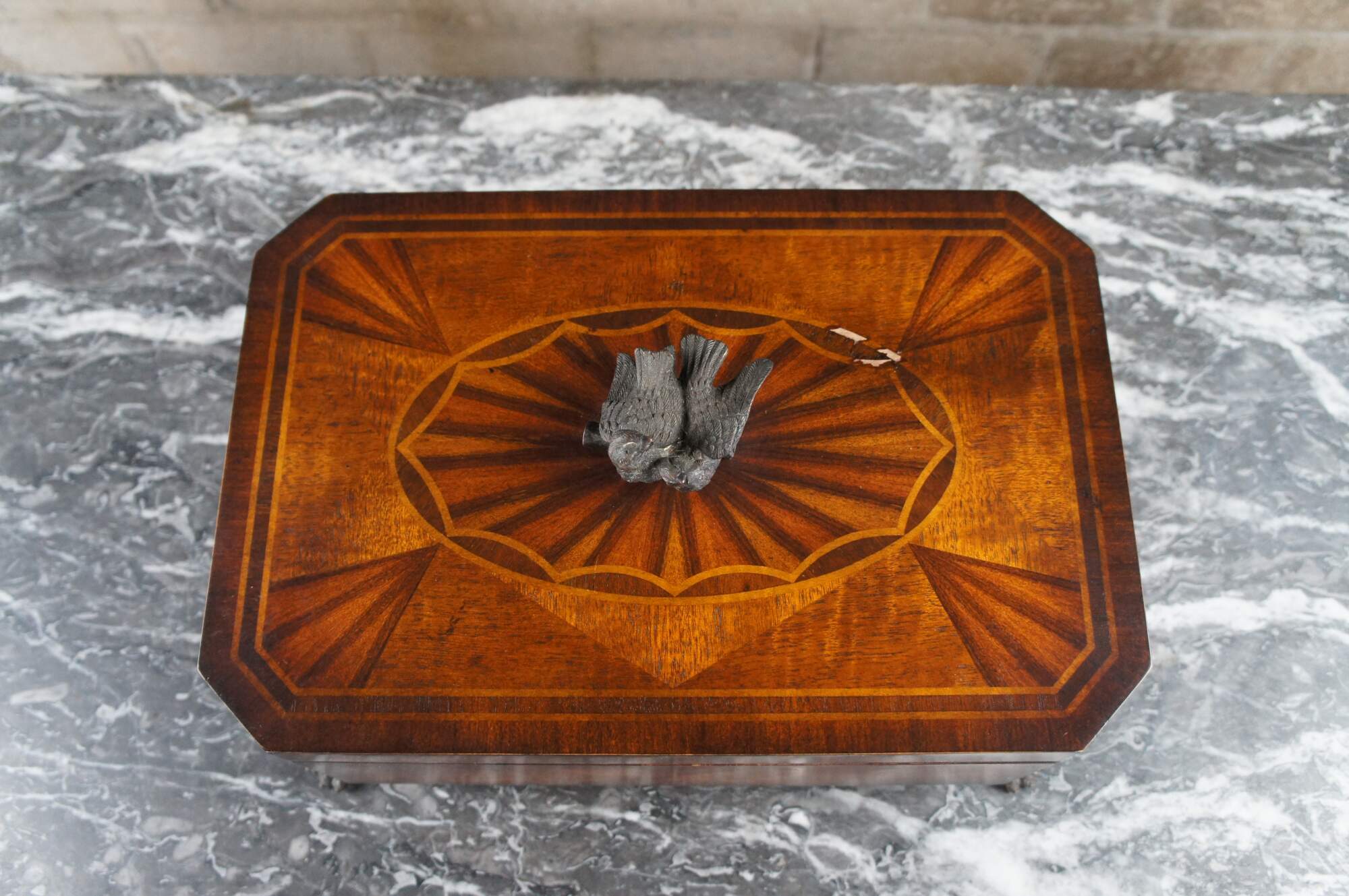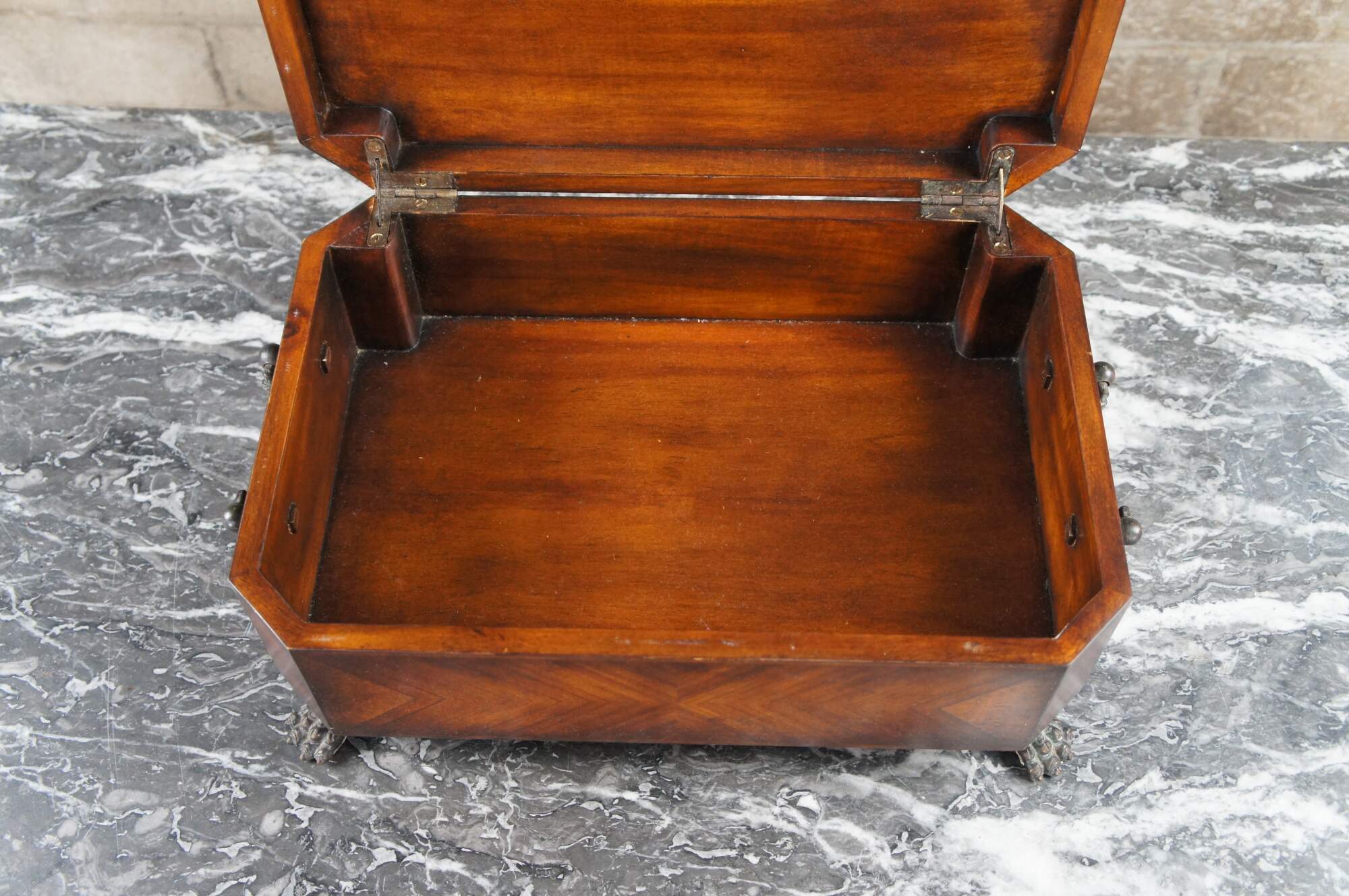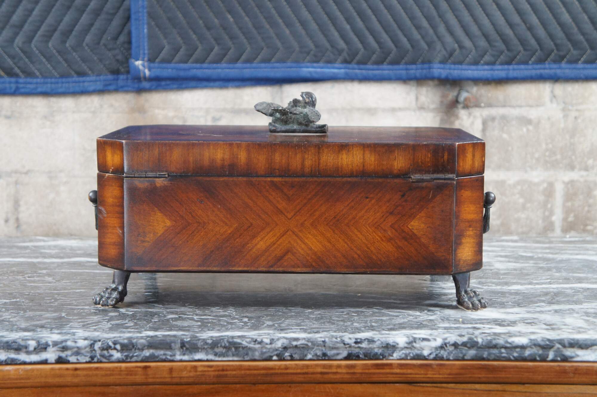 Theodore Alexander keepsake, trinket box or casket. Features a matchbook veneer mahogany frame with parquetry top and dove finial. Includes two handles along the sides and claw feet. The marquetry inlay top is inspired by the meticulous inlays from the Federal and Sheraton era. A nice display piece that will look great on any desk, table or bookcase.